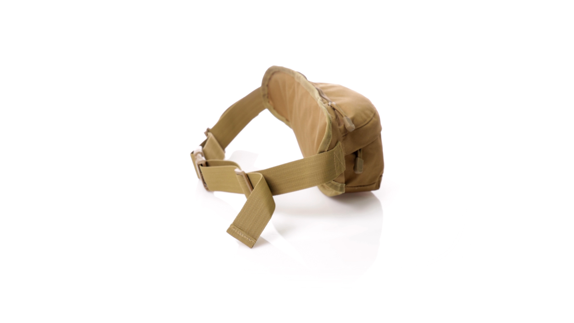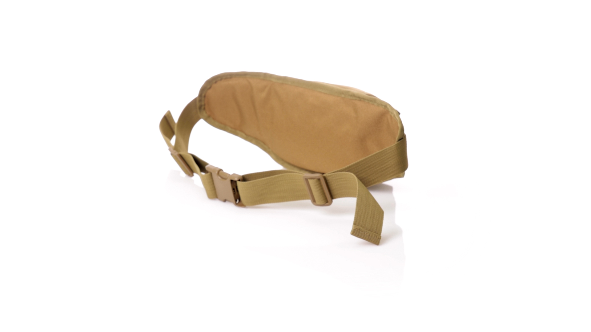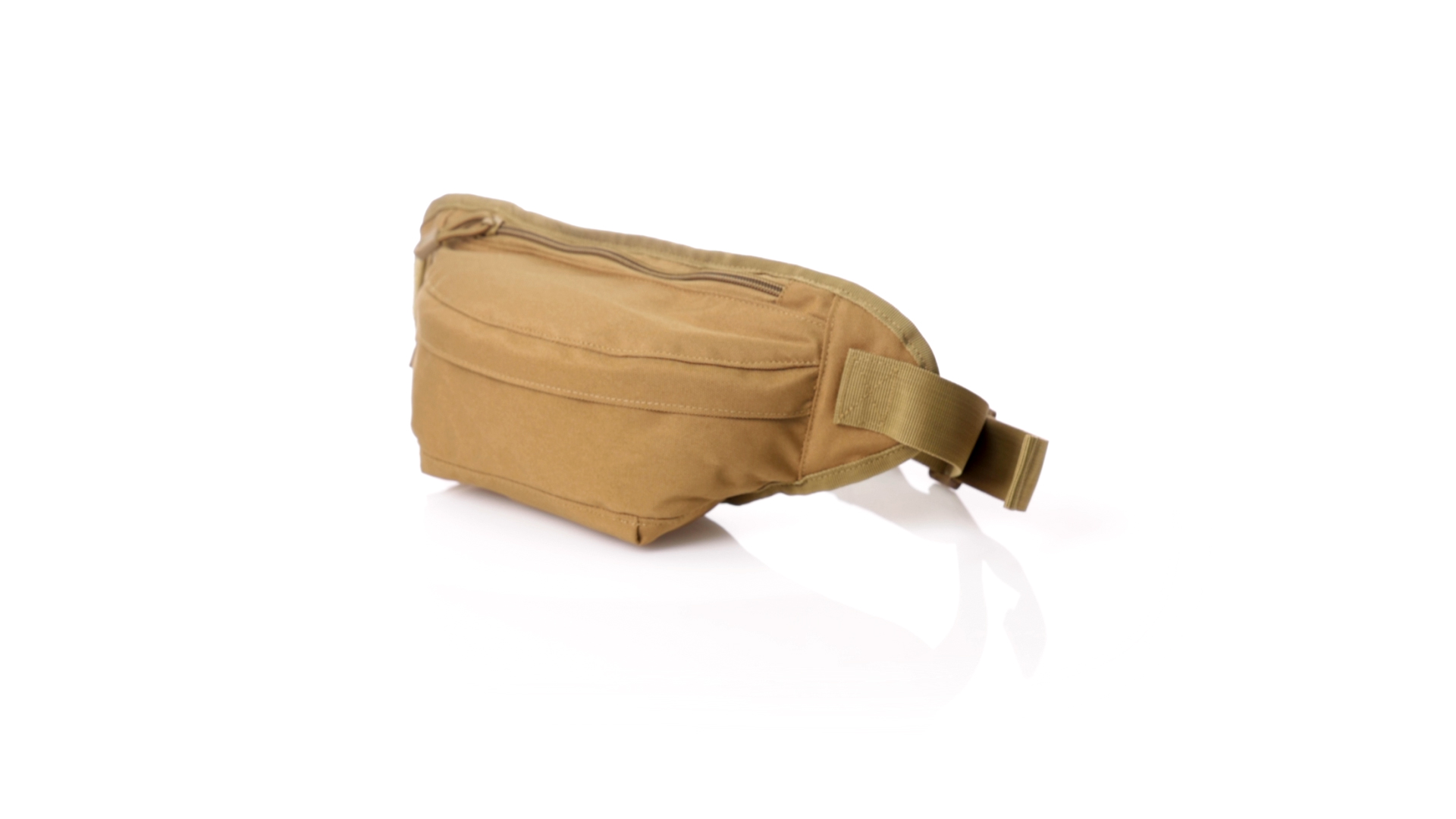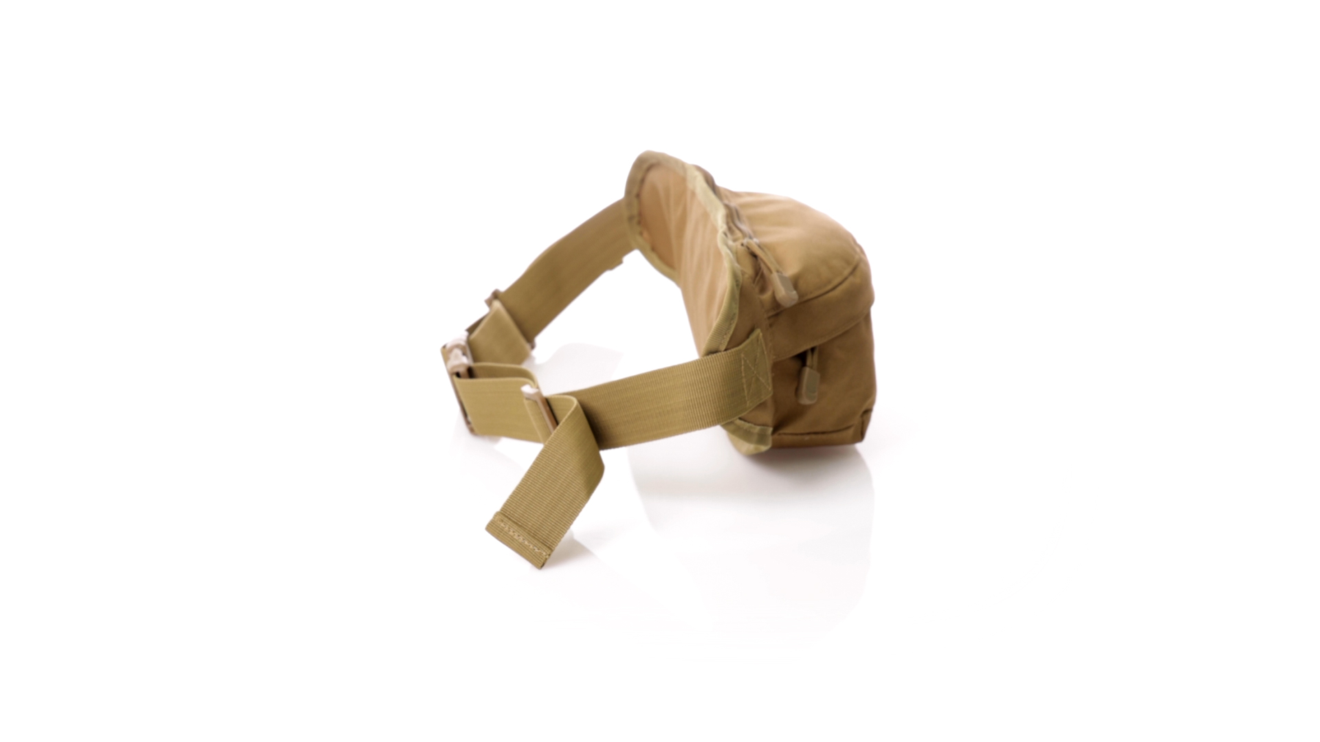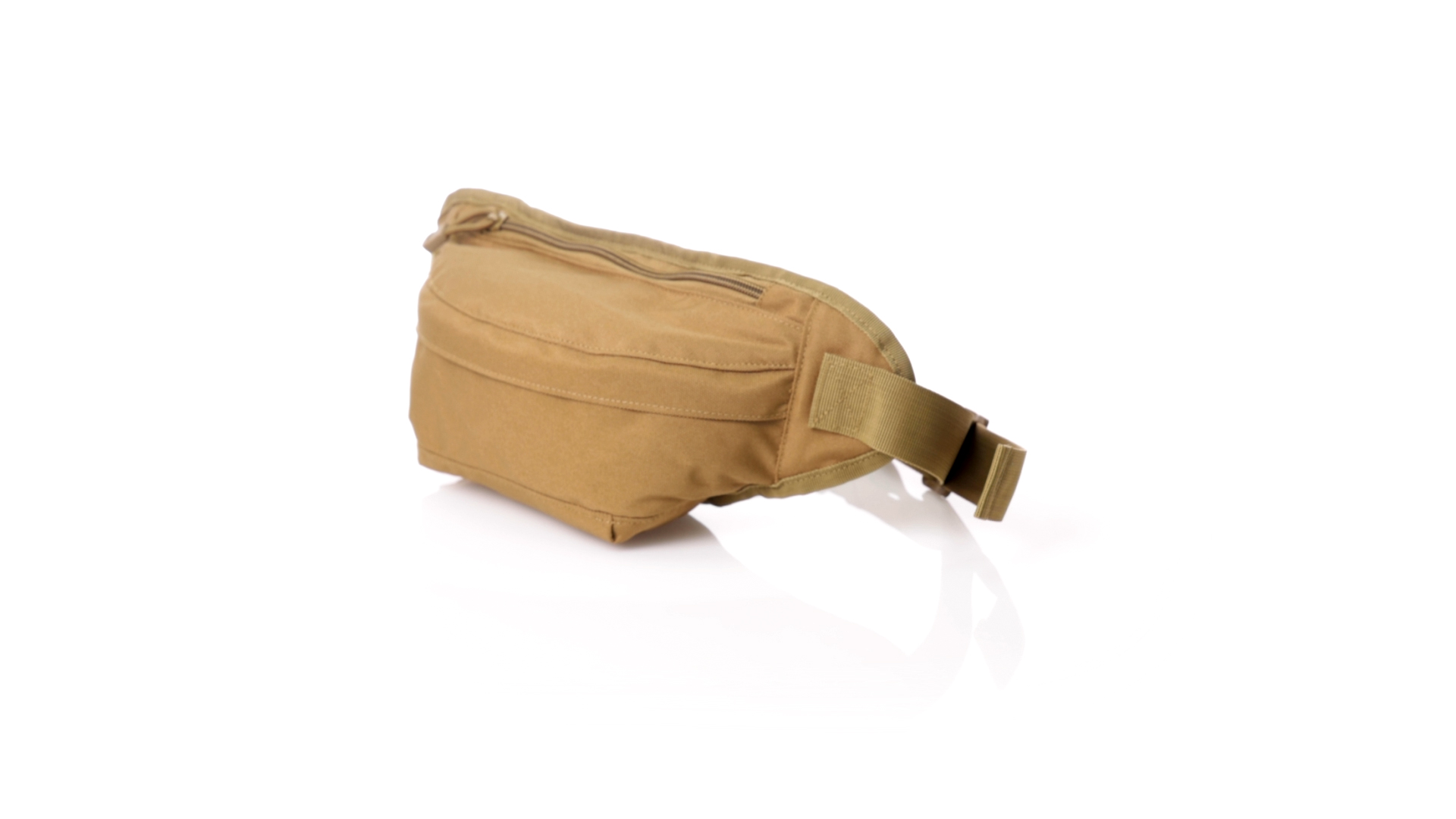 Gürteltasche aus strapazierfähigem 800D-Polyester und sandbraunem Ton. Mit 2 Reissverschlusstaschen und Riemen an Zugbändern zum einfachen Öffnen. Verstellbarer Gurt mit Schnallenverschluss, einzeln verpackt in einer recycelten Tasche.