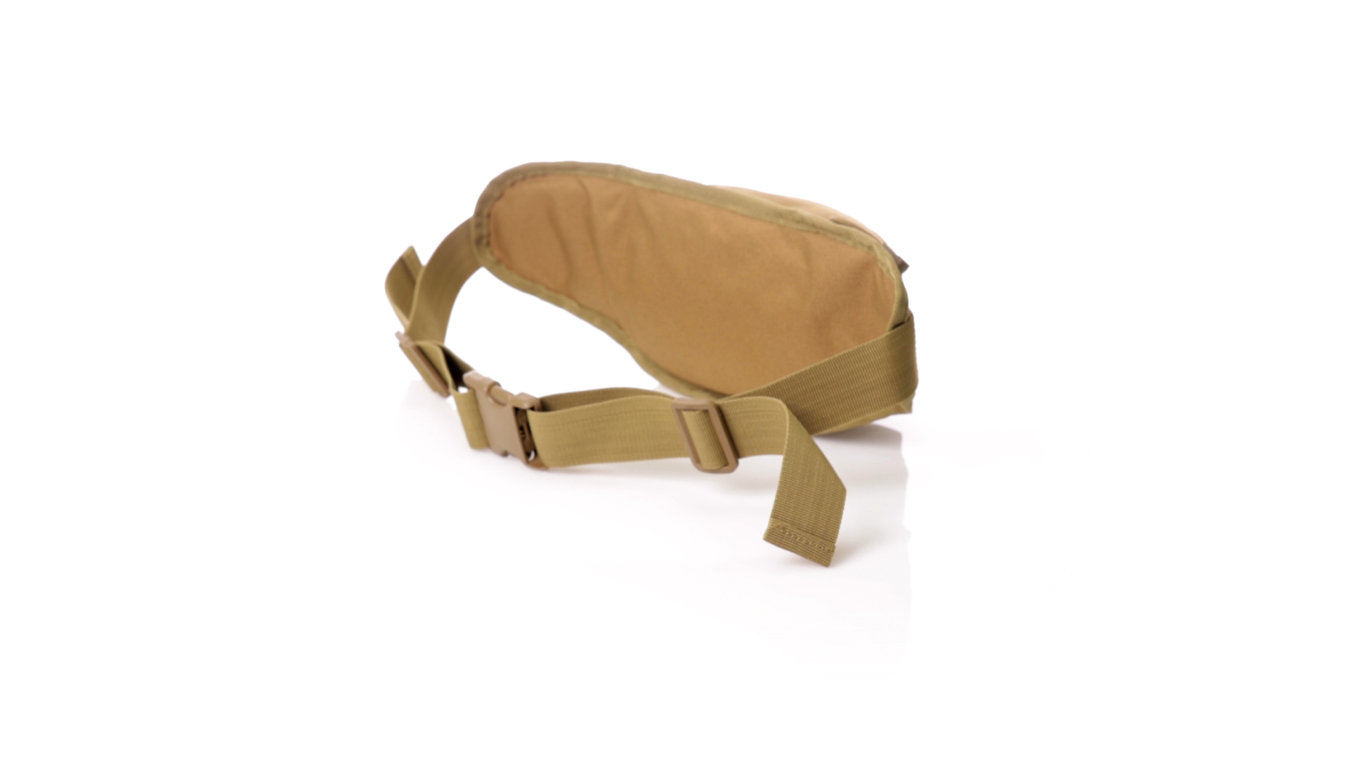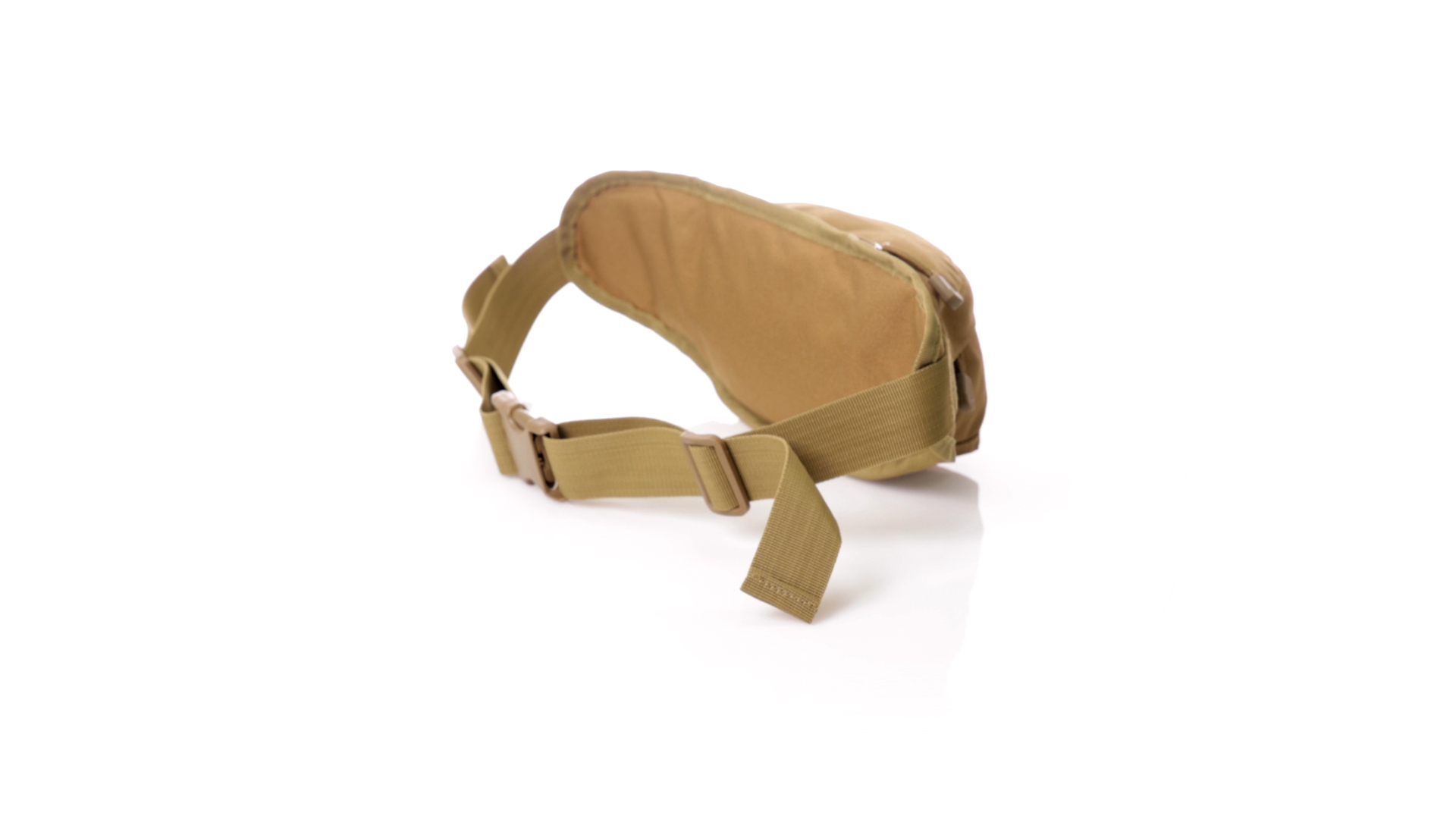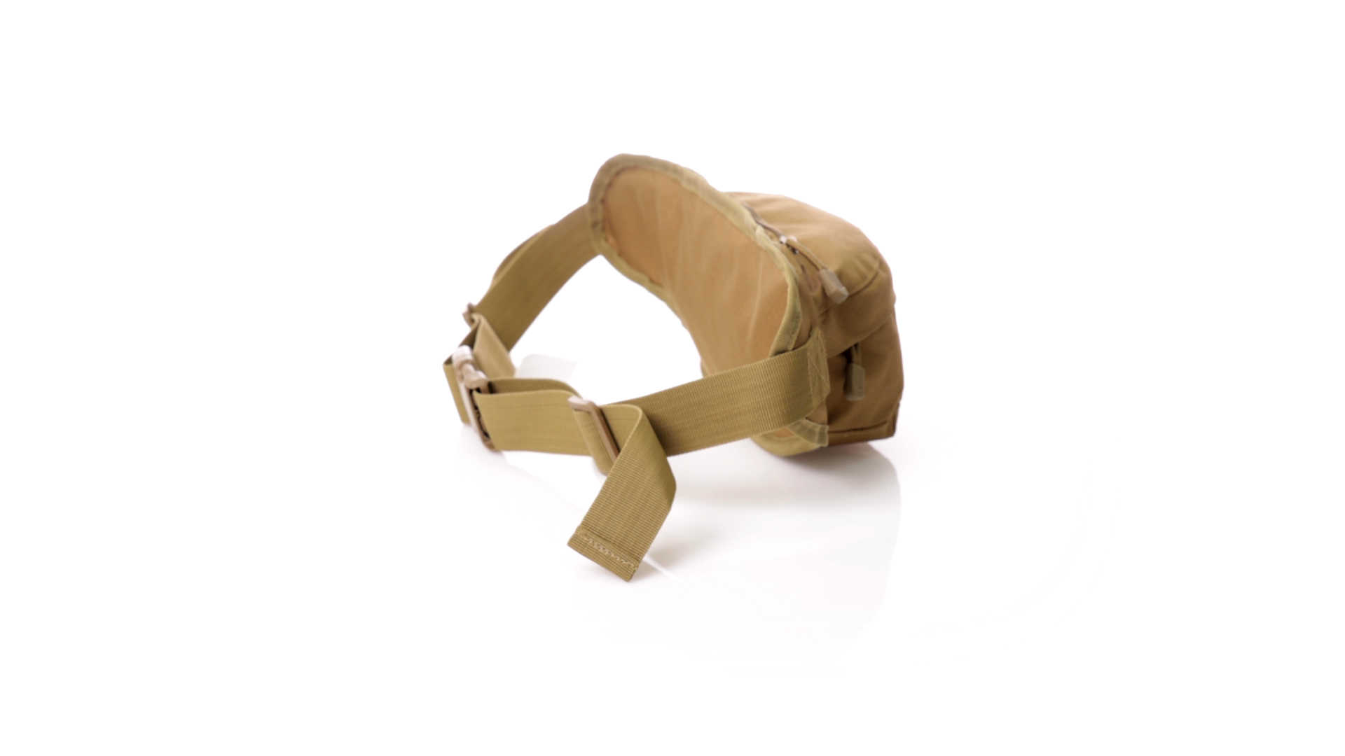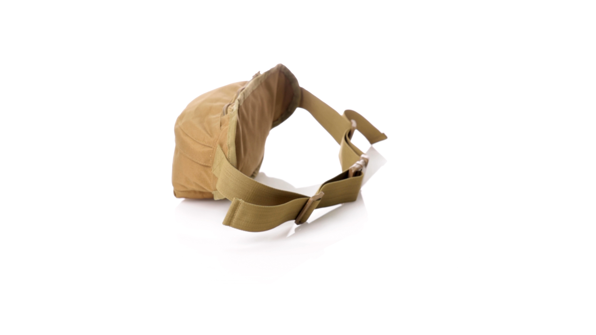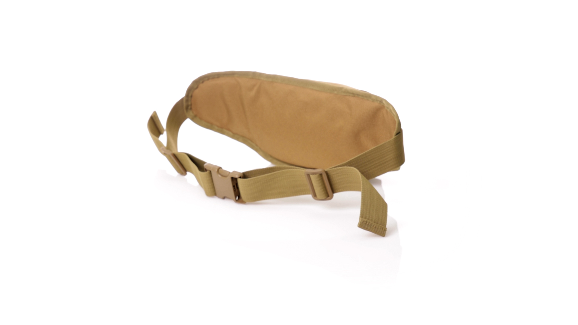 Gürteltasche aus strapazierfähigem 800D-Polyester und sandbraunem Ton. Mit 2 Reissverschlusstaschen und Riemen an Zugbändern zum einfachen Öffnen. Verstellbarer Gurt mit Schnallenverschluss, einzeln verpackt in einer recycelten Tasche.