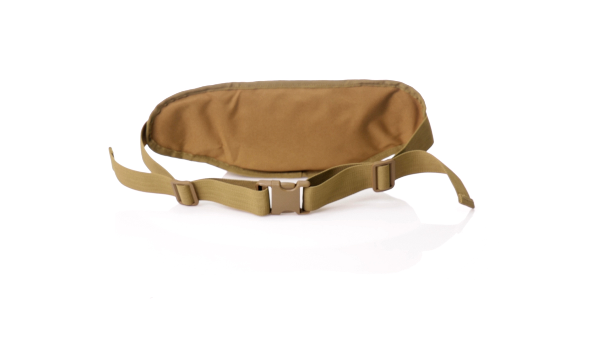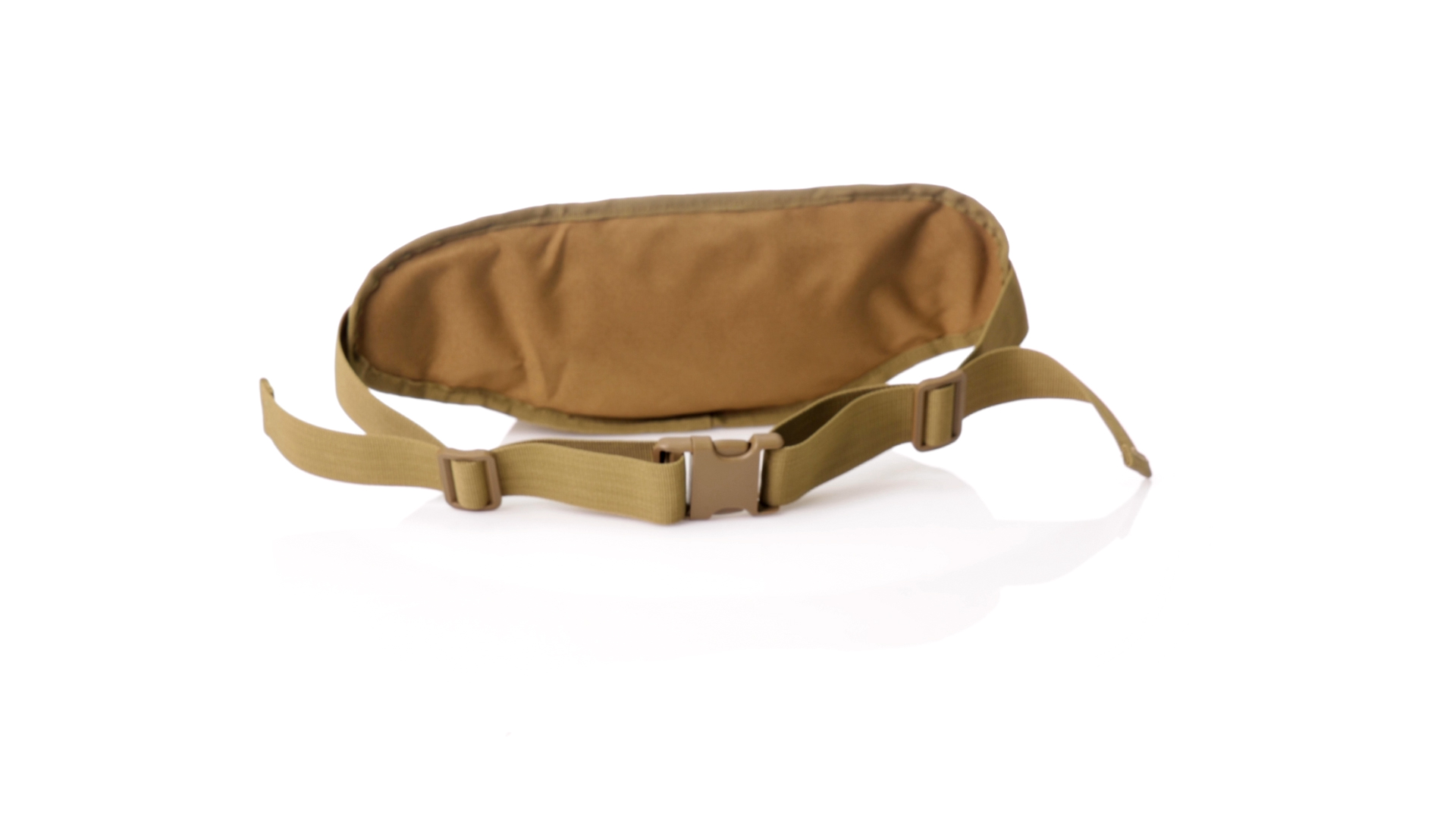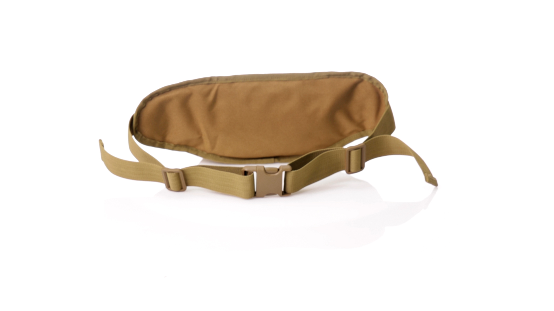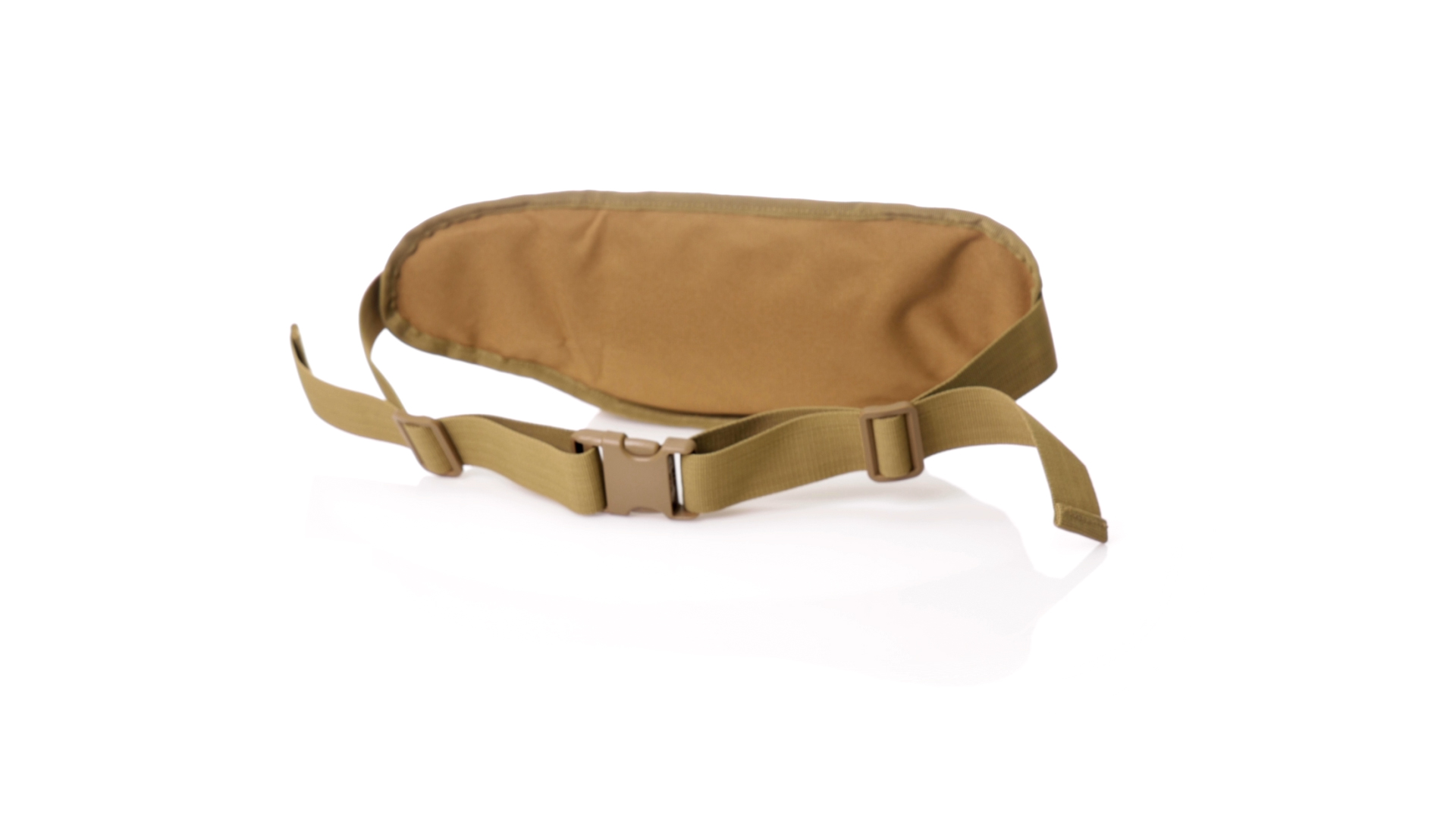 Gürteltasche aus strapazierfähigem 800D-Polyester und sandbraunem Ton. Mit 2 Reissverschlusstaschen und Riemen an Zugbändern zum einfachen Öffnen. Verstellbarer Gurt mit Schnallenverschluss, einzeln verpackt in einer recycelten Tasche.