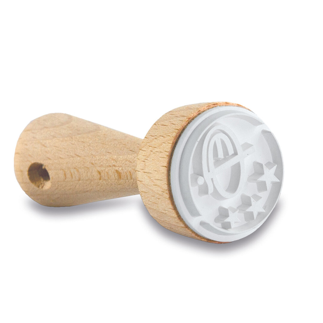 Individueller, gleichbleibender, lebensmittelechter Gummistempel. Holzgriff, Buche unbehandelt. Standardmass 3,5 cm und 5,5 cm, alle weiteren Grössen und Formen auf Anfrage. Ab 100 Stück aussen bedruckbare Werbekarte, innen auf Wunsch ein Backrezept. Kombinierbar mit passendem, rundem Backförmchen aus Edelstahl (spülmaschinenfest).