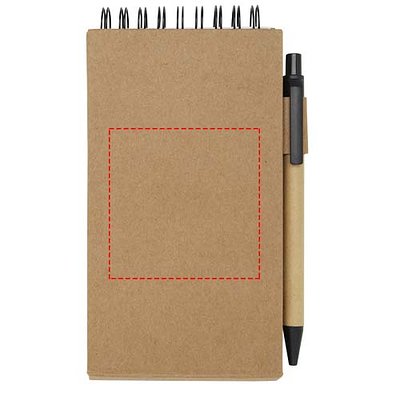 Haftnotizblock mit Kugelschreiber. Der Notizblock enthält 30 Seiten weisses und liniertes 70 g/m2 Papier (8 × 12 cm). Er enthält ausserdem 25 mehrfarbige (5 × 1,2 cm) und 25 gelbe (7,5 × 7,5 cm) Haftnotizen, beide aus 70 g/m2 Papier. Der Schaft des Kugelschreibers besteht aus recyceltem Papier. Tintenfarbe: Schwarz. Schreiblänge: 1000 Meter. Schreibspitze: 1 mm.