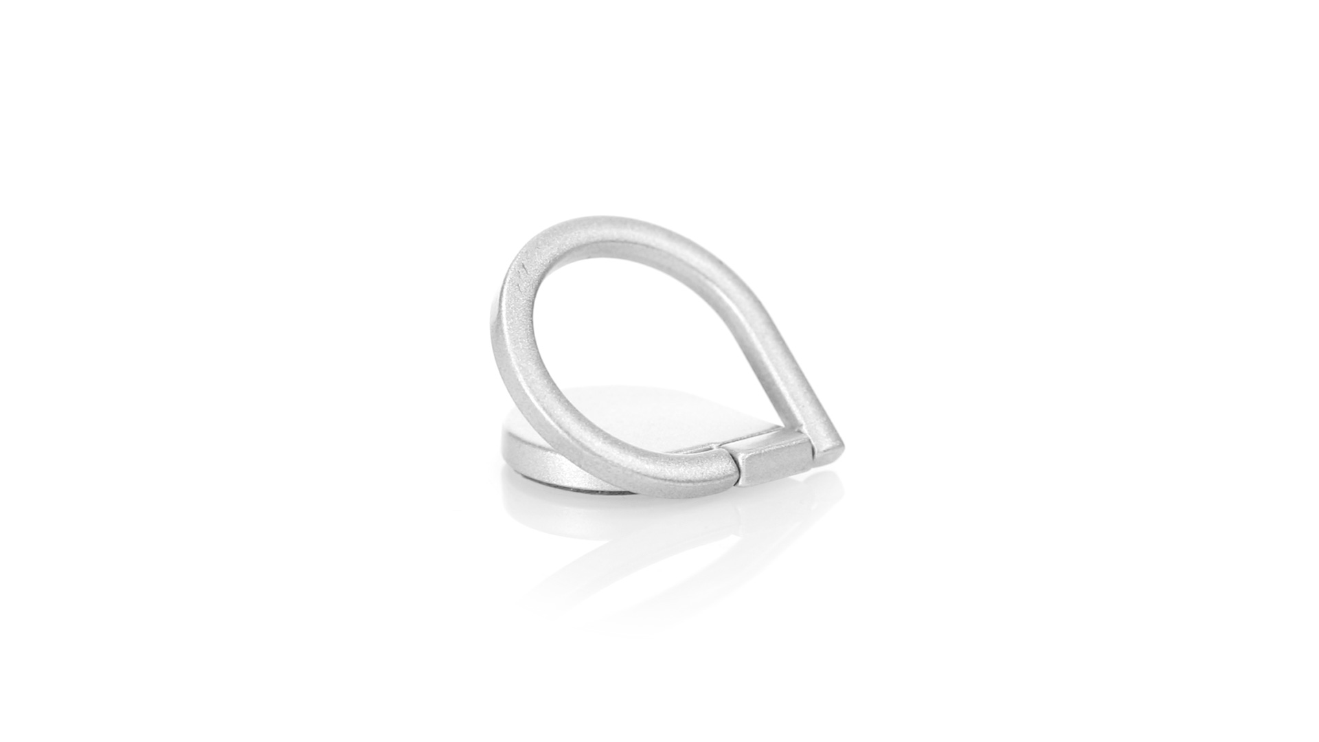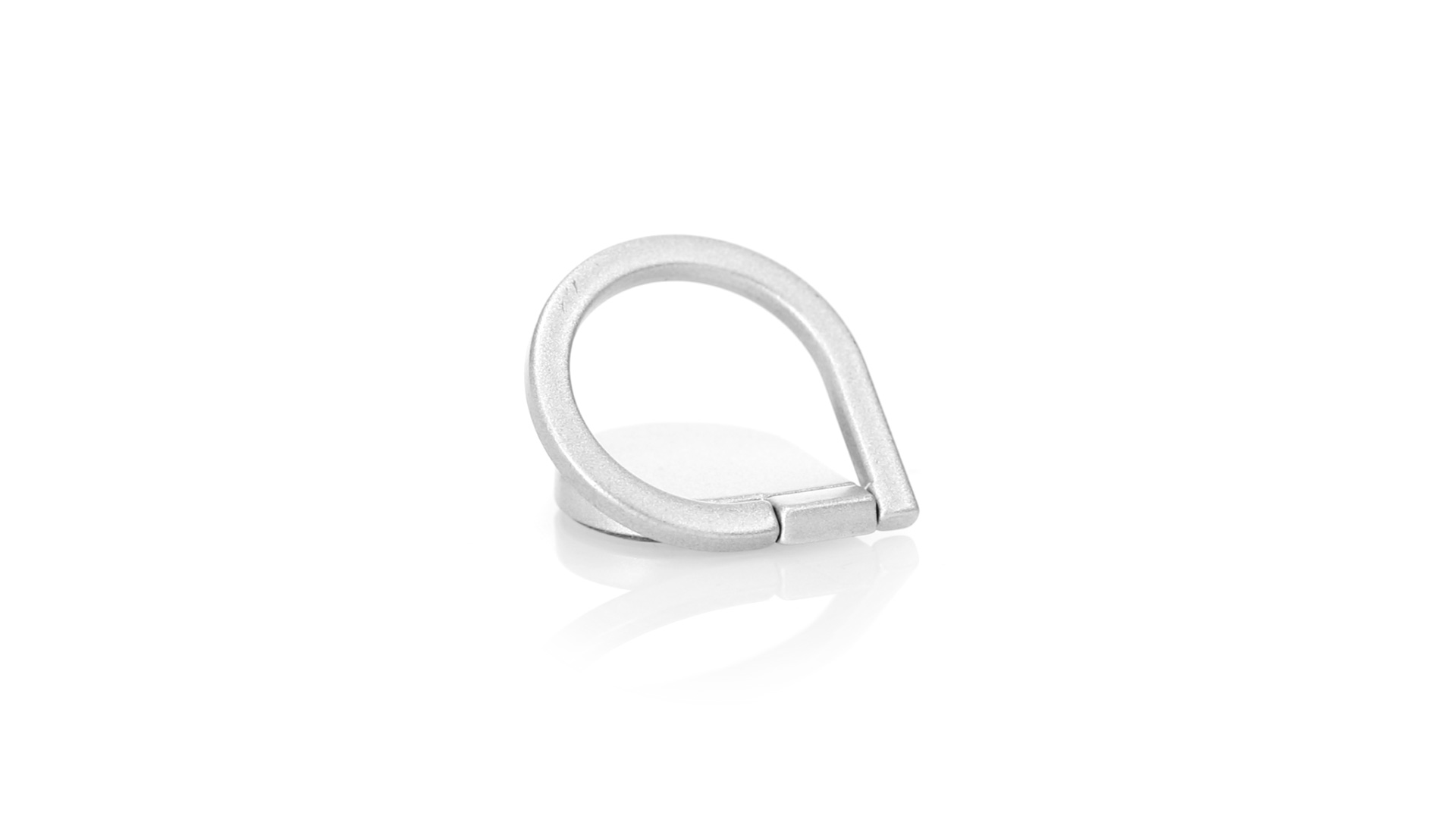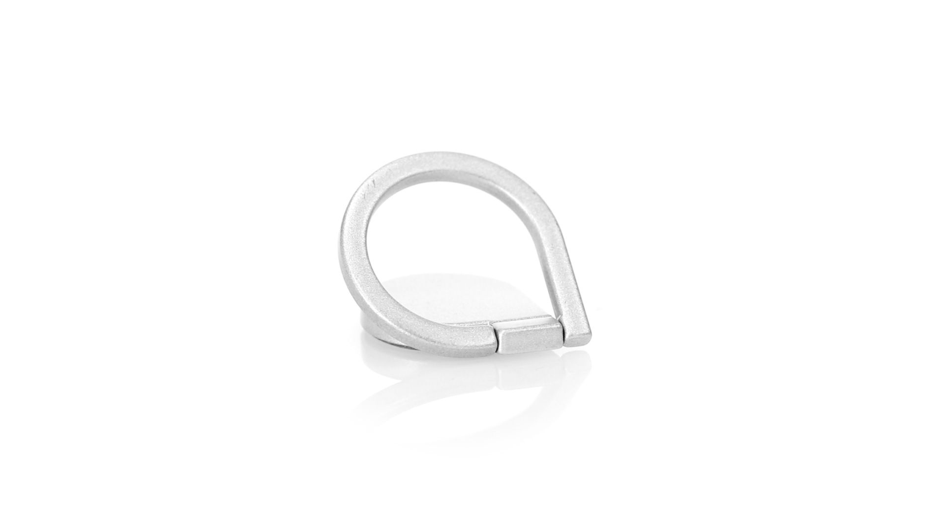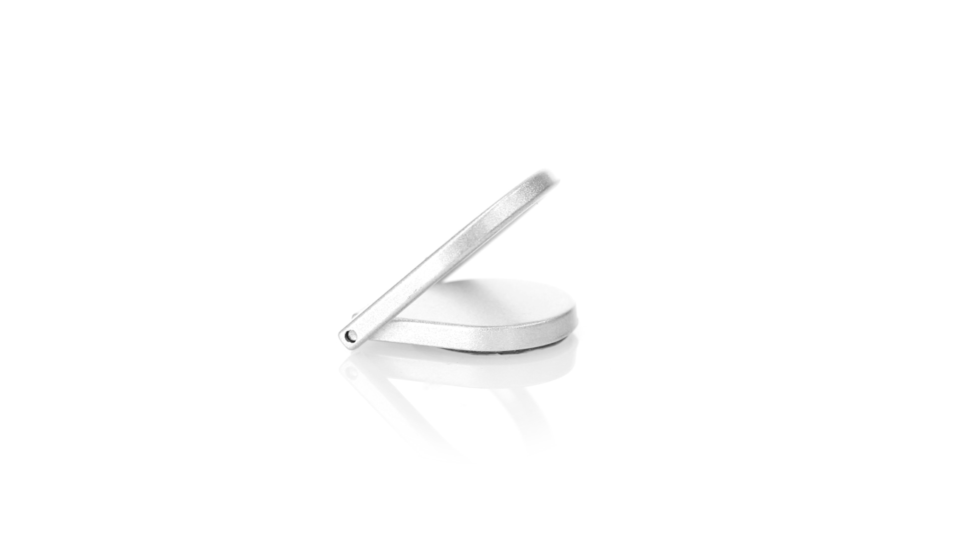 Smartphone-Halterung aus Metall in mattem Finish. Elegantes Design und 3M-Kleber, extra stark und rückstandsfrei beim Ablösen vom Gerät. Mit rückseitiger Fingerringauflage und präsentiert in individueller Designtasche.