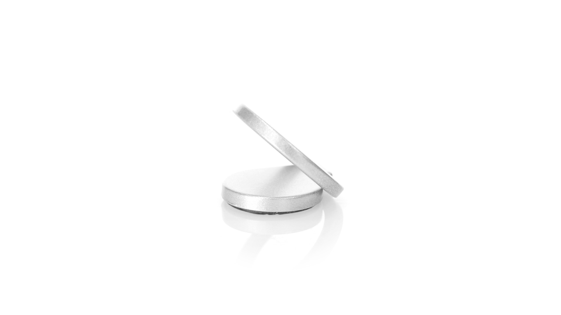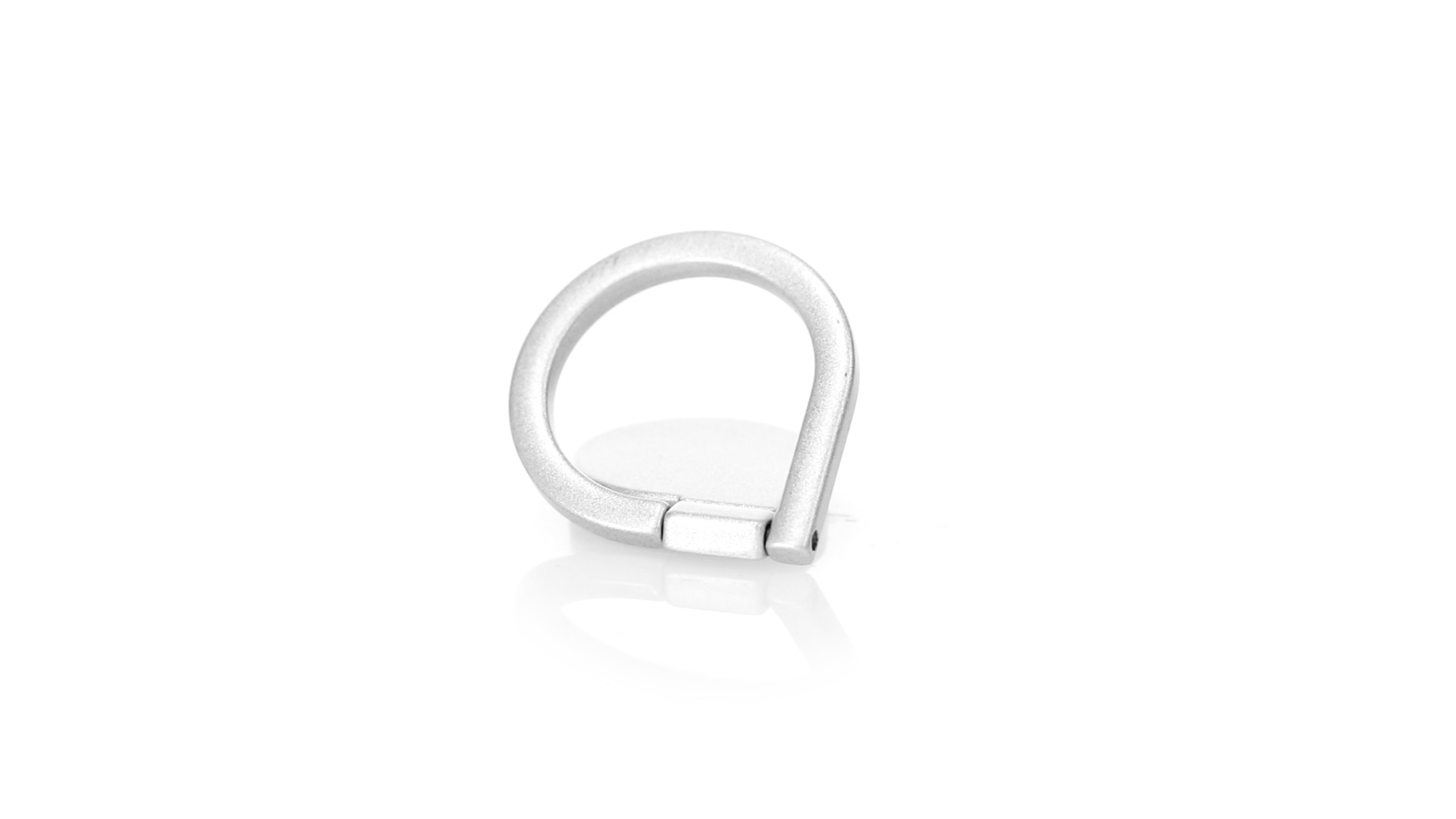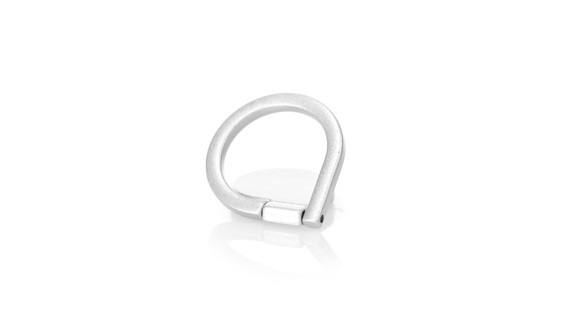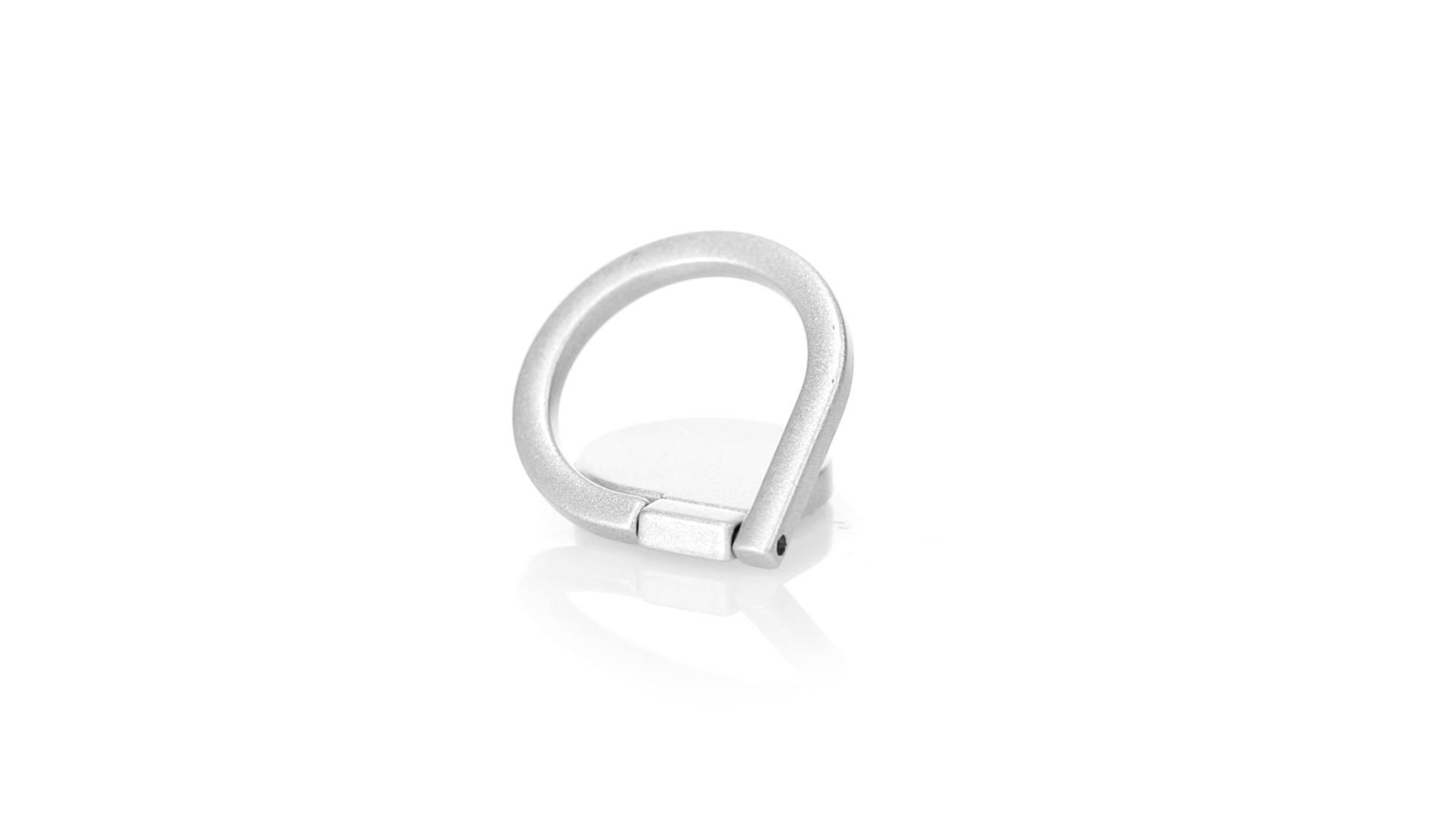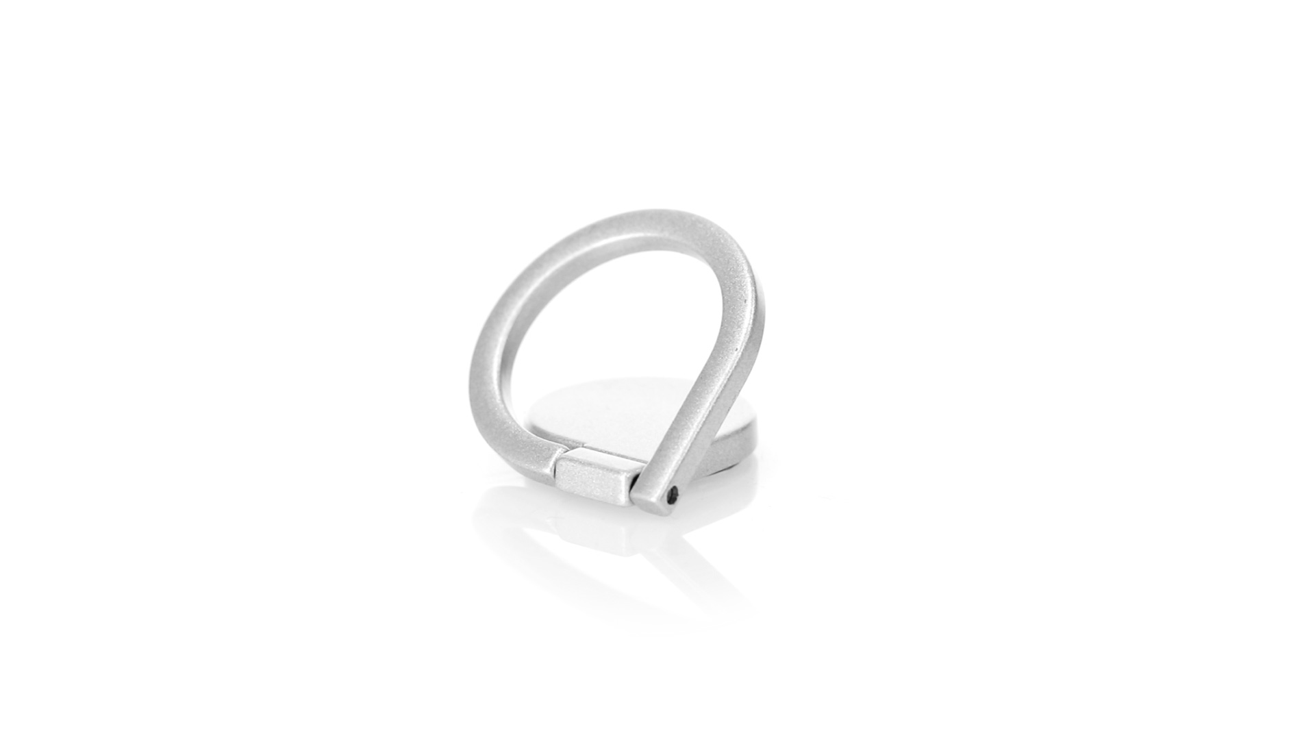 Smartphone-Halterung aus Metall in mattem Finish. Elegantes Design und 3M-Kleber, extra stark und rückstandsfrei beim Ablösen vom Gerät. Mit rückseitiger Fingerringauflage und präsentiert in individueller Designtasche.