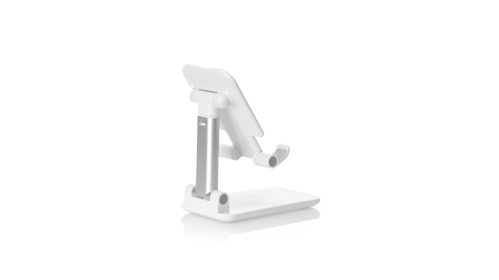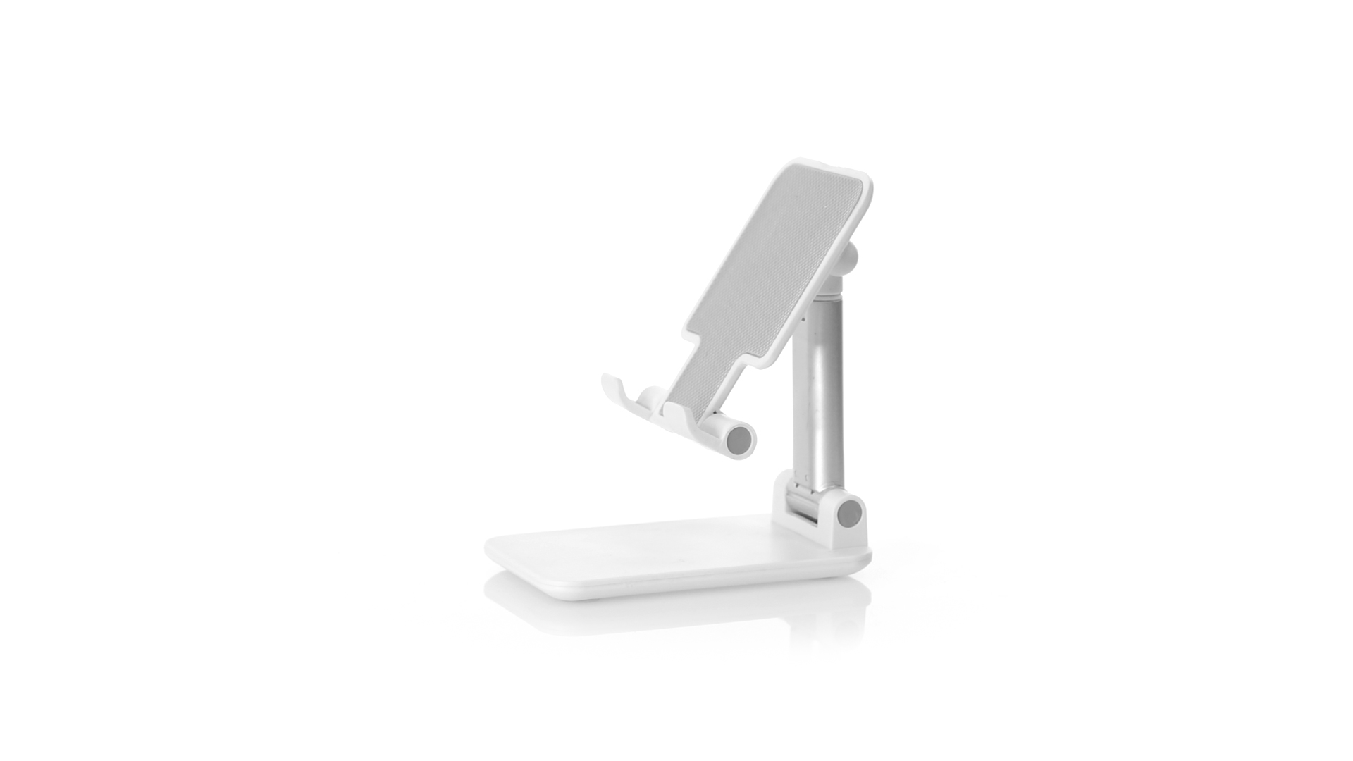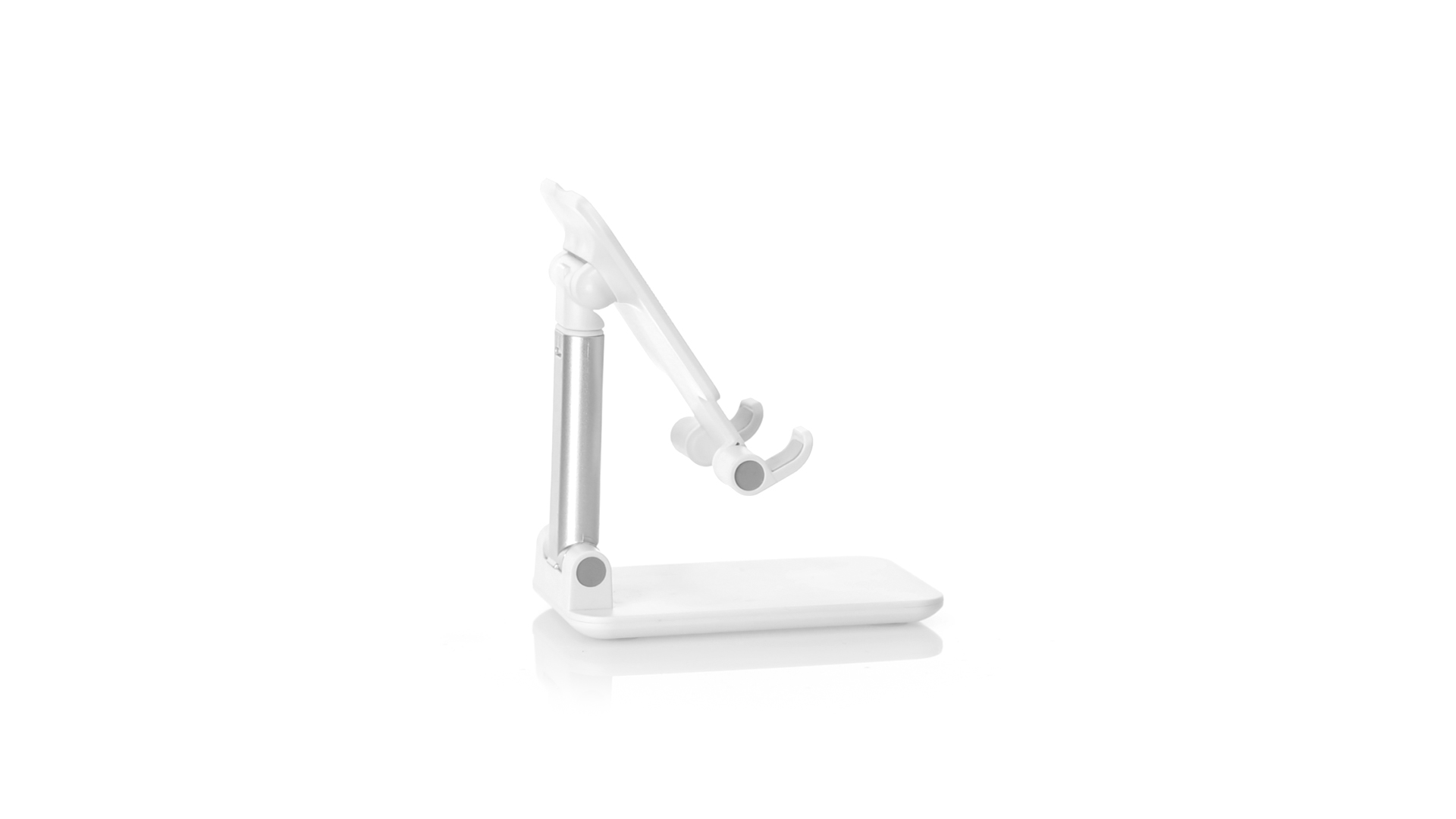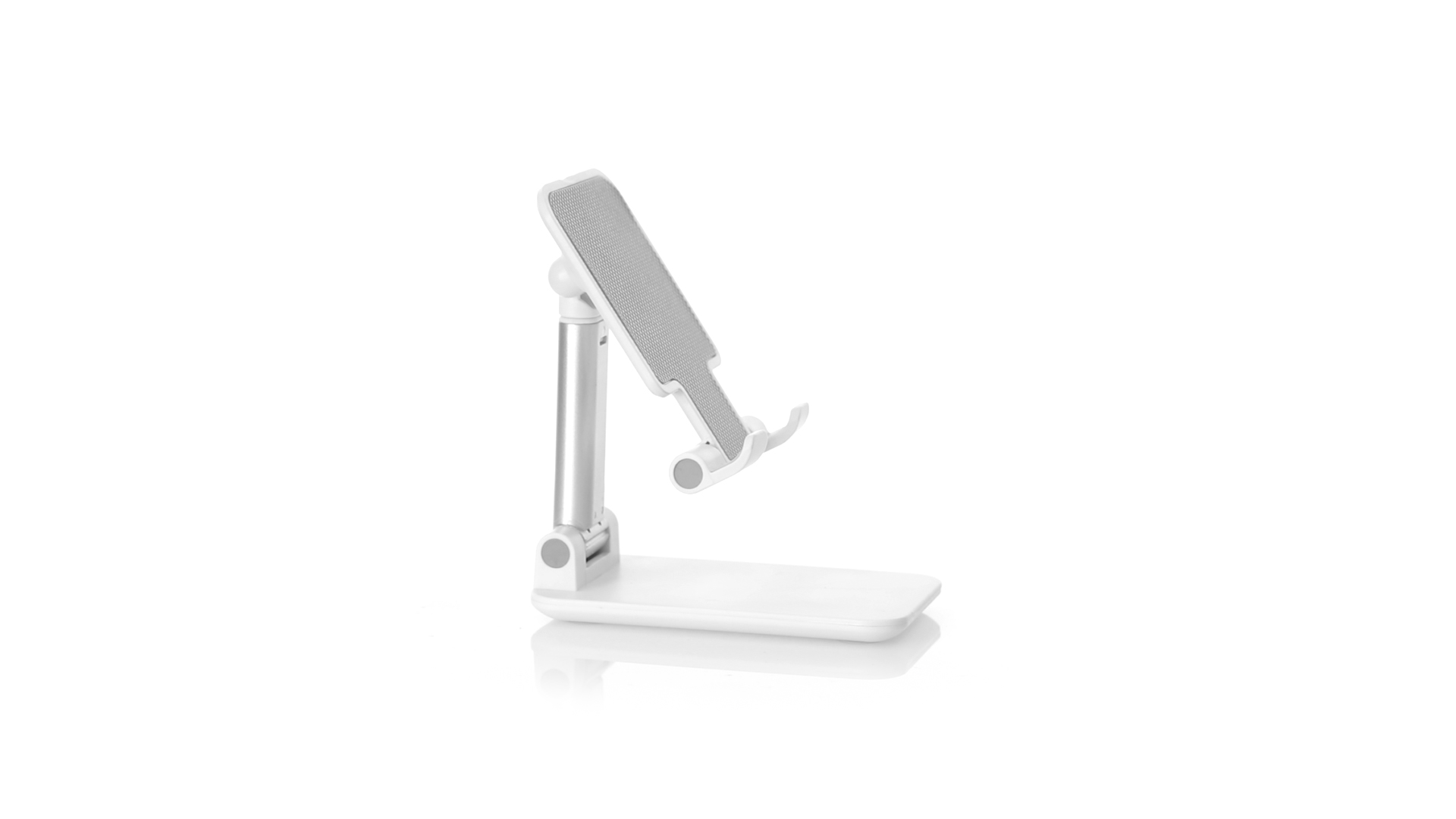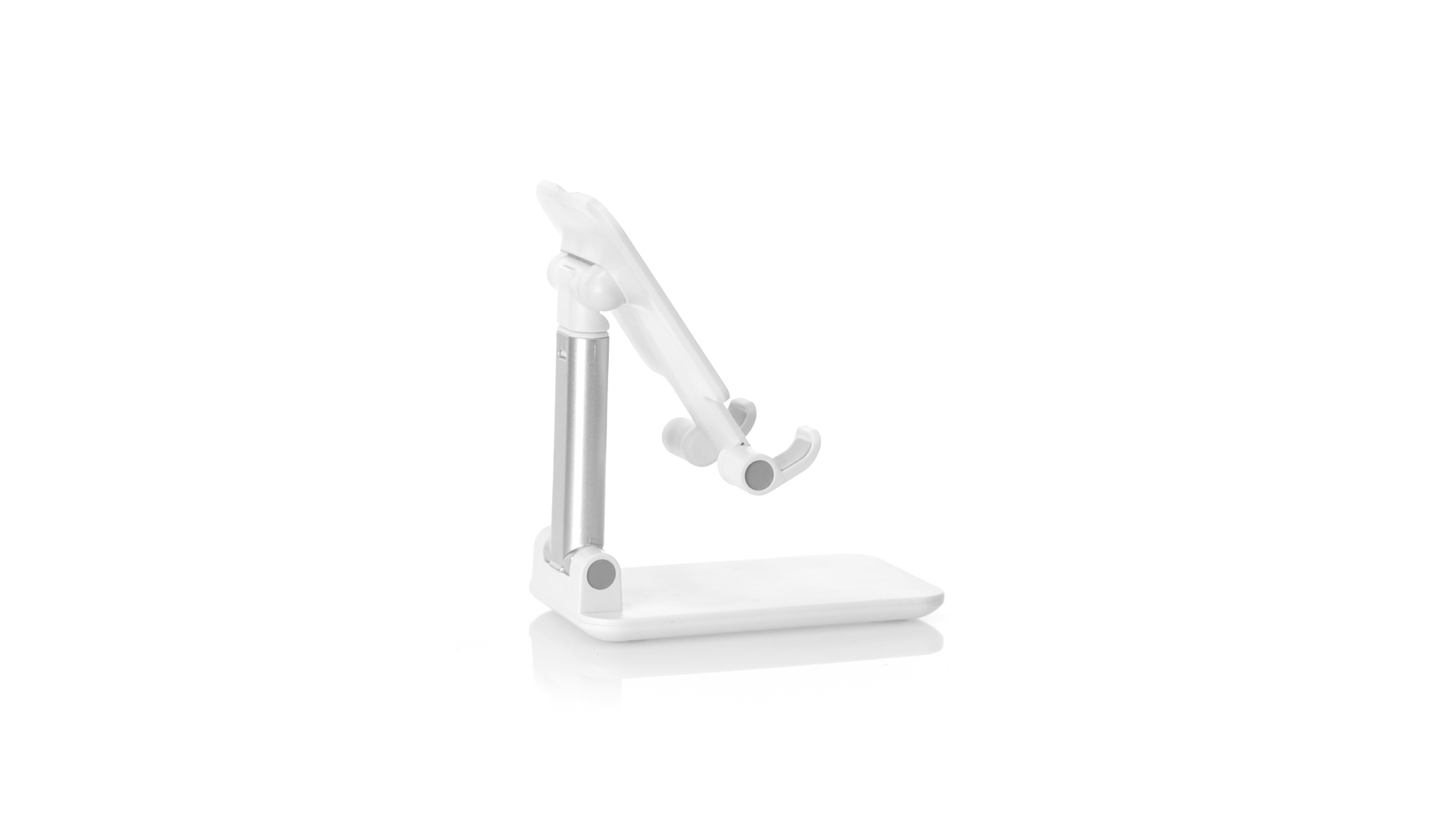 Faltbarer Ständer für Smartphones und Tablets. Höhenverstellbar, inklusive rutschfesten Gummischutz an der Basis und Stütze. In schlichtem Weiss und mit grosser Beschriftungsfläche, besonders geeignet für den Tampondruck. Präsentiert in einer attraktiven Designbox.