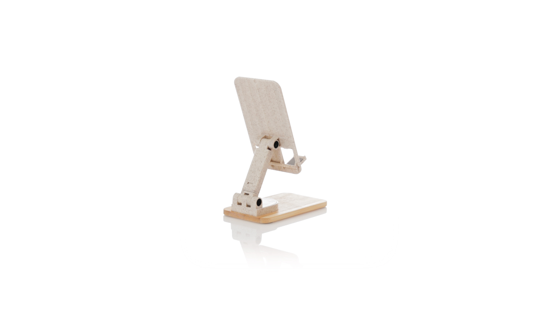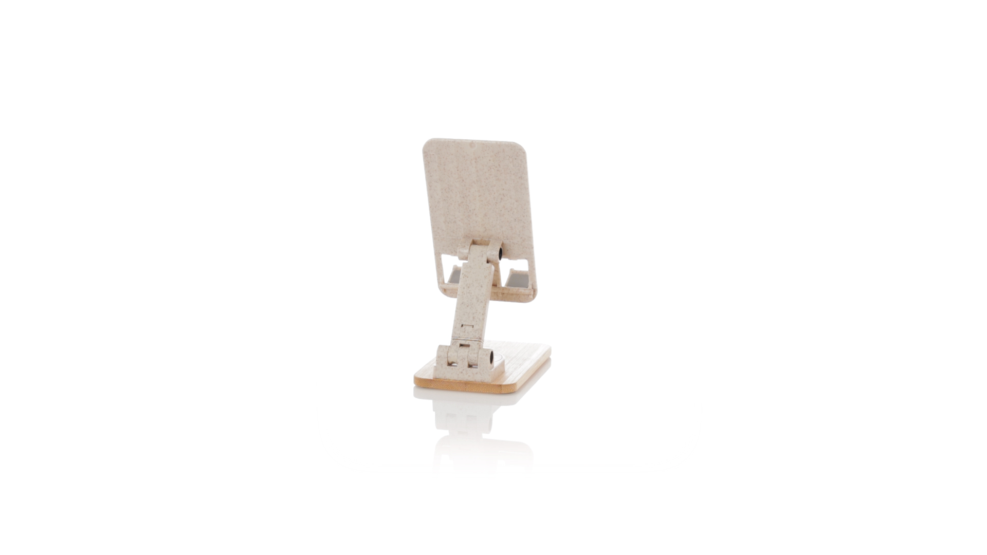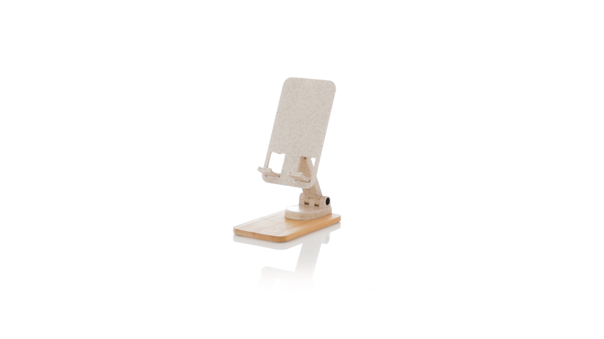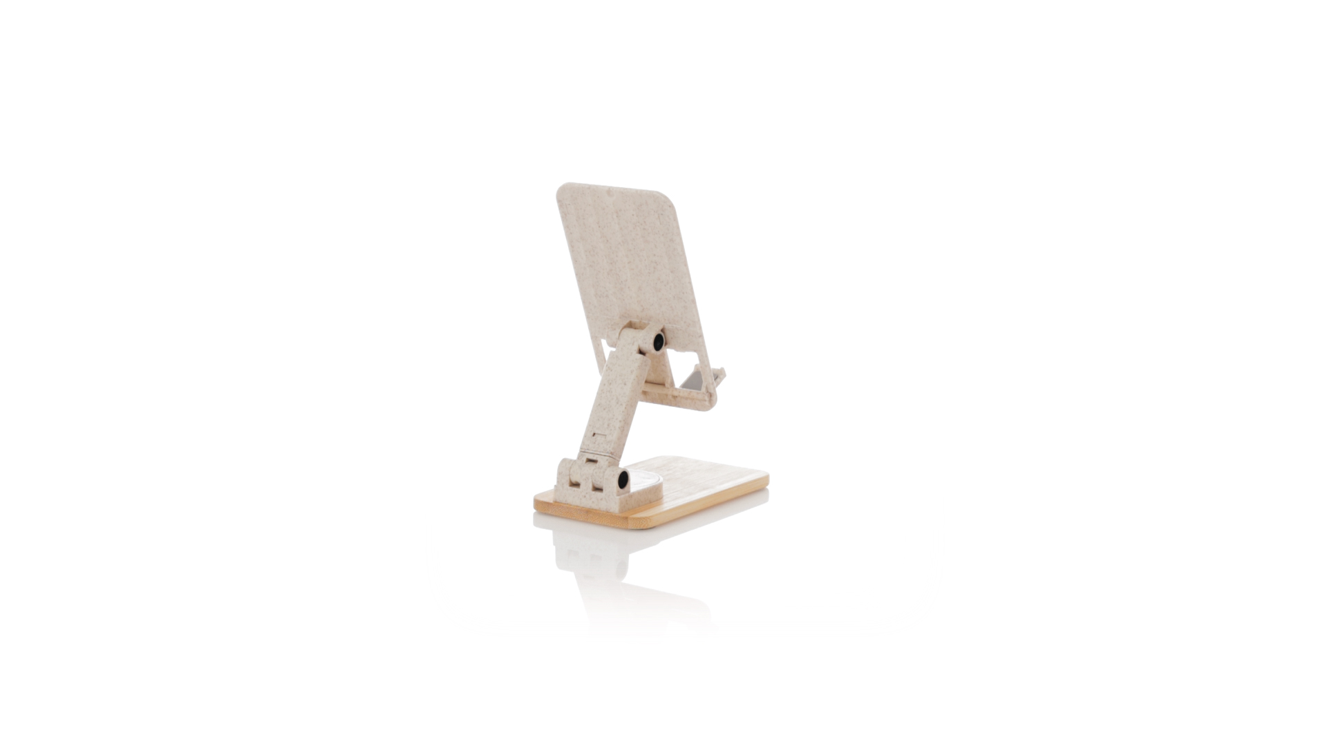 Faltbarer Halter für Smartphones und Tablets, aus Weizenstroh mit widerstandsfähigem Bambusgrund. Höhenverstellbar, mit rutschfesten Gummiauflagen an Fuss und Halterung. Grosse Branding-Oberfläche, besonders geeignet für Tampondruck auf dem Halter und Laserdruck auf der Basis.Materialien wie Bambus fördern die Verwendung natürlicher Rohstoffe und reduzieren die Schadstoffemissionen. Es stammt von einer sehr widerstandsfähigen und vielseitigen Pflanze mit schnellem Wachstum und Regeneration, was es zu einer ausgezeichneten Alternative zu traditionellem Holz macht.Weizenstroh fördert die Verwendung natürlicher Rohstoffe und reduziert so die Schadstoffemissionen.