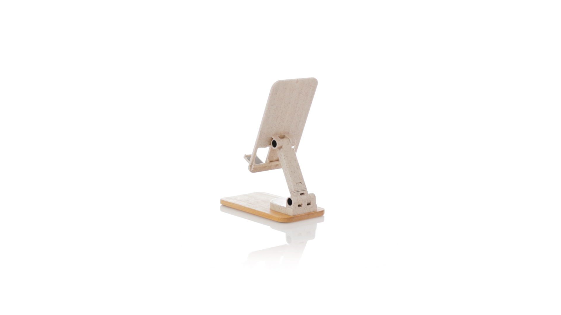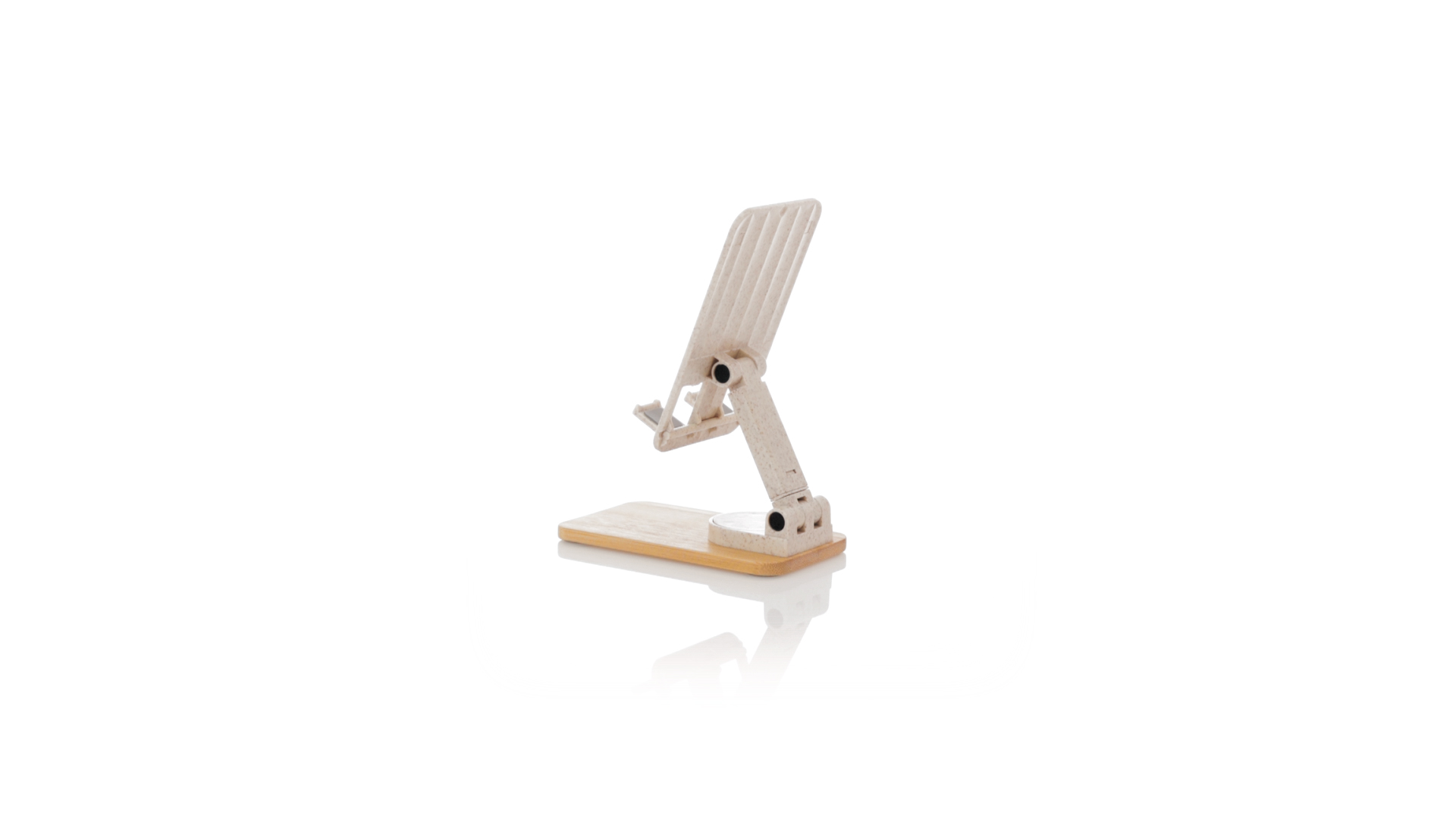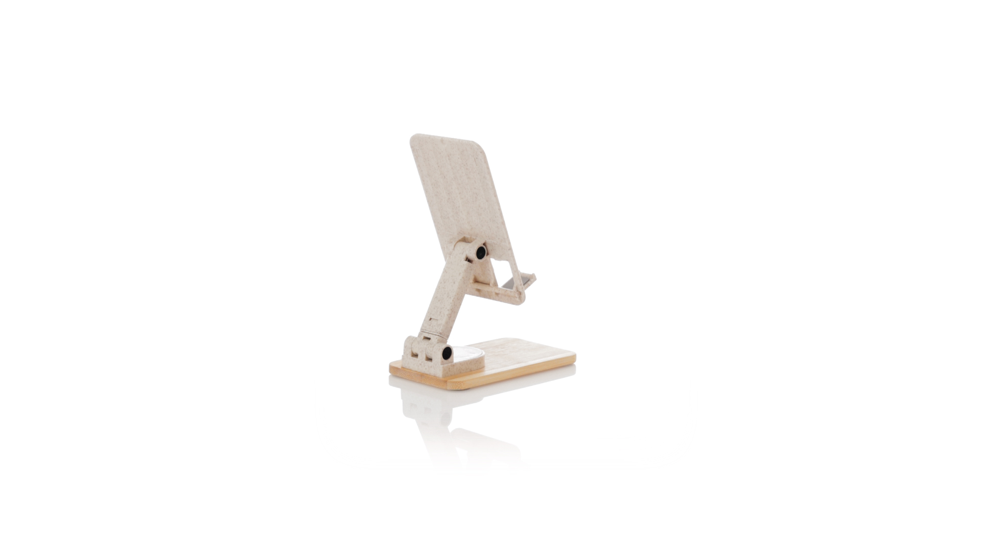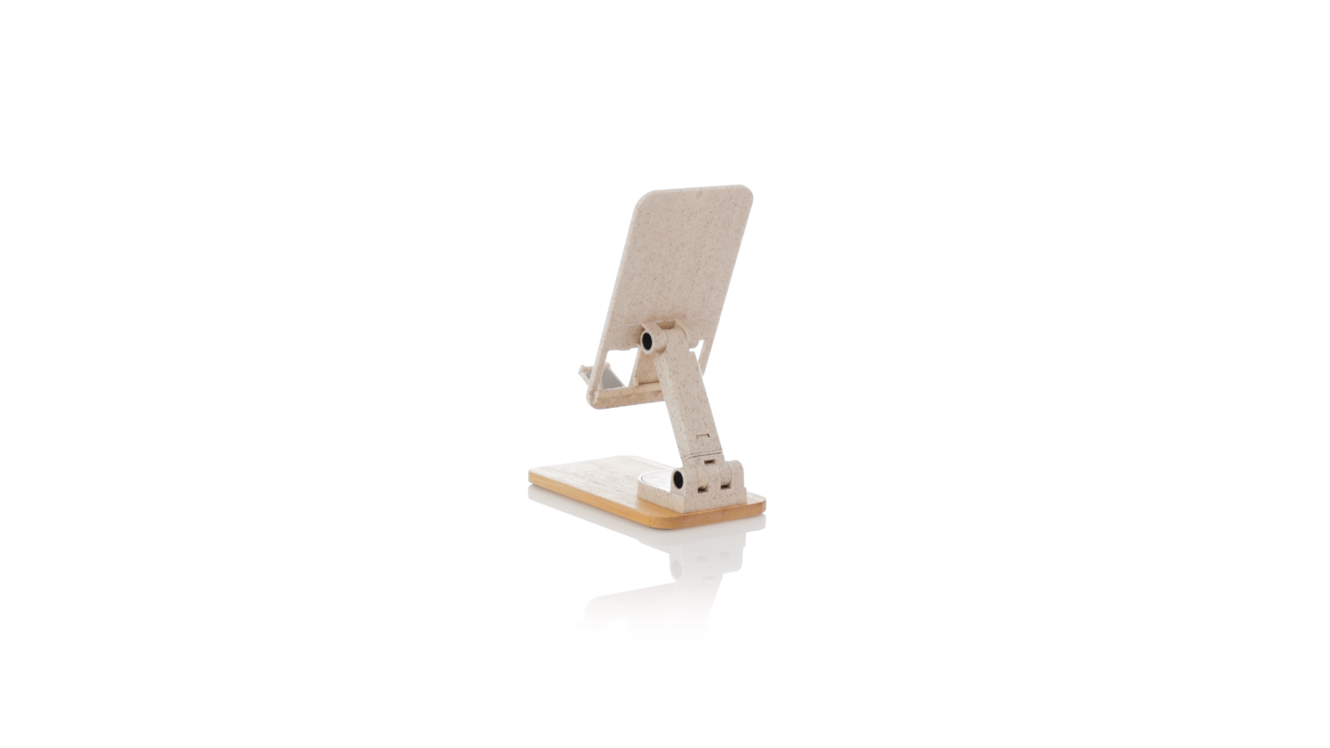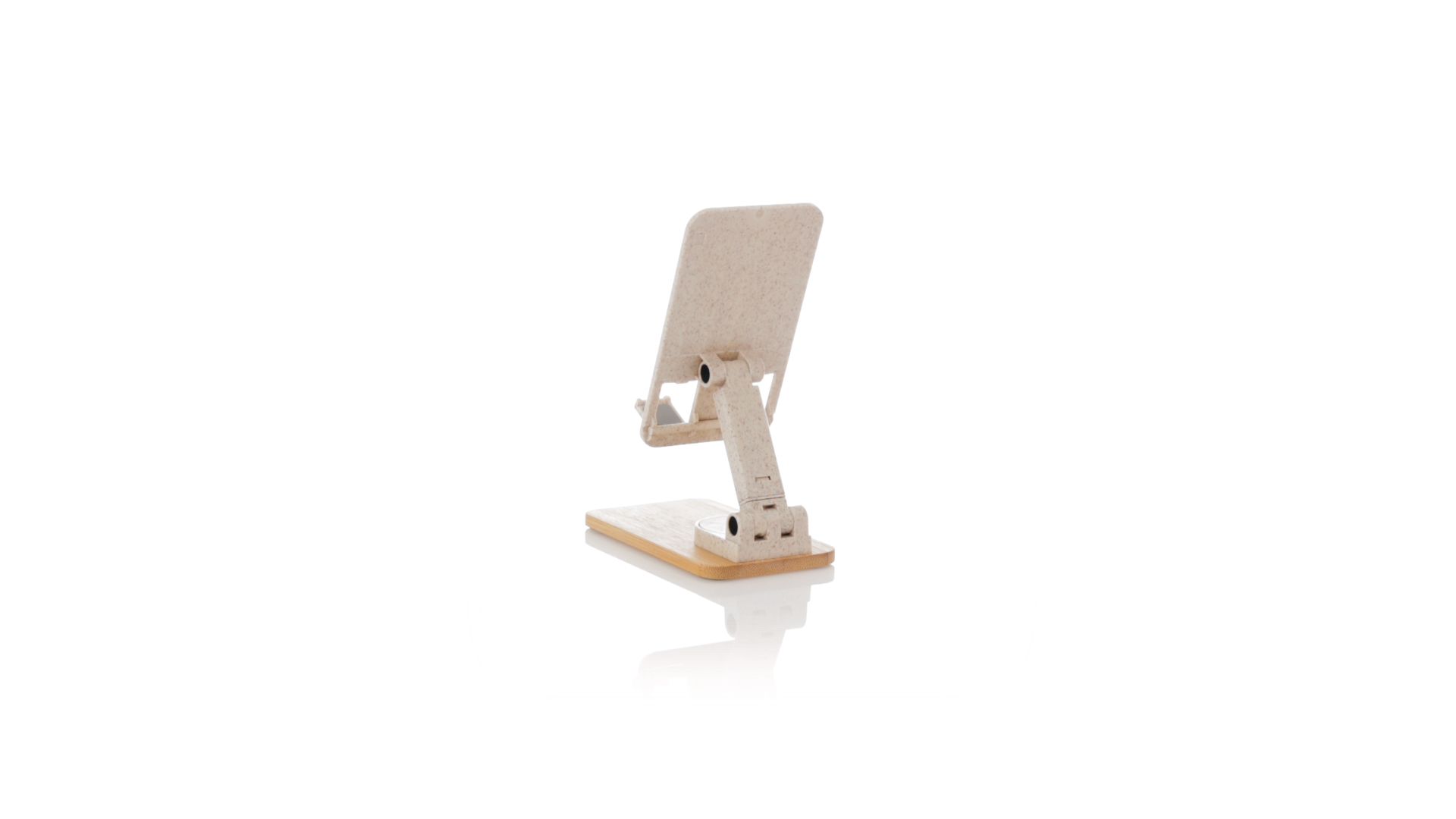 Faltbarer Halter für Smartphones und Tablets, aus Weizenstroh mit widerstandsfähigem Bambusgrund. Höhenverstellbar, mit rutschfesten Gummiauflagen an Fuss und Halterung. Grosse Branding-Oberfläche, besonders geeignet für Tampondruck auf dem Halter und Laserdruck auf der Basis.Materialien wie Bambus fördern die Verwendung natürlicher Rohstoffe und reduzieren die Schadstoffemissionen. Es stammt von einer sehr widerstandsfähigen und vielseitigen Pflanze mit schnellem Wachstum und Regeneration, was es zu einer ausgezeichneten Alternative zu traditionellem Holz macht.Weizenstroh fördert die Verwendung natürlicher Rohstoffe und reduziert so die Schadstoffemissionen.