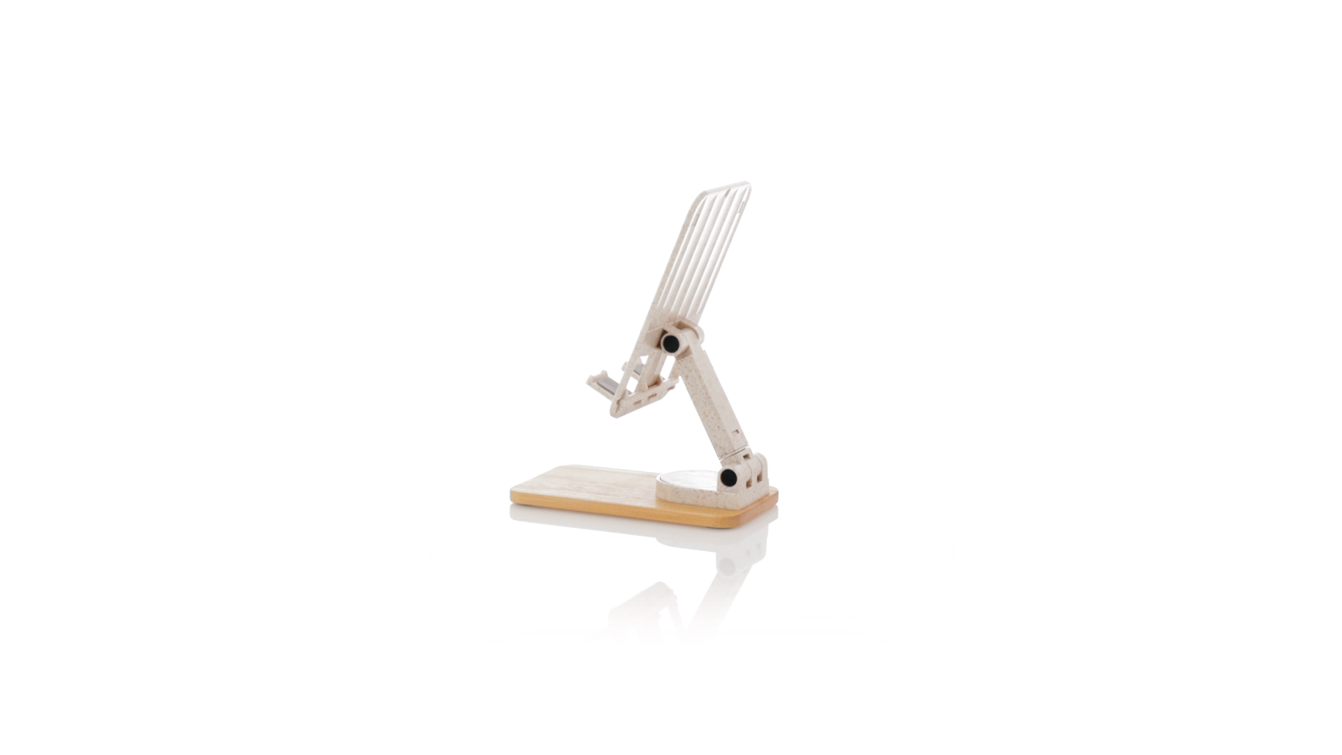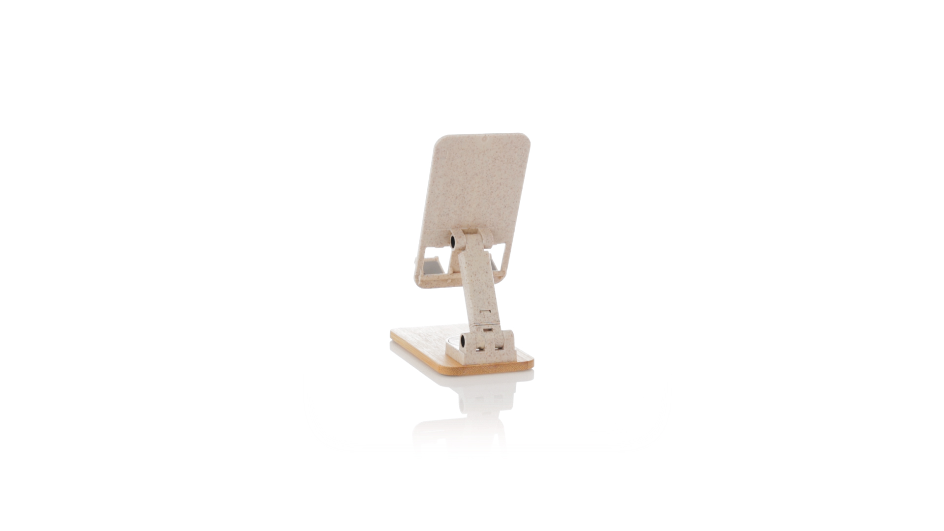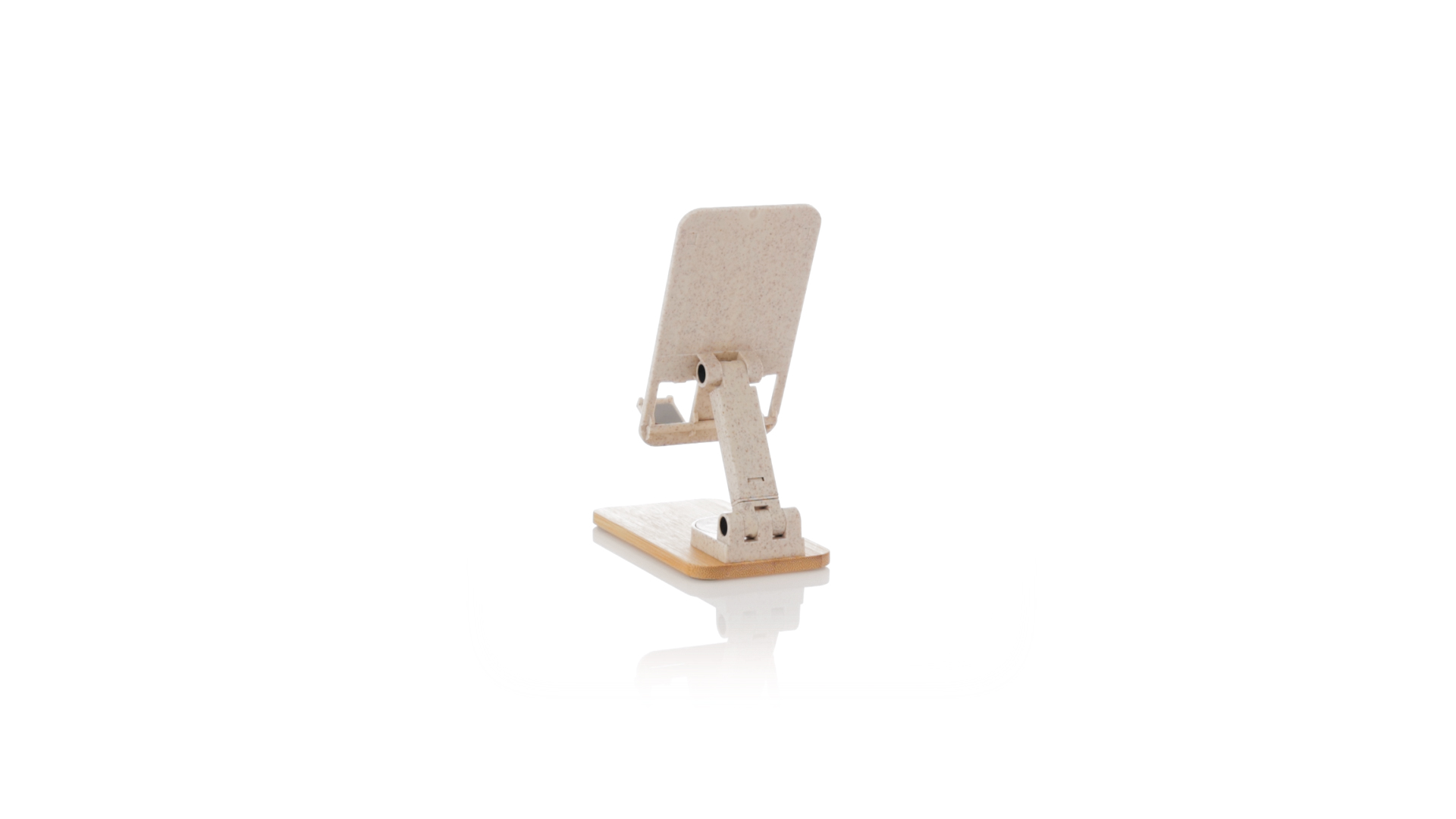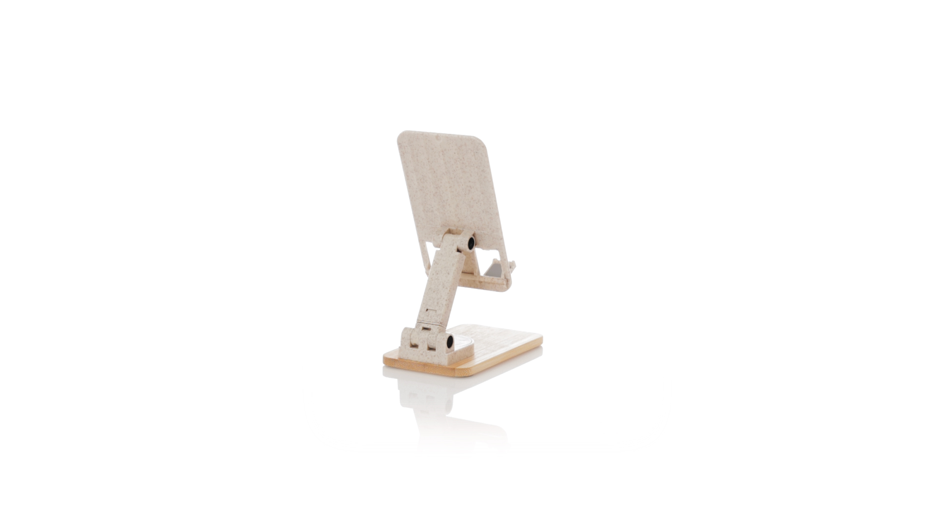 Faltbarer Halter für Smartphones und Tablets, aus Weizenstroh mit widerstandsfähigem Bambusgrund. Höhenverstellbar, mit rutschfesten Gummiauflagen an Fuss und Halterung. Grosse Branding-Oberfläche, besonders geeignet für Tampondruck auf dem Halter und Laserdruck auf der Basis.Materialien wie Bambus fördern die Verwendung natürlicher Rohstoffe und reduzieren die Schadstoffemissionen. Es stammt von einer sehr widerstandsfähigen und vielseitigen Pflanze mit schnellem Wachstum und Regeneration, was es zu einer ausgezeichneten Alternative zu traditionellem Holz macht.Weizenstroh fördert die Verwendung natürlicher Rohstoffe und reduziert so die Schadstoffemissionen.