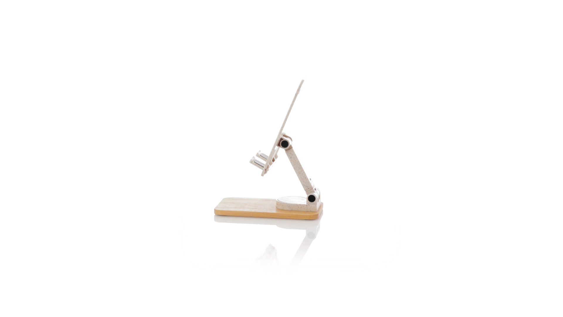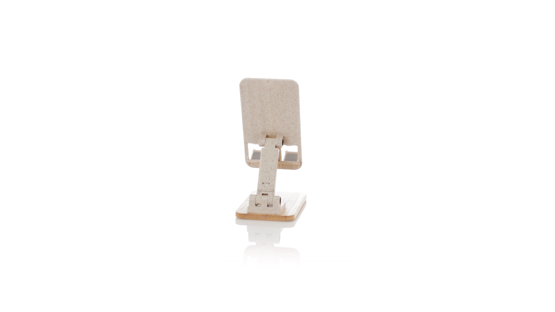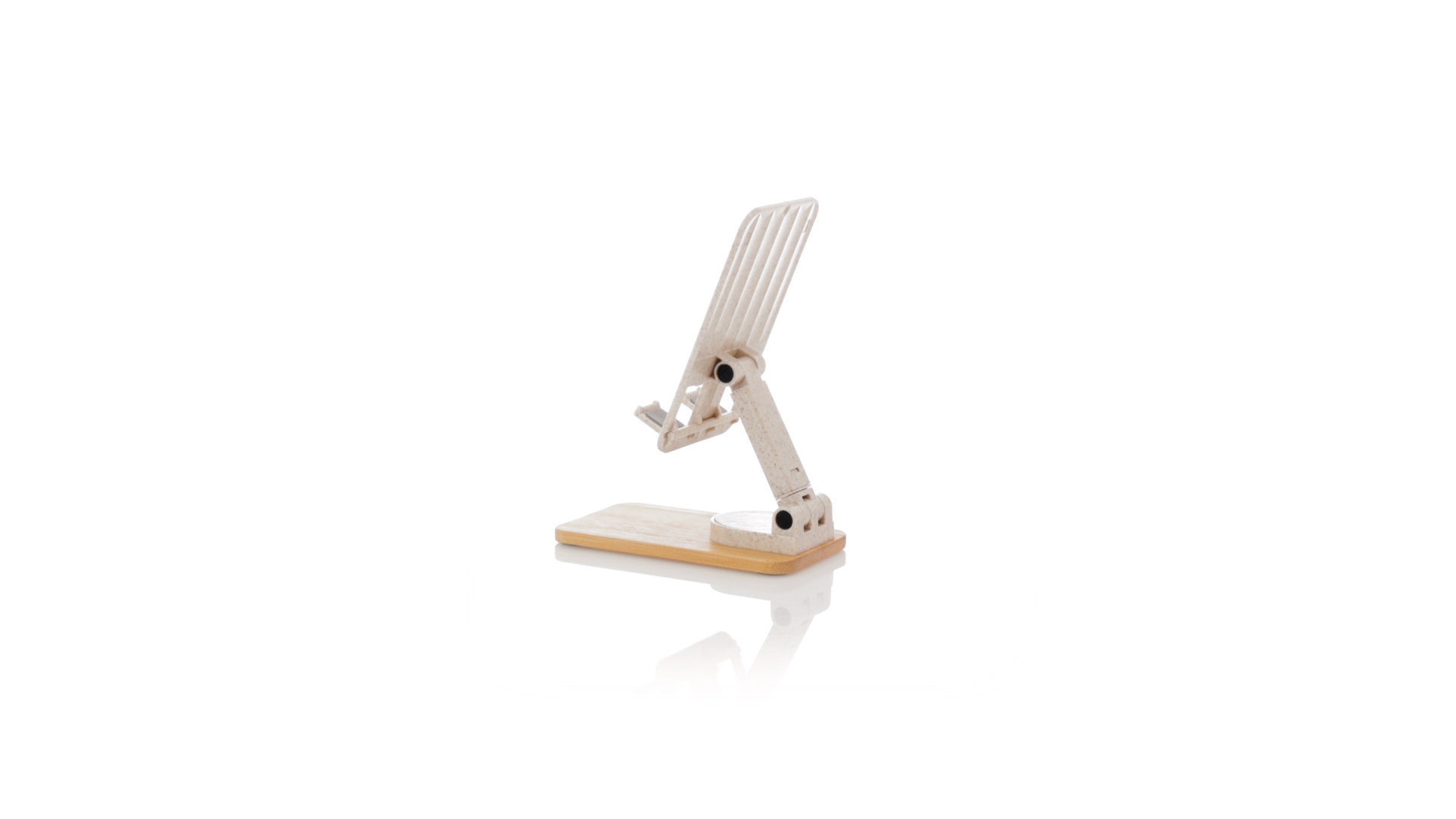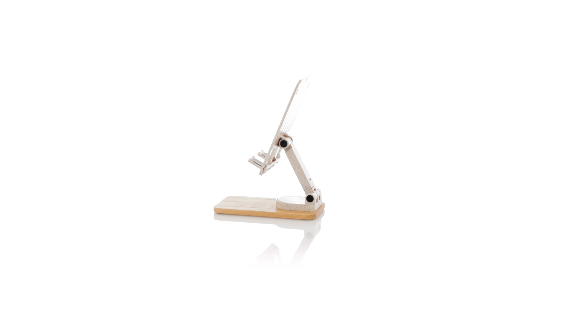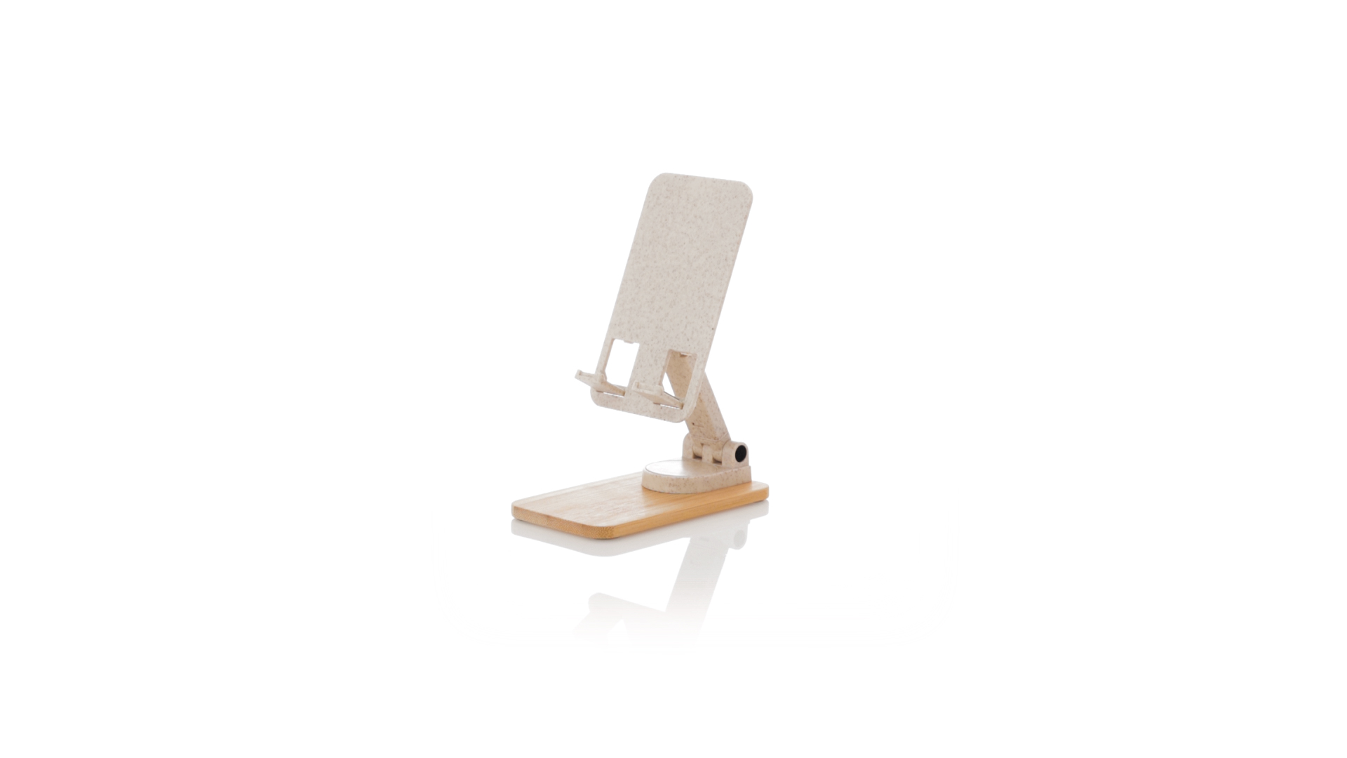 Faltbarer Halter für Smartphones und Tablets, aus Weizenstroh mit widerstandsfähigem Bambusgrund. Höhenverstellbar, mit rutschfesten Gummiauflagen an Fuss und Halterung. Grosse Branding-Oberfläche, besonders geeignet für Tampondruck auf dem Halter und Laserdruck auf der Basis.Materialien wie Bambus fördern die Verwendung natürlicher Rohstoffe und reduzieren die Schadstoffemissionen. Es stammt von einer sehr widerstandsfähigen und vielseitigen Pflanze mit schnellem Wachstum und Regeneration, was es zu einer ausgezeichneten Alternative zu traditionellem Holz macht.Weizenstroh fördert die Verwendung natürlicher Rohstoffe und reduziert so die Schadstoffemissionen.