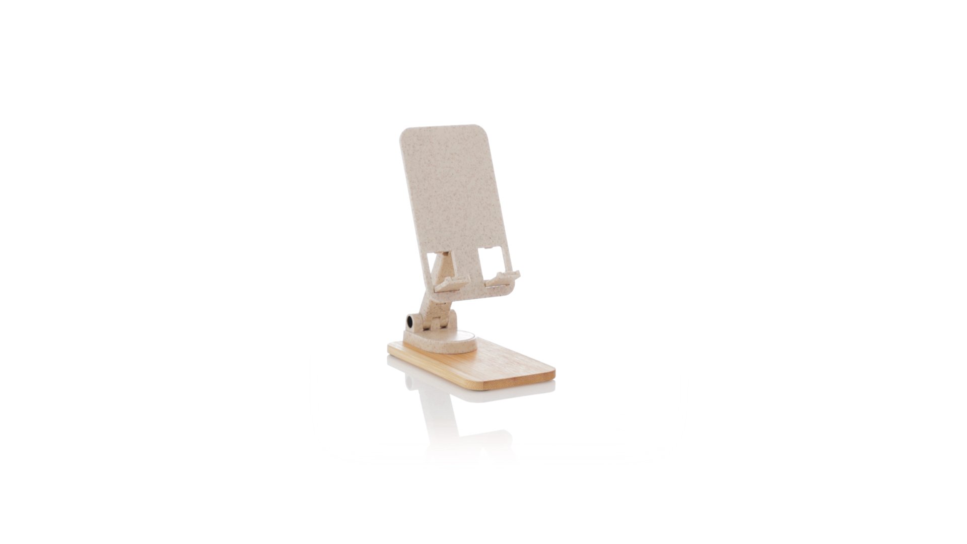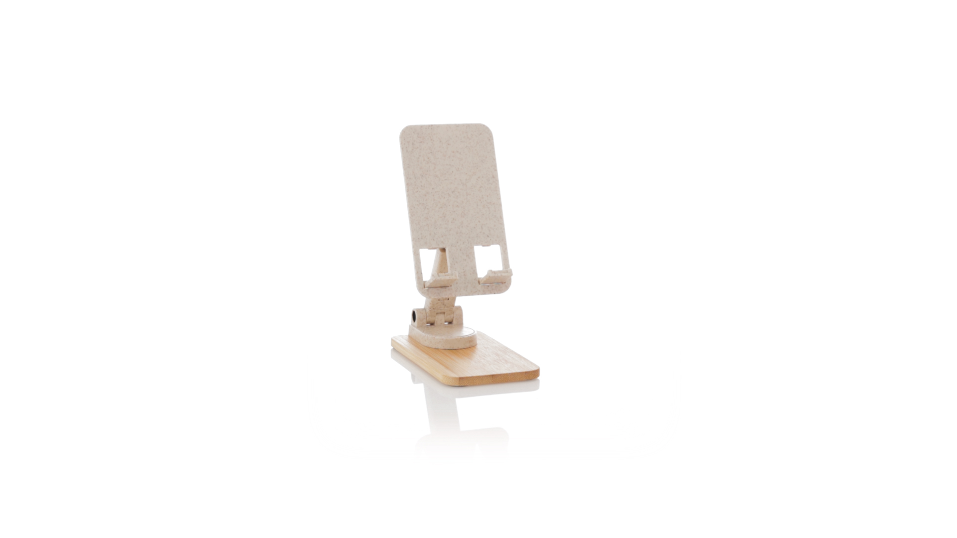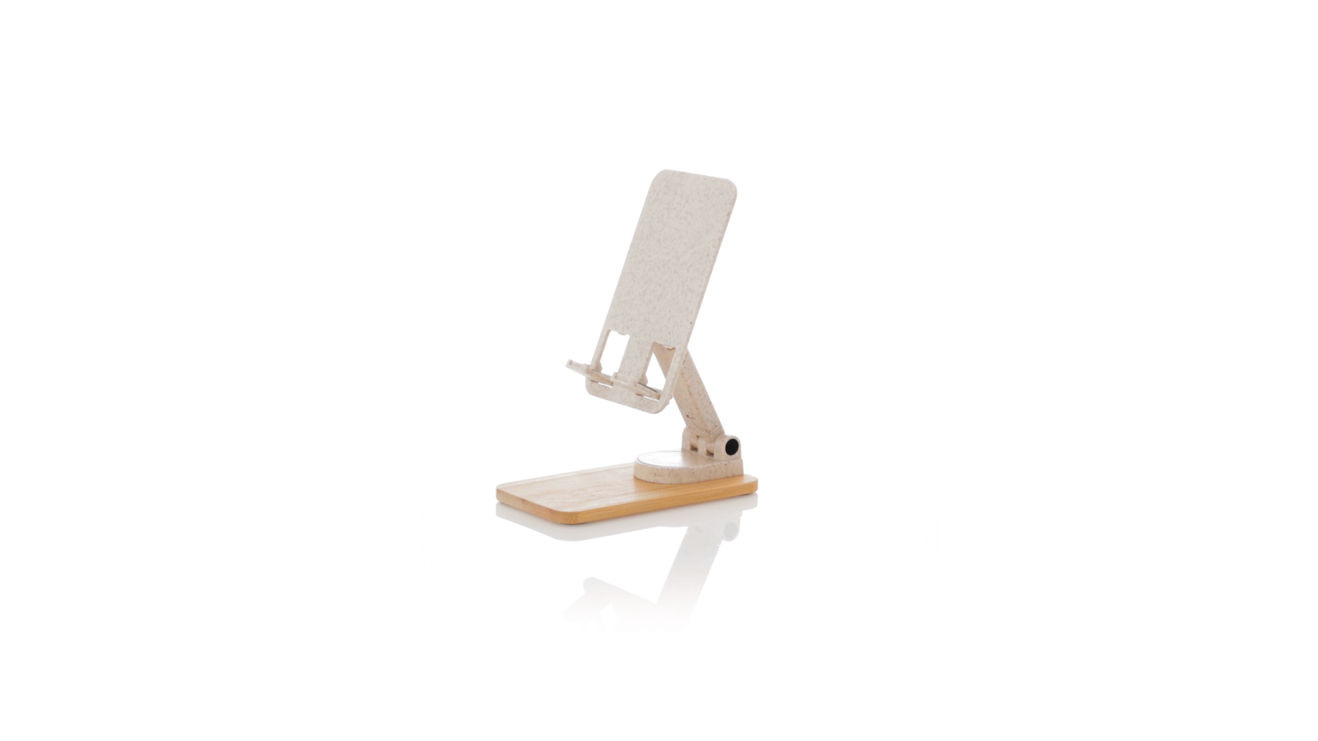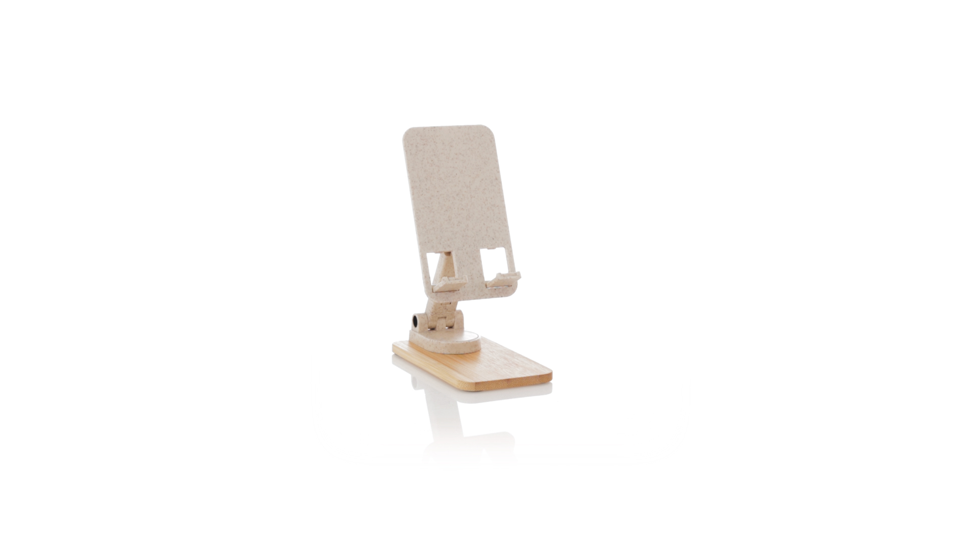 Faltbarer Halter für Smartphones und Tablets, aus Weizenstroh mit widerstandsfähigem Bambusgrund. Höhenverstellbar, mit rutschfesten Gummiauflagen an Fuss und Halterung. Grosse Branding-Oberfläche, besonders geeignet für Tampondruck auf dem Halter und Laserdruck auf der Basis.Materialien wie Bambus fördern die Verwendung natürlicher Rohstoffe und reduzieren die Schadstoffemissionen. Es stammt von einer sehr widerstandsfähigen und vielseitigen Pflanze mit schnellem Wachstum und Regeneration, was es zu einer ausgezeichneten Alternative zu traditionellem Holz macht.Weizenstroh fördert die Verwendung natürlicher Rohstoffe und reduziert so die Schadstoffemissionen.