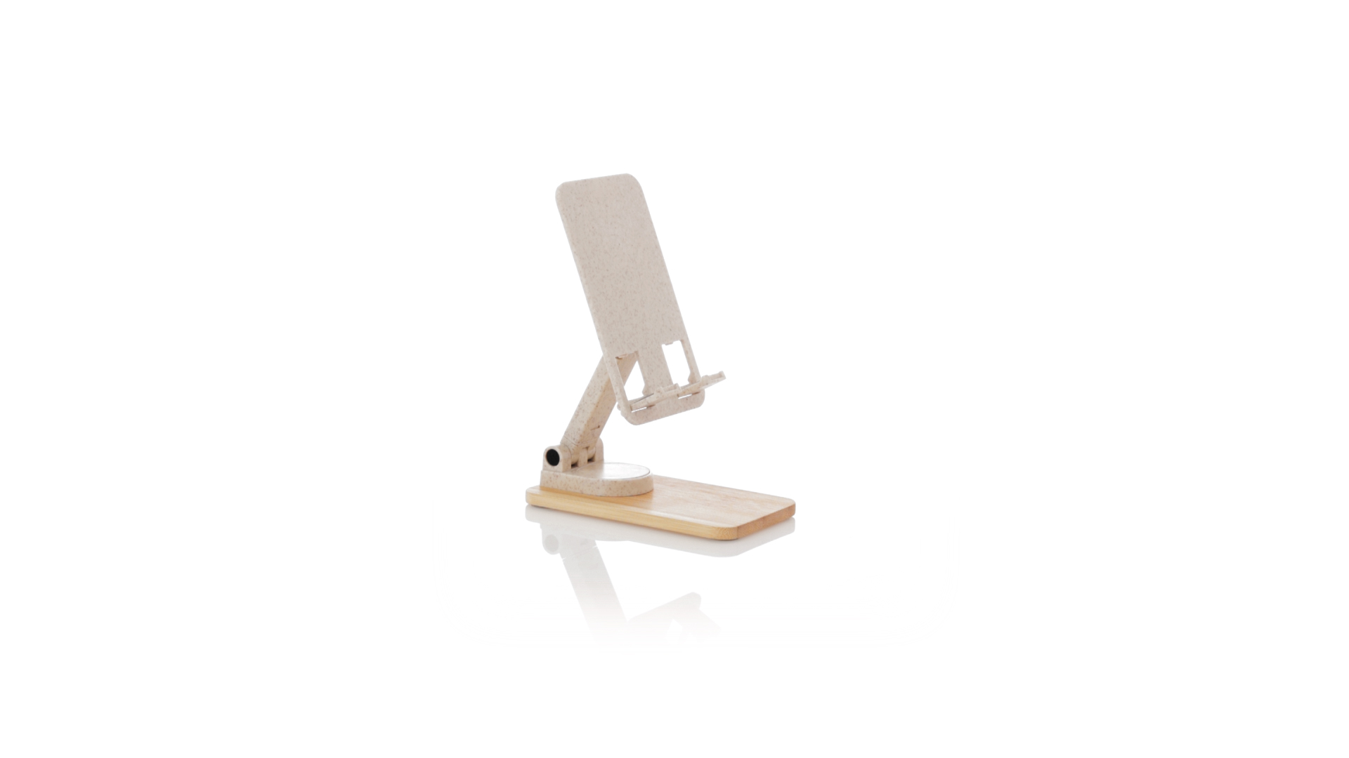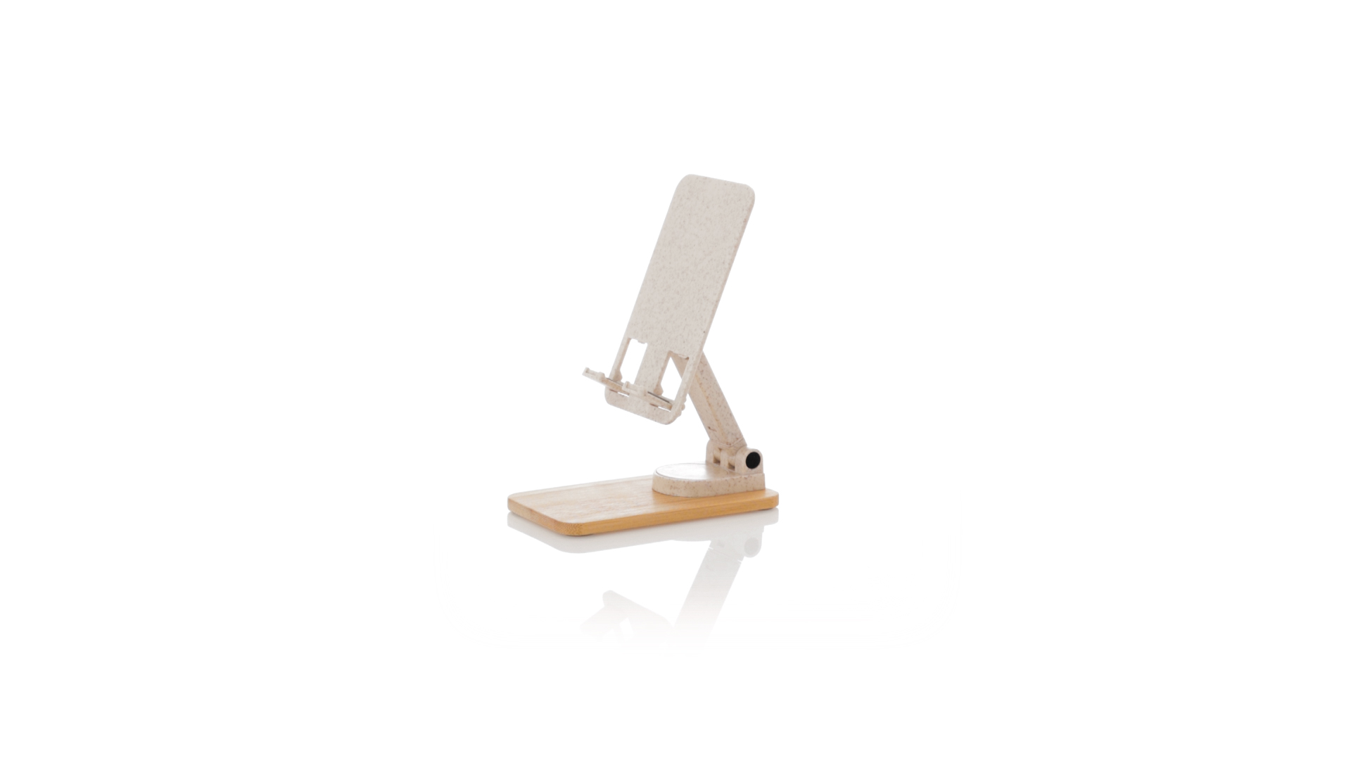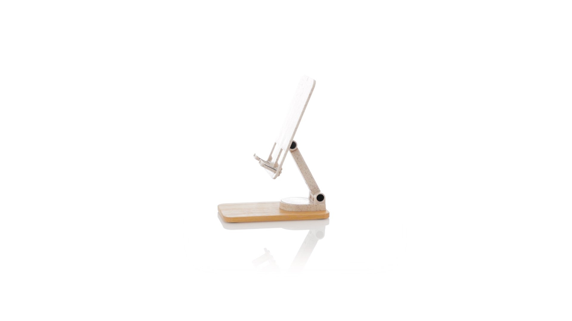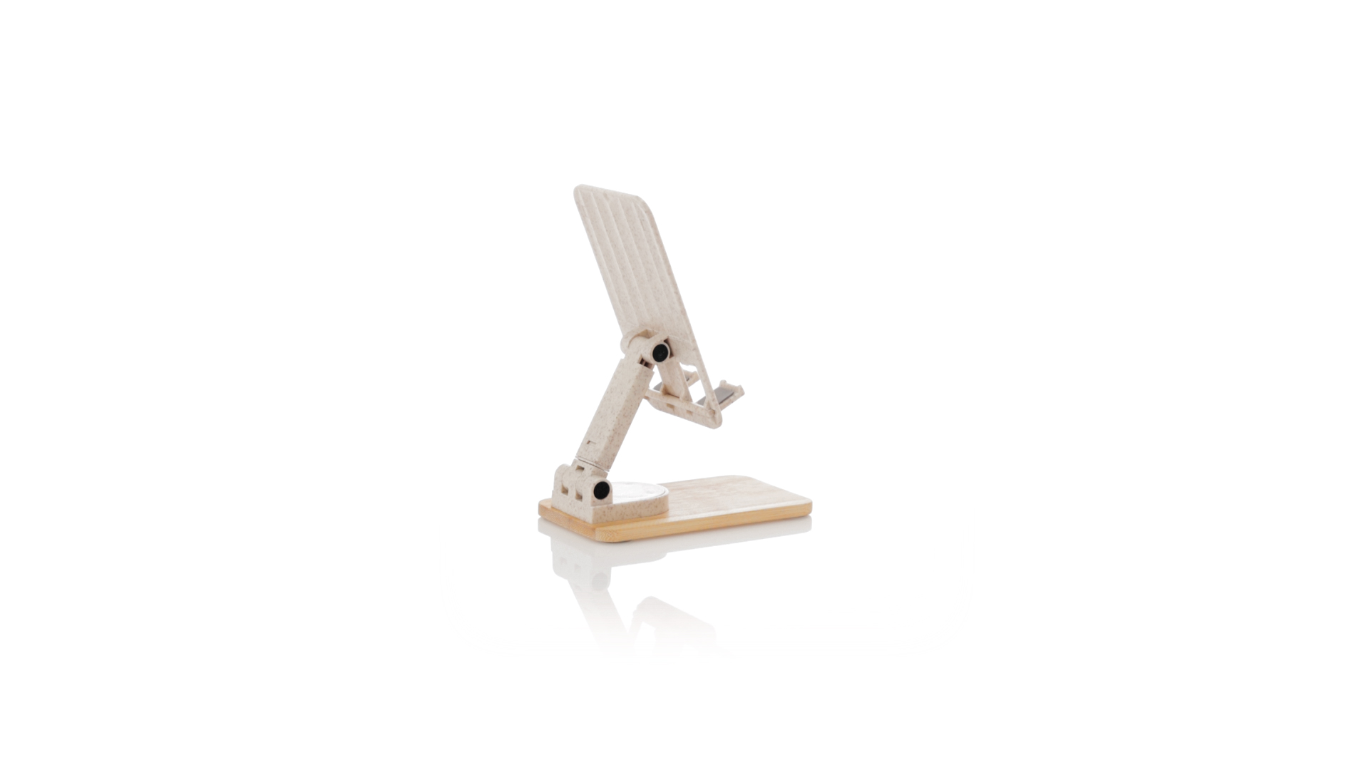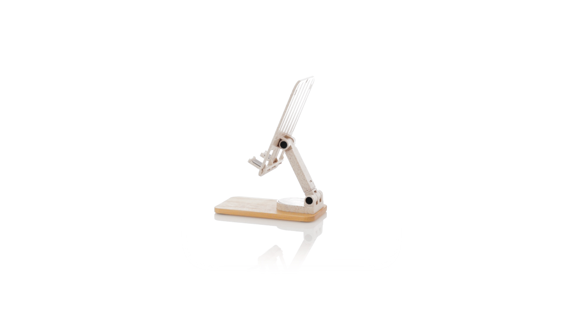 Faltbarer Halter für Smartphones und Tablets, aus Weizenstroh mit widerstandsfähigem Bambusgrund. Höhenverstellbar, mit rutschfesten Gummiauflagen an Fuss und Halterung. Grosse Branding-Oberfläche, besonders geeignet für Tampondruck auf dem Halter und Laserdruck auf der Basis.Materialien wie Bambus fördern die Verwendung natürlicher Rohstoffe und reduzieren die Schadstoffemissionen. Es stammt von einer sehr widerstandsfähigen und vielseitigen Pflanze mit schnellem Wachstum und Regeneration, was es zu einer ausgezeichneten Alternative zu traditionellem Holz macht.Weizenstroh fördert die Verwendung natürlicher Rohstoffe und reduziert so die Schadstoffemissionen.