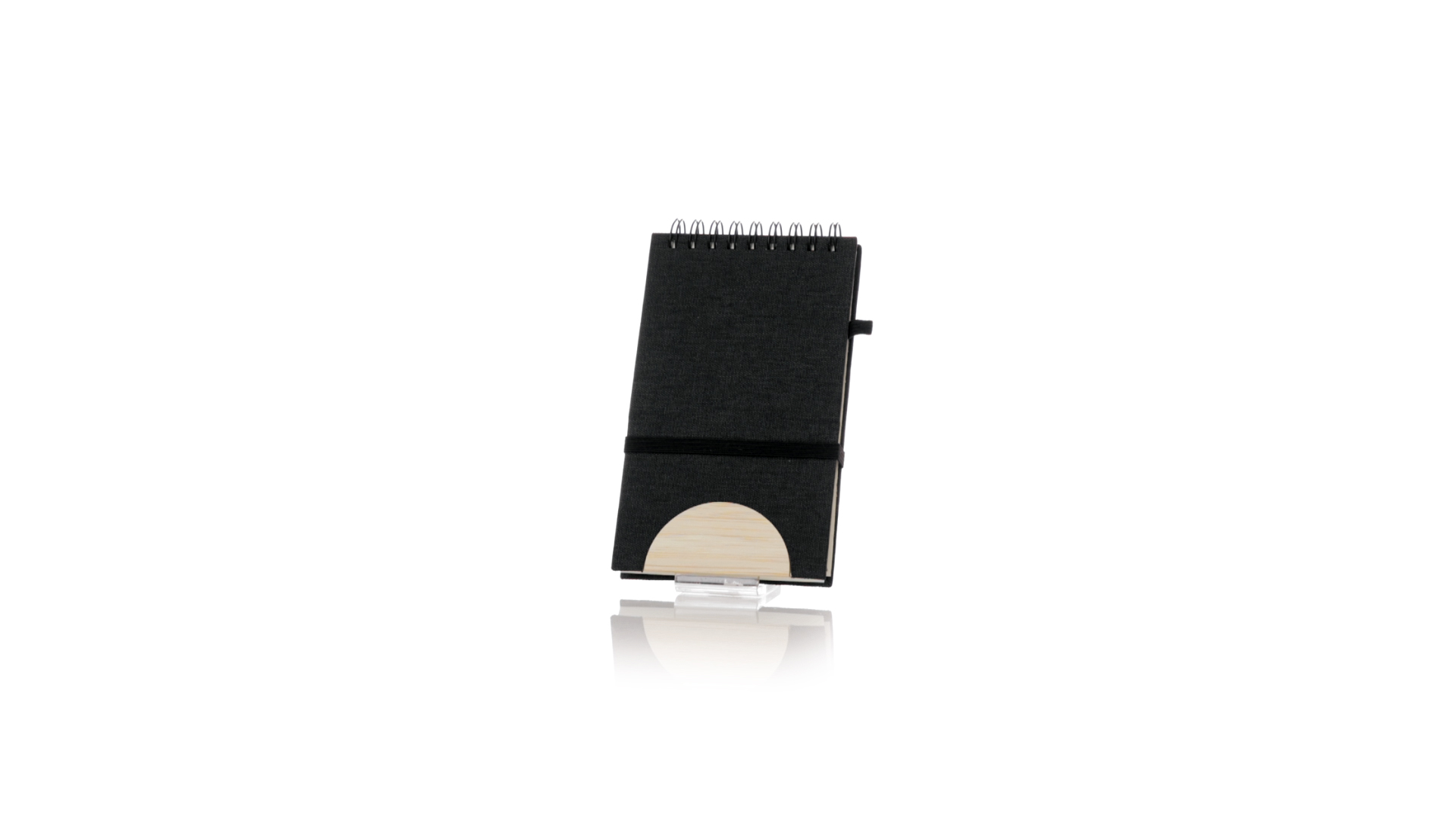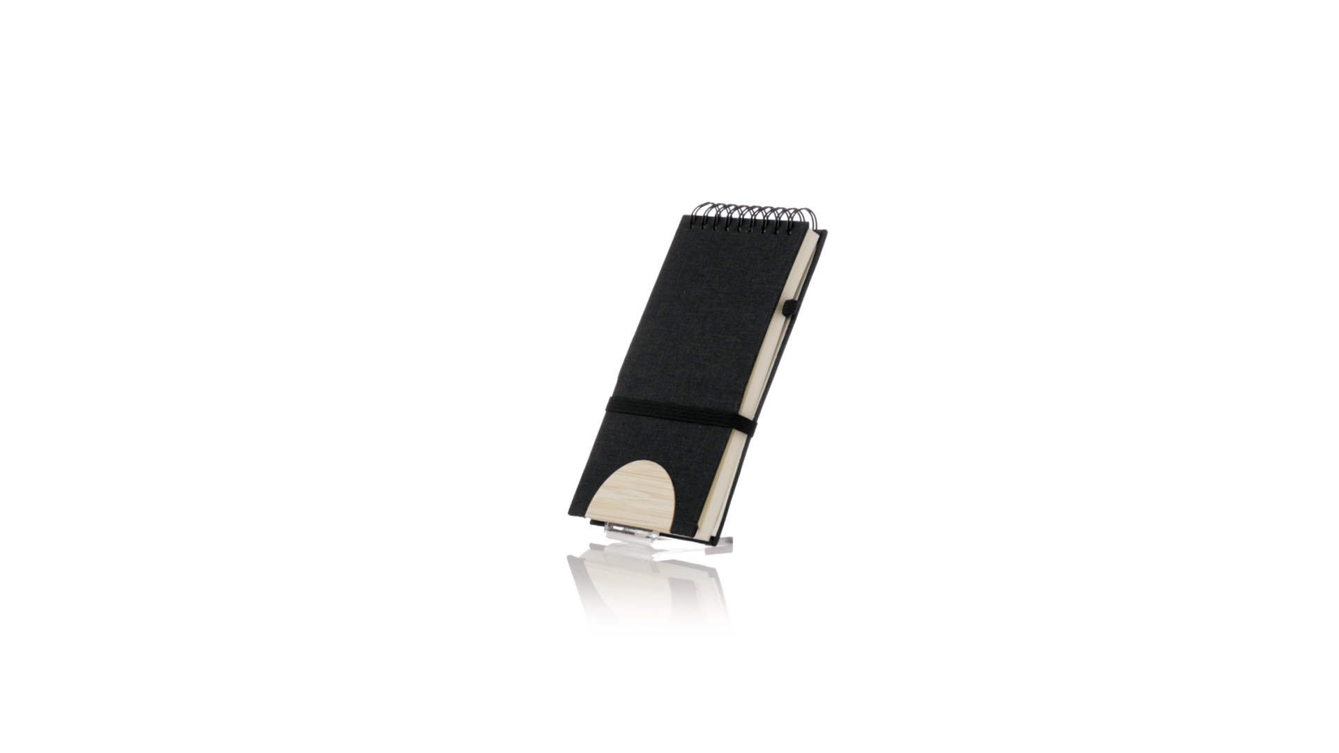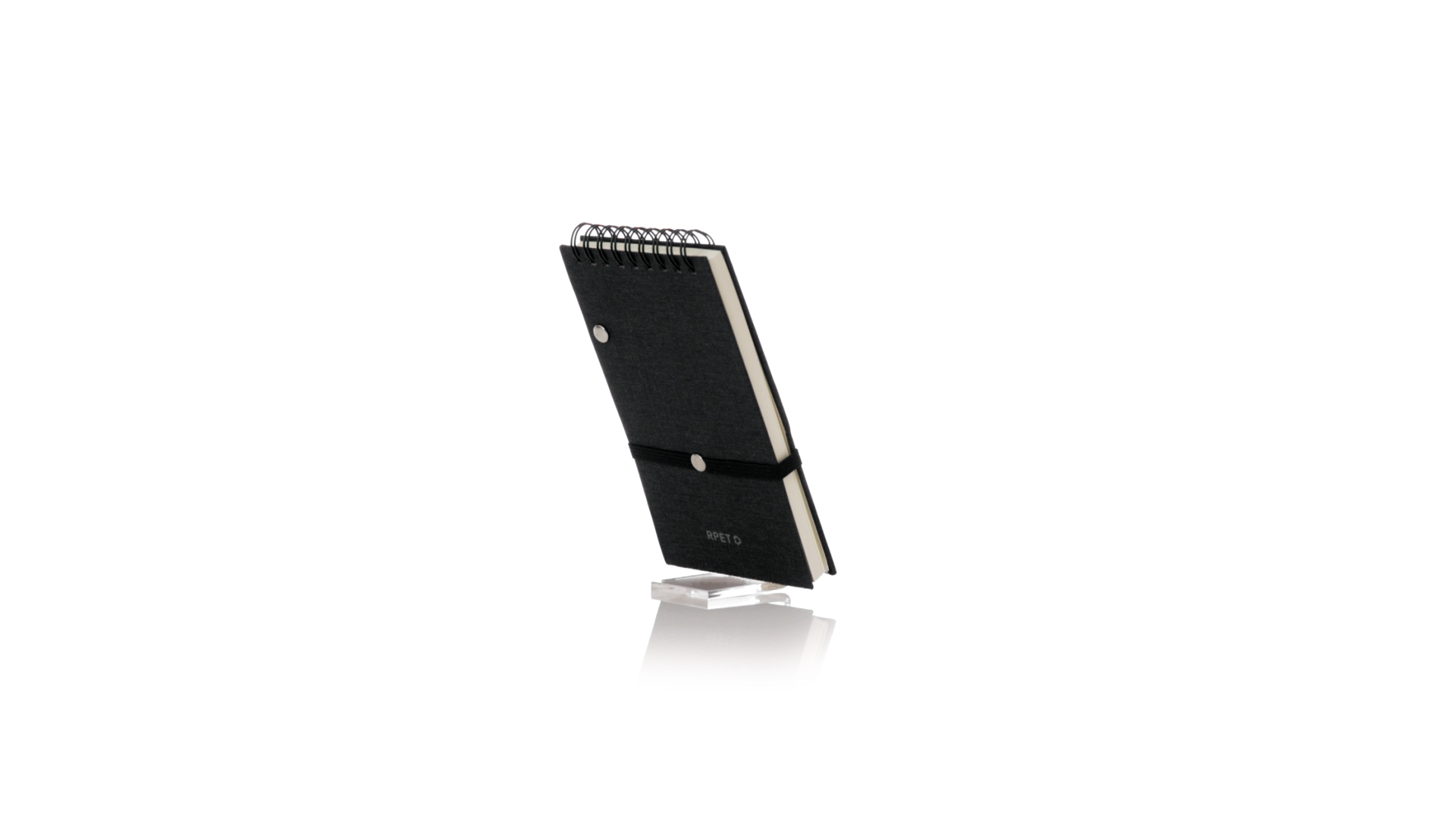 Ring-Notebook mit Halterung, hergestellt aus RPET 300D und Bambus. Sein harter Einband wird durch eine vielseitige integrierte Smartphone-Halterung aus Bambus ergänzt. Ausserdem hat es einen Gummibandverschluss und einen passenden Stifthalter. Enthält 80 unbedruckte Innenblätter und ist in einer breiten Farbpalette erhältlich. Mit RPET-Logo auf der Rückseite und in einer individuellen, recycelten Tasche.Das RPET-Material wird aus recyceltem Kunststoff hergestellt, wodurch die Wiederverwendung von Kunststoffabfällen gefördert und ein Beitrag zur Nachhaltigkeit unseres Planeten geleistet wird.
