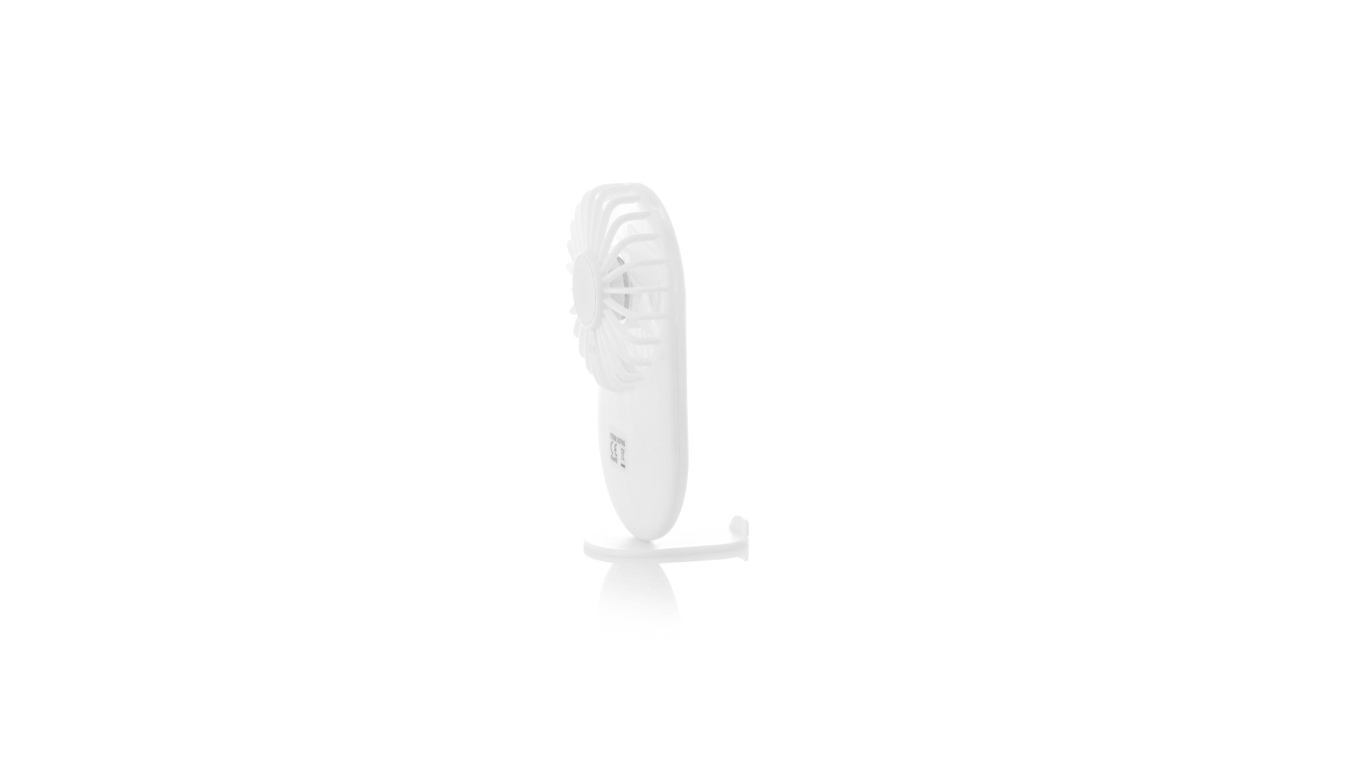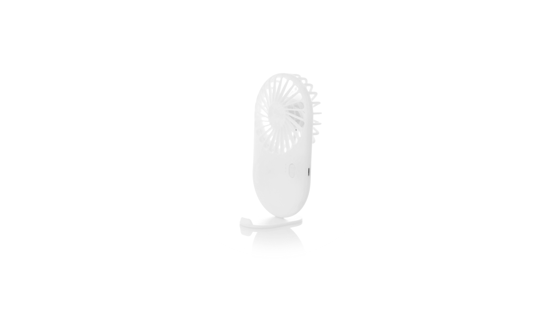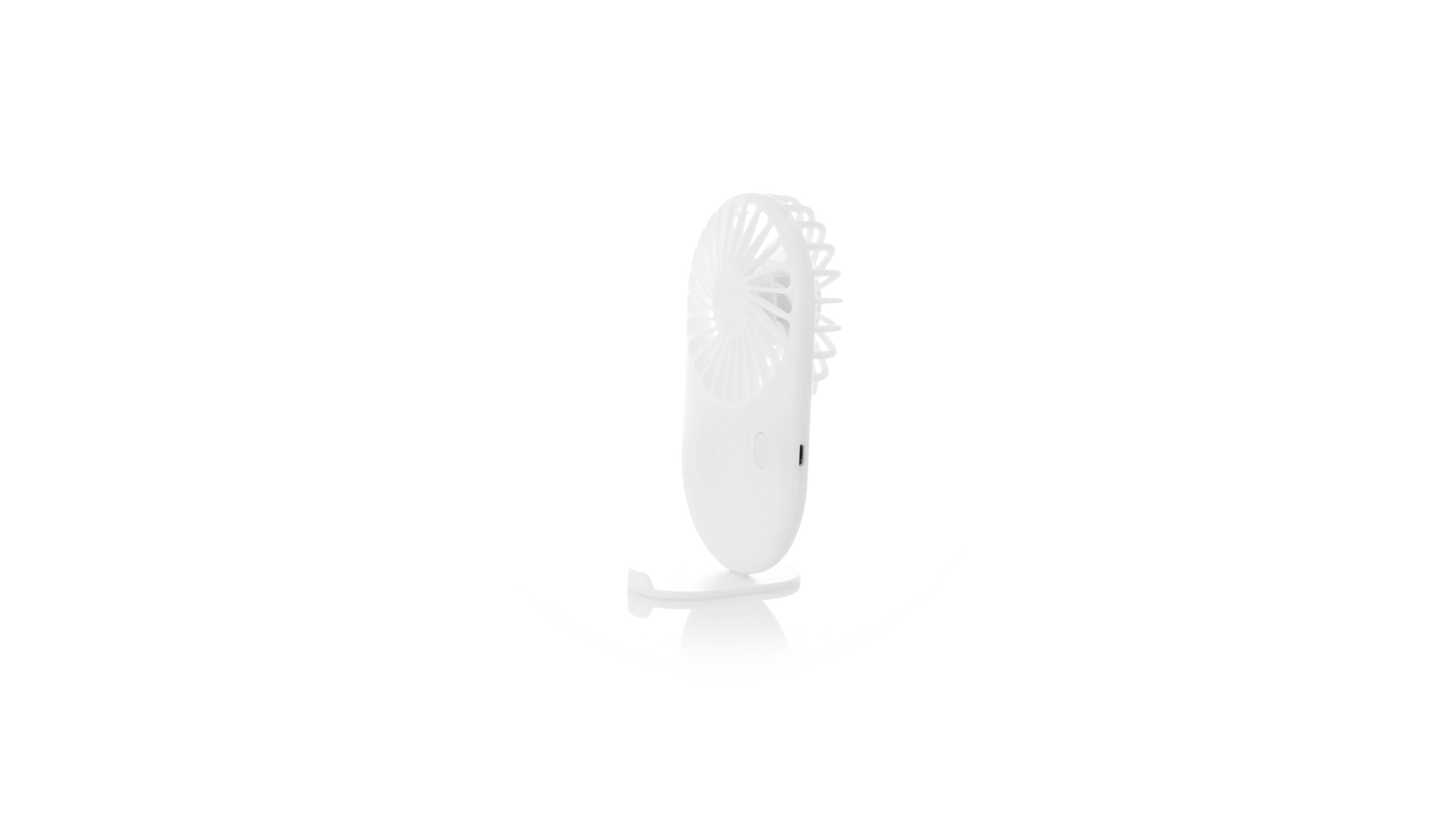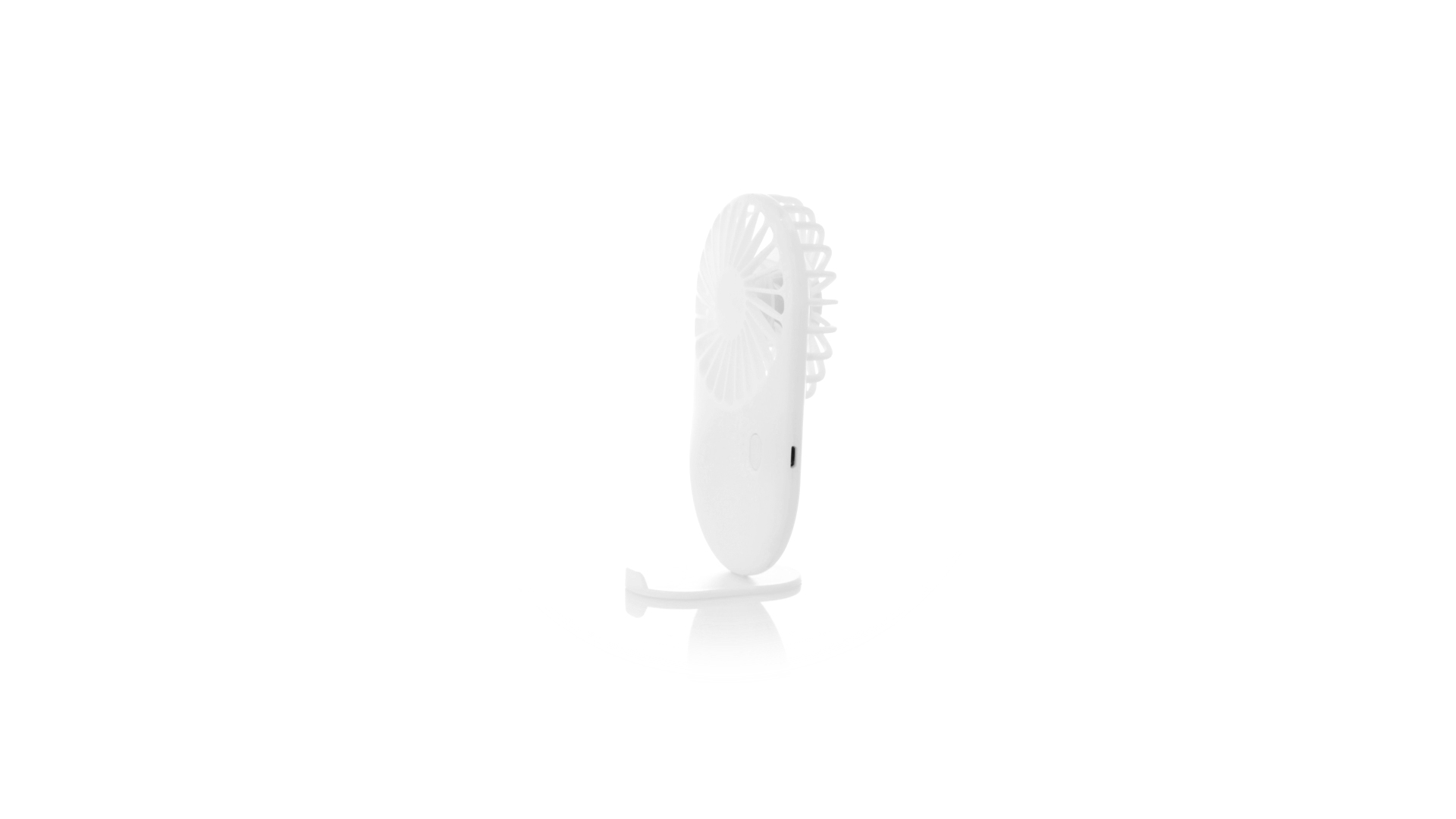 Tragbarer Ventilator aus robustem ABS. Mit drei Geschwindigkeiten und integrierter Smartphone-Halterung. Stromversorgung durch einen 300-mAh-Akku mit Ladezustandsanzeige und Micro-USB-Kabel im Lieferumfang enthalten. Einzeln verpackt in einer Kraft-Design-Box.