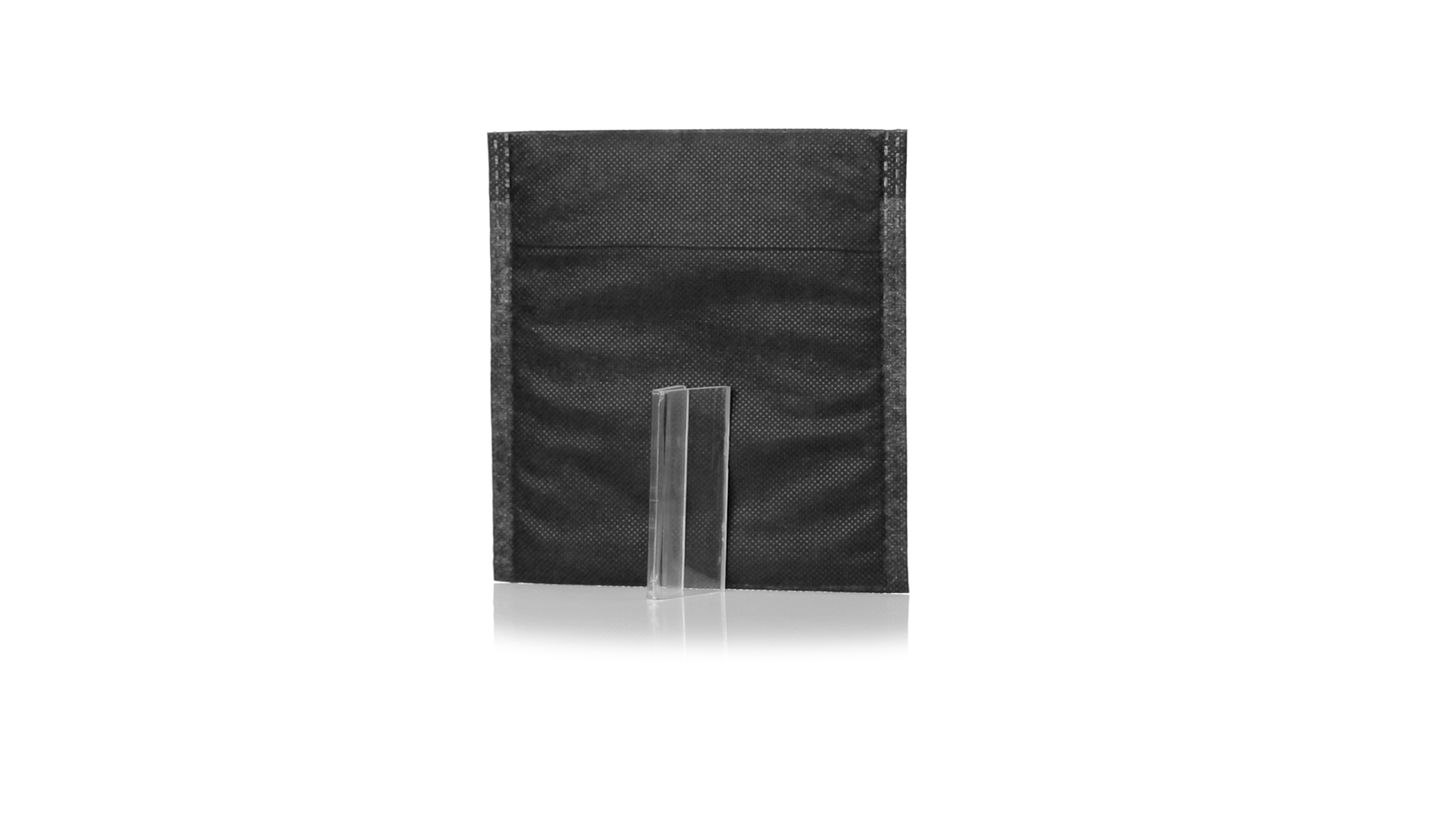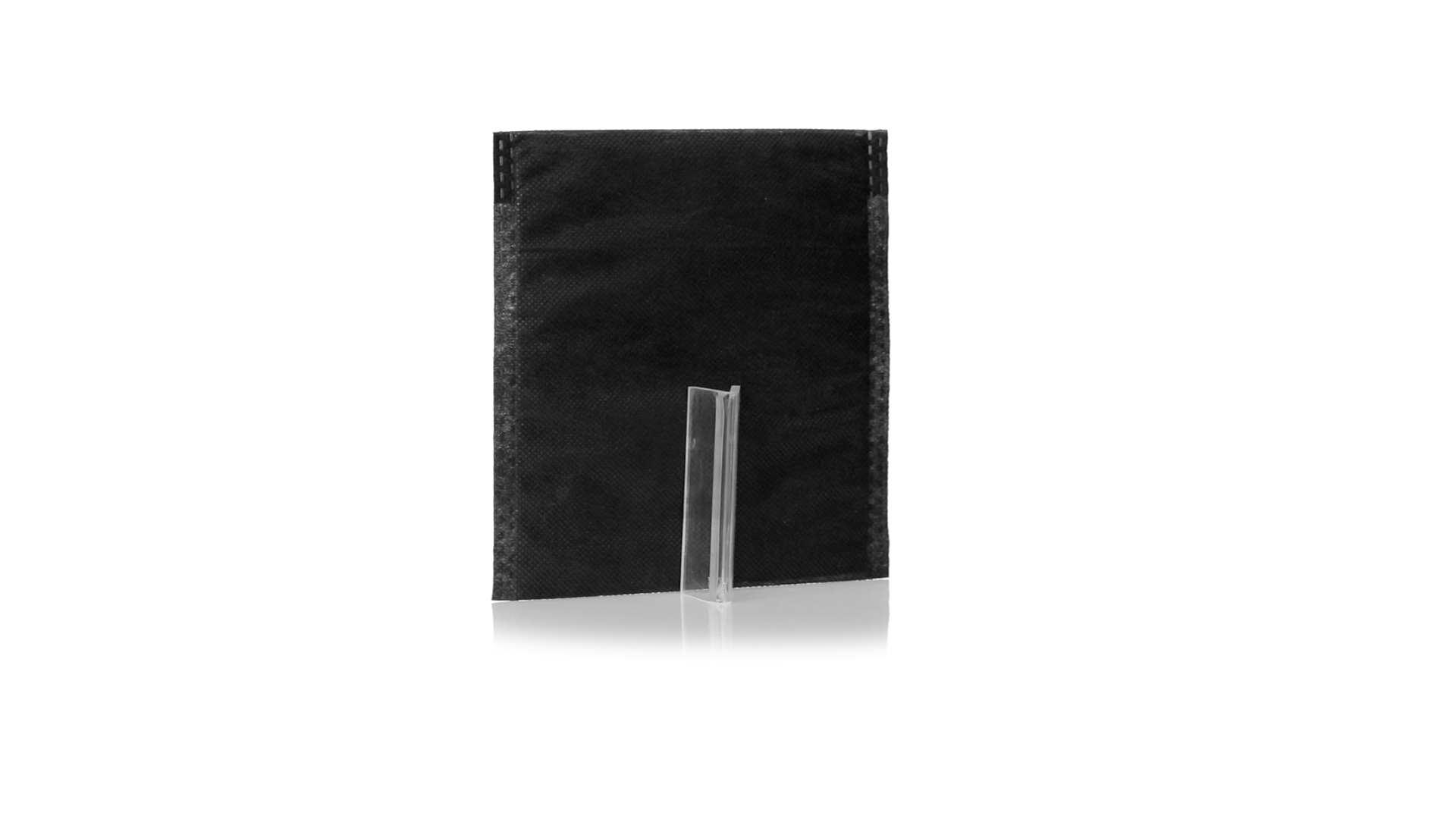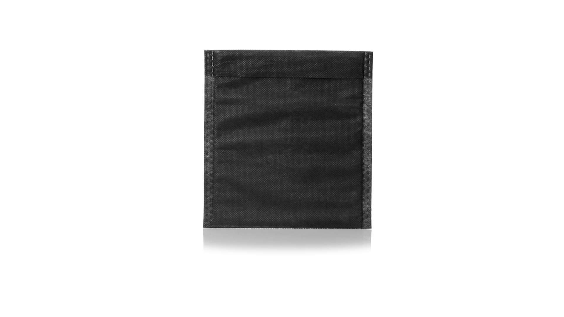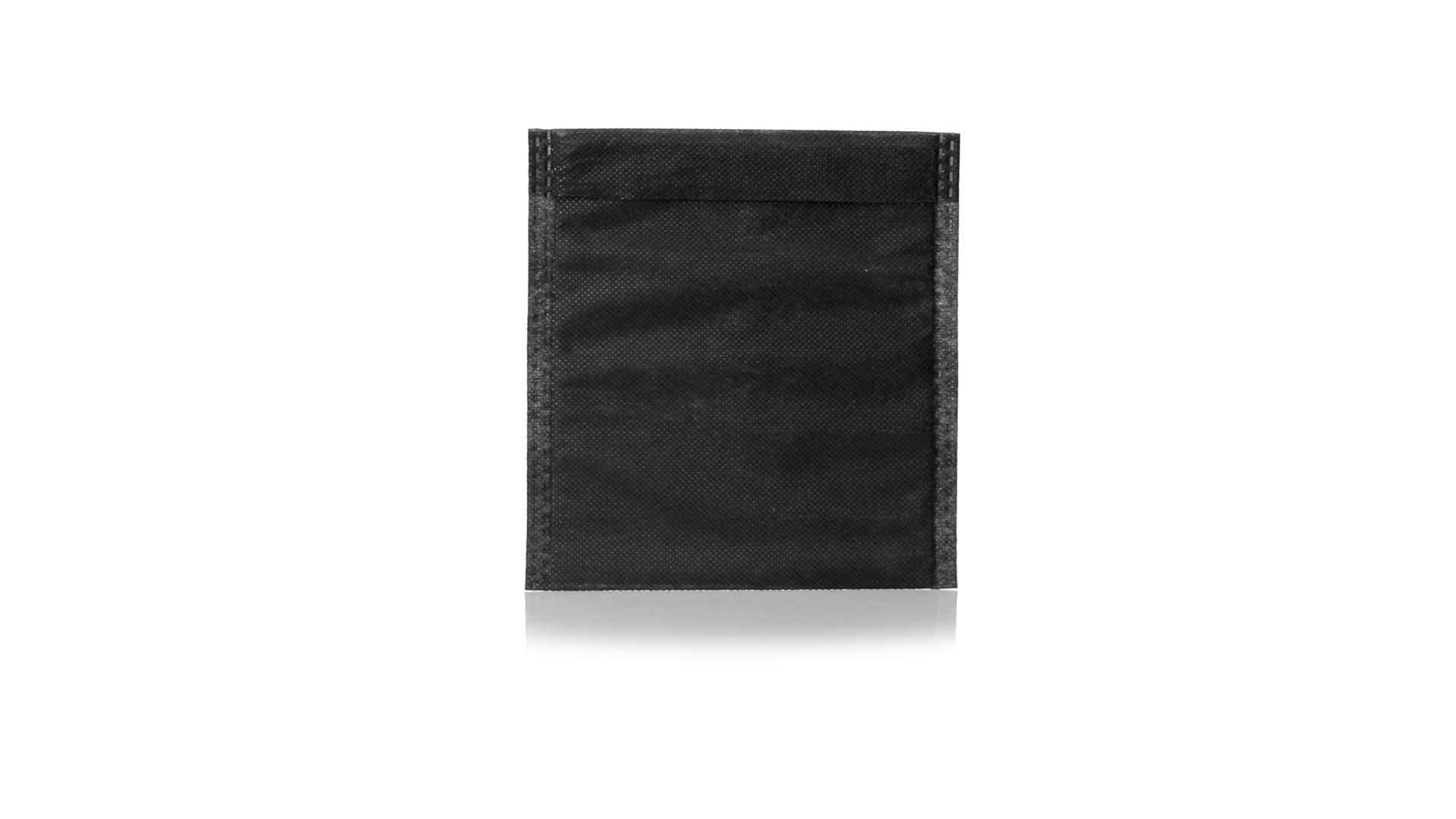 Vielseitiger Bezug aus schwarzem Vliesstoff mit verschweisster Oberfläche, atmungsaktiv und waschbar. Kompaktes Format und ideal zum Bedrucken.