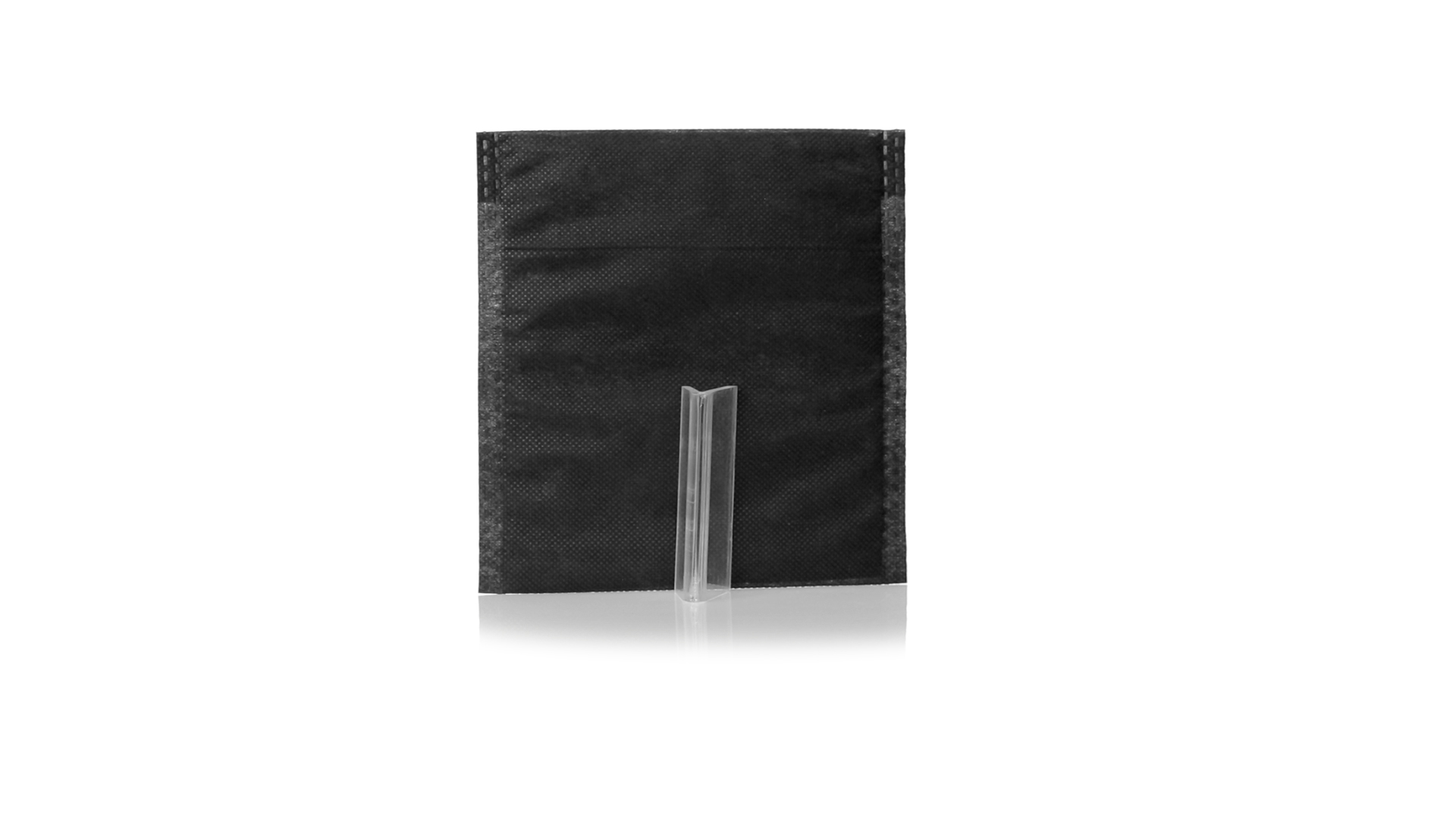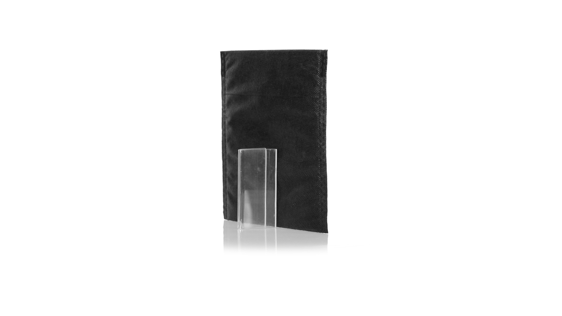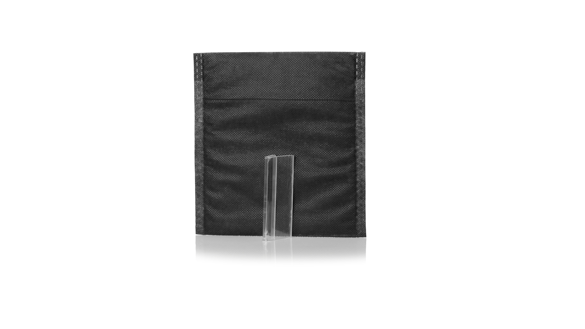 Vielseitiger Bezug aus schwarzem Vliesstoff mit verschweisster Oberfläche, atmungsaktiv und waschbar. Kompaktes Format und ideal zum Bedrucken.