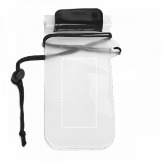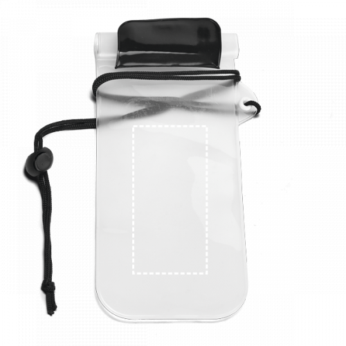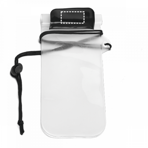 Handyhülle aus PVC mit einem verstellbarem Band mit Stopper, luftdichtem Verschluss und einer Lasche mit Klettverschluss. Die Vorderseite ist transparent und die Rückseite mattweiss. Diese Hülle ist wasserdicht und ermöglicht die Nutzung des Smartphones. 95 x 240 mm