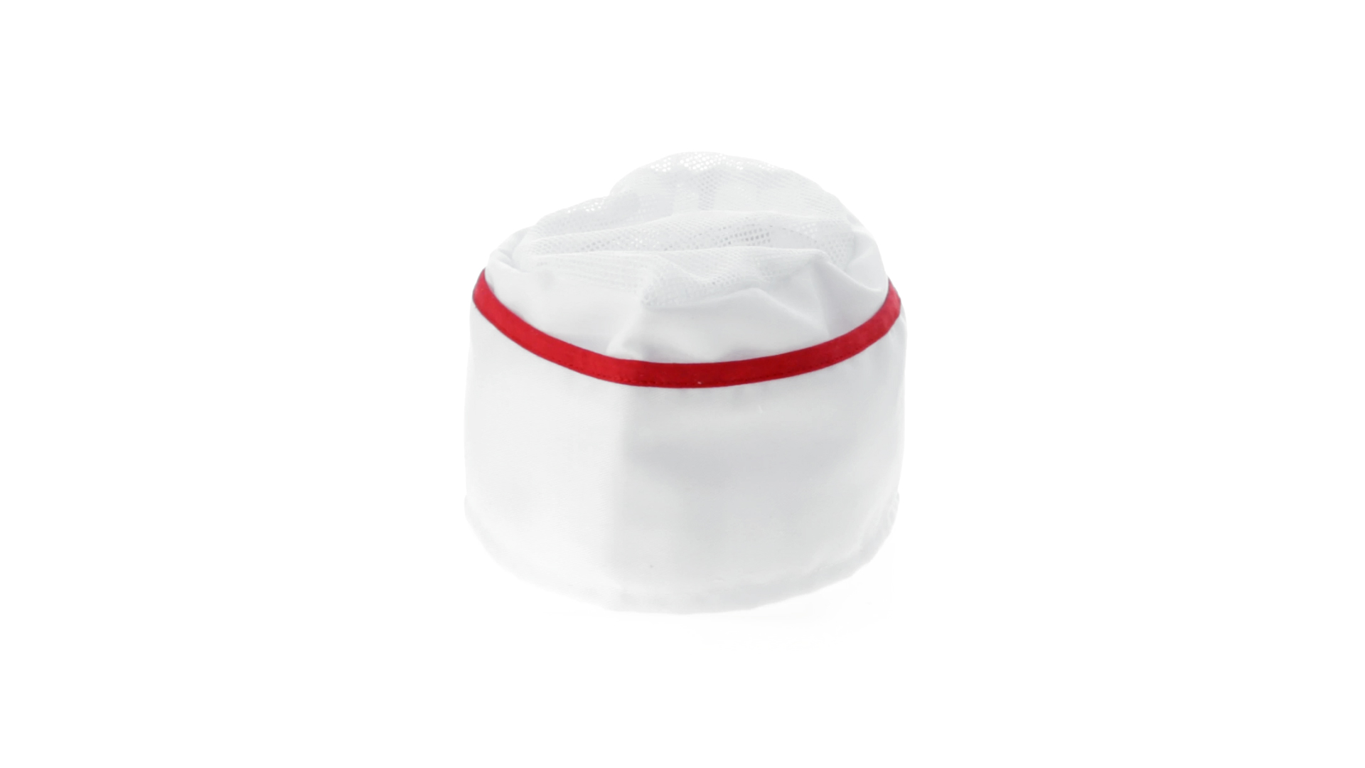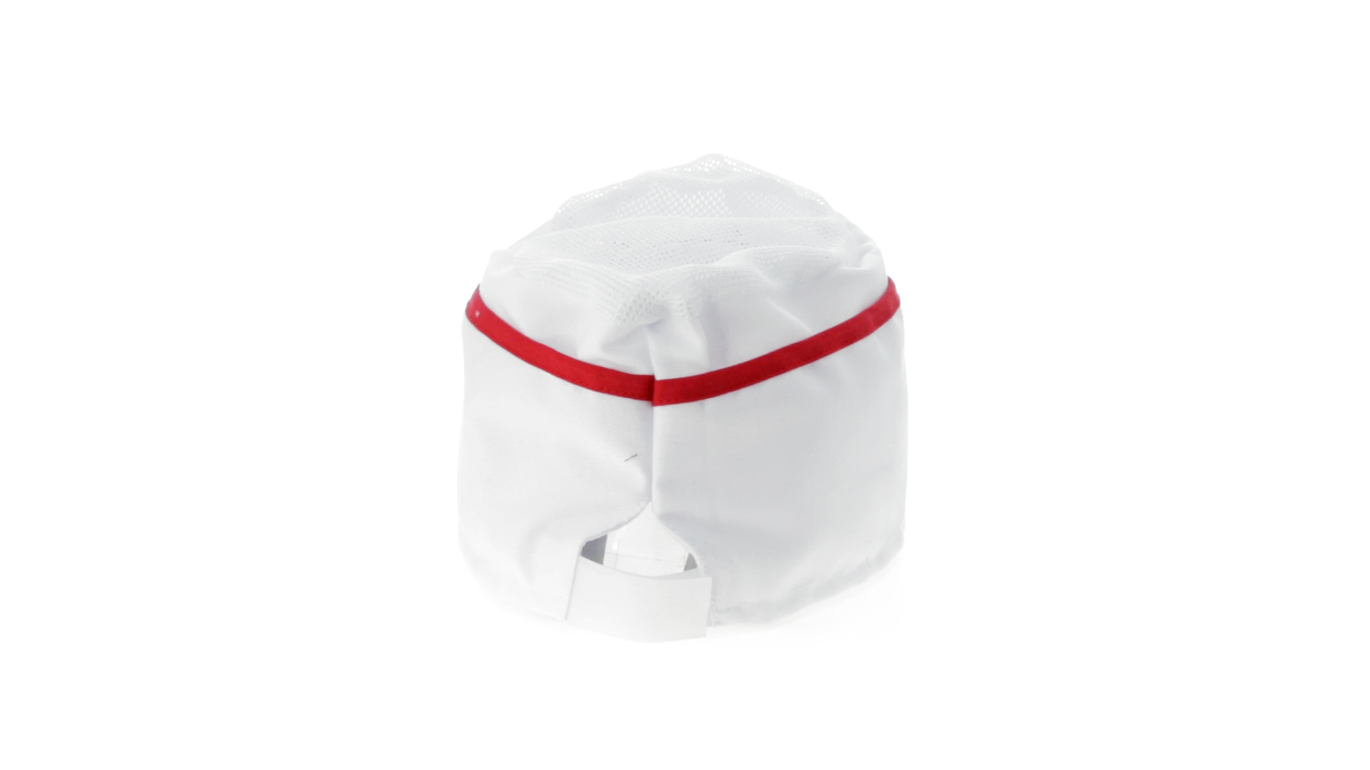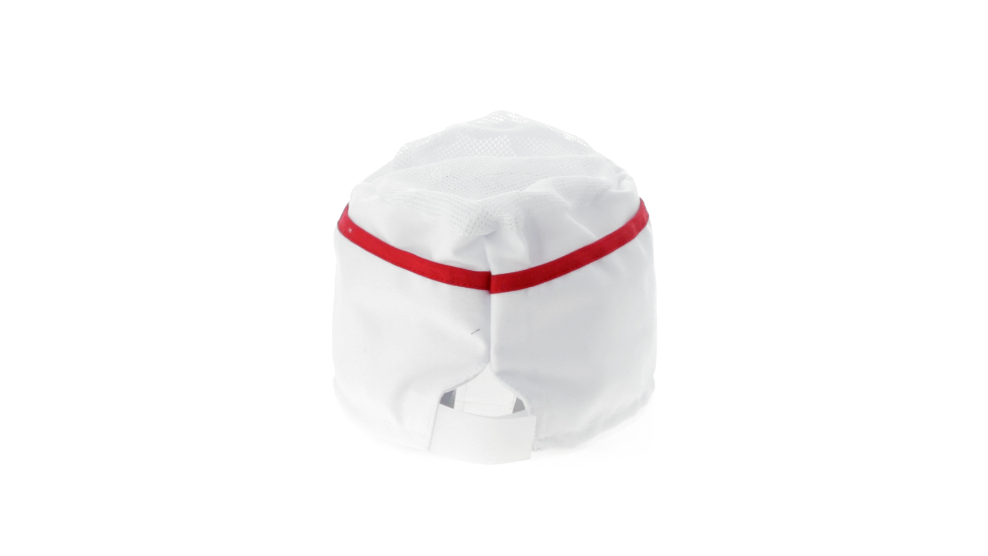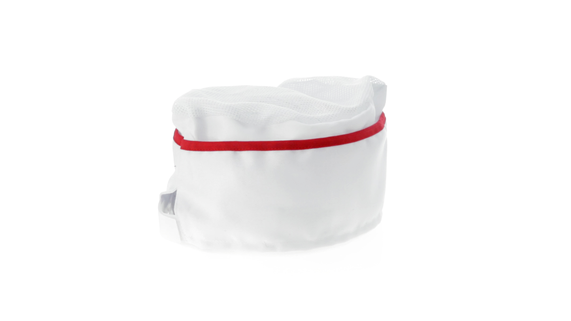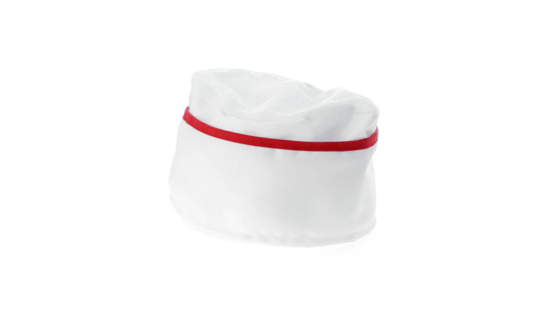 Kochmütze aus angenehmem TC-Material - einer Baumwoll/Polyester-Kombination - in einer fröhlichen Farbkombination: Weiss mit Kontrastdetails in lebendigen Farben.