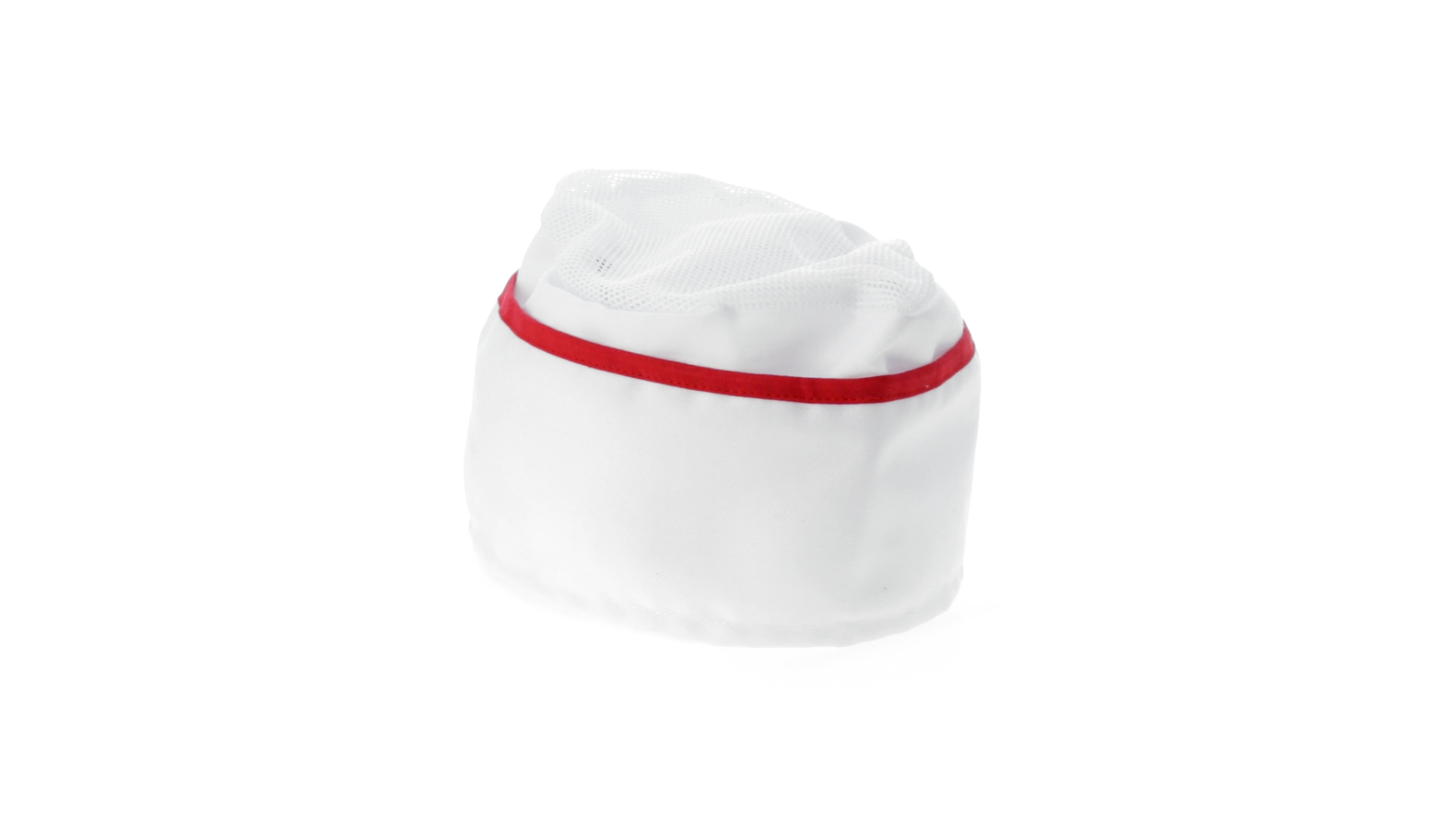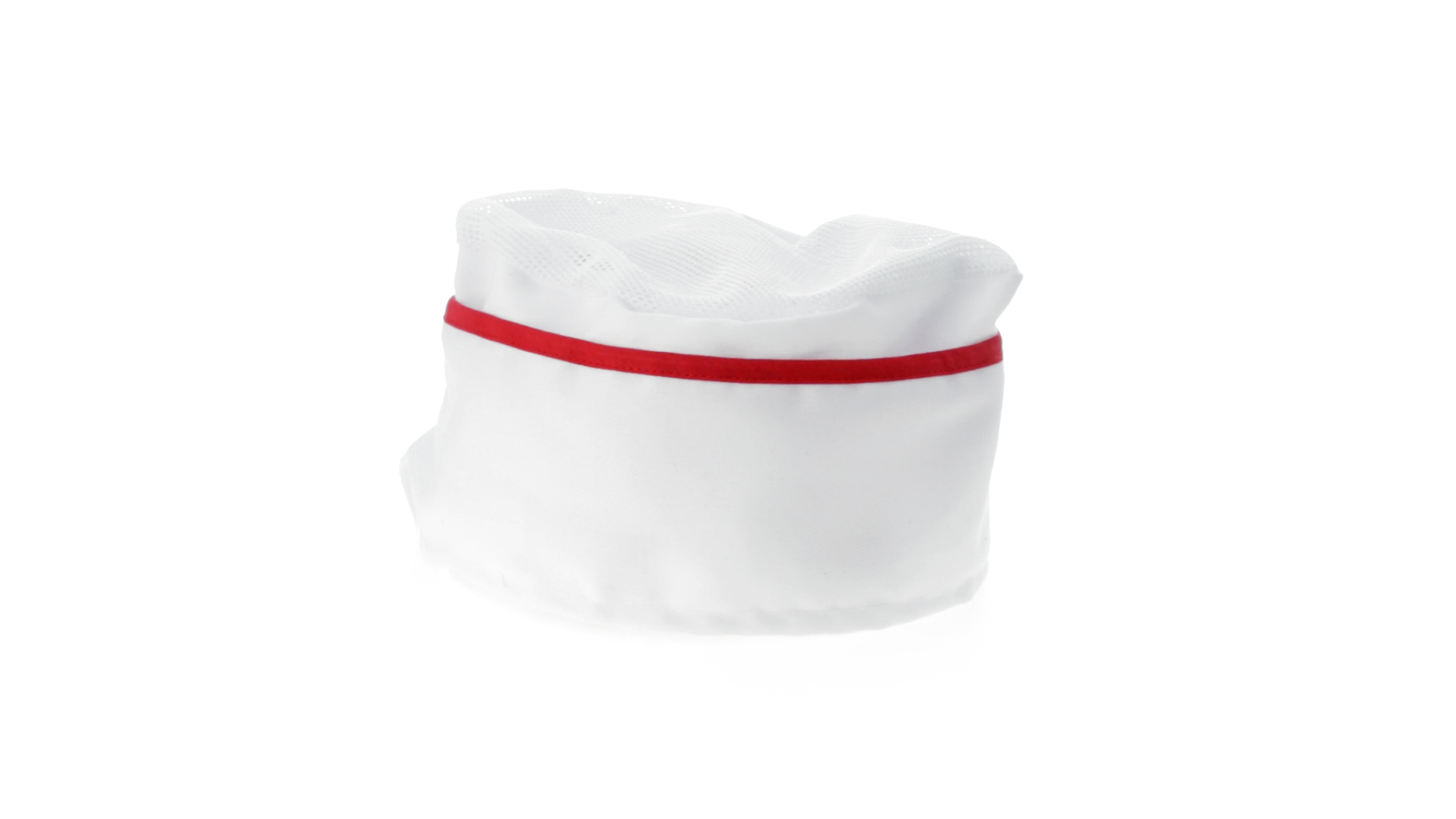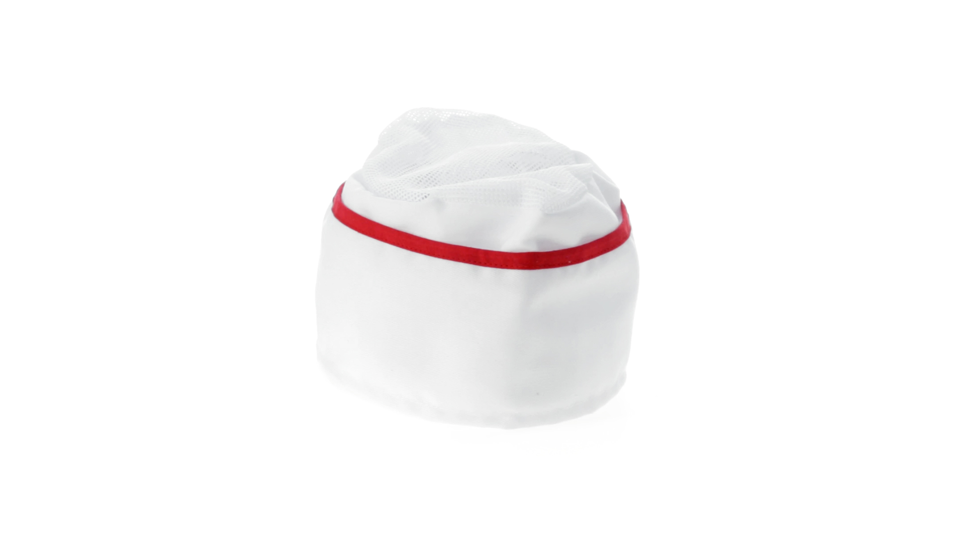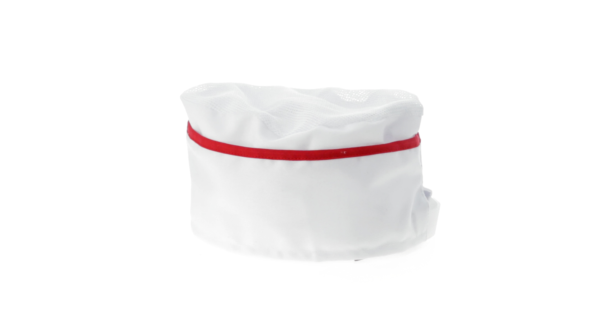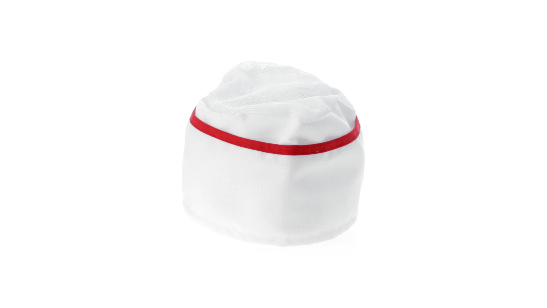 Kochmütze aus angenehmem TC-Material - einer Baumwoll/Polyester-Kombination - in einer fröhlichen Farbkombination: Weiss mit Kontrastdetails in lebendigen Farben.
