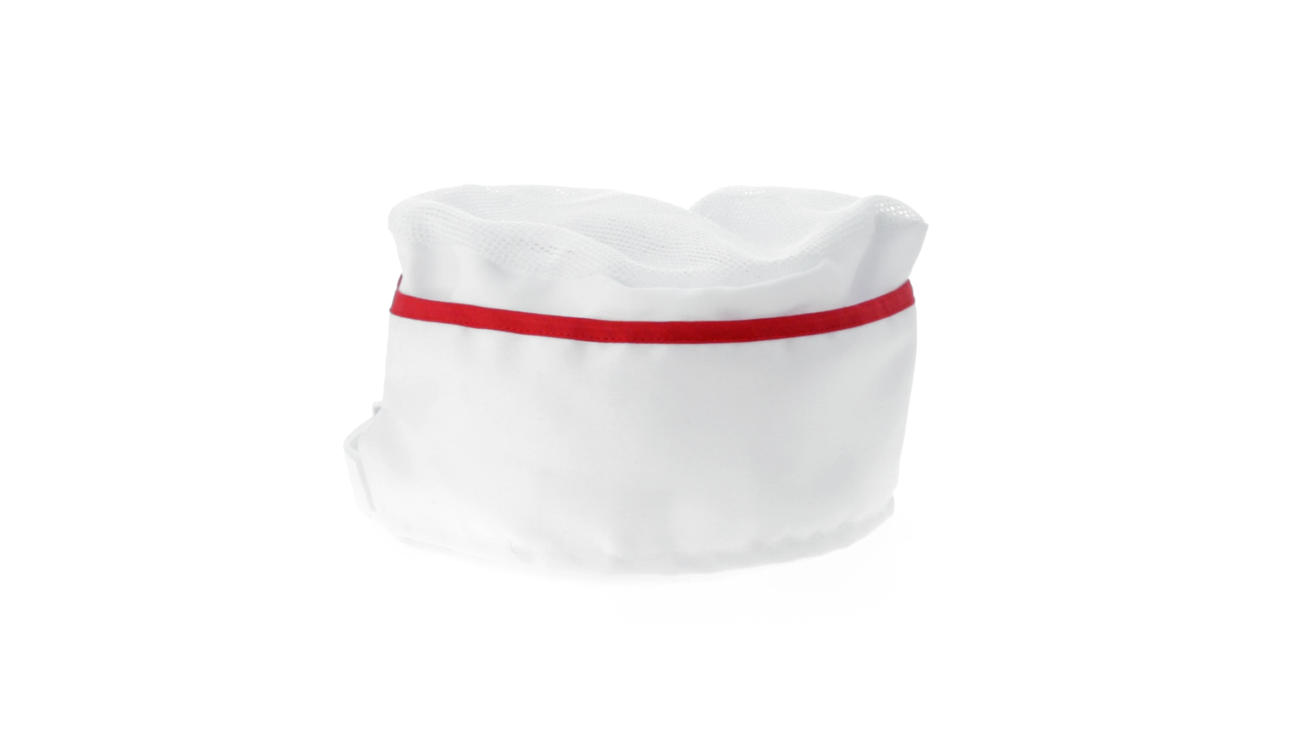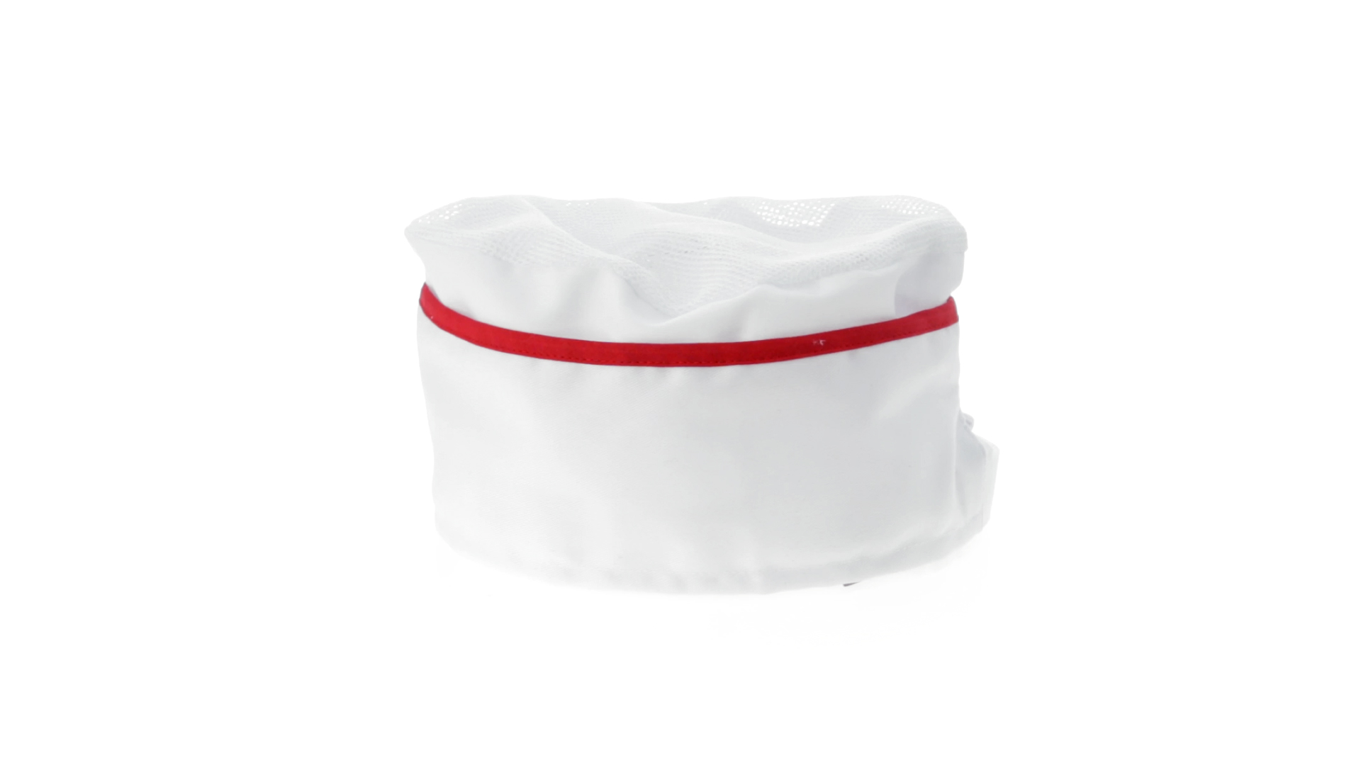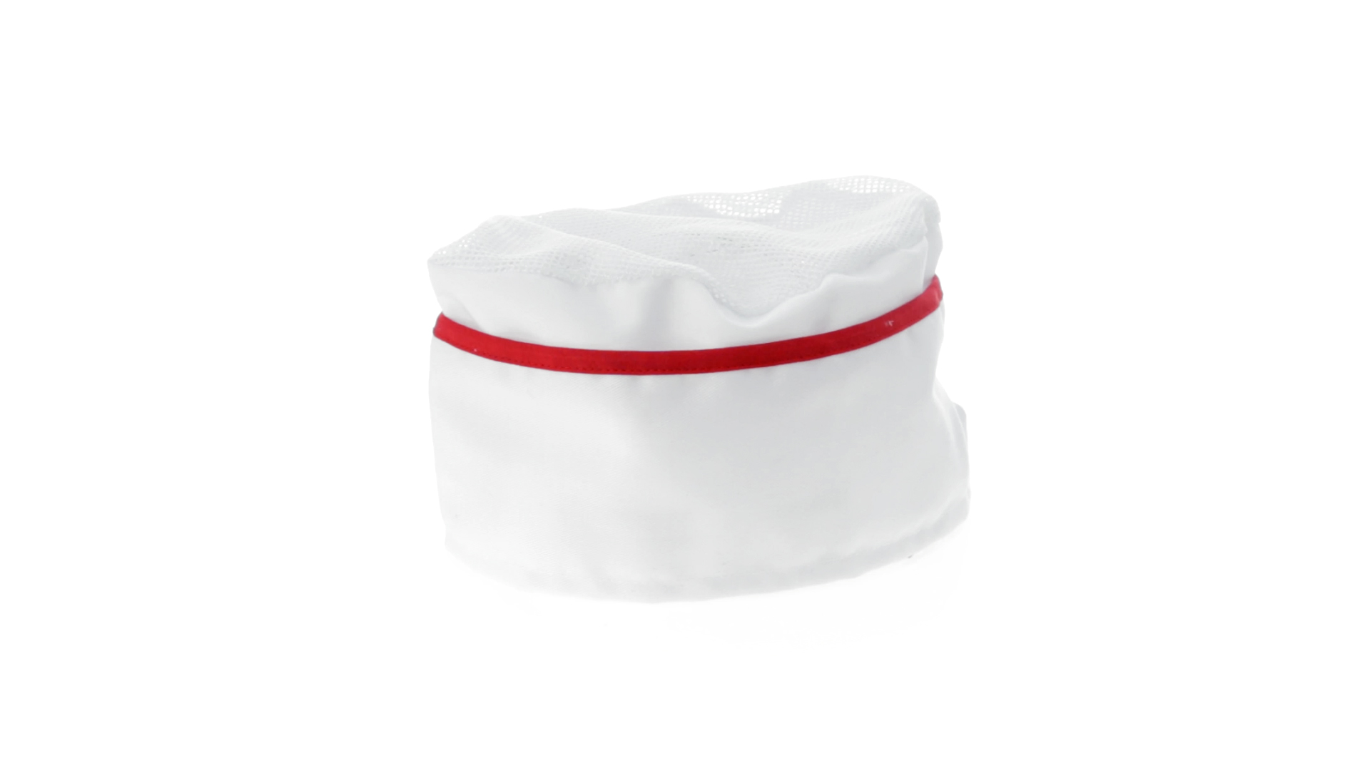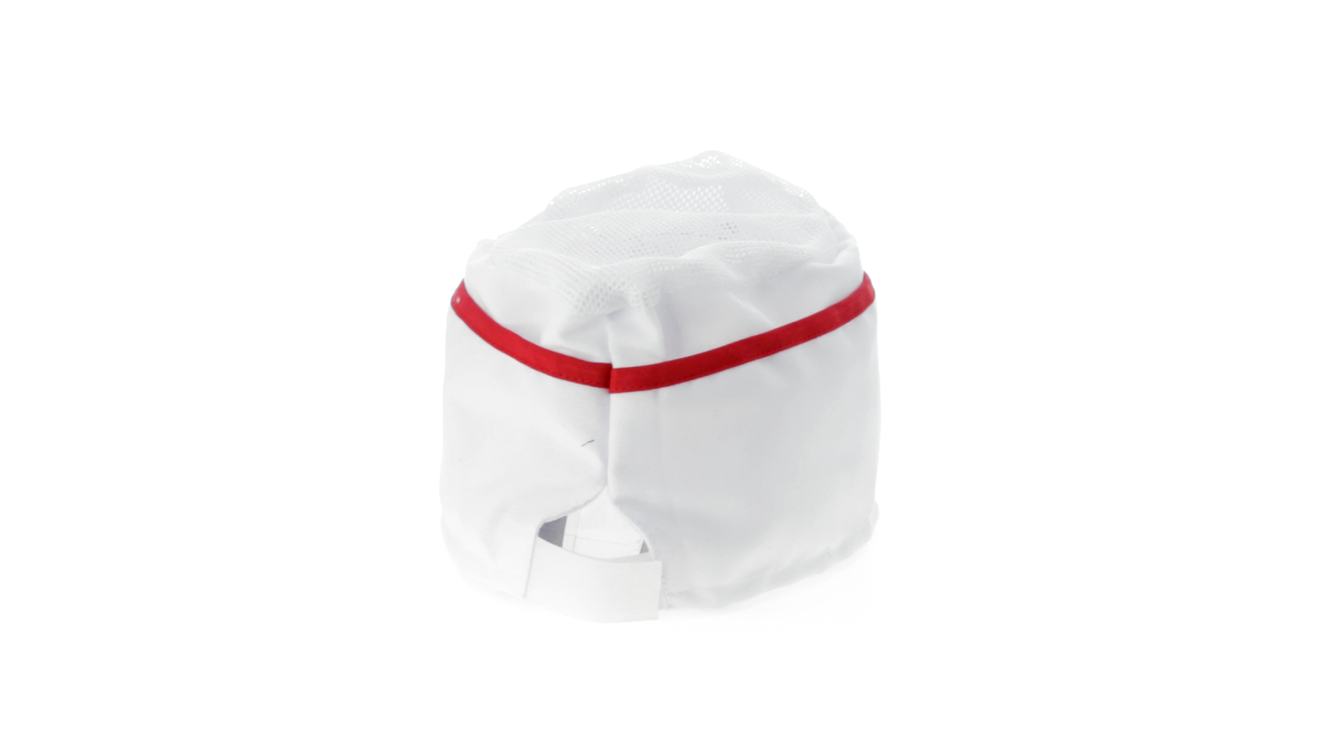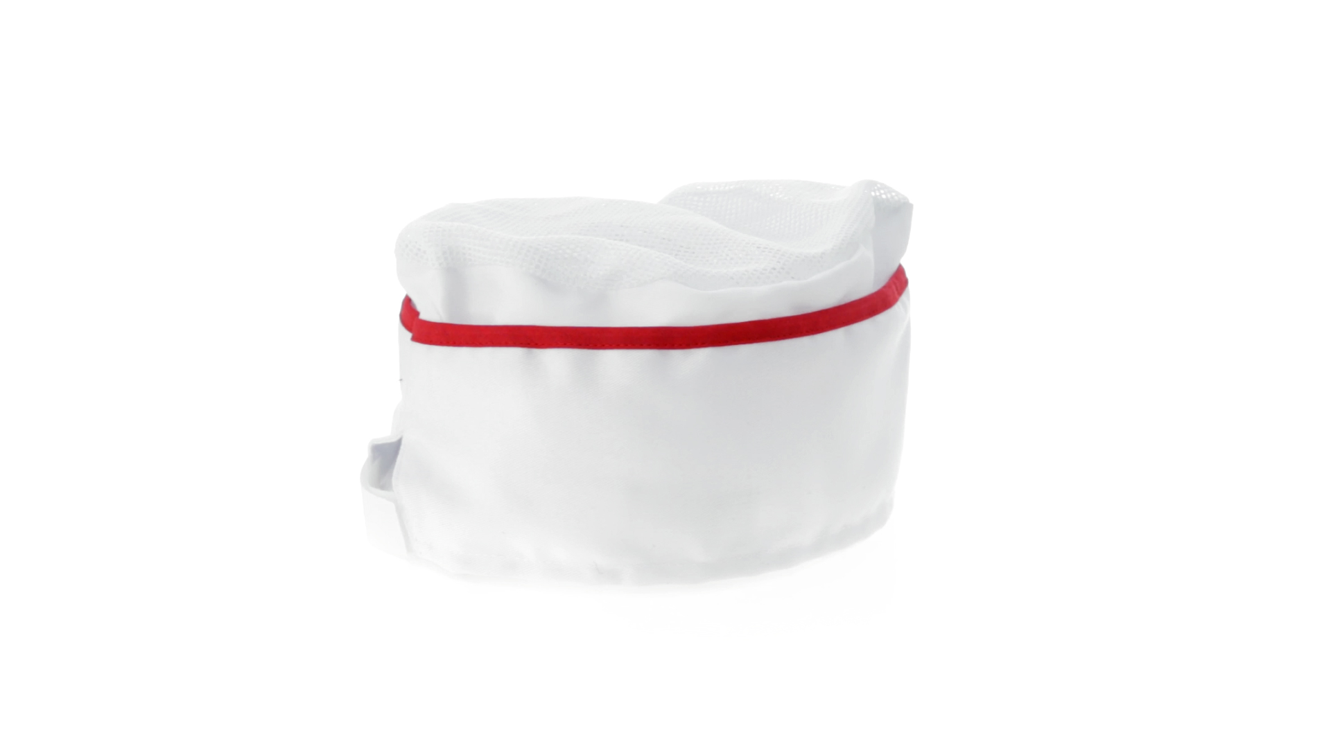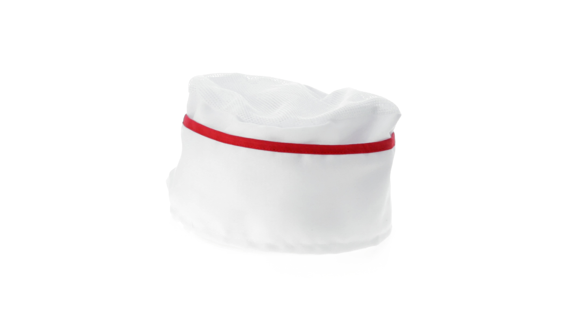 Kochmütze aus angenehmem TC-Material - einer Baumwoll/Polyester-Kombination - in einer fröhlichen Farbkombination: Weiss mit Kontrastdetails in lebendigen Farben.