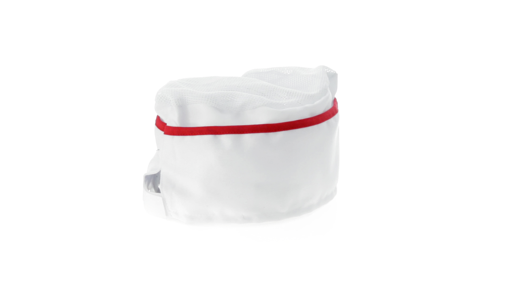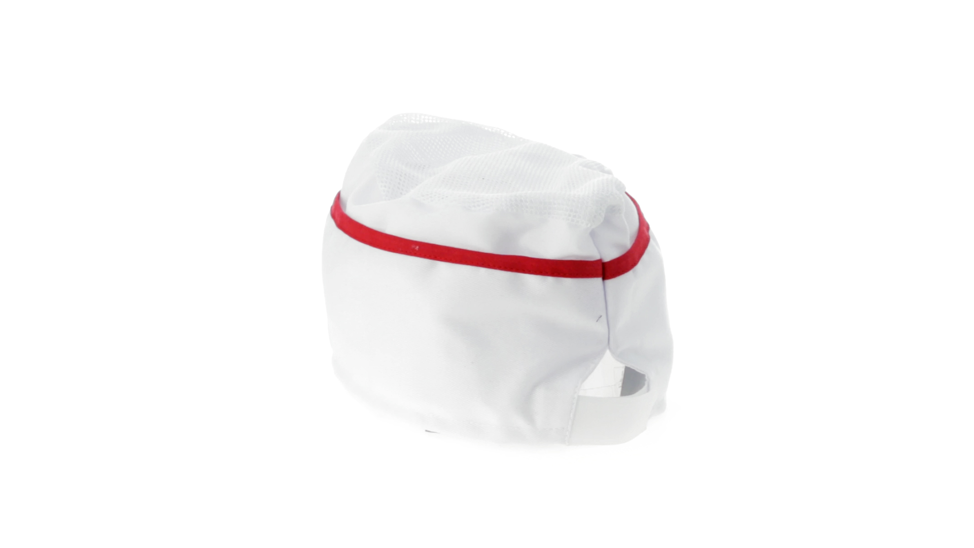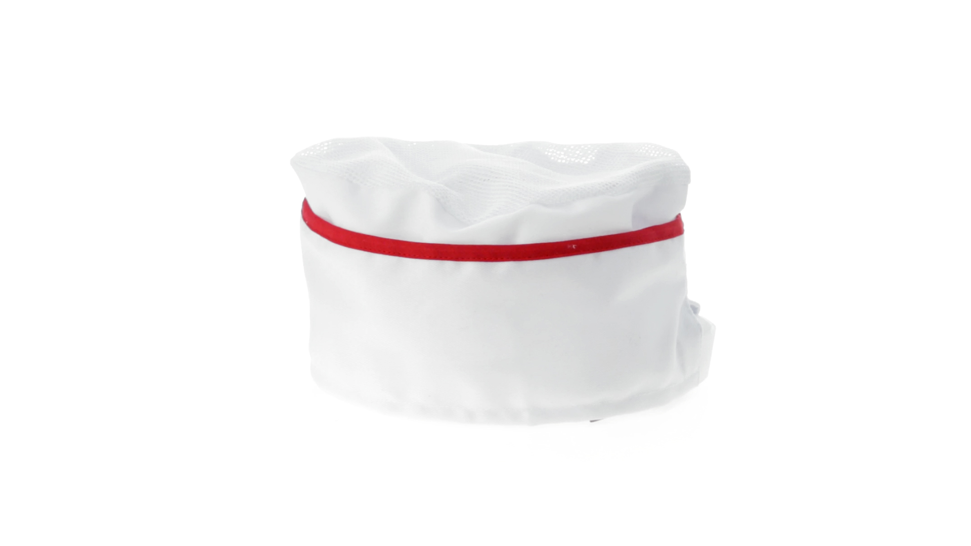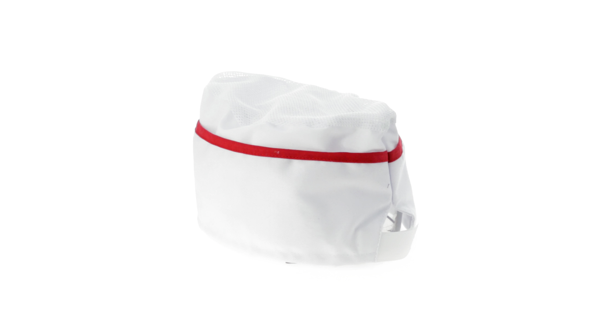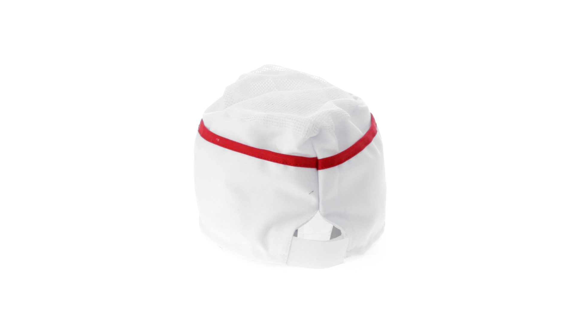 Kochmütze aus angenehmem TC-Material - einer Baumwoll/Polyester-Kombination - in einer fröhlichen Farbkombination: Weiss mit Kontrastdetails in lebendigen Farben.