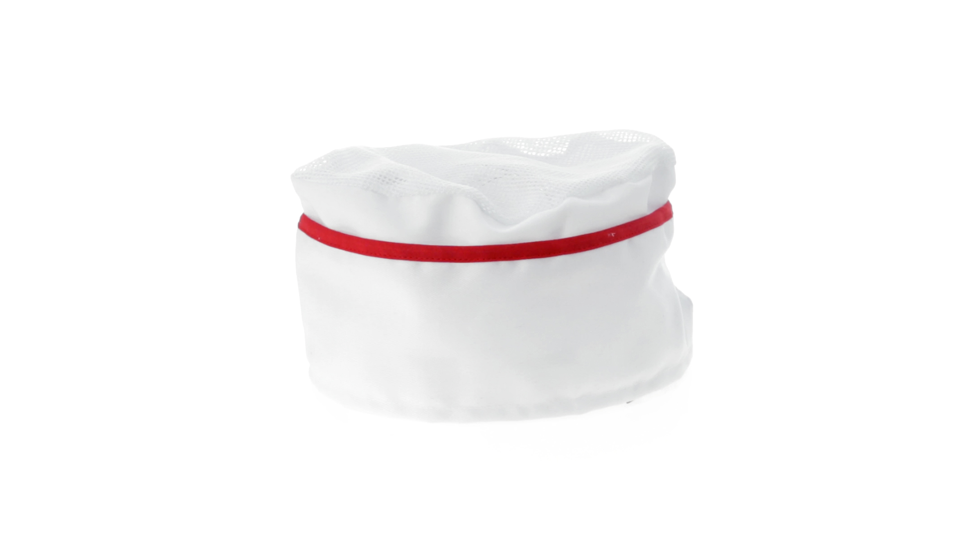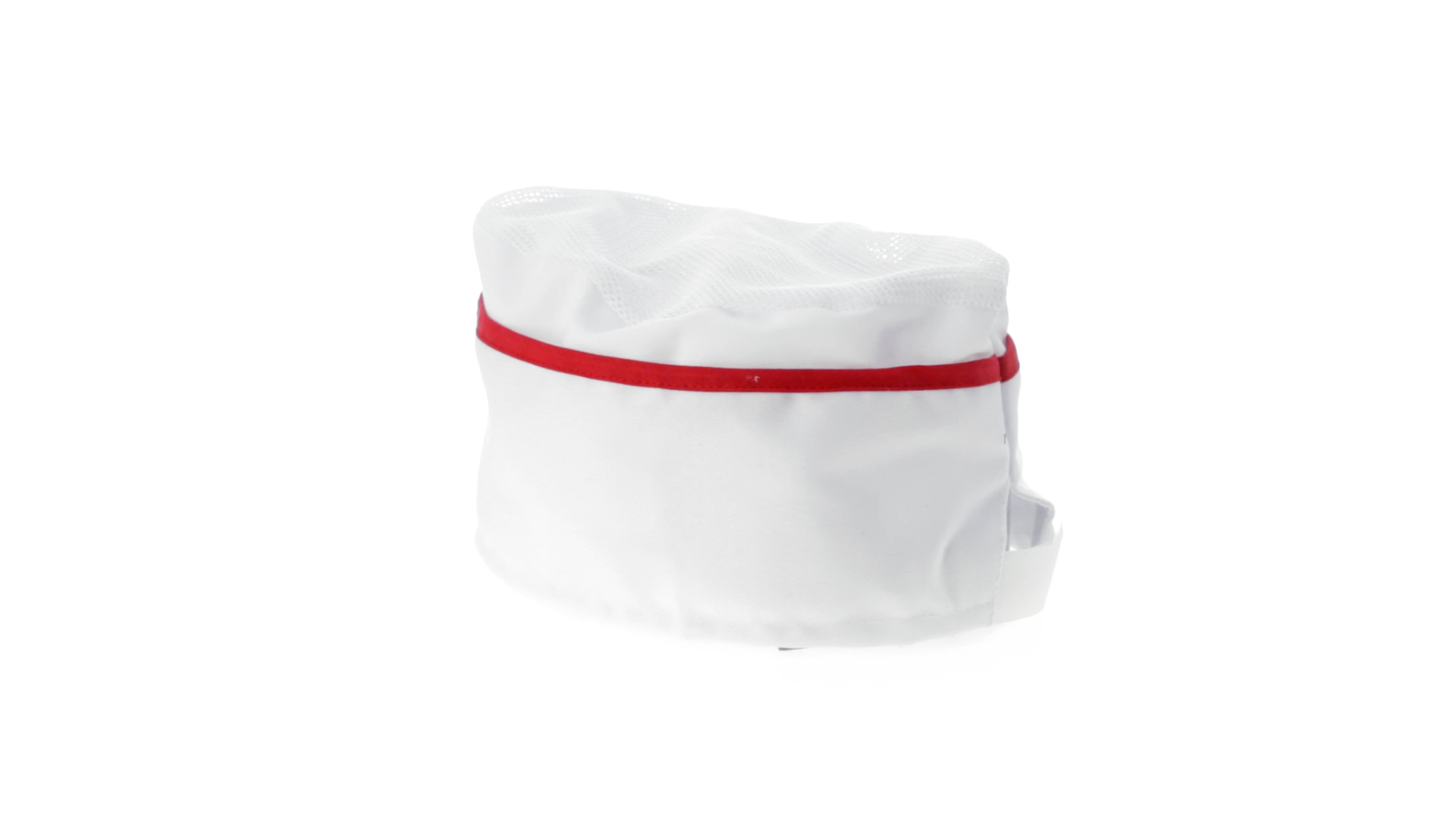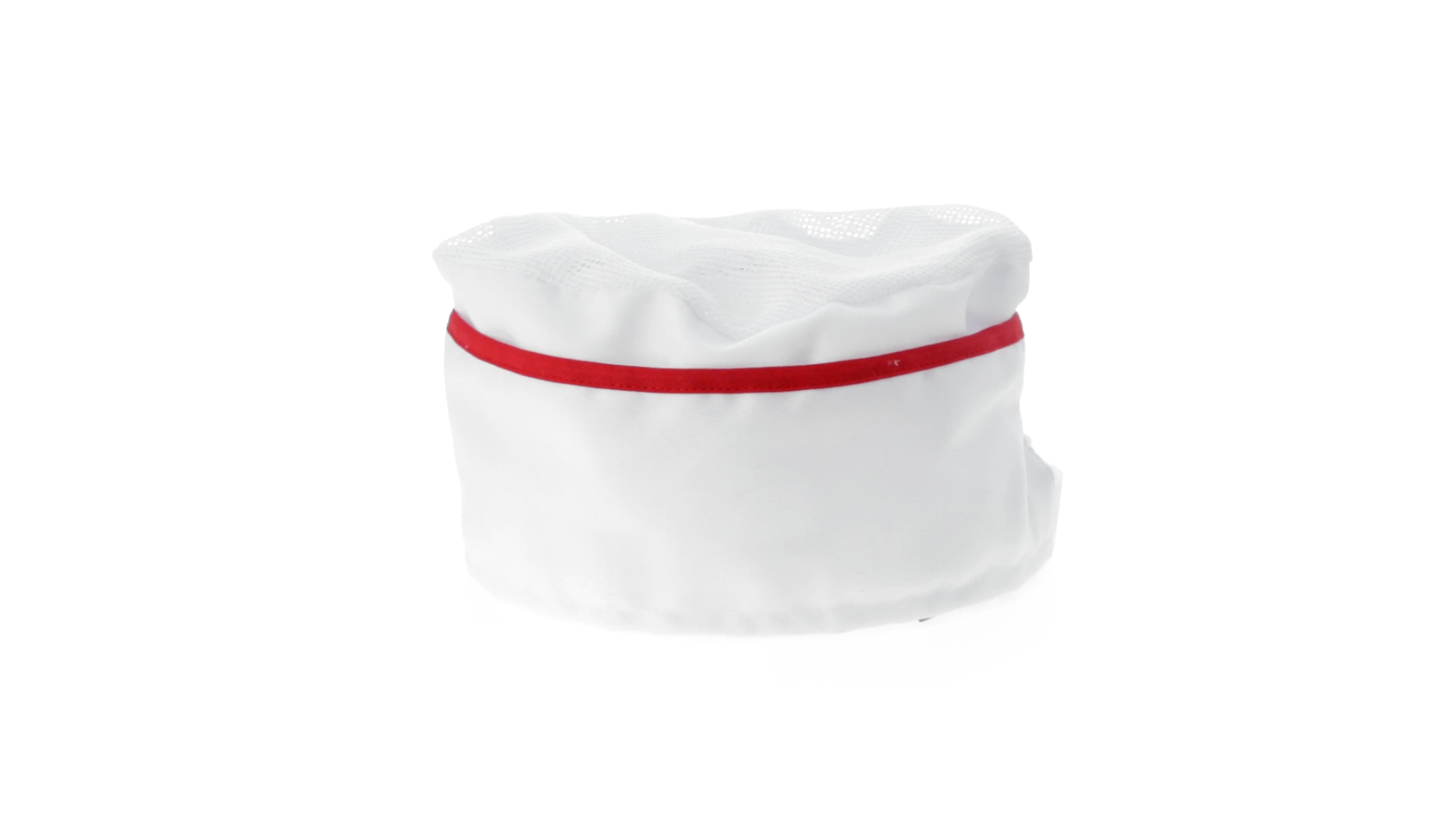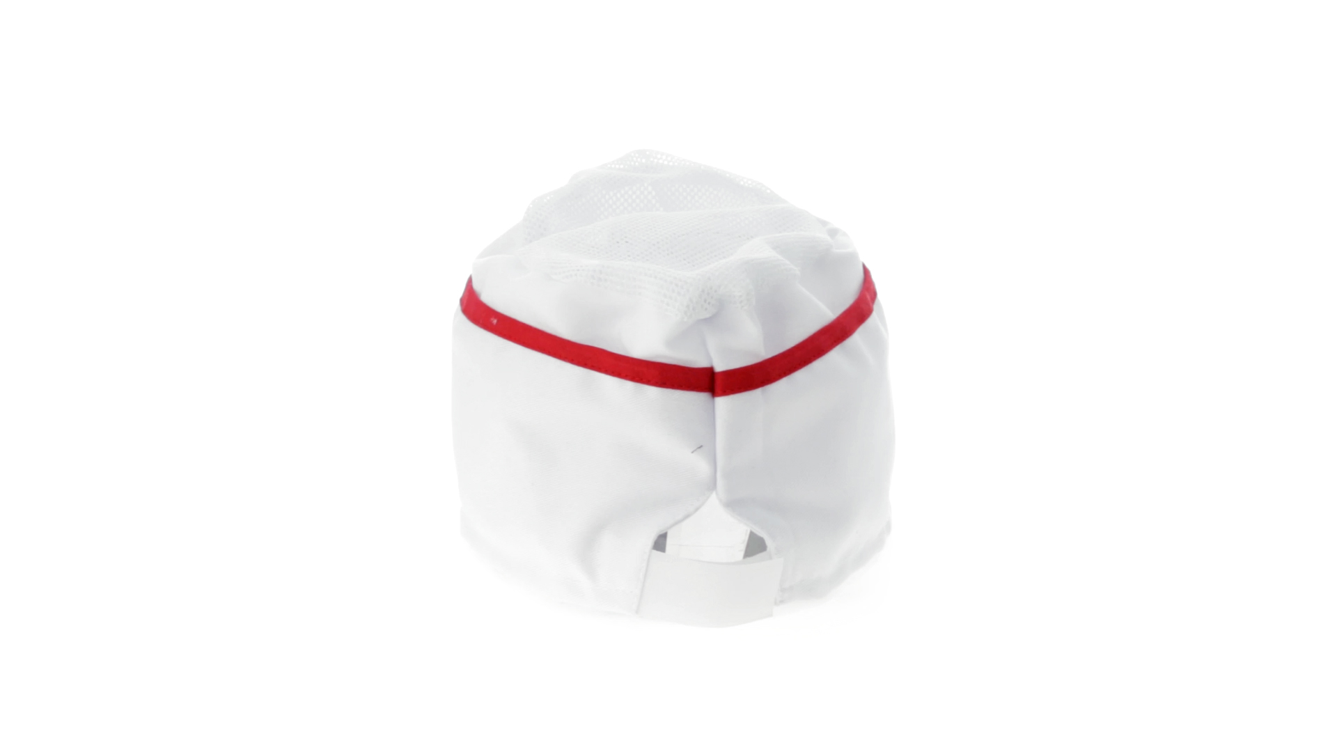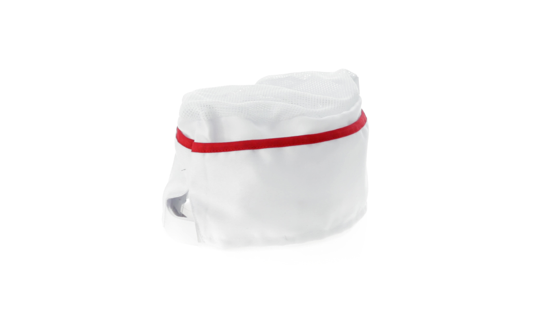Kochmütze aus angenehmem TC-Material - einer Baumwoll/Polyester-Kombination - in einer fröhlichen Farbkombination: Weiss mit Kontrastdetails in lebendigen Farben.