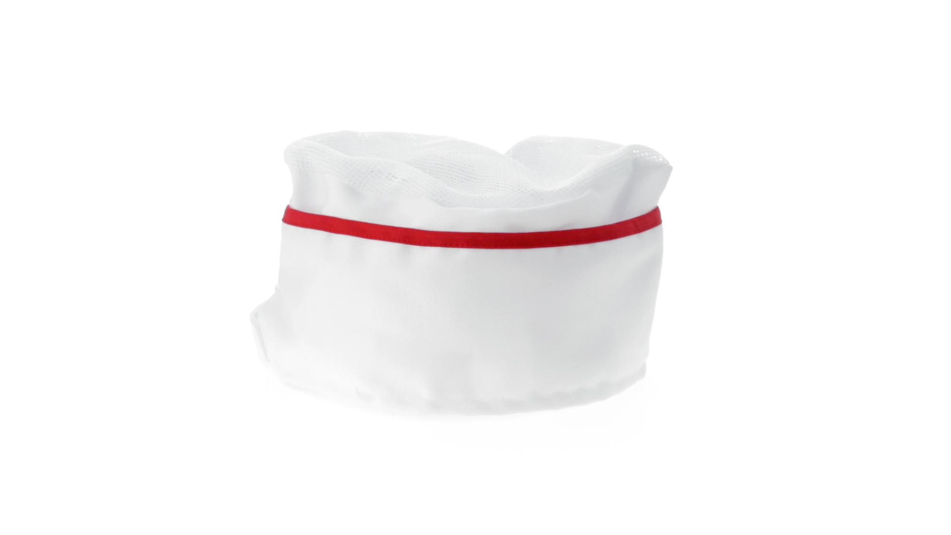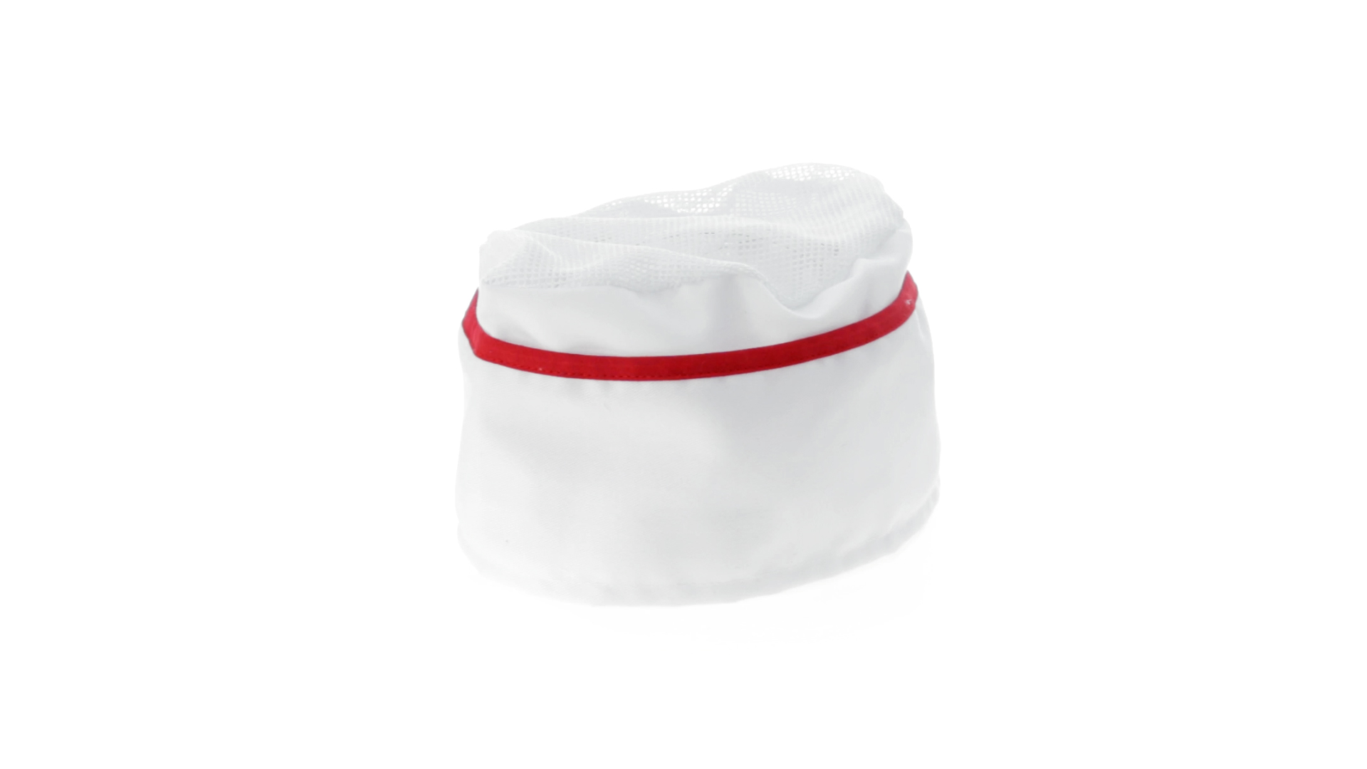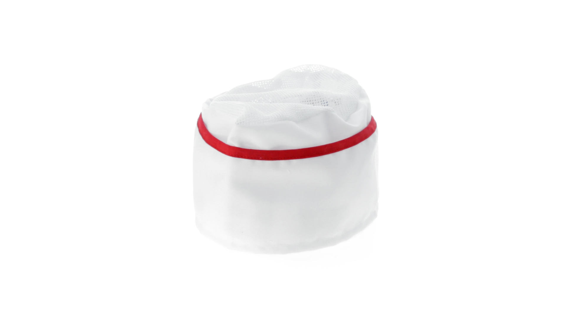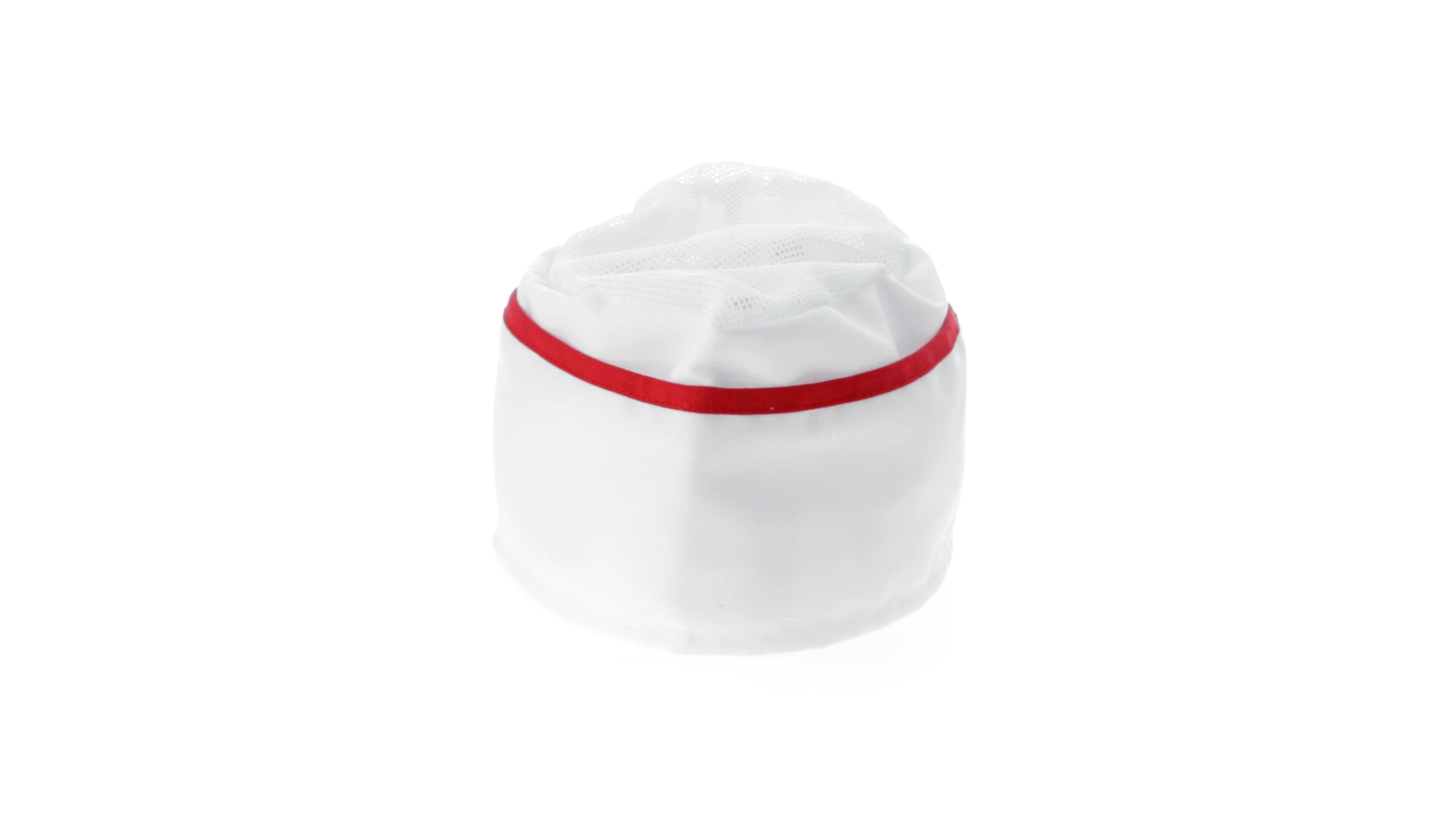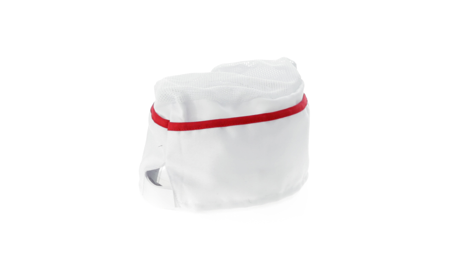 Kochmütze aus angenehmem TC-Material - einer Baumwoll/Polyester-Kombination - in einer fröhlichen Farbkombination: Weiss mit Kontrastdetails in lebendigen Farben.