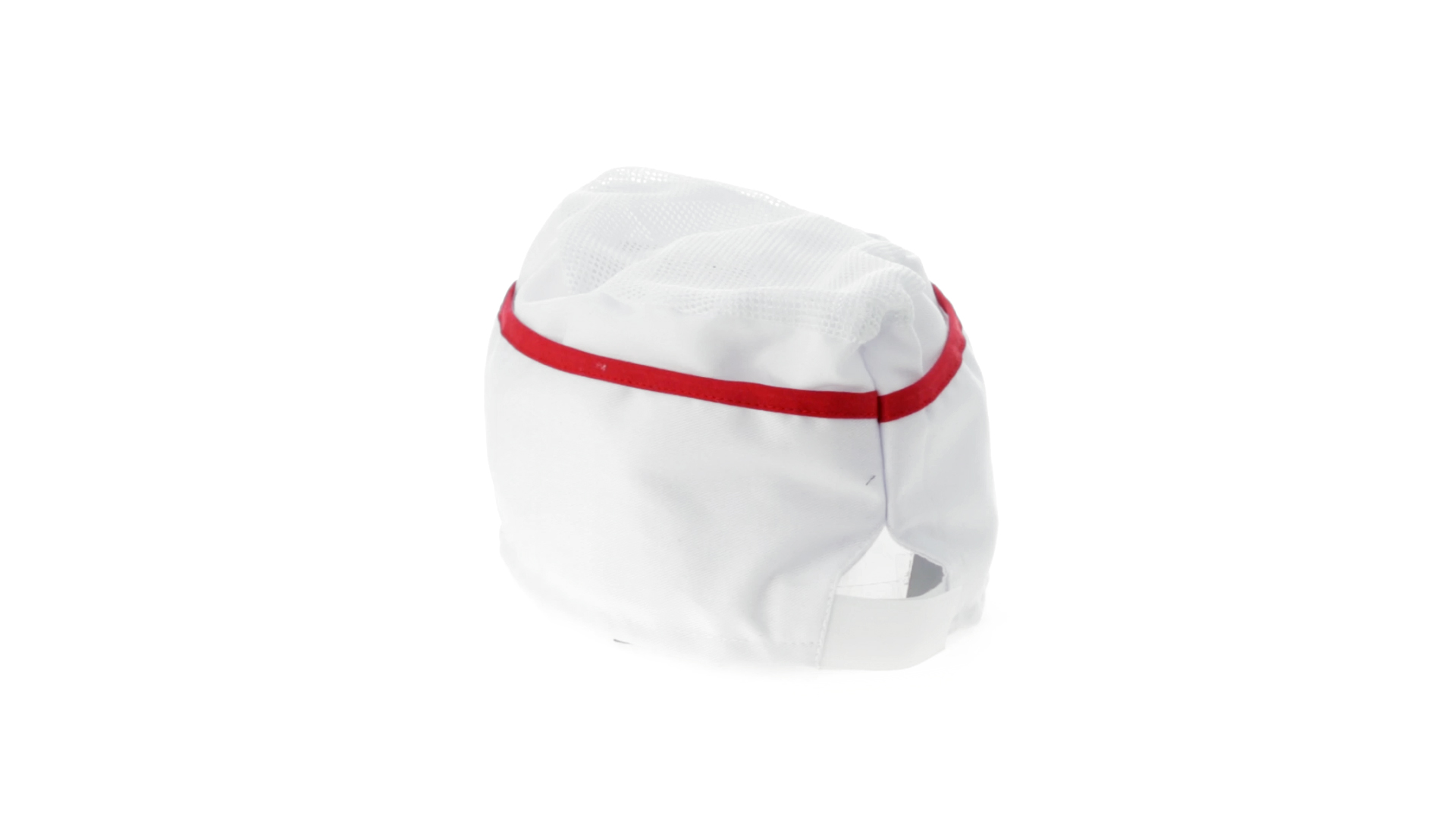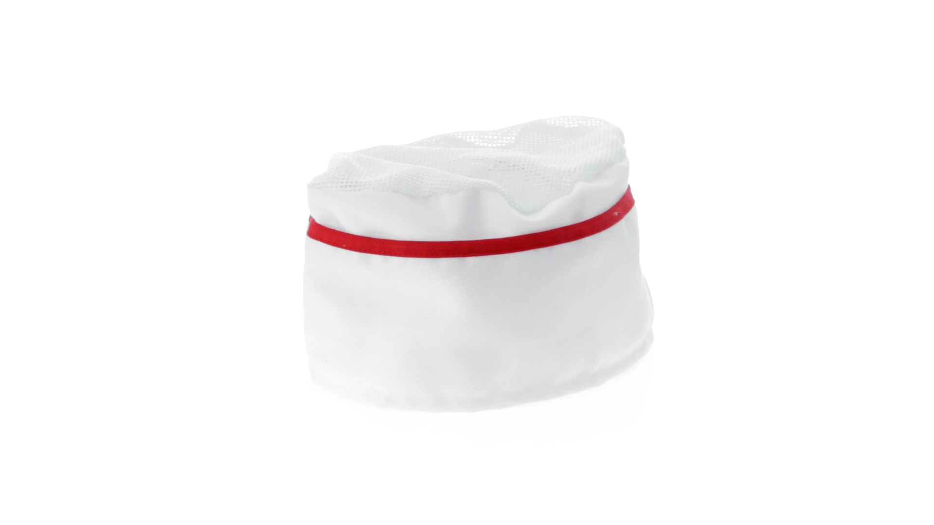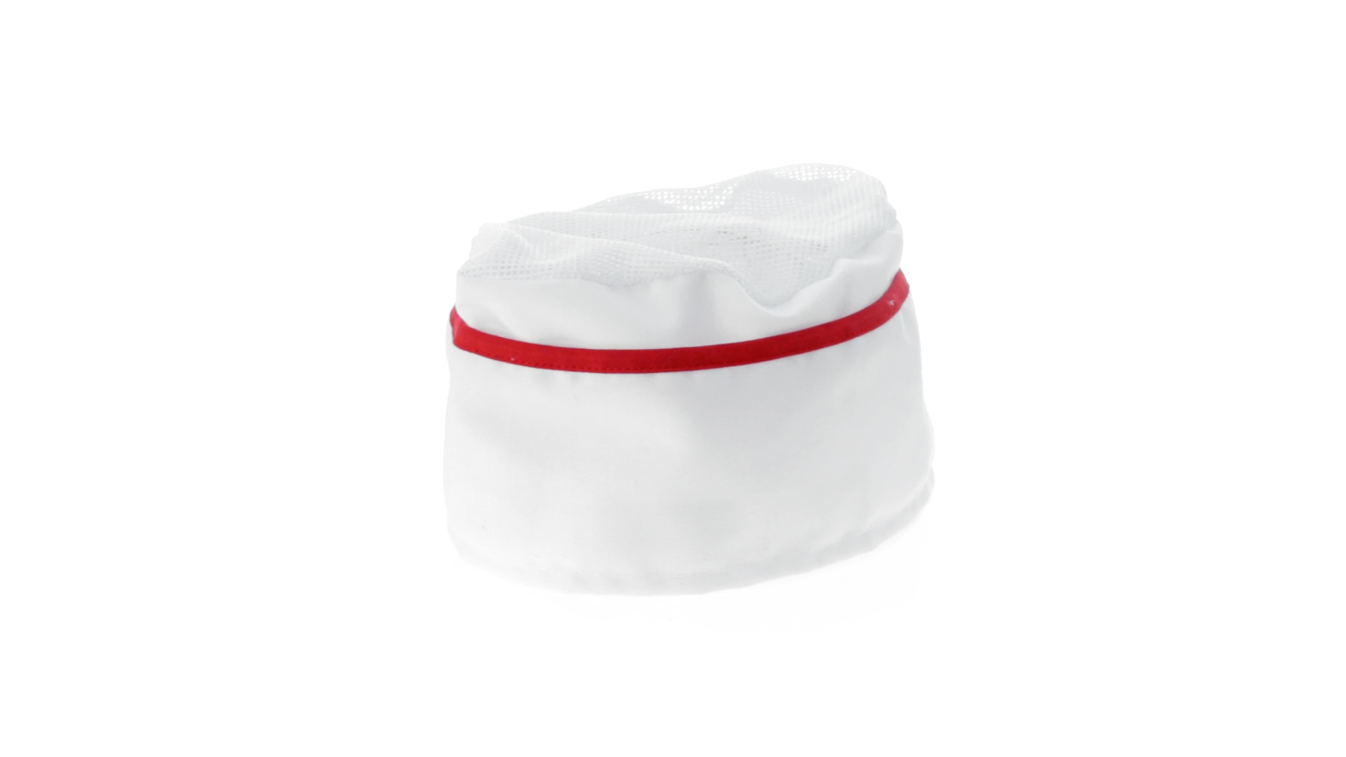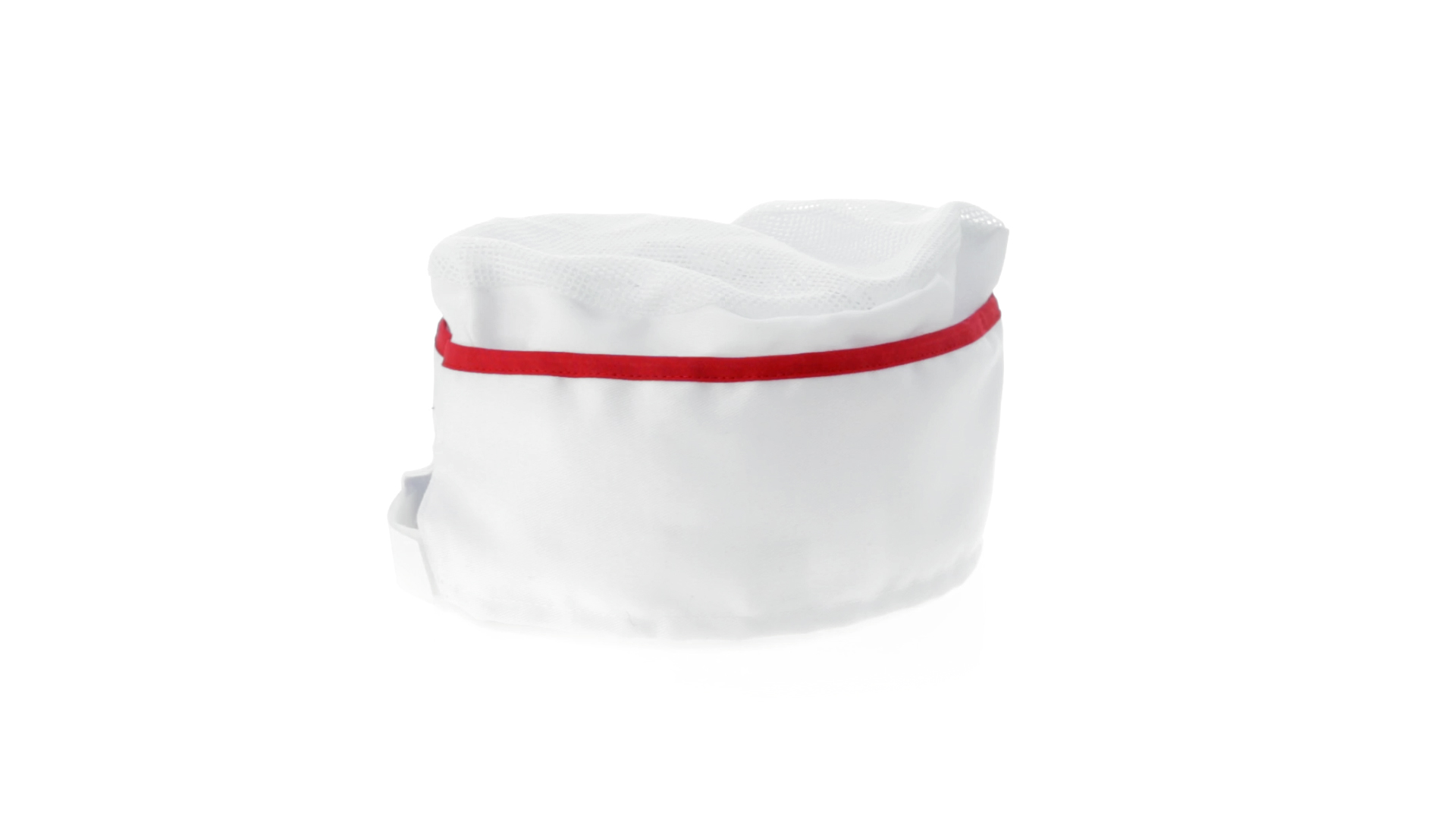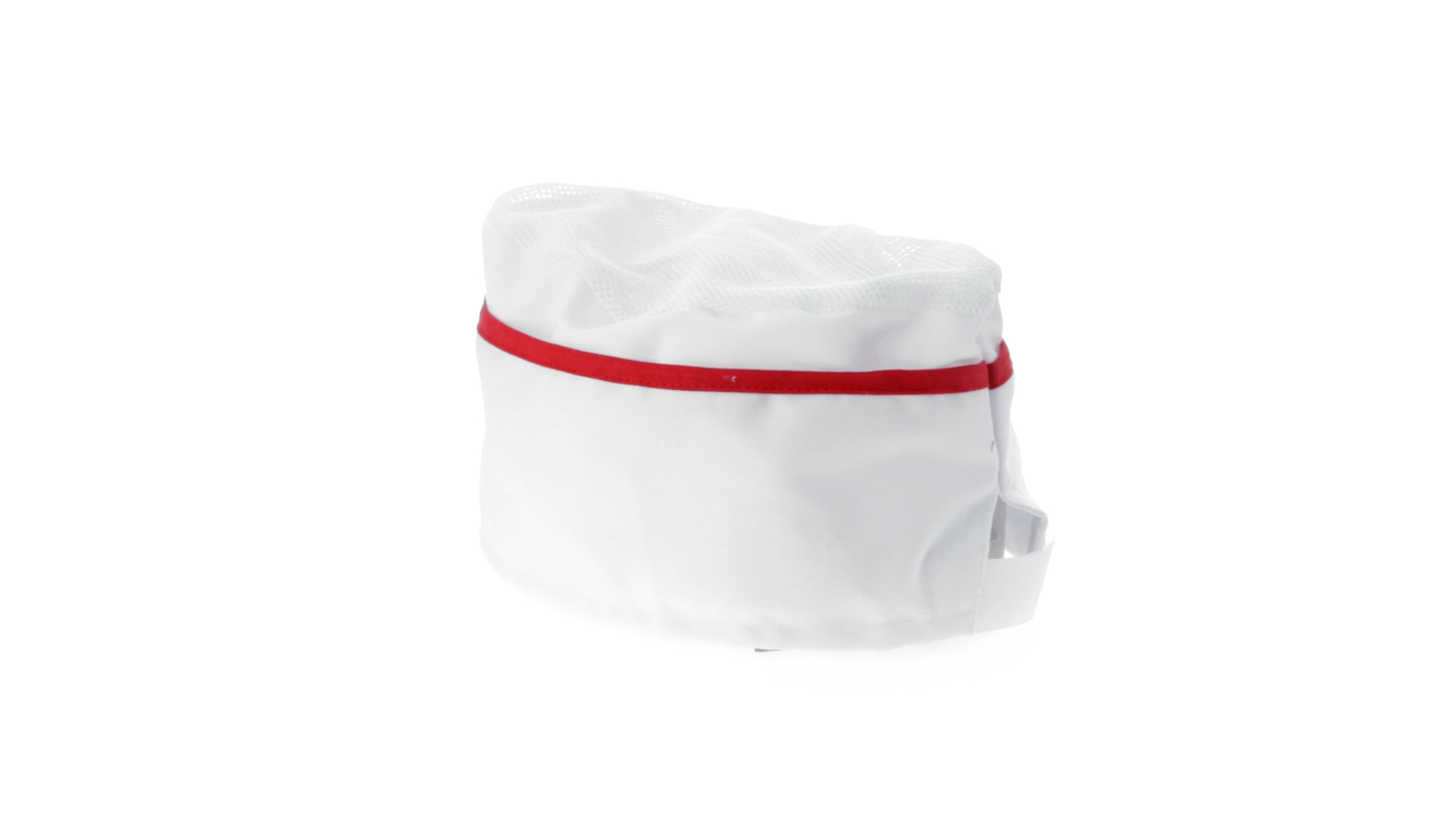 Kochmütze aus angenehmem TC-Material - einer Baumwoll/Polyester-Kombination - in einer fröhlichen Farbkombination: Weiss mit Kontrastdetails in lebendigen Farben.