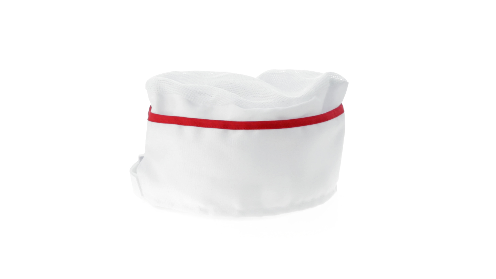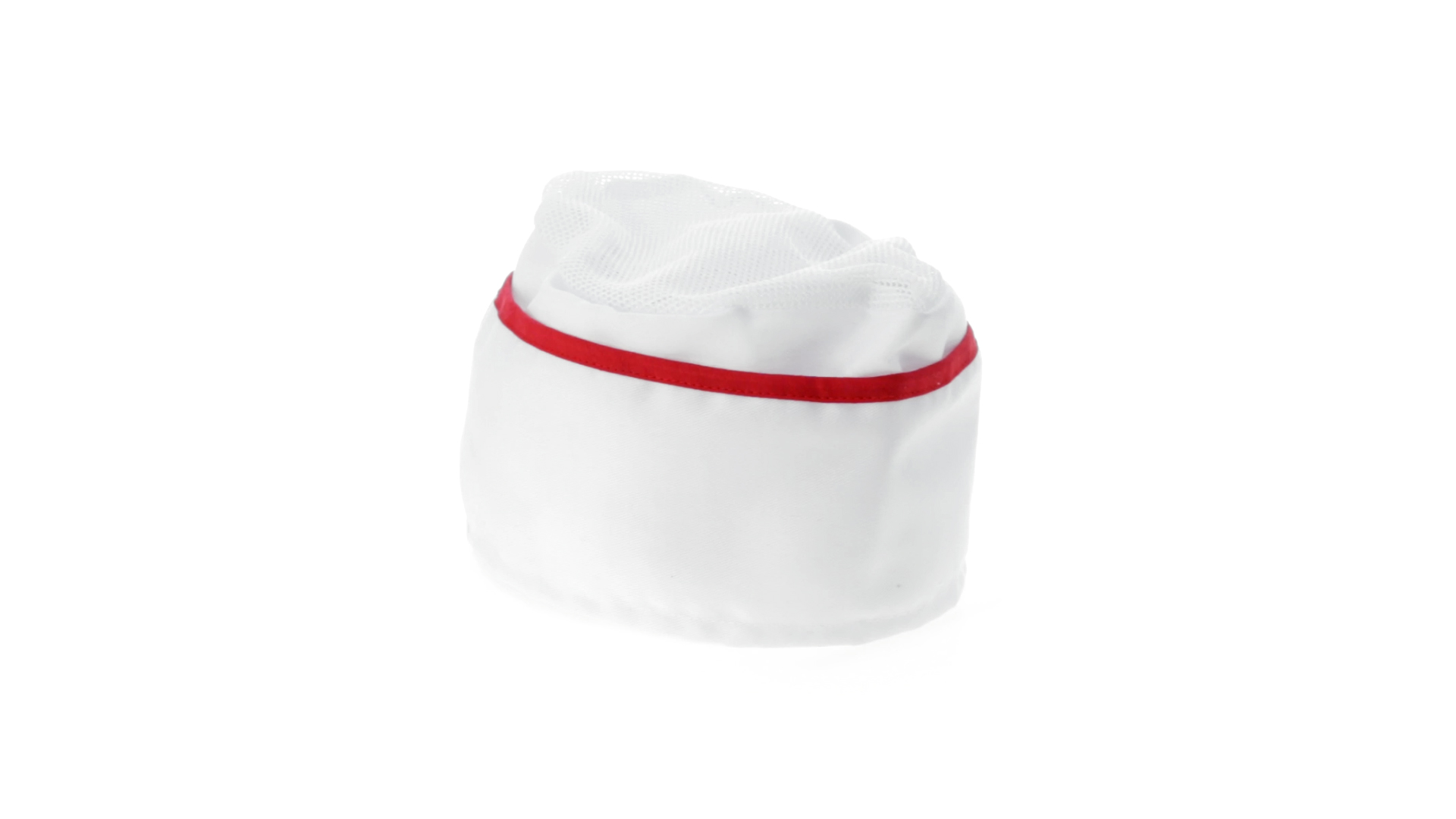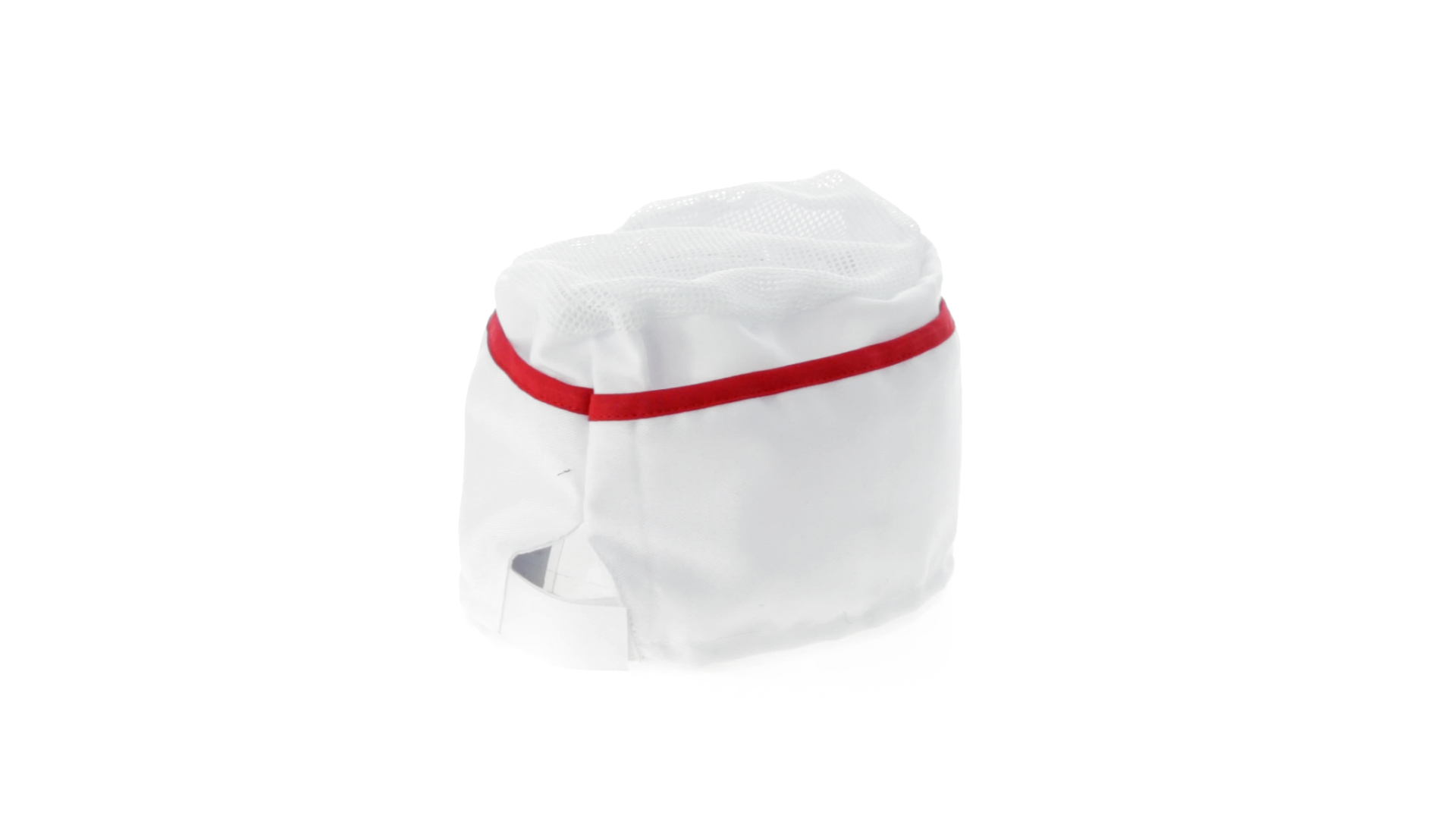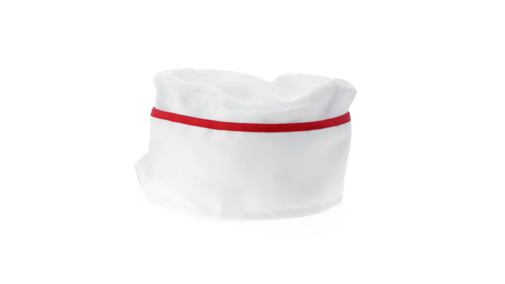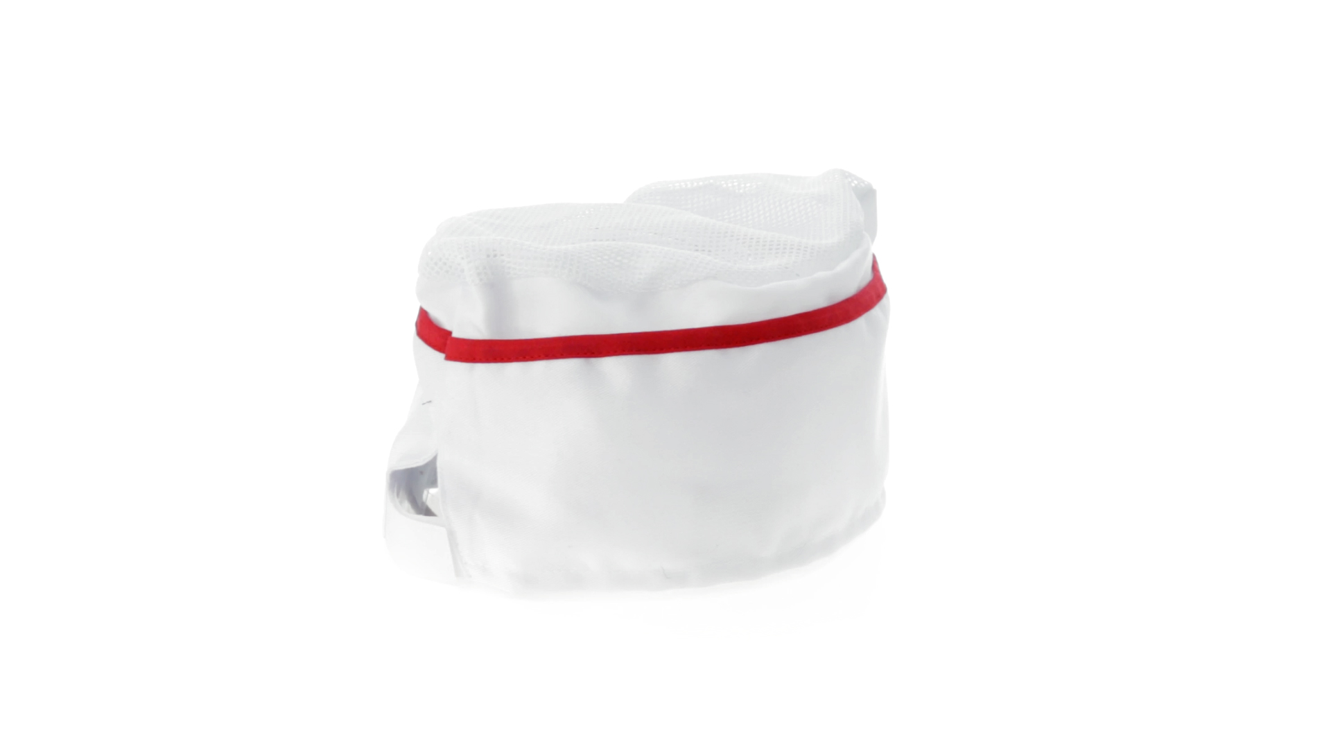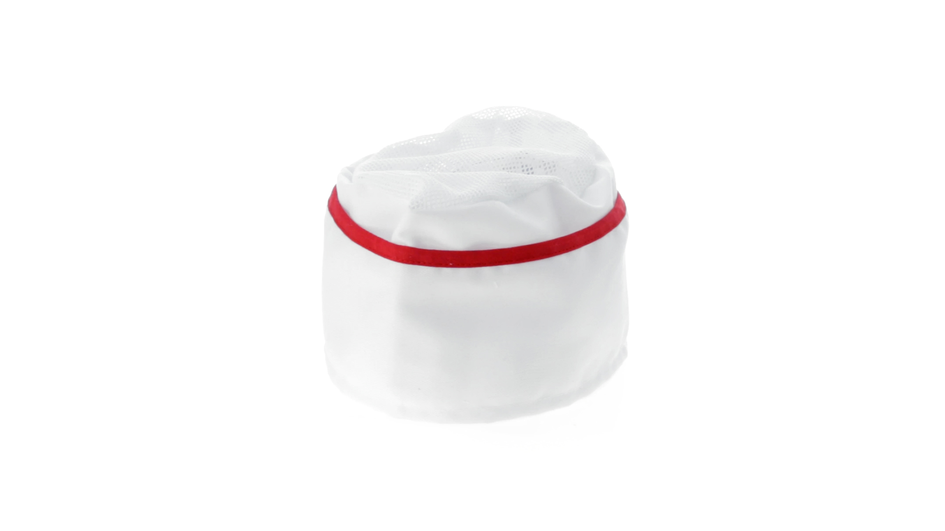Kochmütze aus angenehmem TC-Material - einer Baumwoll/Polyester-Kombination - in einer fröhlichen Farbkombination: Weiss mit Kontrastdetails in lebendigen Farben.