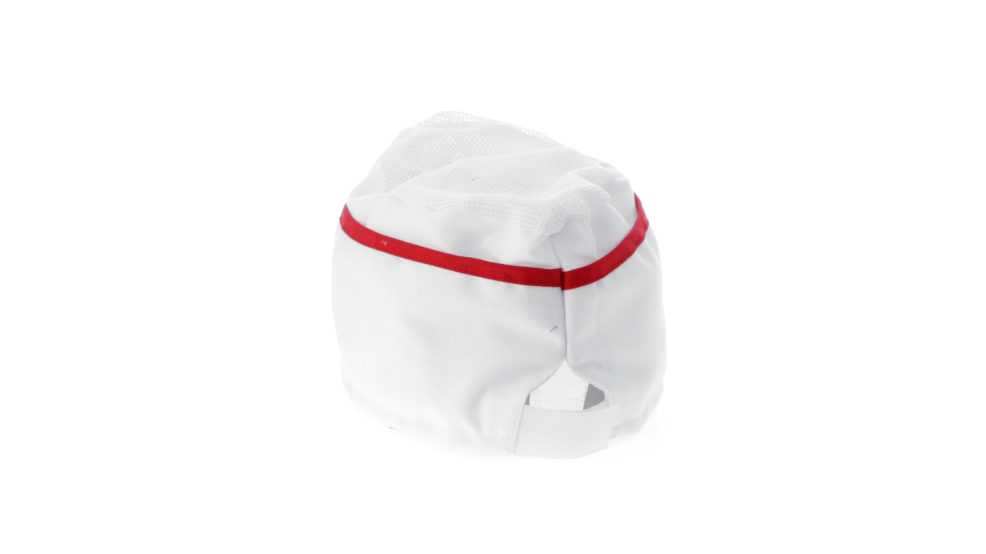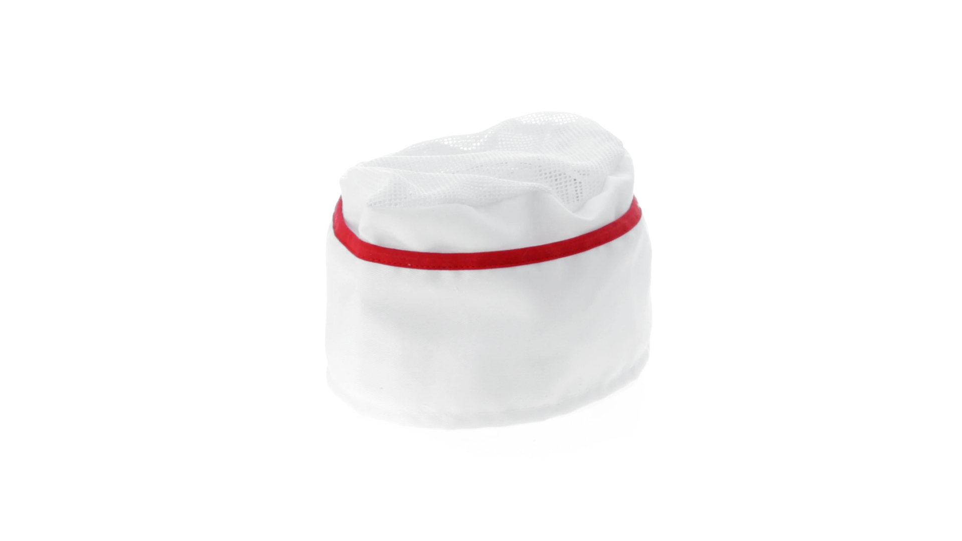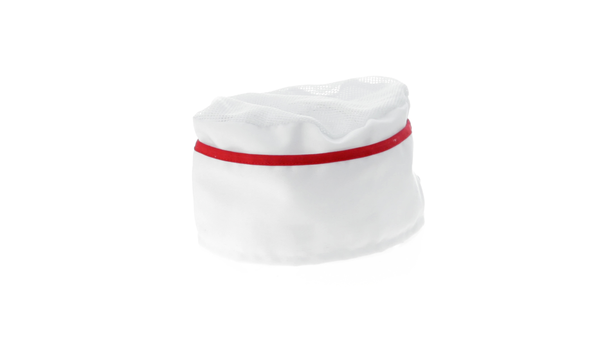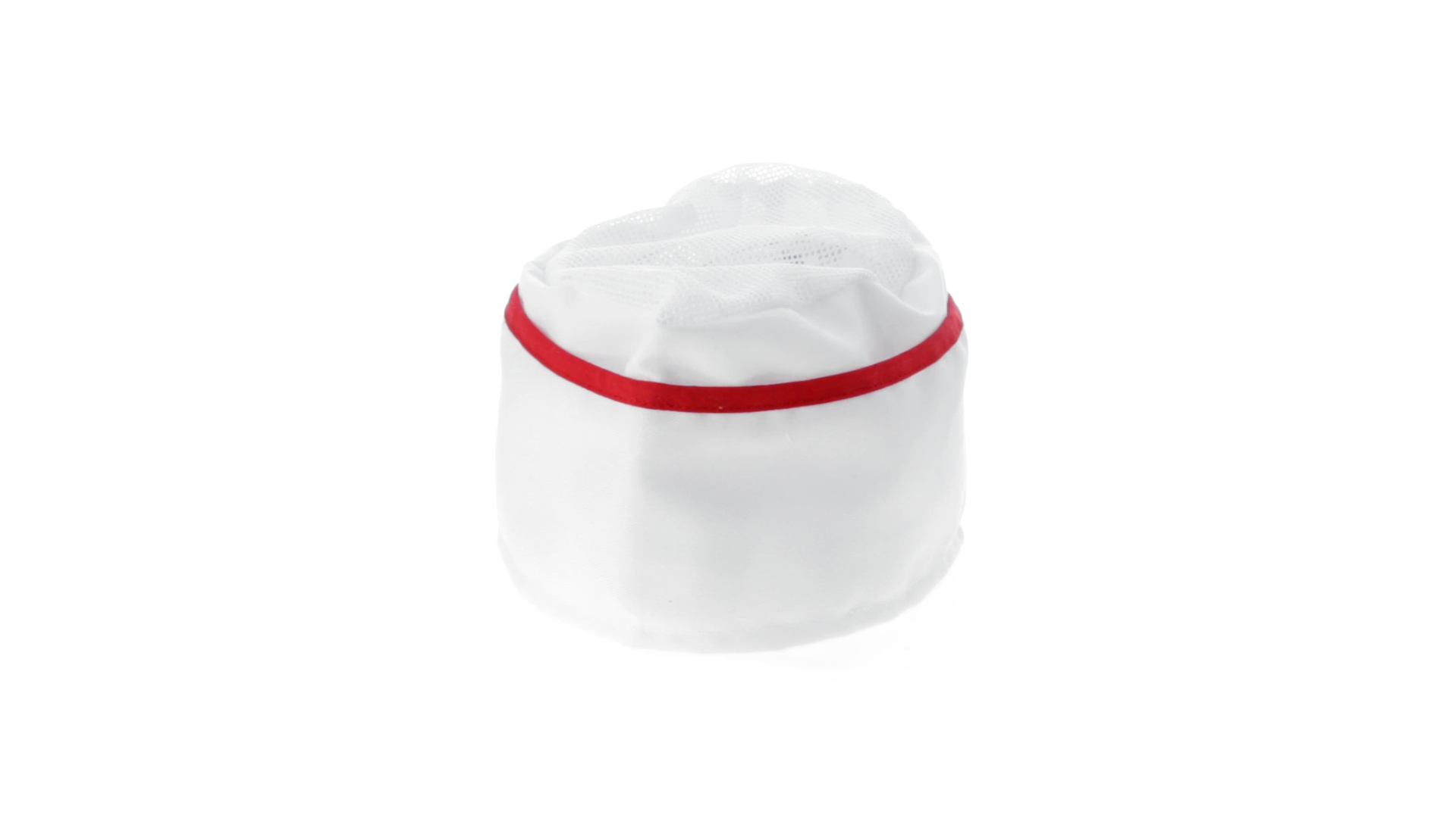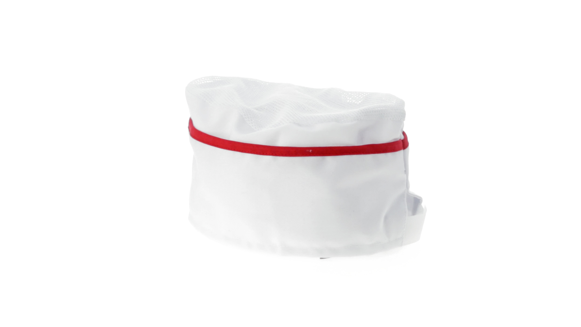 Kochmütze aus angenehmem TC-Material - einer Baumwoll/Polyester-Kombination - in einer fröhlichen Farbkombination: Weiss mit Kontrastdetails in lebendigen Farben.