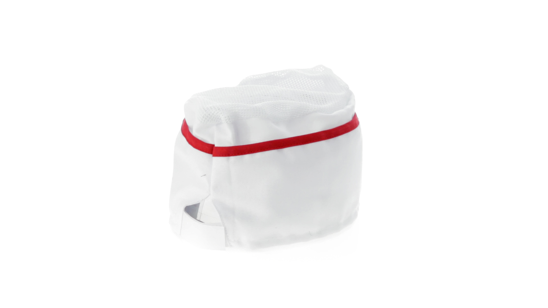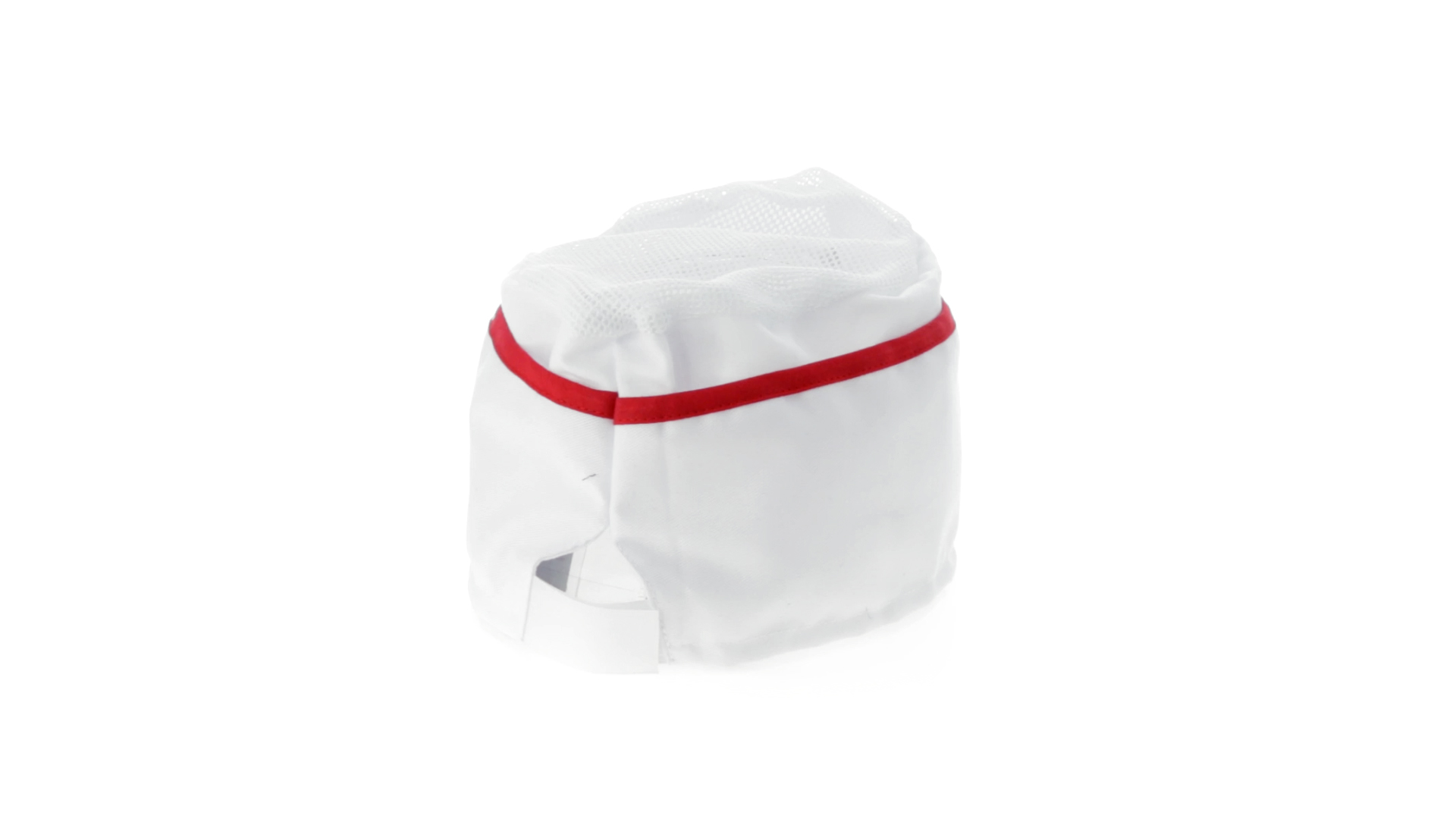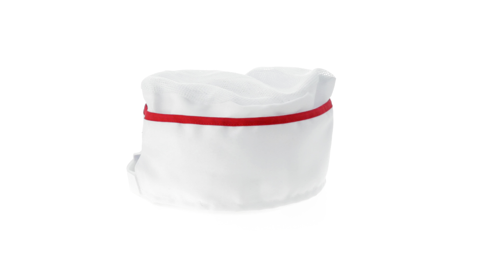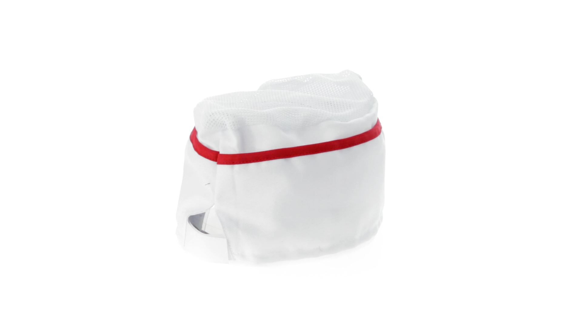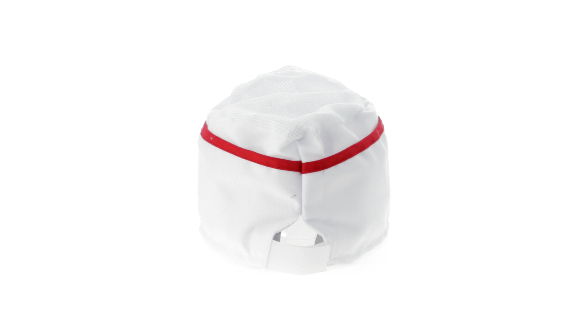 Kochmütze aus angenehmem TC-Material - einer Baumwoll/Polyester-Kombination - in einer fröhlichen Farbkombination: Weiss mit Kontrastdetails in lebendigen Farben.