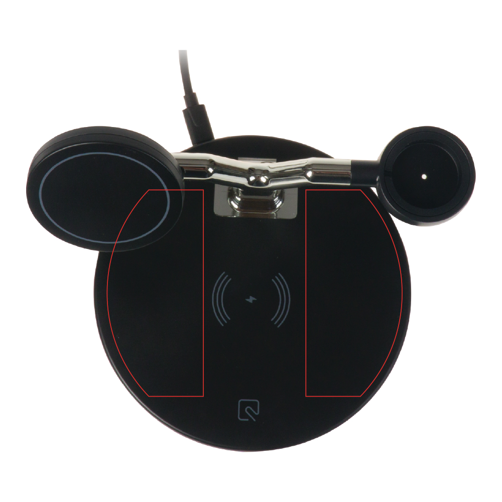 Laden Sie Ihre Geräte mit unserer Tischladestation auf. Entwickelt für maximalen Komfort und Effizienz. Dieses 3-in-1-Ladegerät verfügt über zwei integrierte Ladestellen: ein Basisladegerät, das sich perfekt für kleinere Geräte wie AirPods® eignet, und ein 15-W-Schnellladegerät mit MagSafe für ein iPhone® (ab iPhone 12) oder ein anderes Telefon, das z. B. eine Hülle mit Magnetring besitzt. Der Ständer verfügt über einen integrierten Uhrenständer, an dem Sie ganz einfach ein Apple Watch®-Ladegerät (nicht im Lieferumfang enthalten) befestigen können, so dass Sie Ihre Apple Watch® auch kabellos aufladen können.