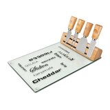 Pflegeleichtes Käse-Set, Glasplatte mit dekorativen Schriftzügen, Holzkörper mit magnetischer Halterung, 4 praktische Käsebesteckteile (Glas, Holz, Edelstahl)