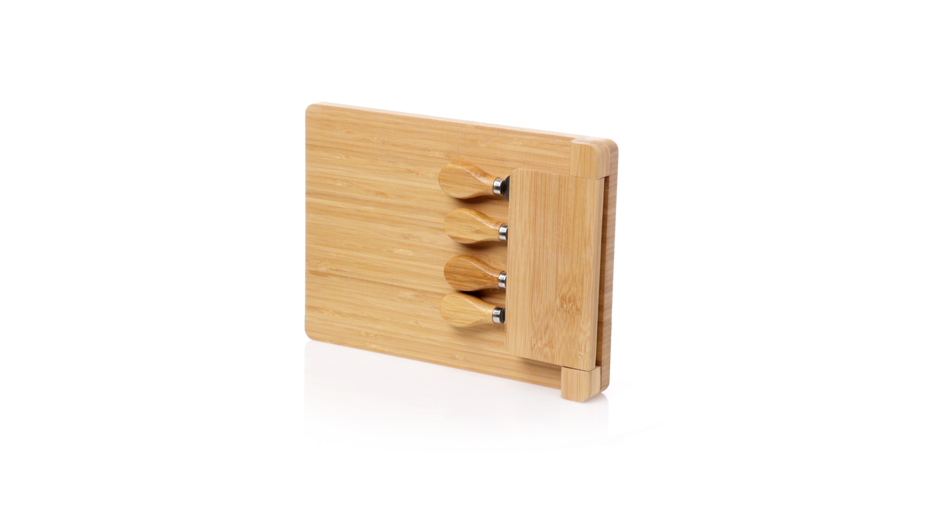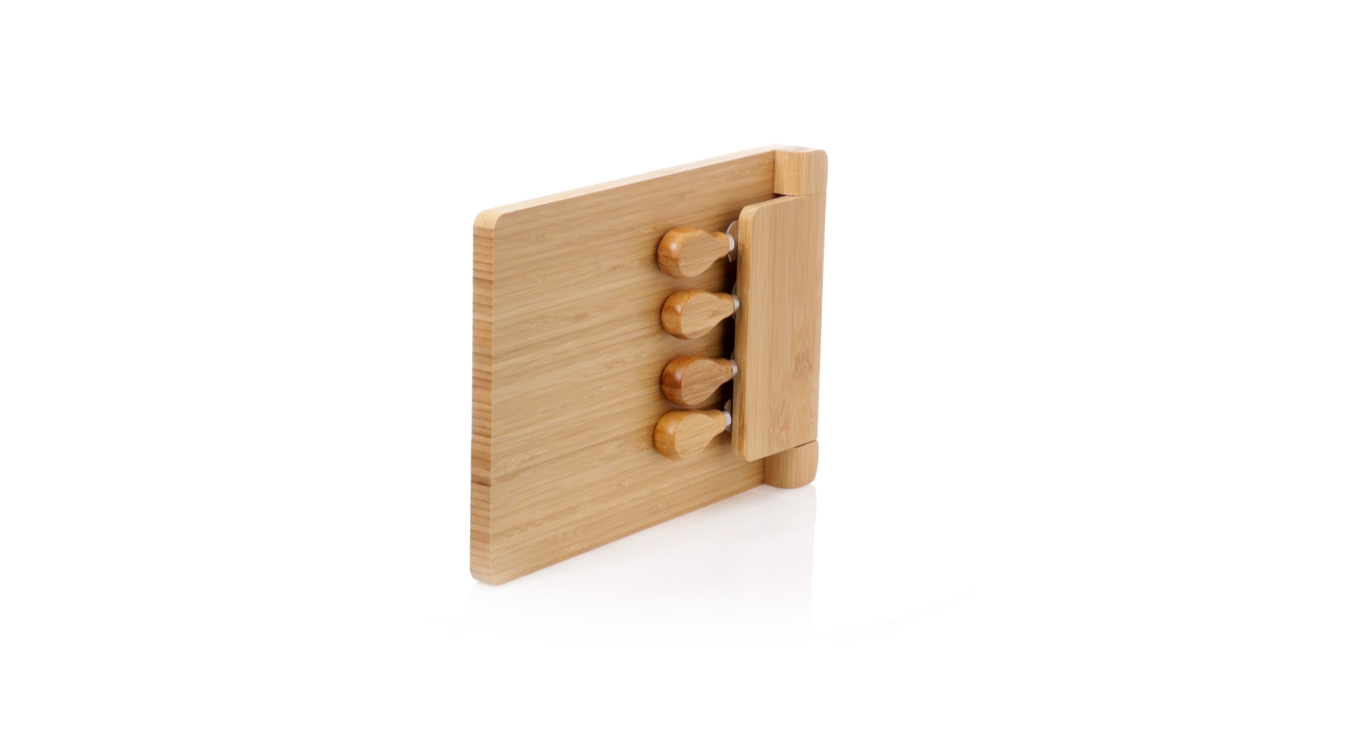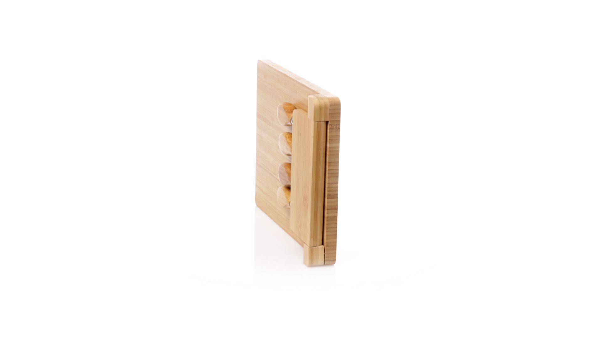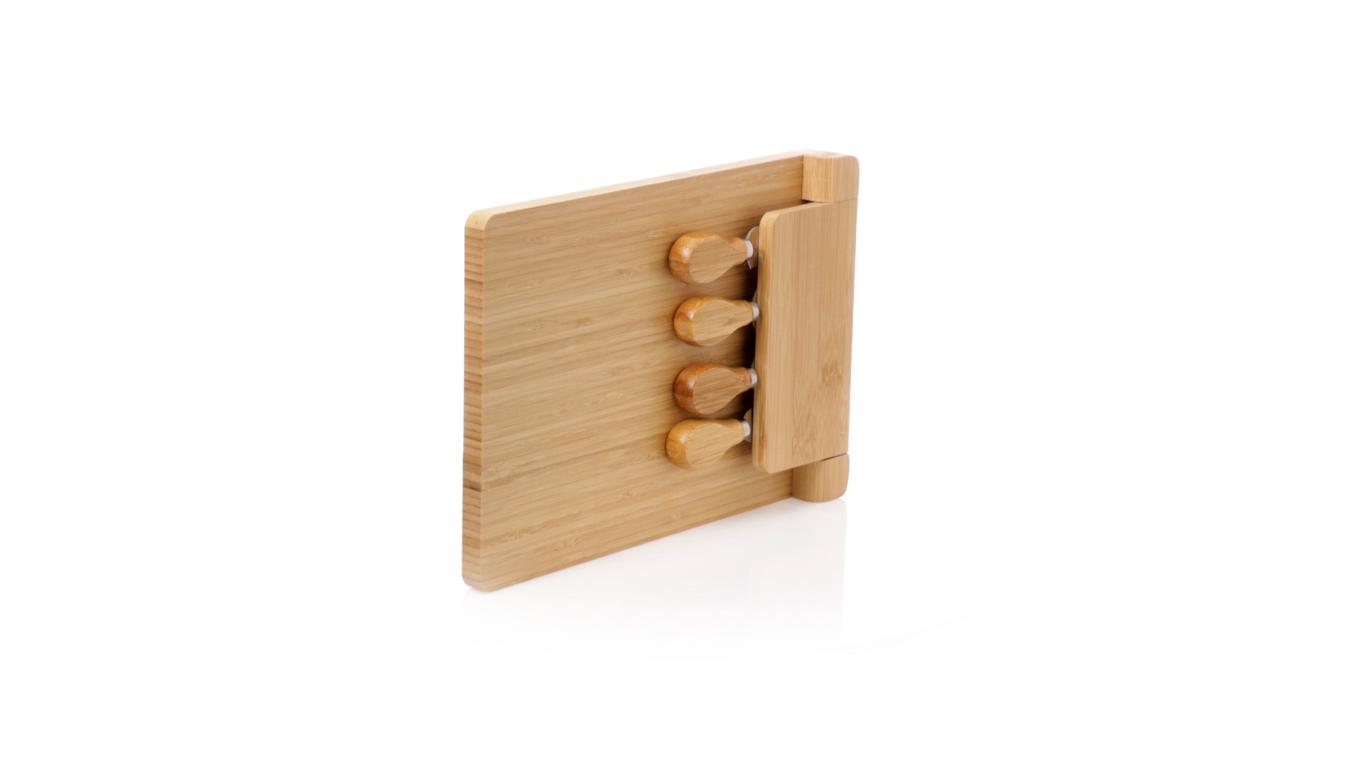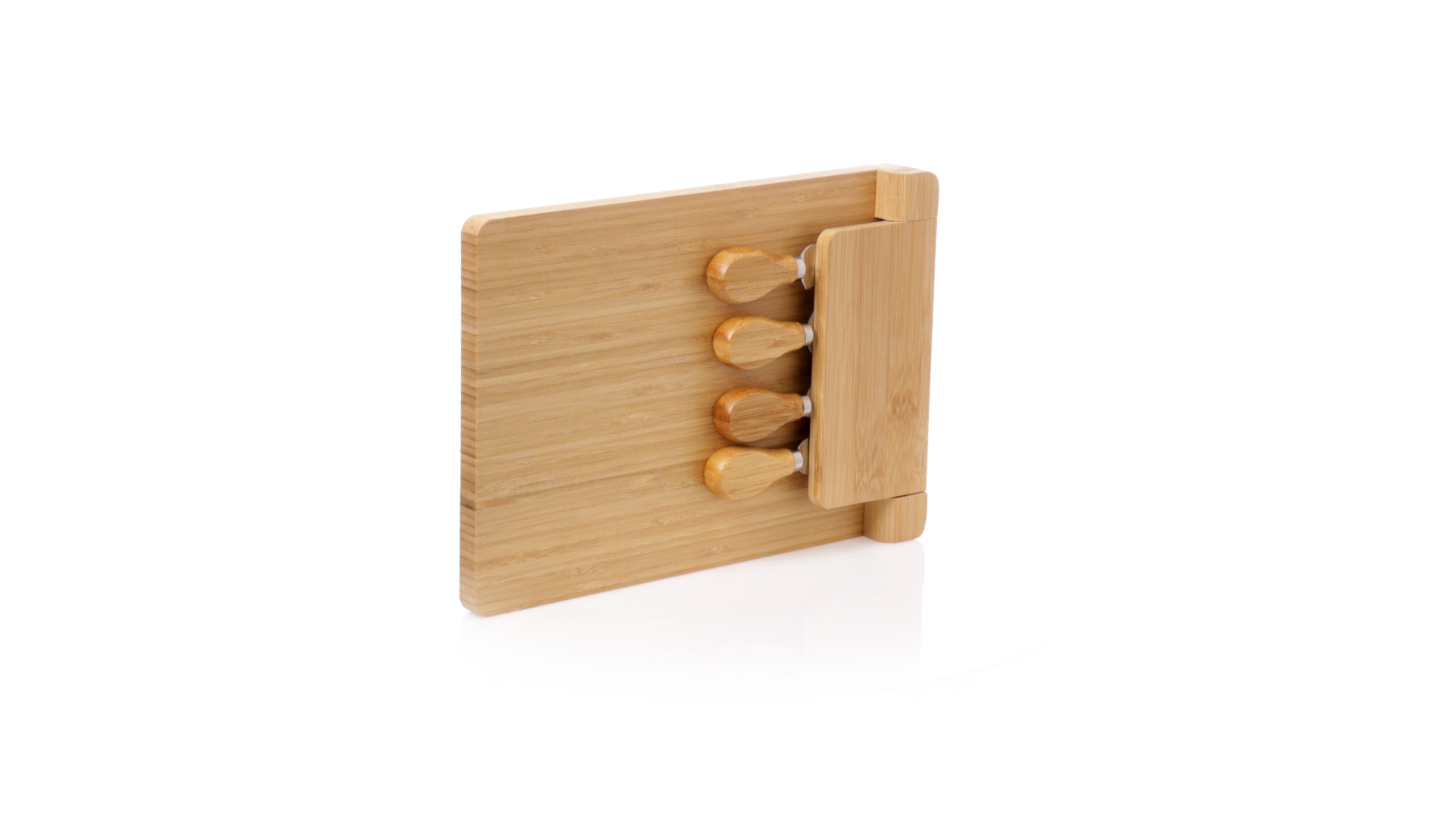 Originelles Käseset, mit magnetischem und klappbarem Zubehörhalter. Schneide- und Präsentationsbrett aus Bambus im rechteckigen Format. Zubehör aus rostfreiem Stahl mit Bambusgriff. Präsentiert in einer individuellen Kraft-Design-Box.