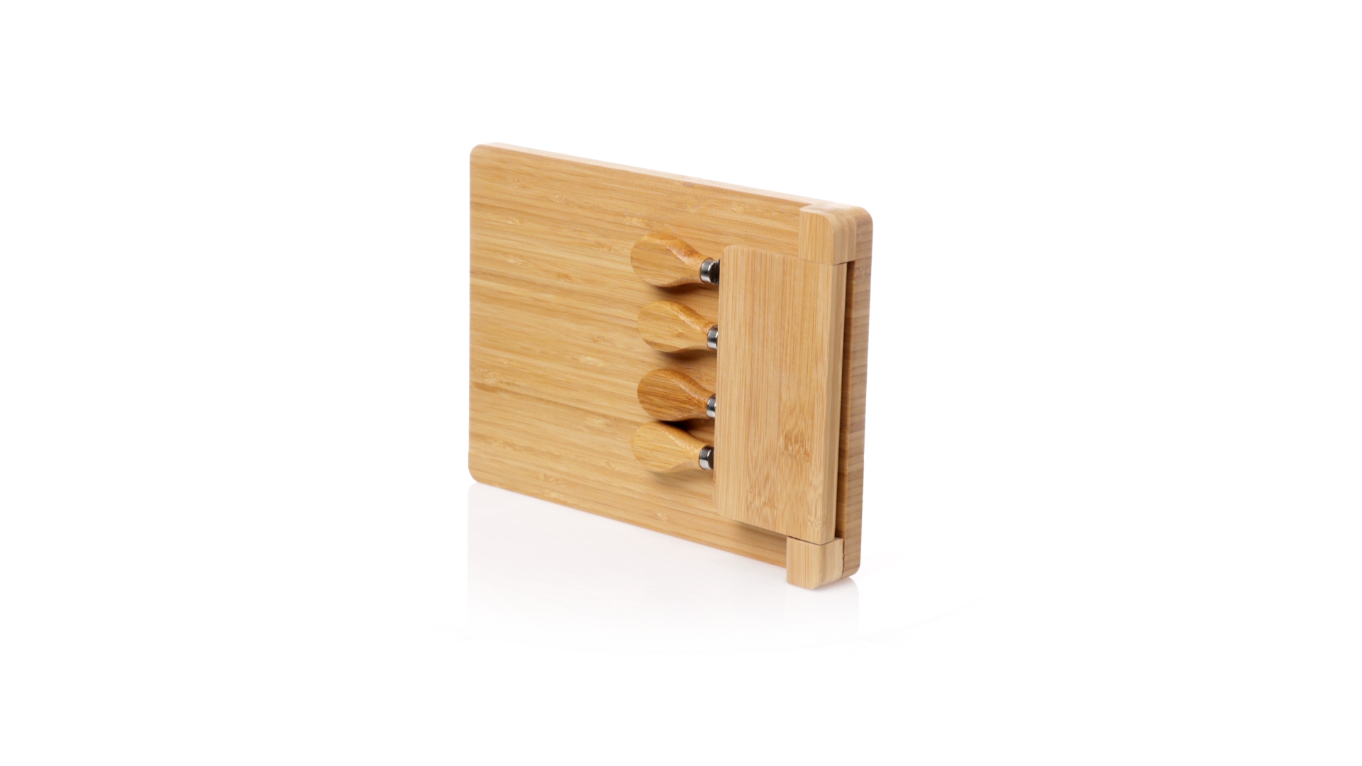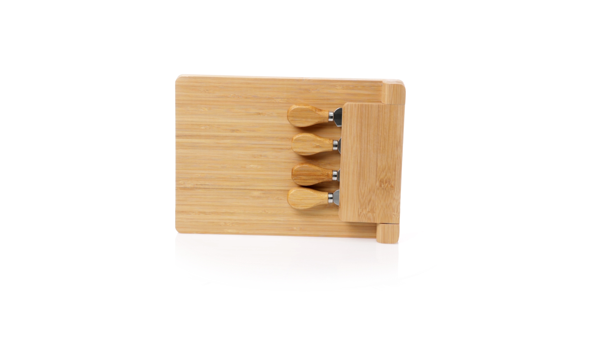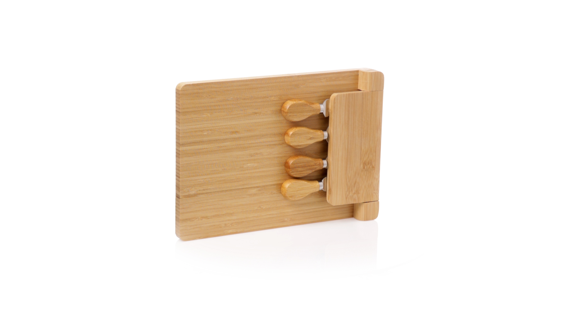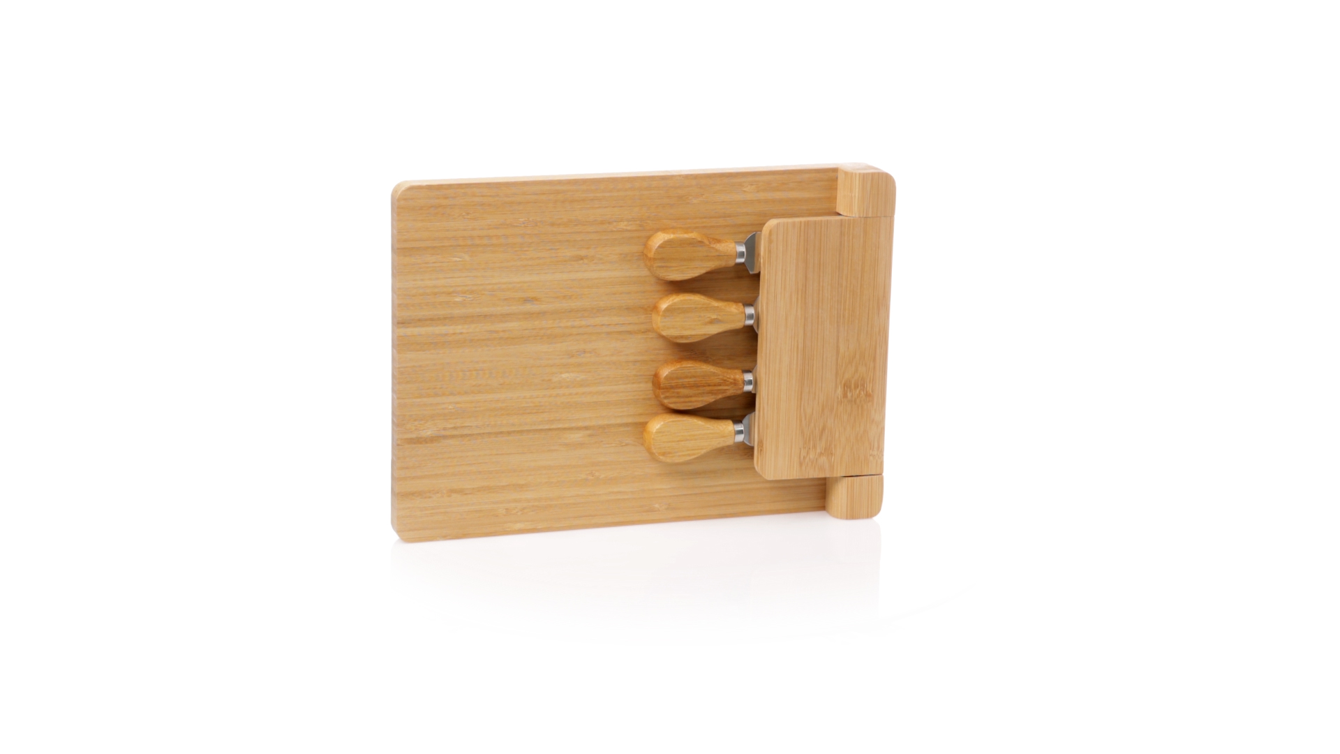 Originelles Käseset, mit magnetischem und klappbarem Zubehörhalter. Schneide- und Präsentationsbrett aus Bambus im rechteckigen Format. Zubehör aus rostfreiem Stahl mit Bambusgriff. Präsentiert in einer individuellen Kraft-Design-Box.