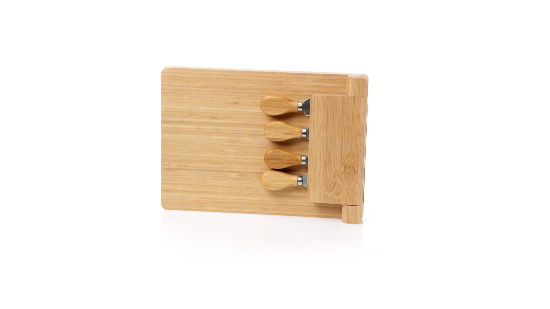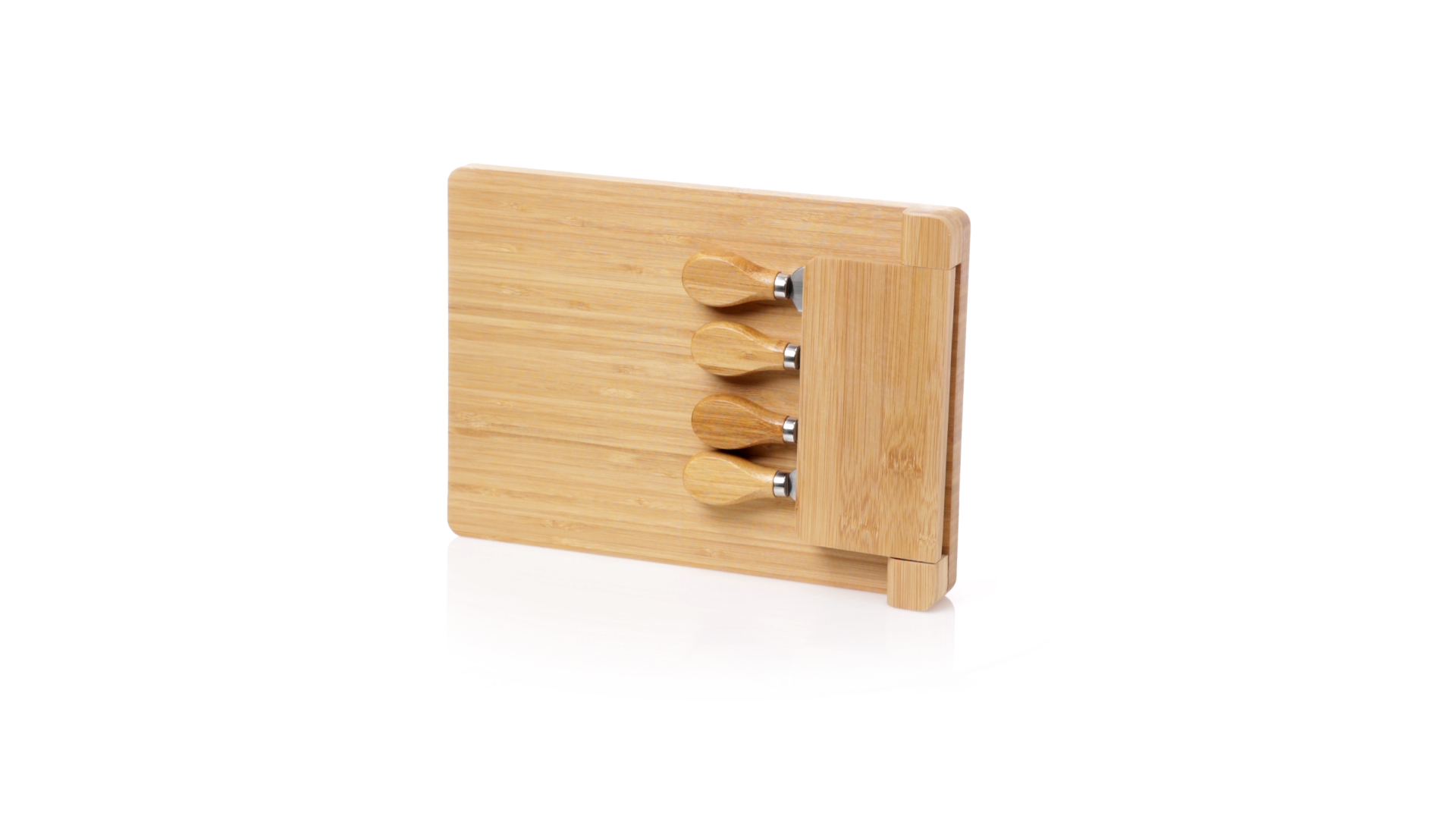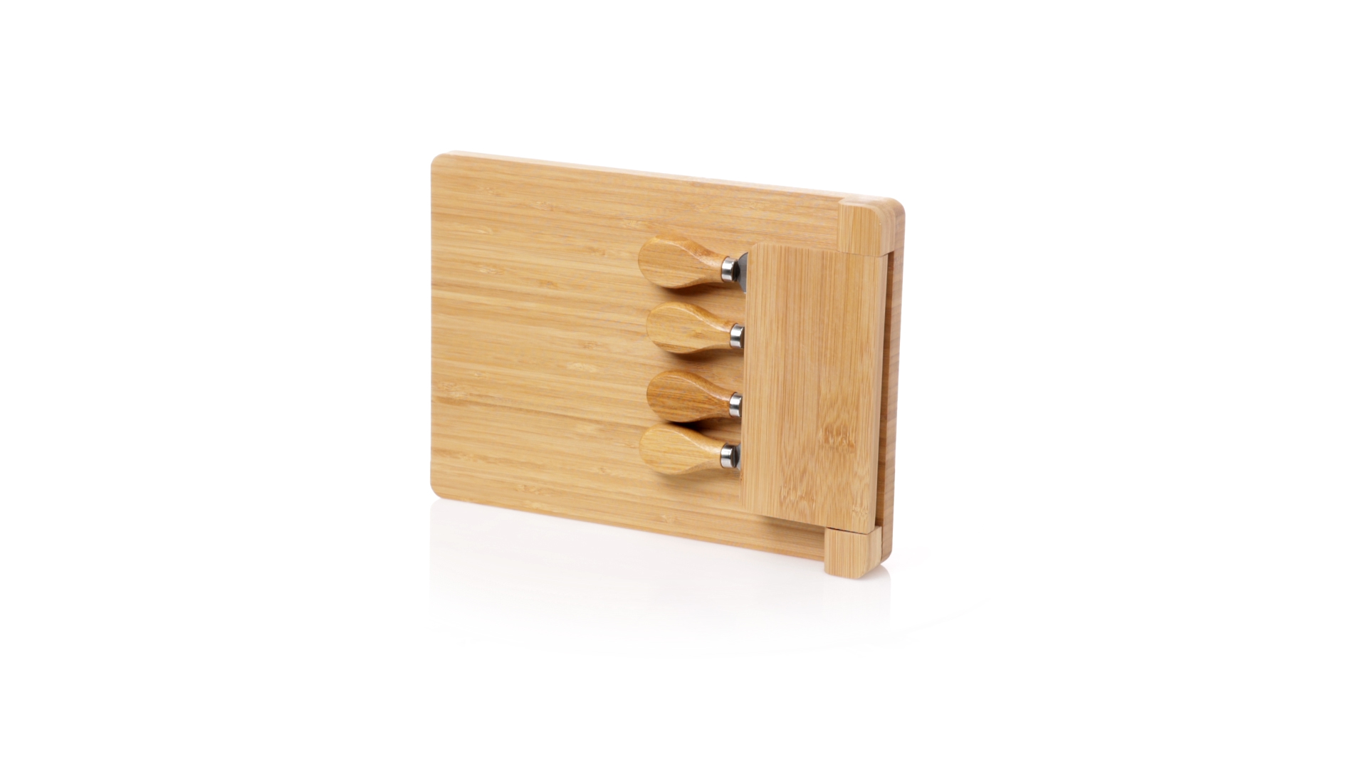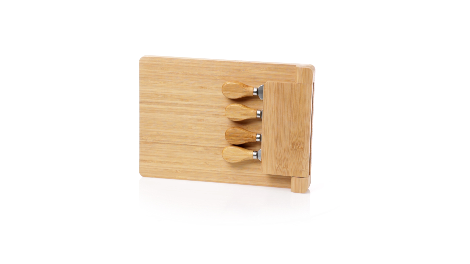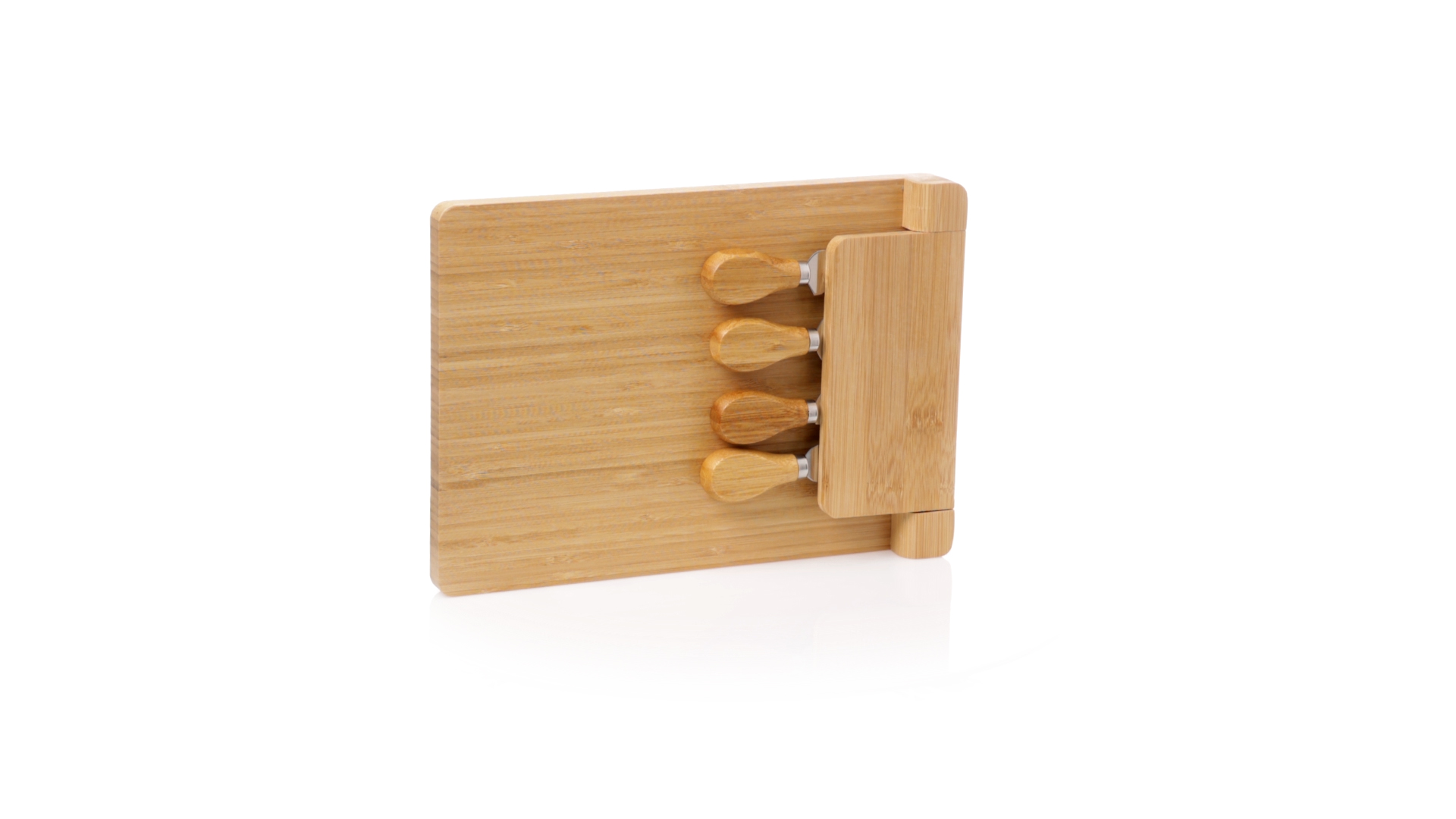 Originelles Käseset, mit magnetischem und klappbarem Zubehörhalter. Schneide- und Präsentationsbrett aus Bambus im rechteckigen Format. Zubehör aus rostfreiem Stahl mit Bambusgriff. Präsentiert in einer individuellen Kraft-Design-Box.
