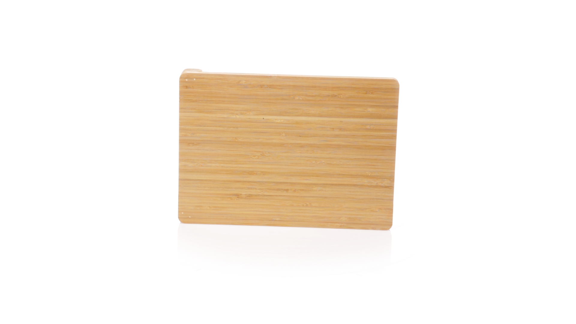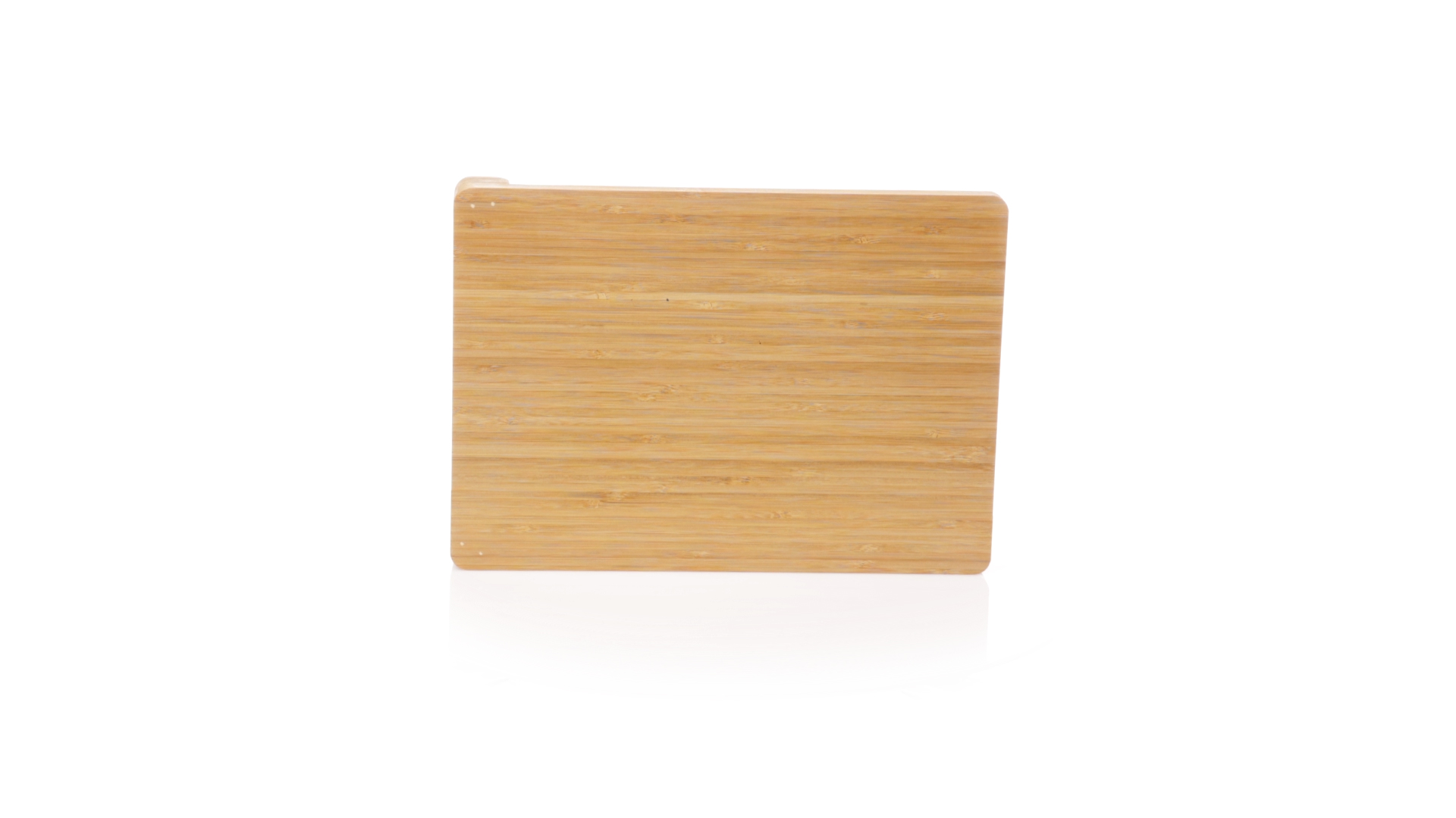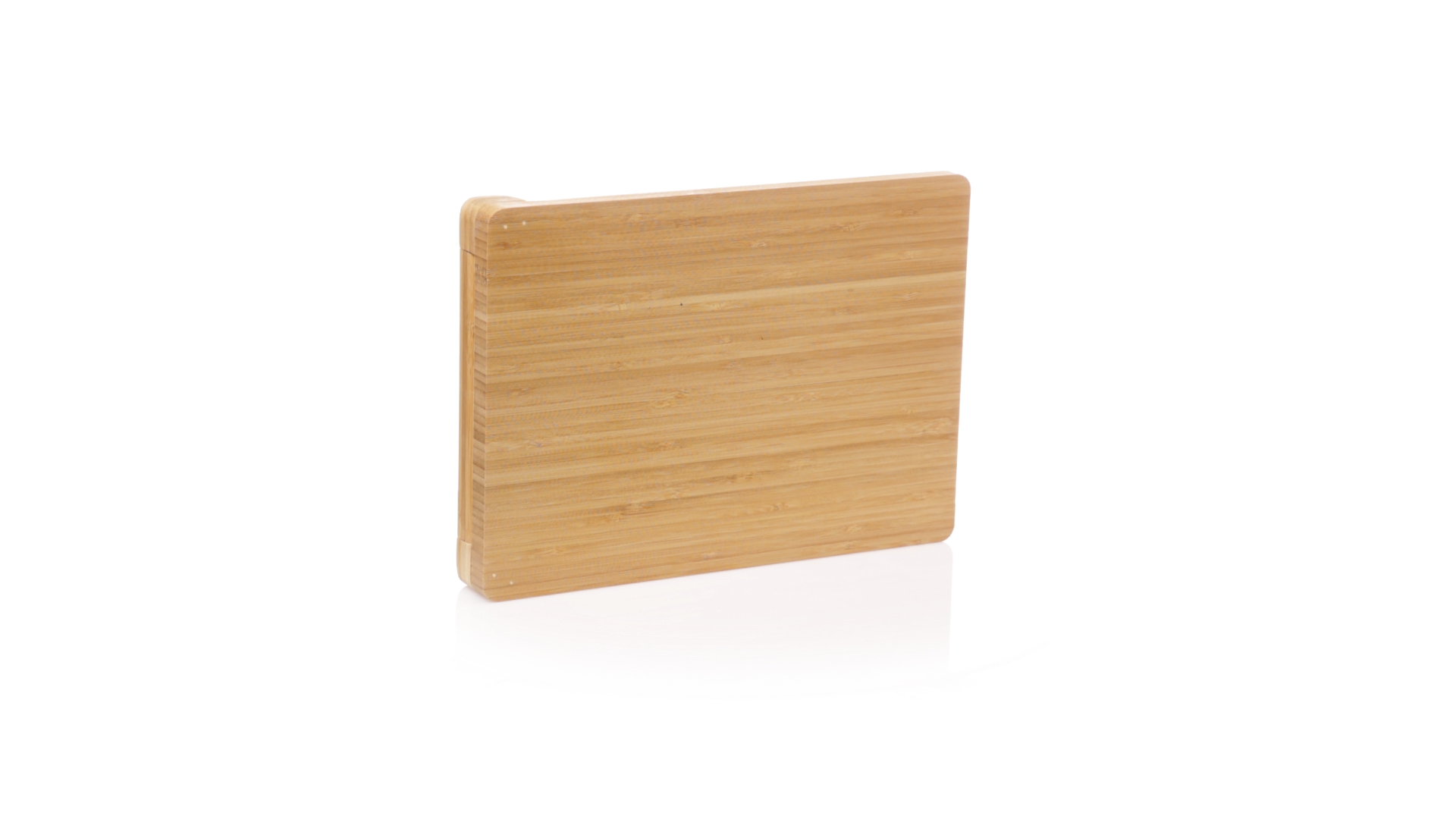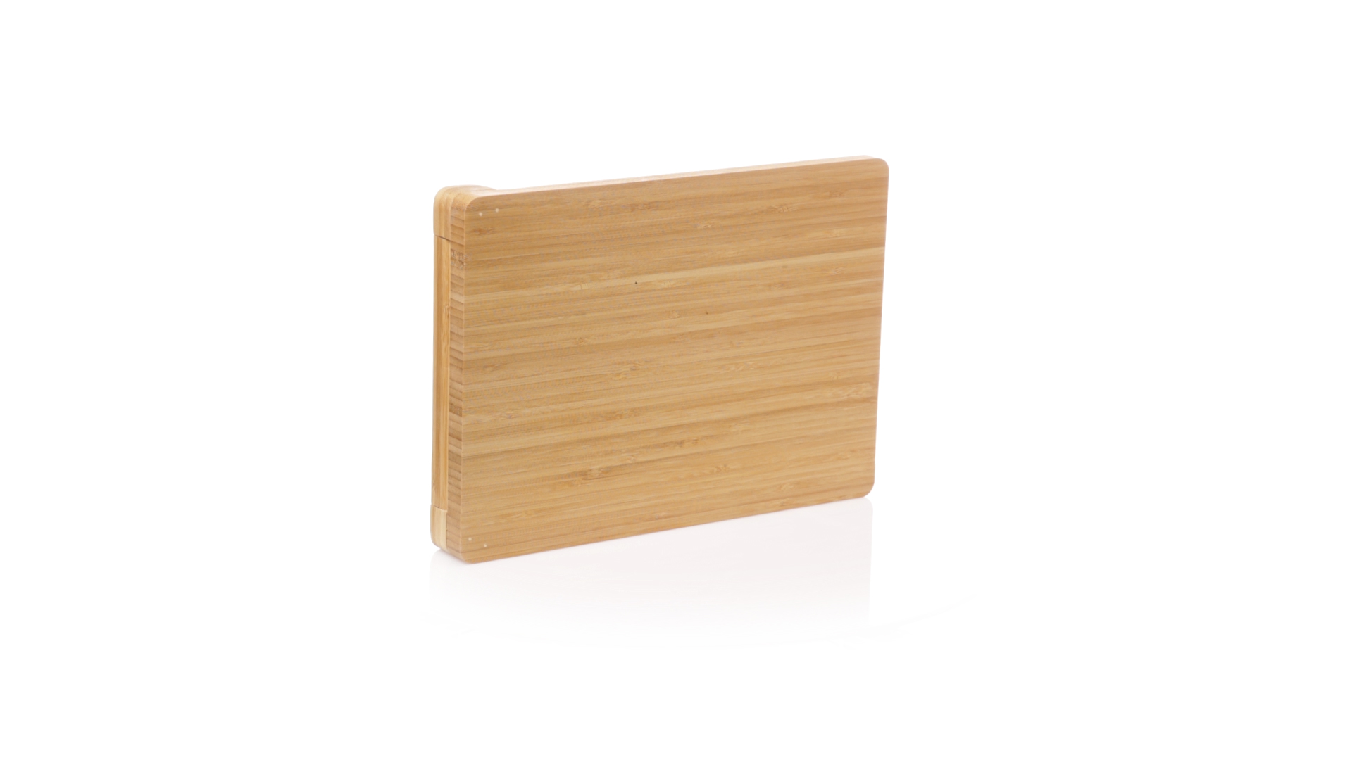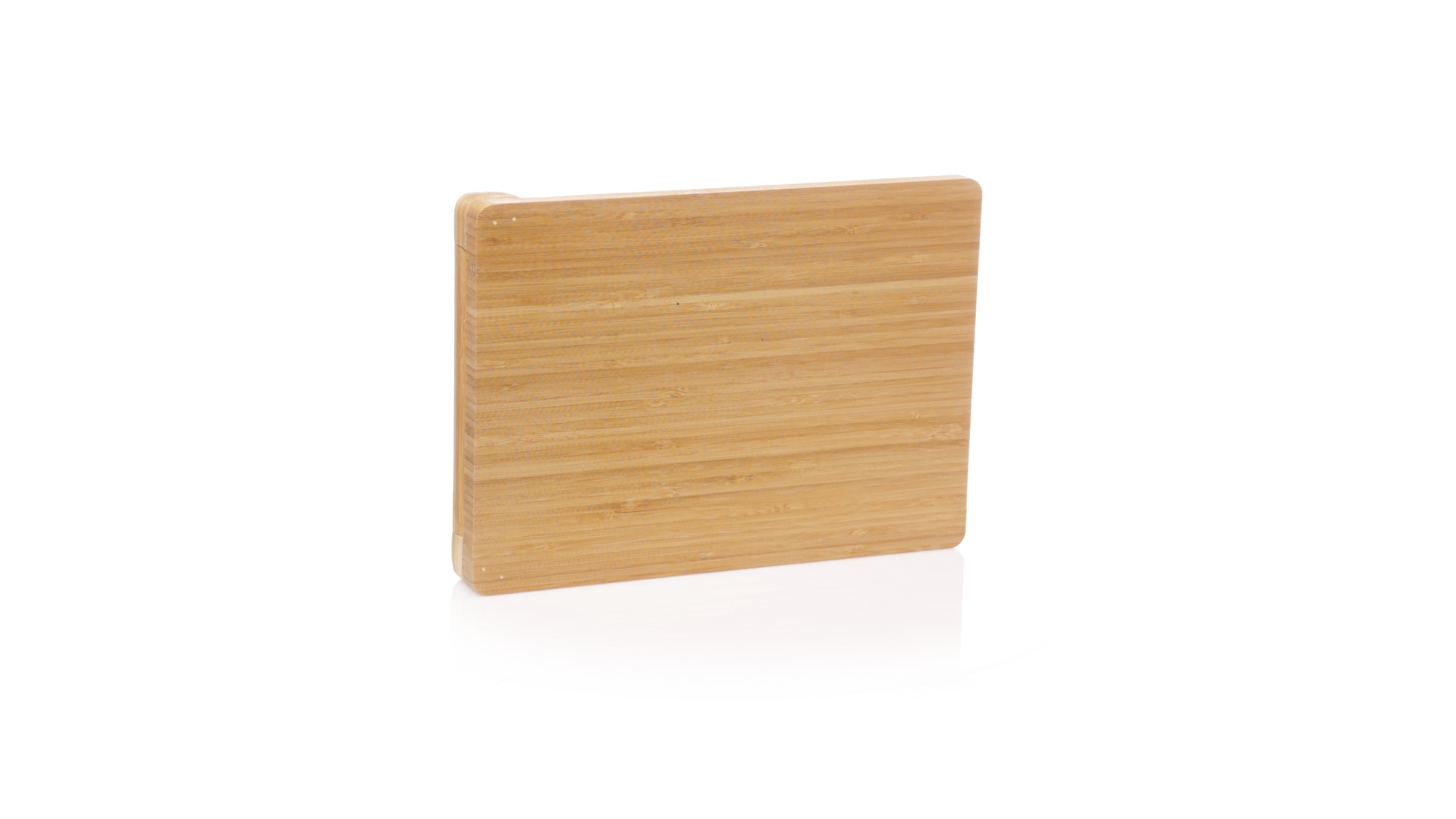 Originelles Käseset, mit magnetischem und klappbarem Zubehörhalter. Schneide- und Präsentationsbrett aus Bambus im rechteckigen Format. Zubehör aus rostfreiem Stahl mit Bambusgriff. Präsentiert in einer individuellen Kraft-Design-Box.