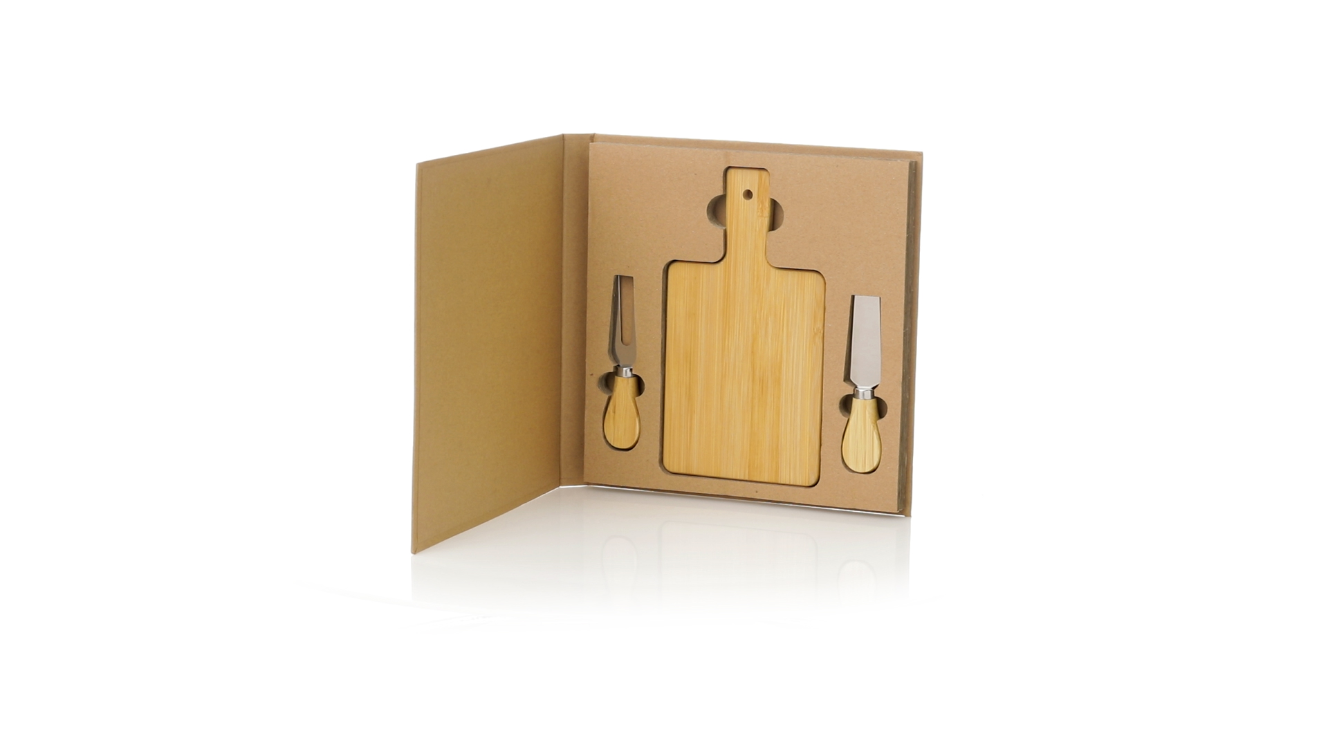 Komplettes Käseset der Linie Natur aus Bambus und Edelstahl. Inklusive Schneide- und Servierbrett mit Griff und Aufhängeloch, Gabel und Messer. Präsentiert in einem individuell gestanzten Etui aus recyceltem Karton mit Kraftlackierung.