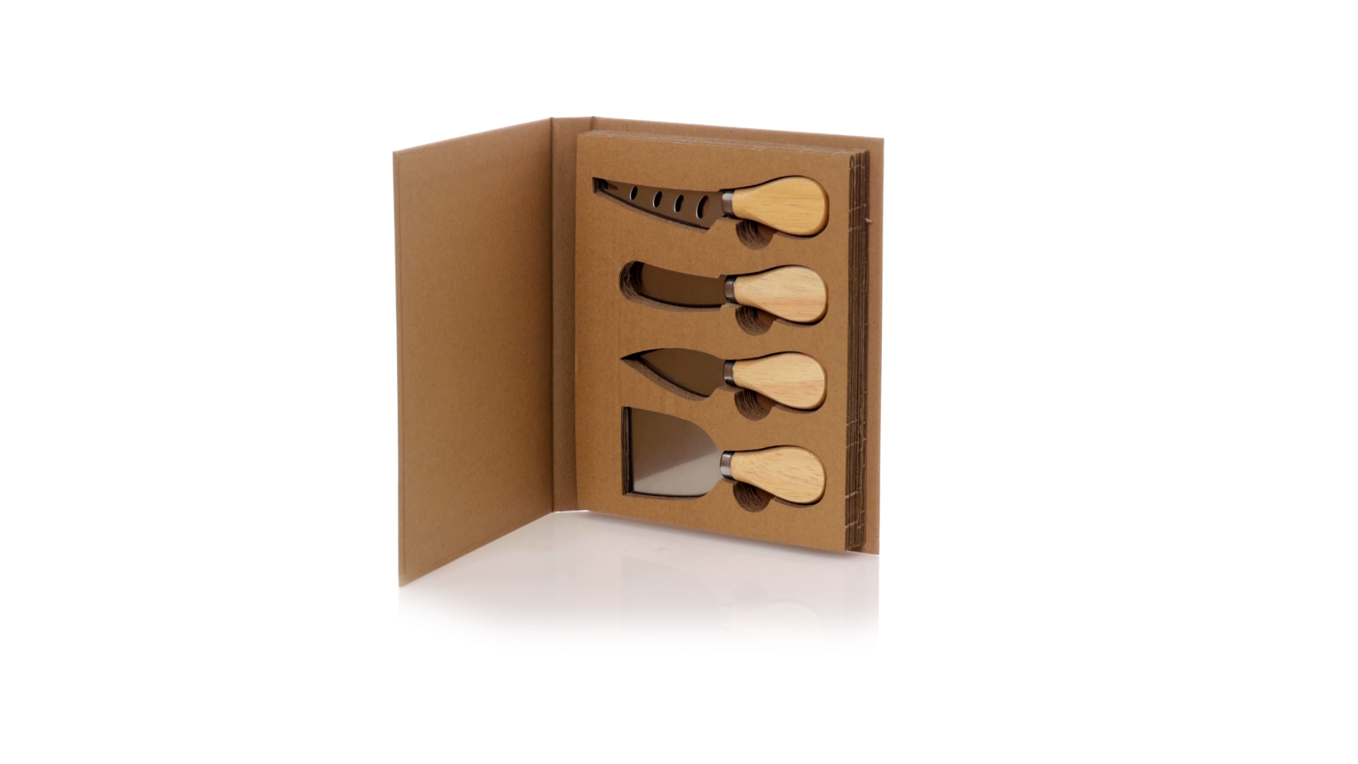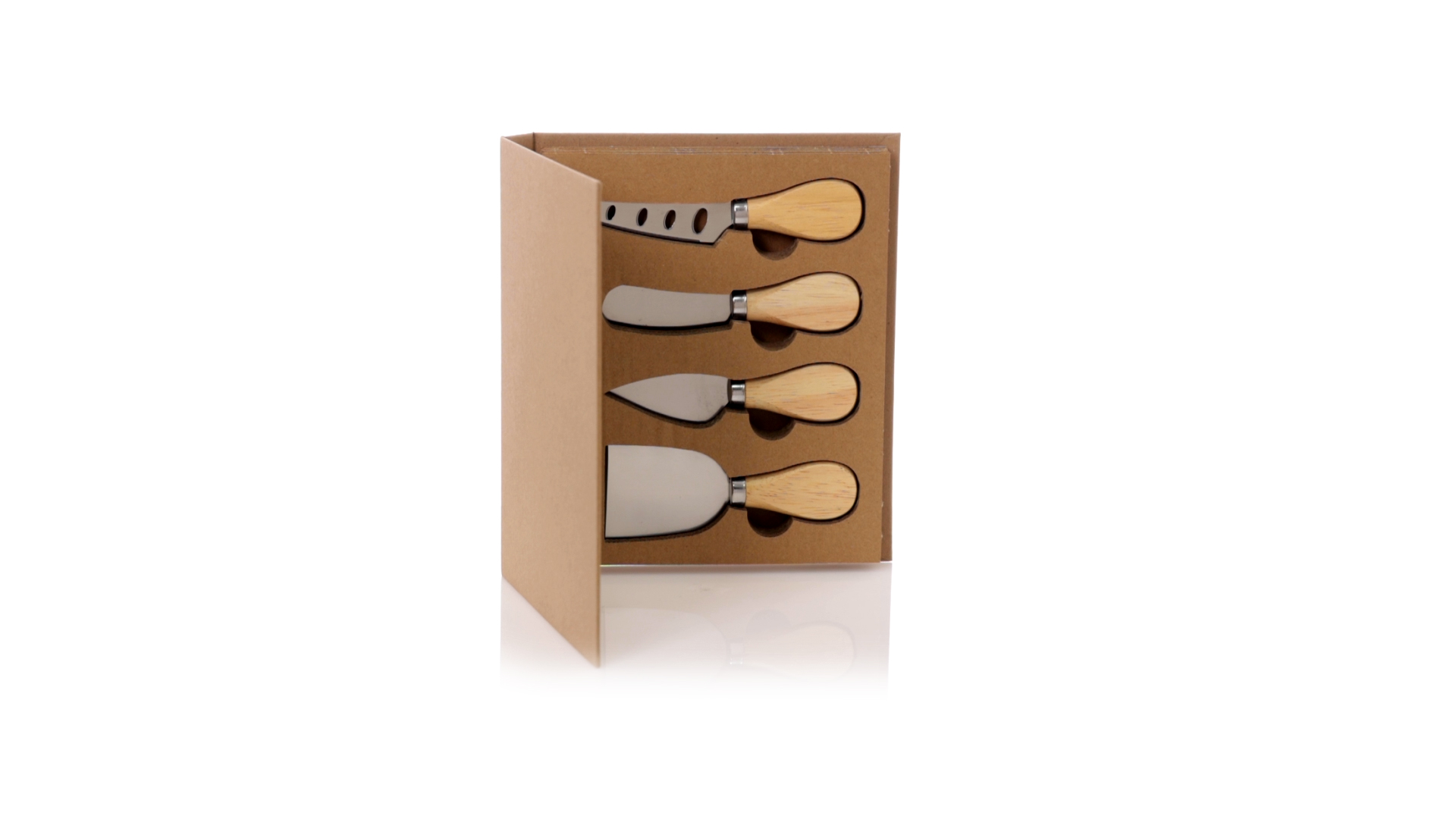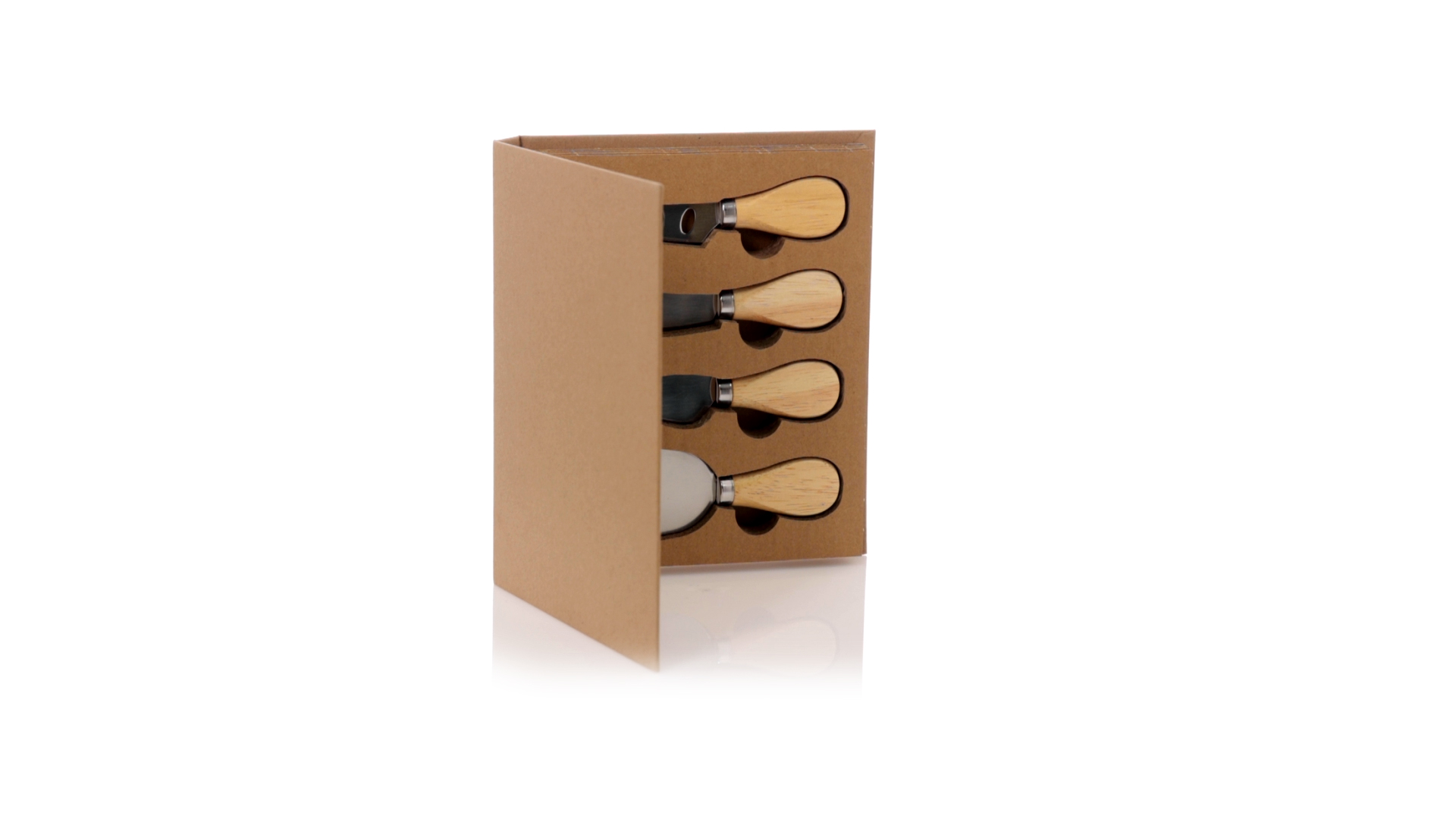 Käseset aus Holz. Utensilien aus Edelstahl und Holzgriff, in vier verschiedenen Ausführungen: für Hartkäse, Weichkäse, Schnittkäse und Käsestücke. Präsentiert in einer Originalschachtel aus recyceltem Karton mit einer Ausstanzung für jedes Zubehörteil.