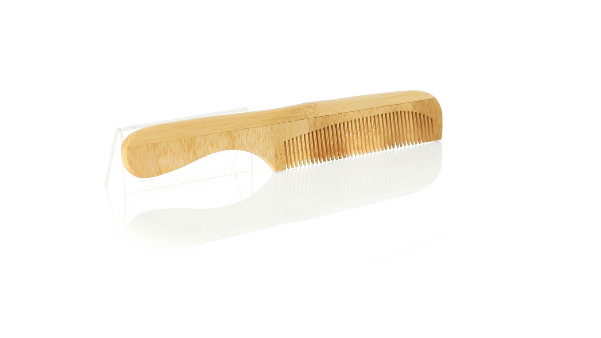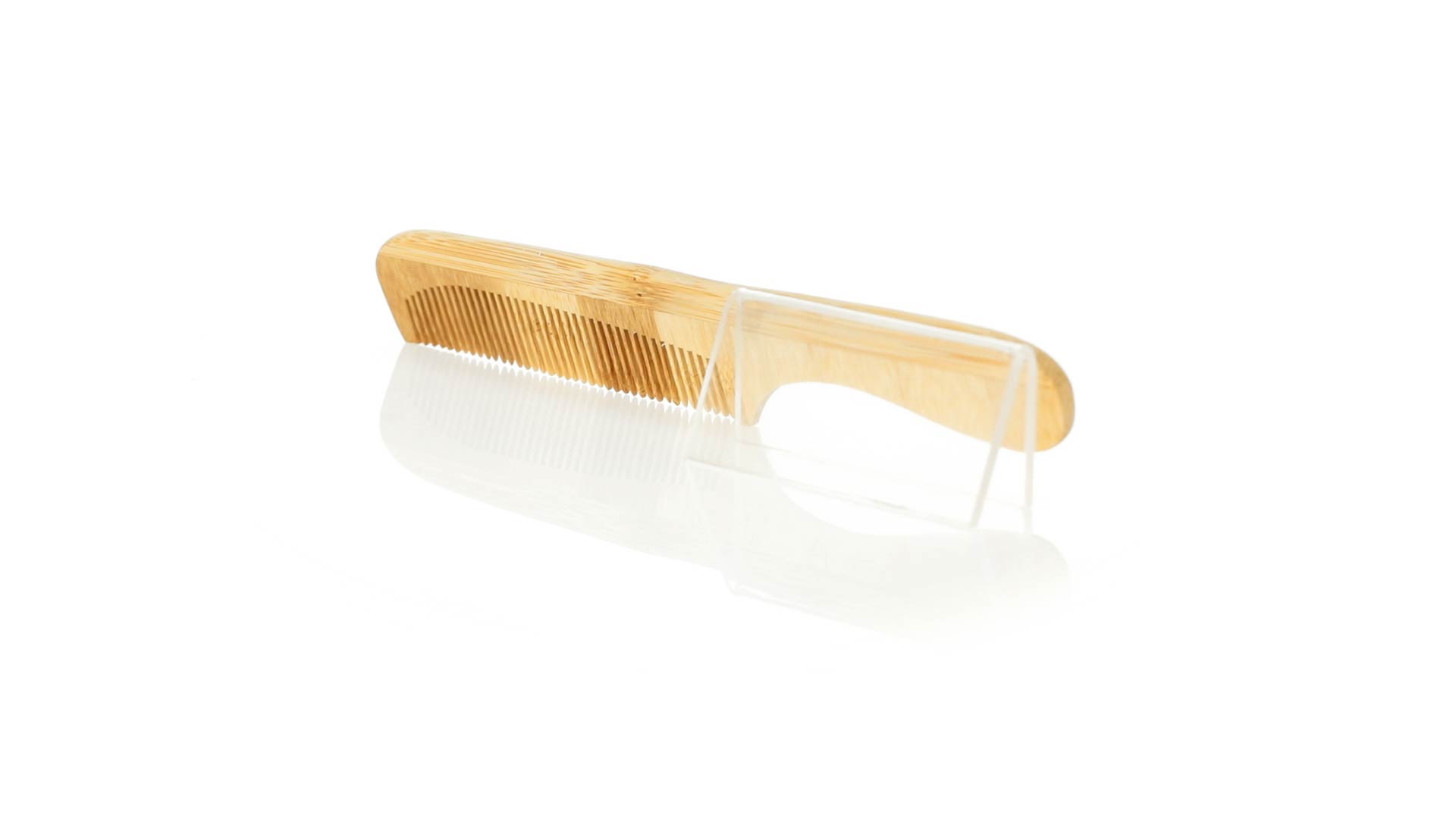 Kamm aus unserer Naturlinie aus poliertem Bambus, mit breiter Druckfläche auf dem Griff.