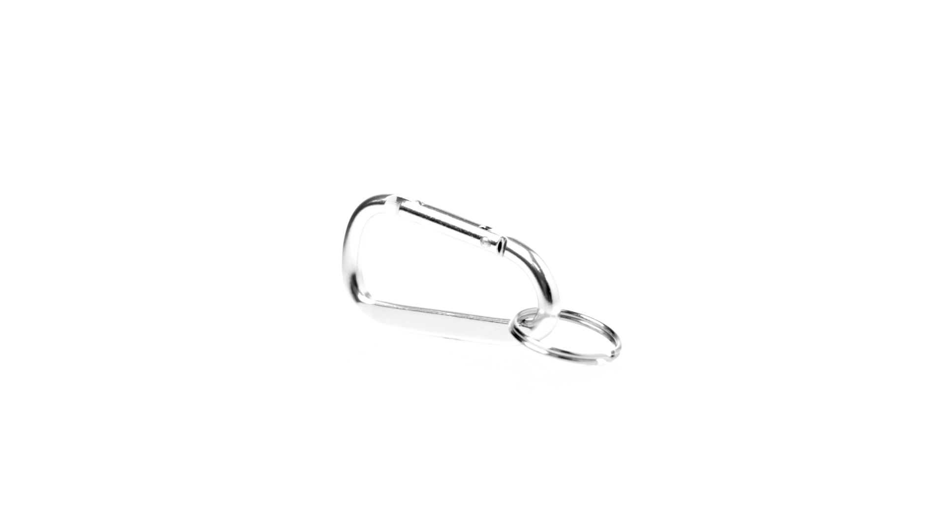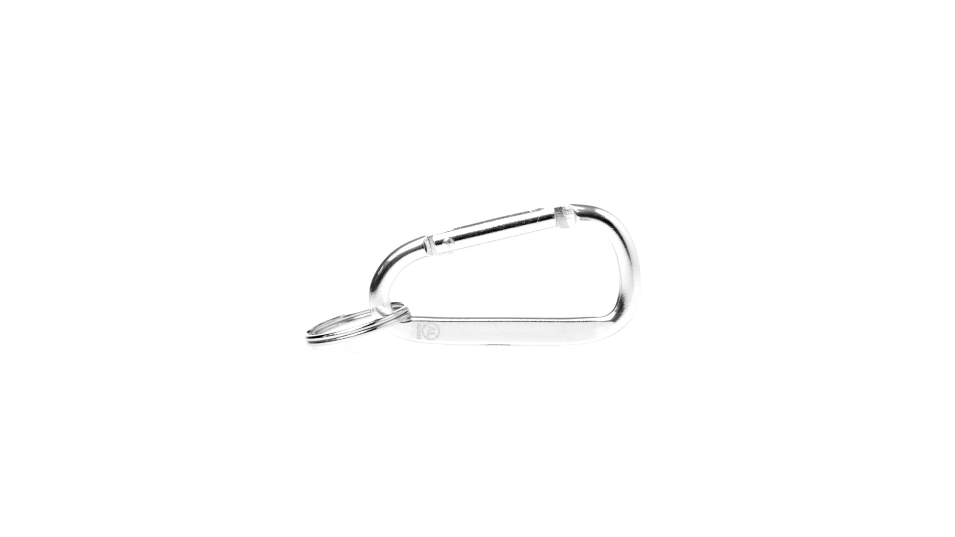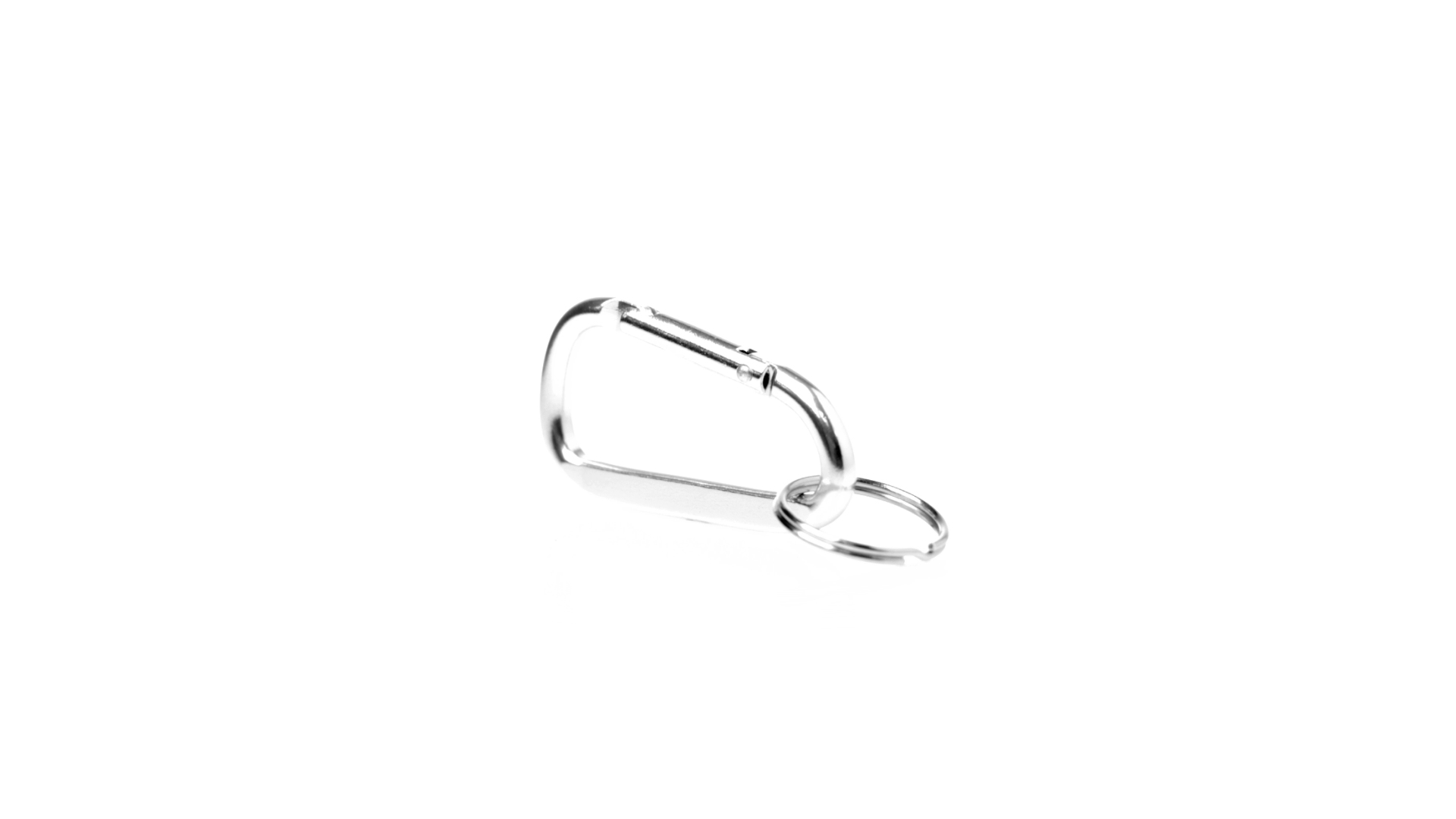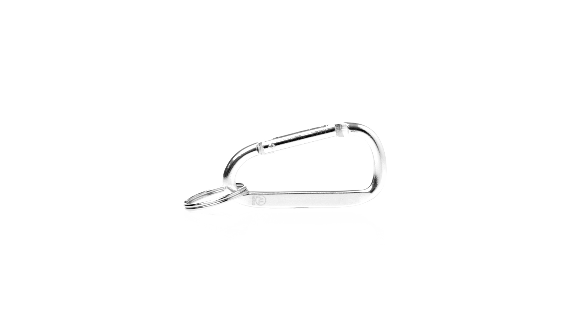 Recycelter Aluminiumkarabiner mit silberner Oberfläche. Mit passendem Schlüsselring aus Metall und Emblem für recyceltes Aluminium.Recyceltes Aluminium ist ein Material mit nahezu unendlichen Recyclingmöglichkeiten, das seine ursprünglichen Eigenschaften nicht verliert und dabei weniger Energie verbraucht.