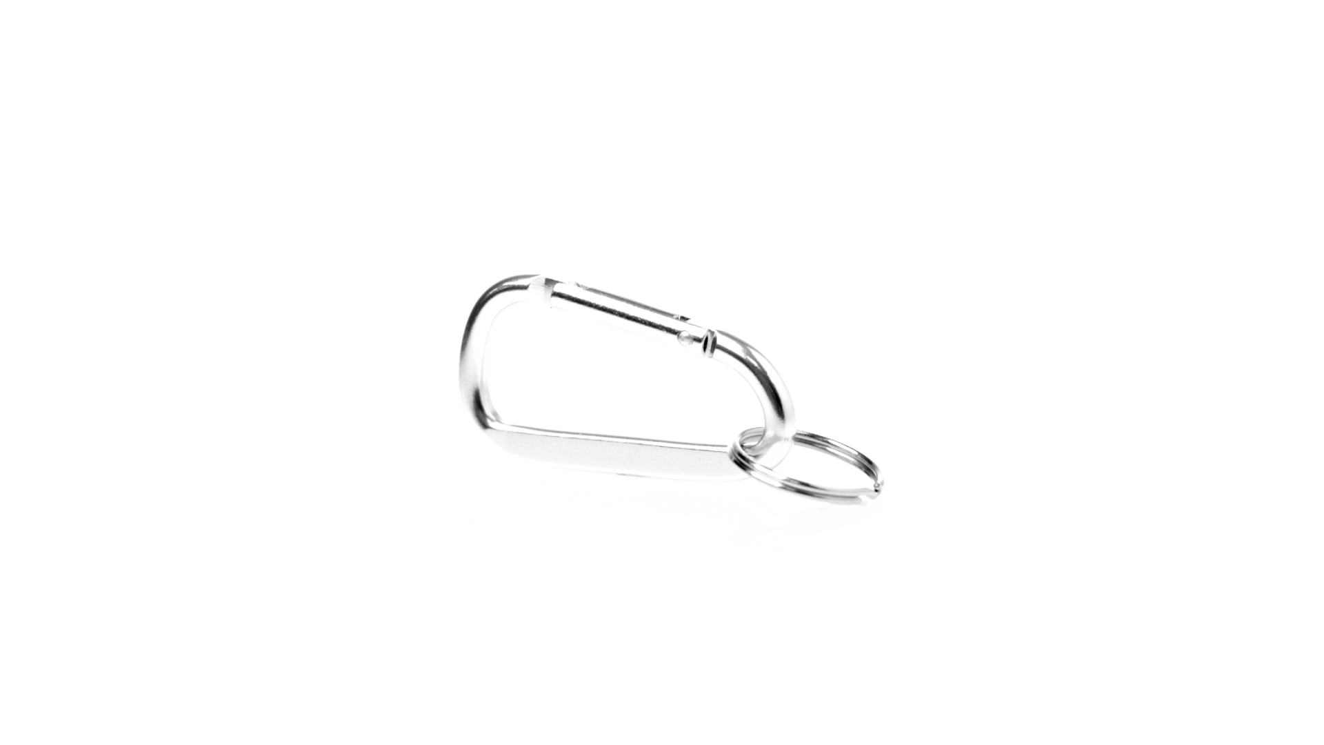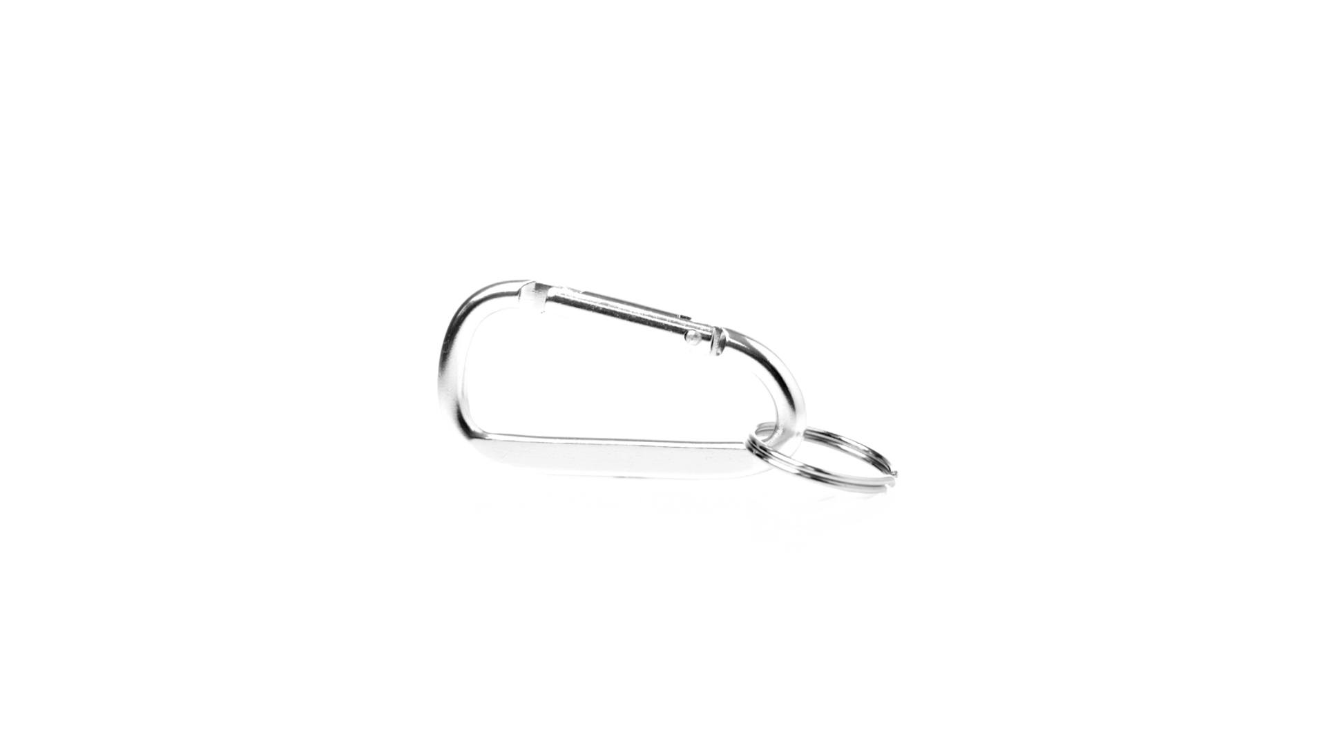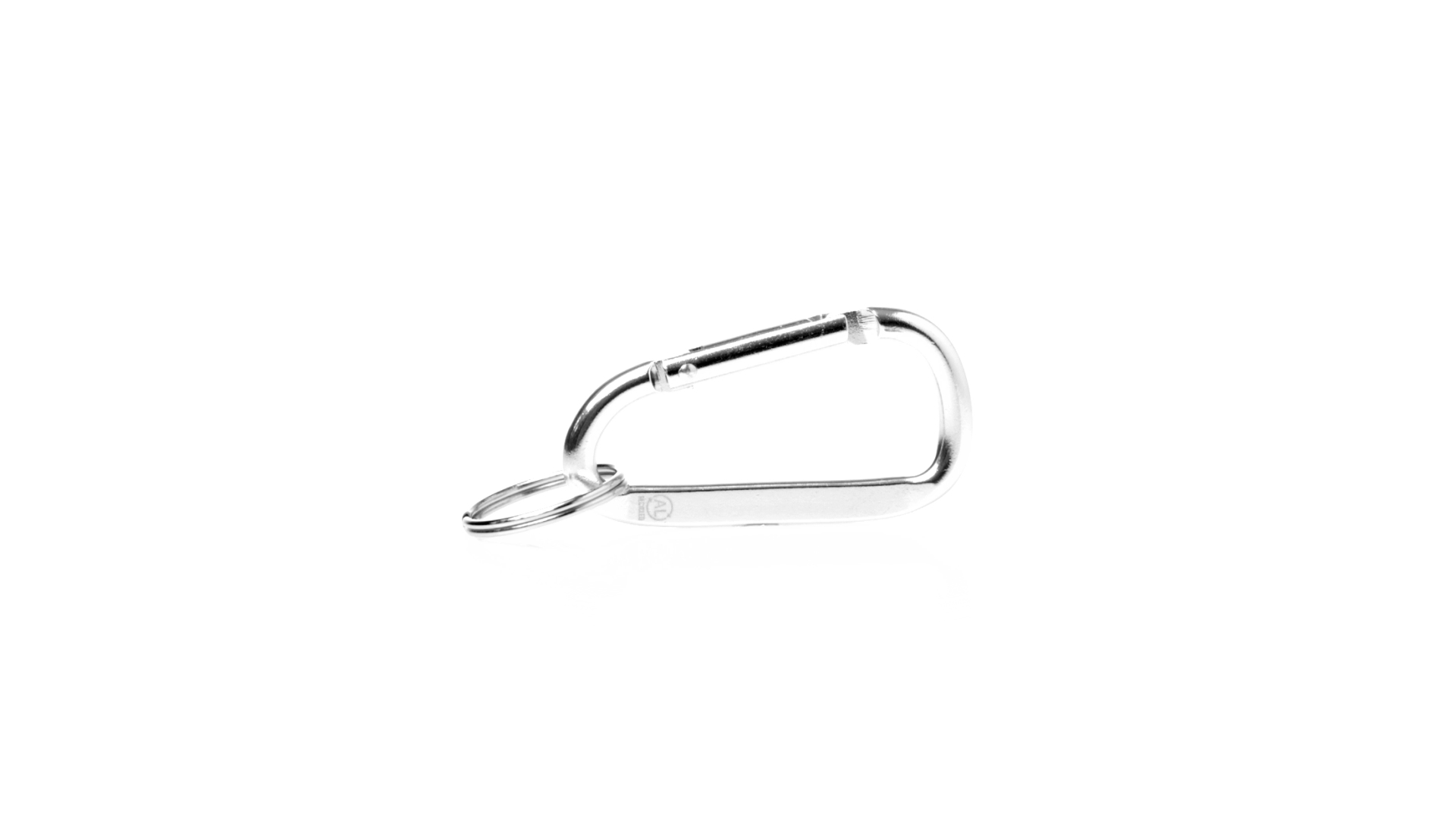 Recycelter Aluminiumkarabiner mit silberner Oberfläche. Mit passendem Schlüsselring aus Metall und Emblem für recyceltes Aluminium.Recyceltes Aluminium ist ein Material mit nahezu unendlichen Recyclingmöglichkeiten, das seine ursprünglichen Eigenschaften nicht verliert und dabei weniger Energie verbraucht.