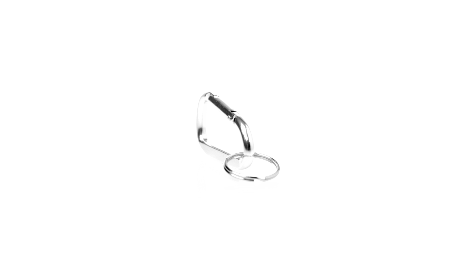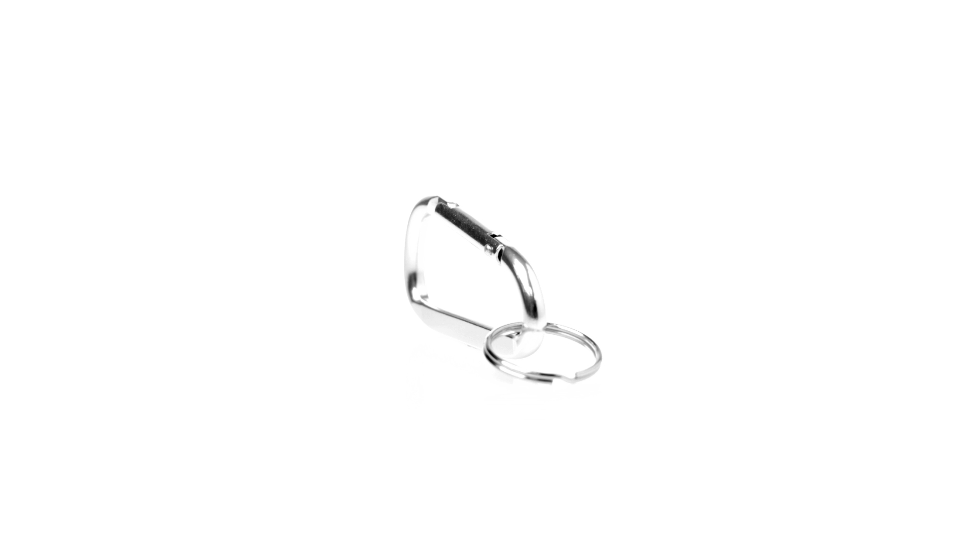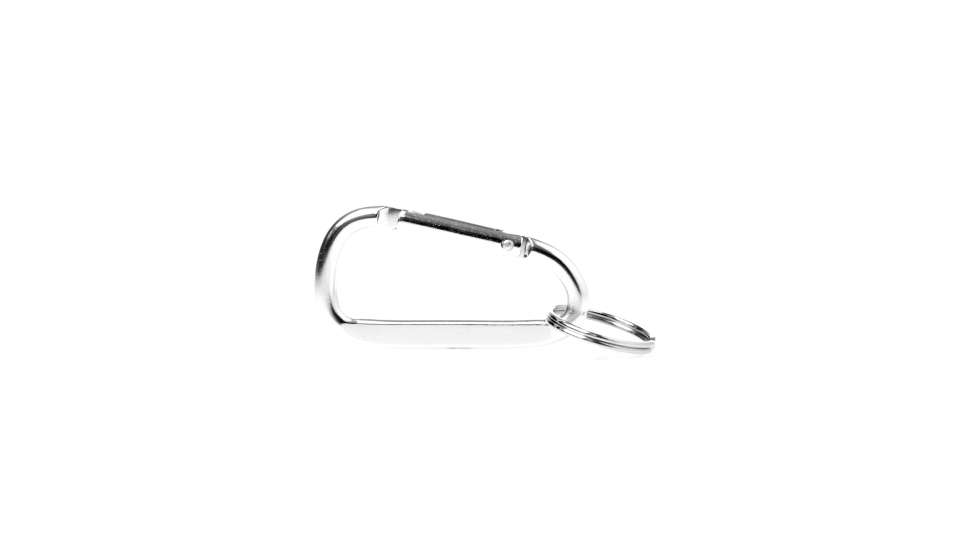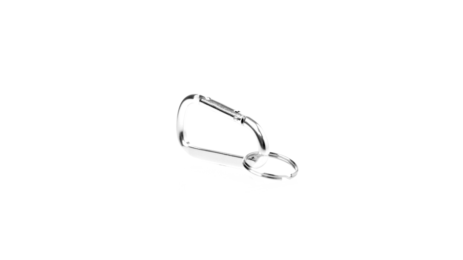 Recycelter Aluminiumkarabiner mit silberner Oberfläche. Mit passendem Schlüsselring aus Metall und Emblem für recyceltes Aluminium.Recyceltes Aluminium ist ein Material mit nahezu unendlichen Recyclingmöglichkeiten, das seine ursprünglichen Eigenschaften nicht verliert und dabei weniger Energie verbraucht.