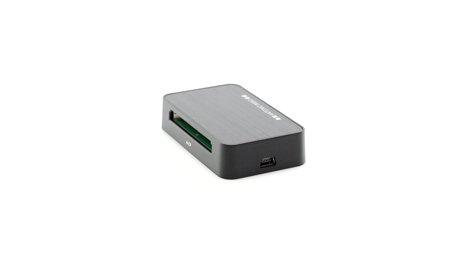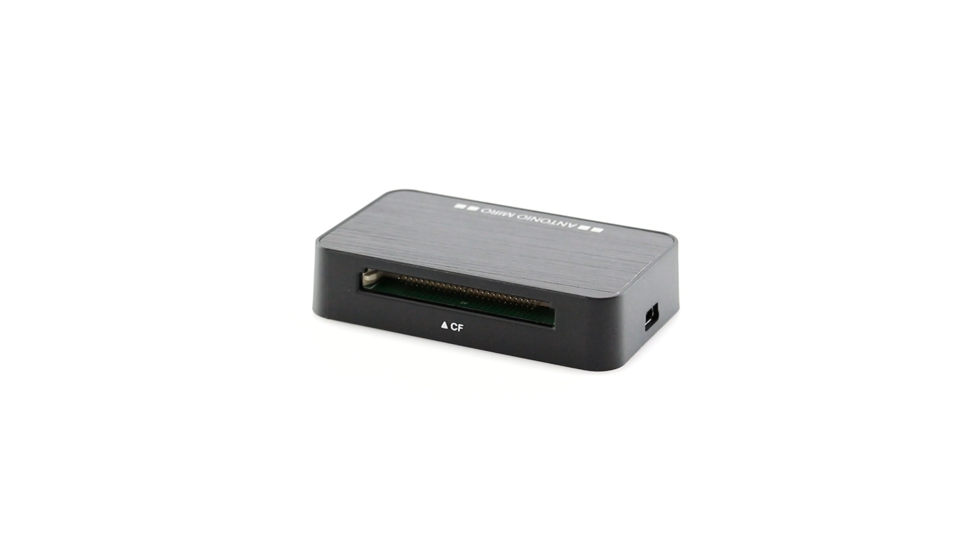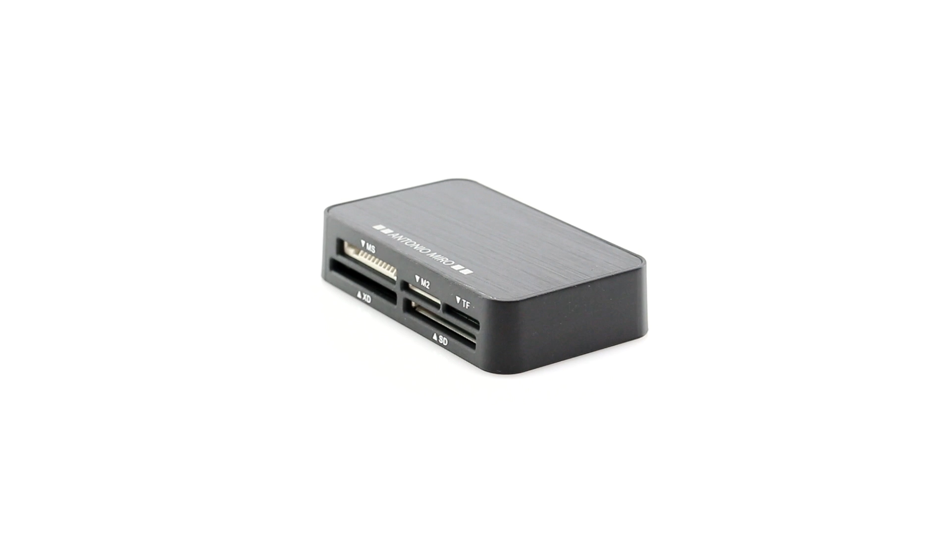 Kartenleser von Antonio Miró aus elegantem schwarzem Aluminium. Kompatibel mit MS-, M2-, TF-, XD-, SD- und CF-Karten. Präsentiert in einer individuellen Box mit dem Markenlogo und weichem, gestanztem Schaumstoff im Inneren.