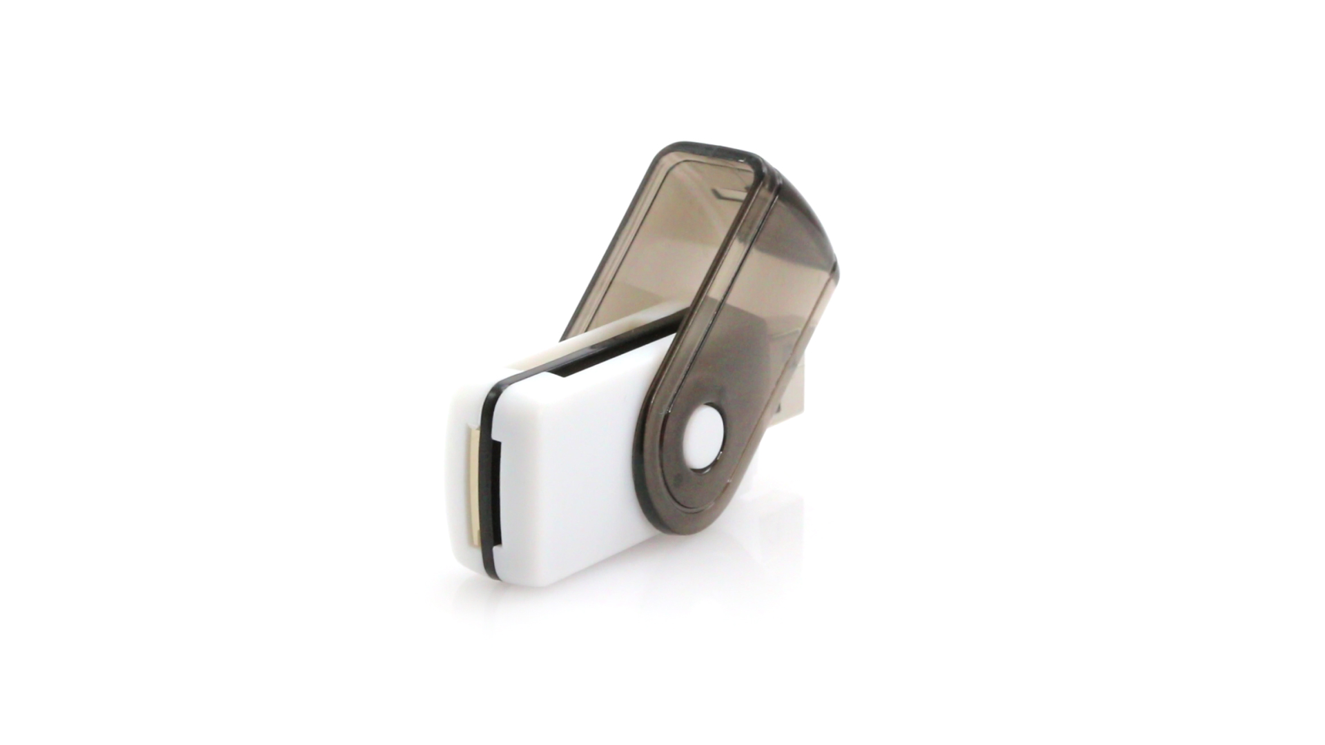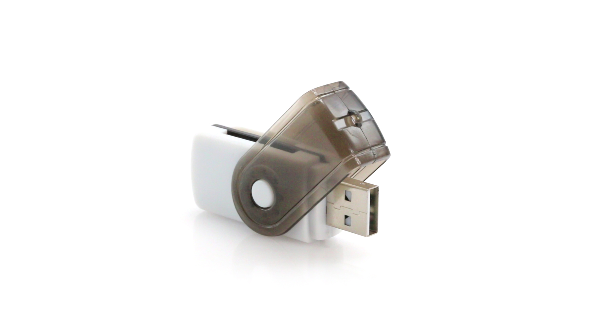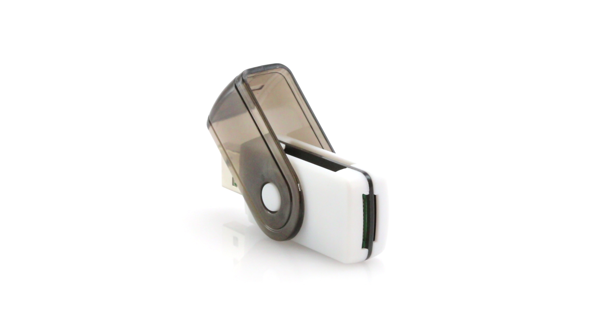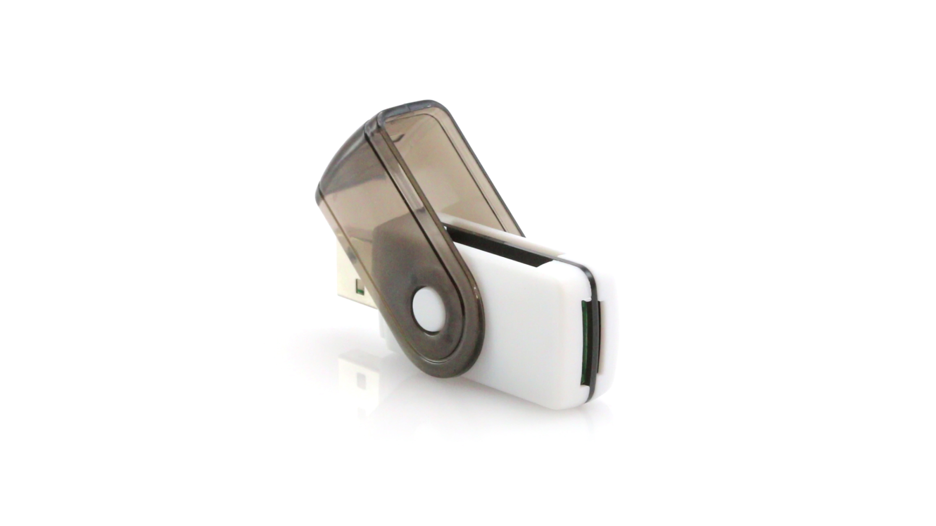 Origineller Kartenleser mit Drehöffnung, USB 2.0-Anschluss und fröhlichem zweifarbigem Design. Kompatibel mit M2, MS Duo, Micro SD und SD Karten. Präsentiert in einer individuellen Box.