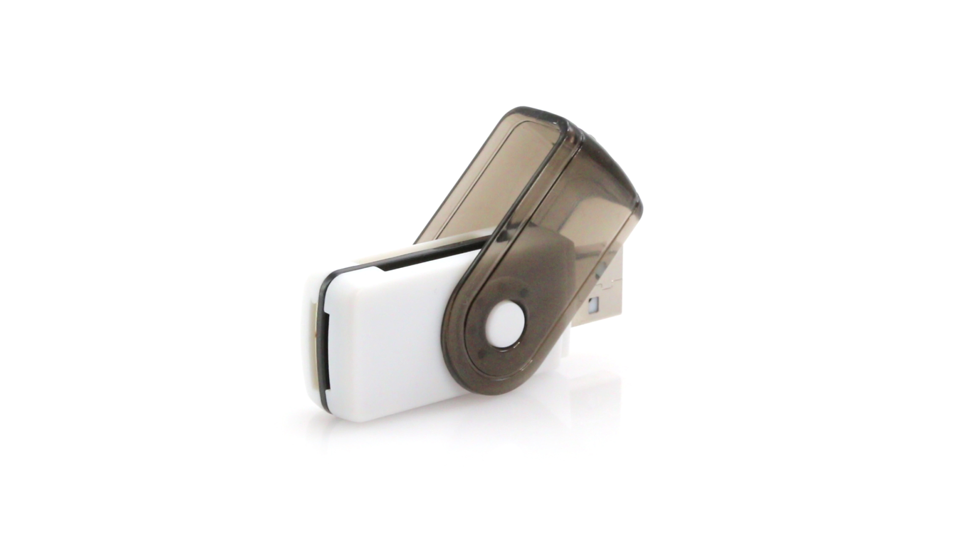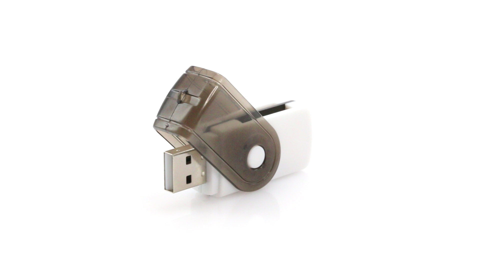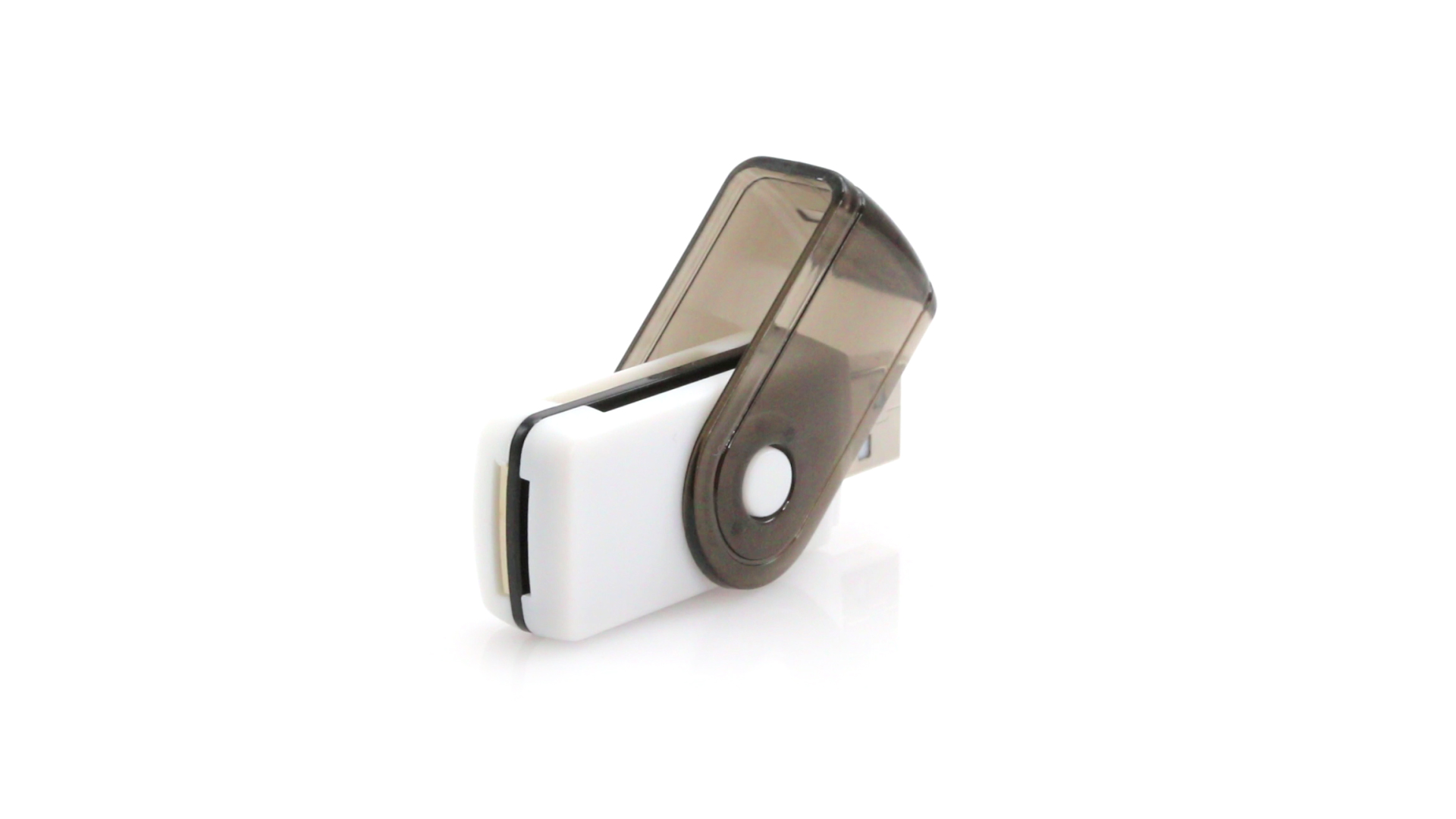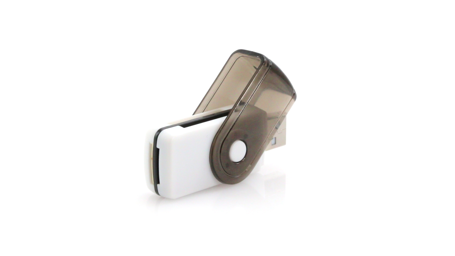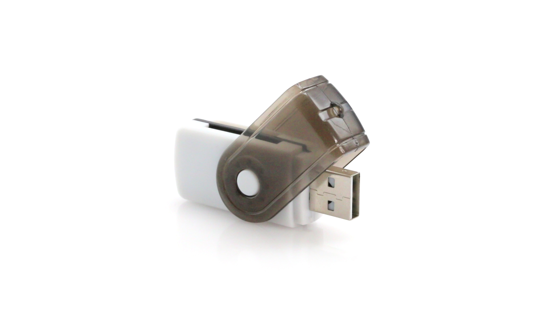 Origineller Kartenleser mit Drehöffnung, USB 2.0-Anschluss und fröhlichem zweifarbigem Design. Kompatibel mit M2, MS Duo, Micro SD und SD Karten. Präsentiert in einer individuellen Box.