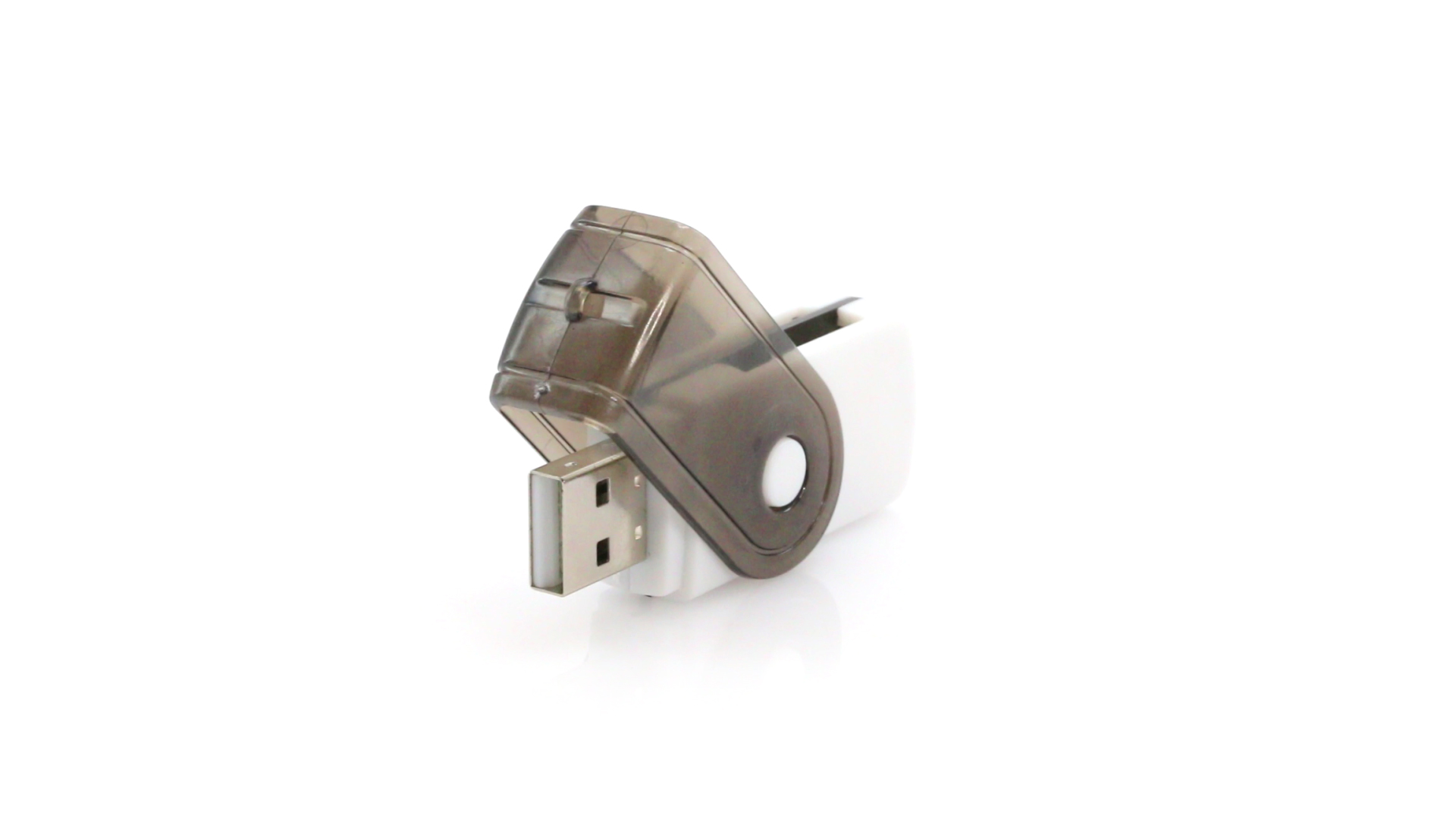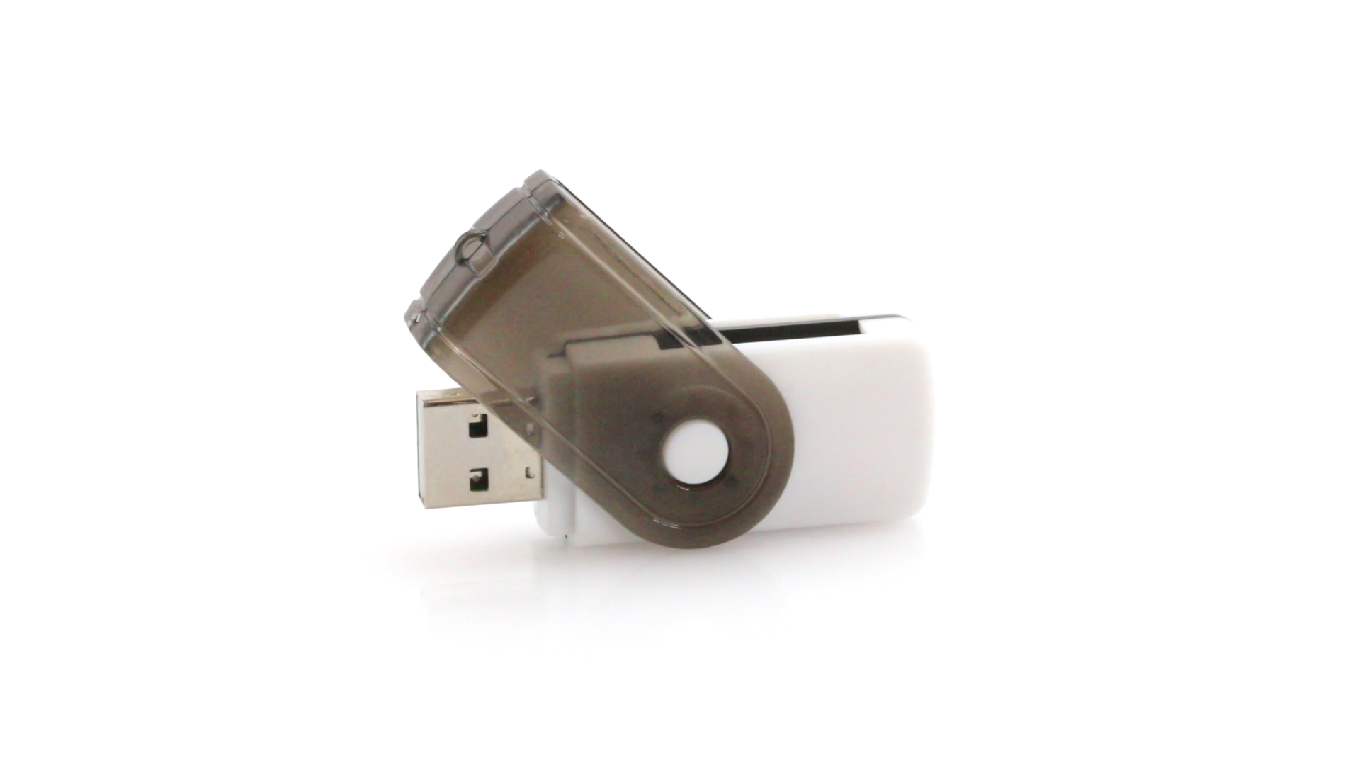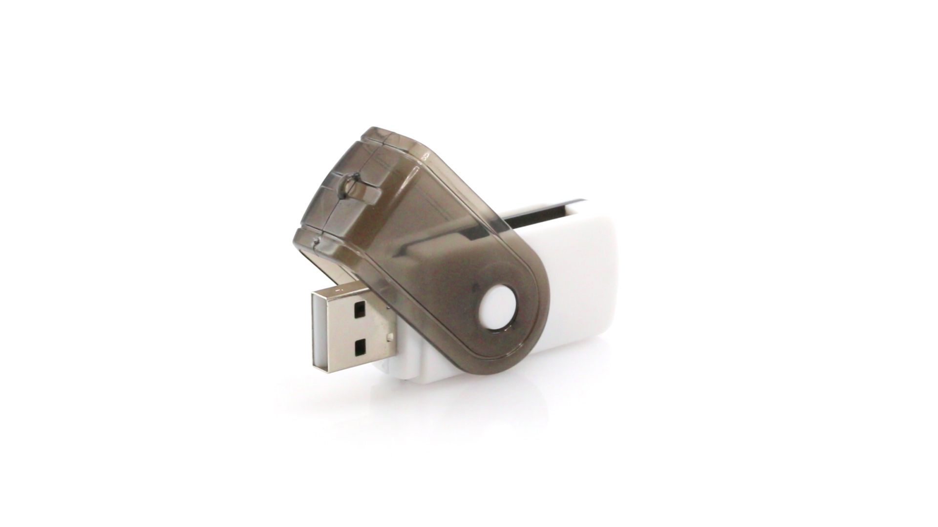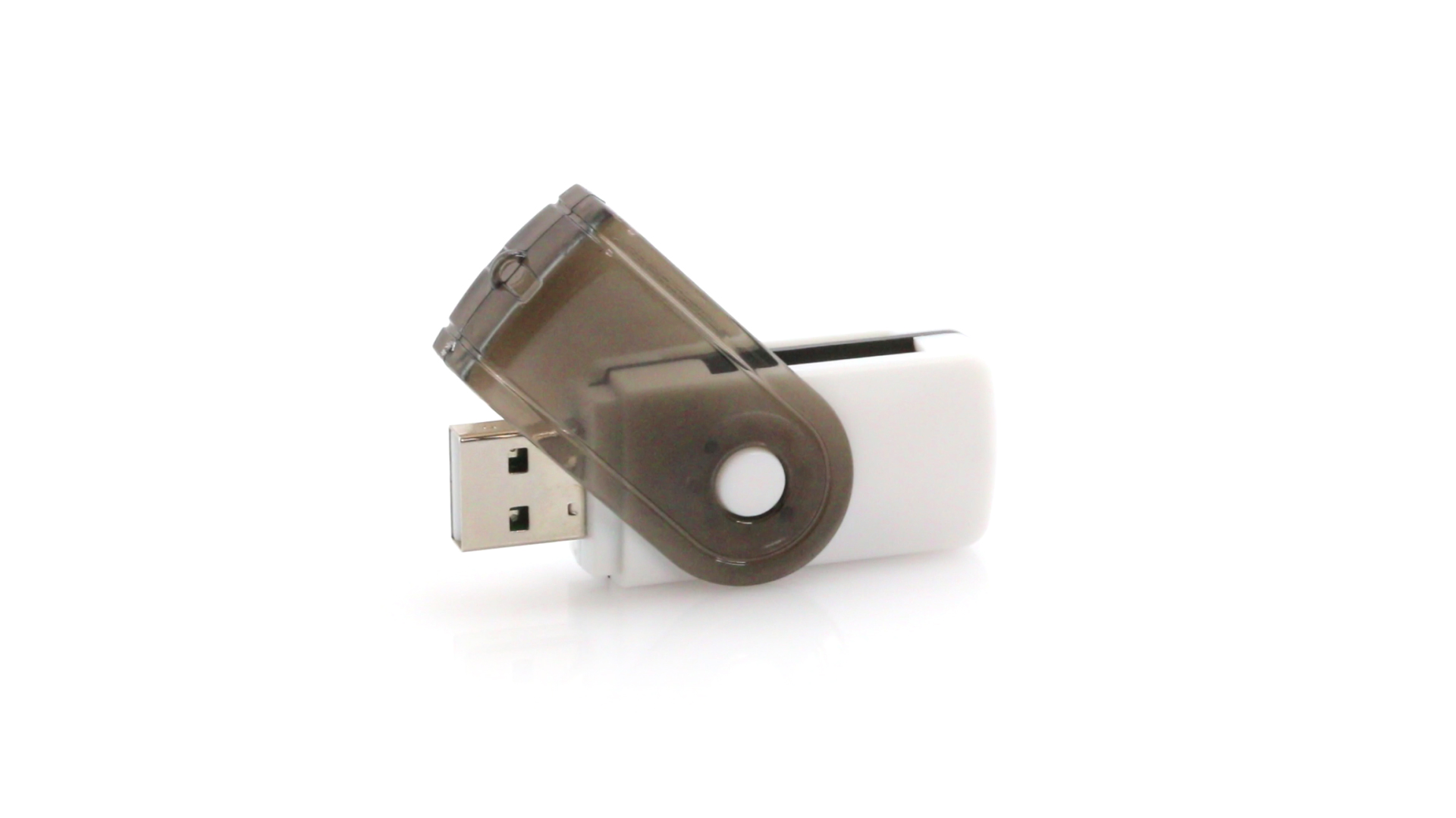 Origineller Kartenleser mit Drehöffnung, USB 2.0-Anschluss und fröhlichem zweifarbigem Design. Kompatibel mit M2, MS Duo, Micro SD und SD Karten. Präsentiert in einer individuellen Box.