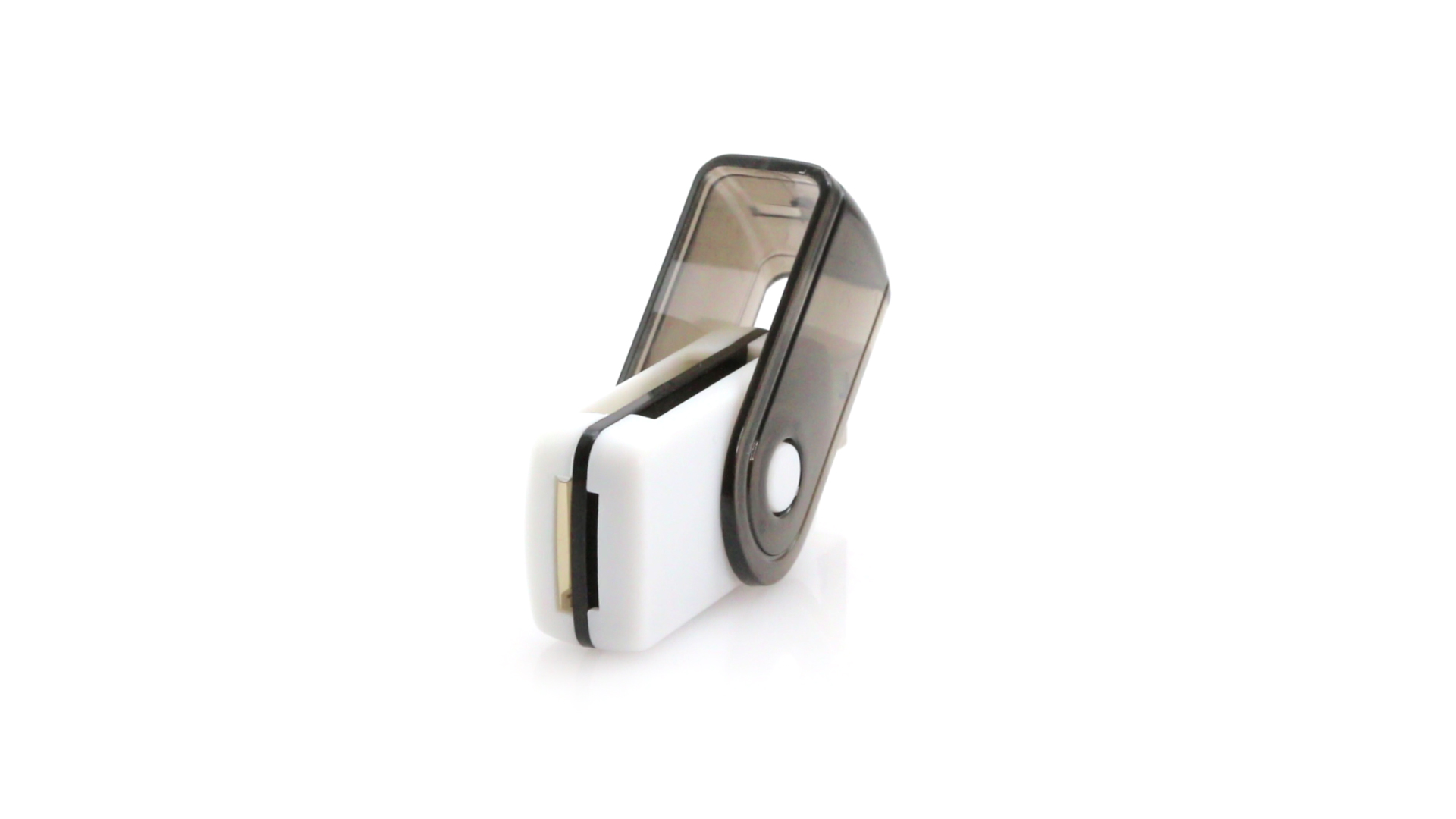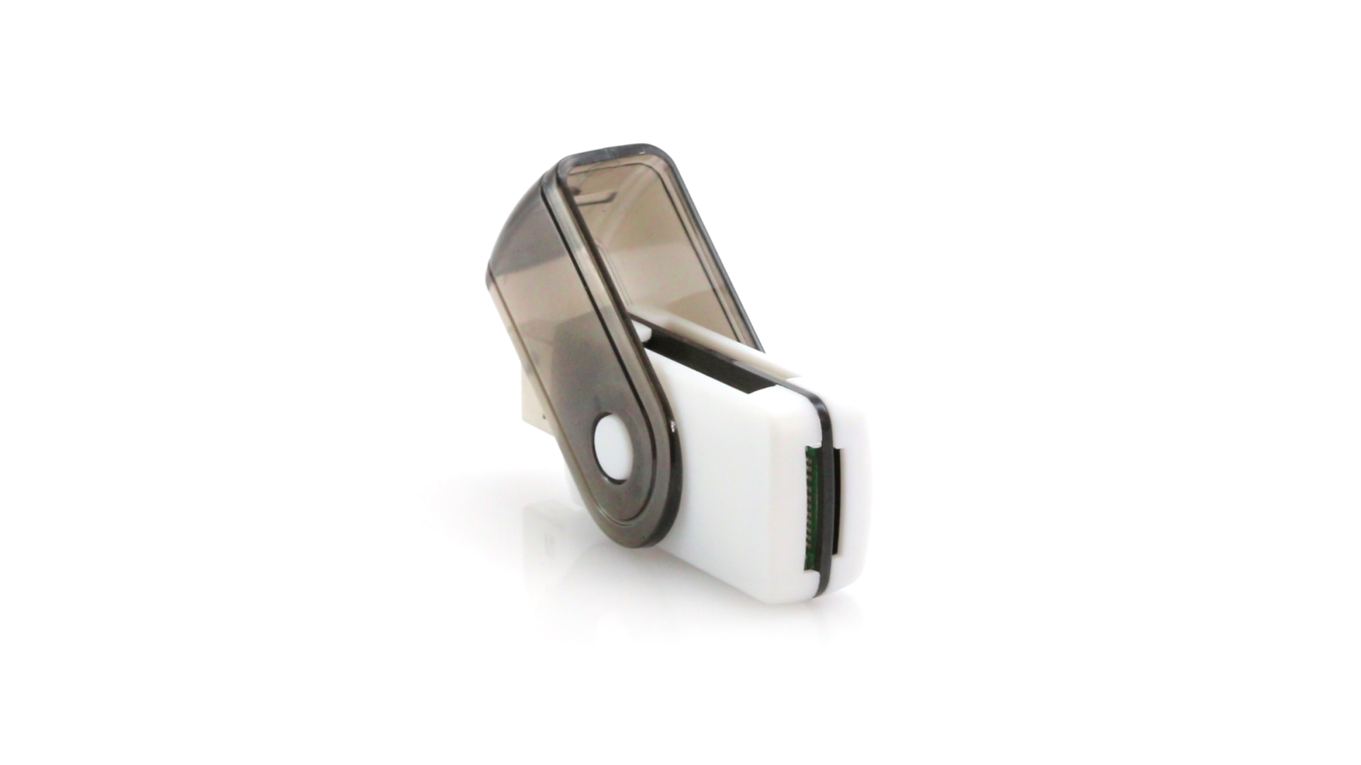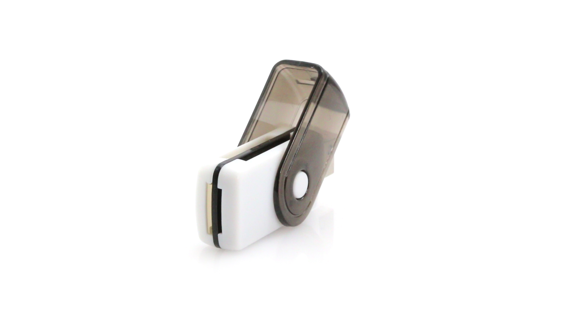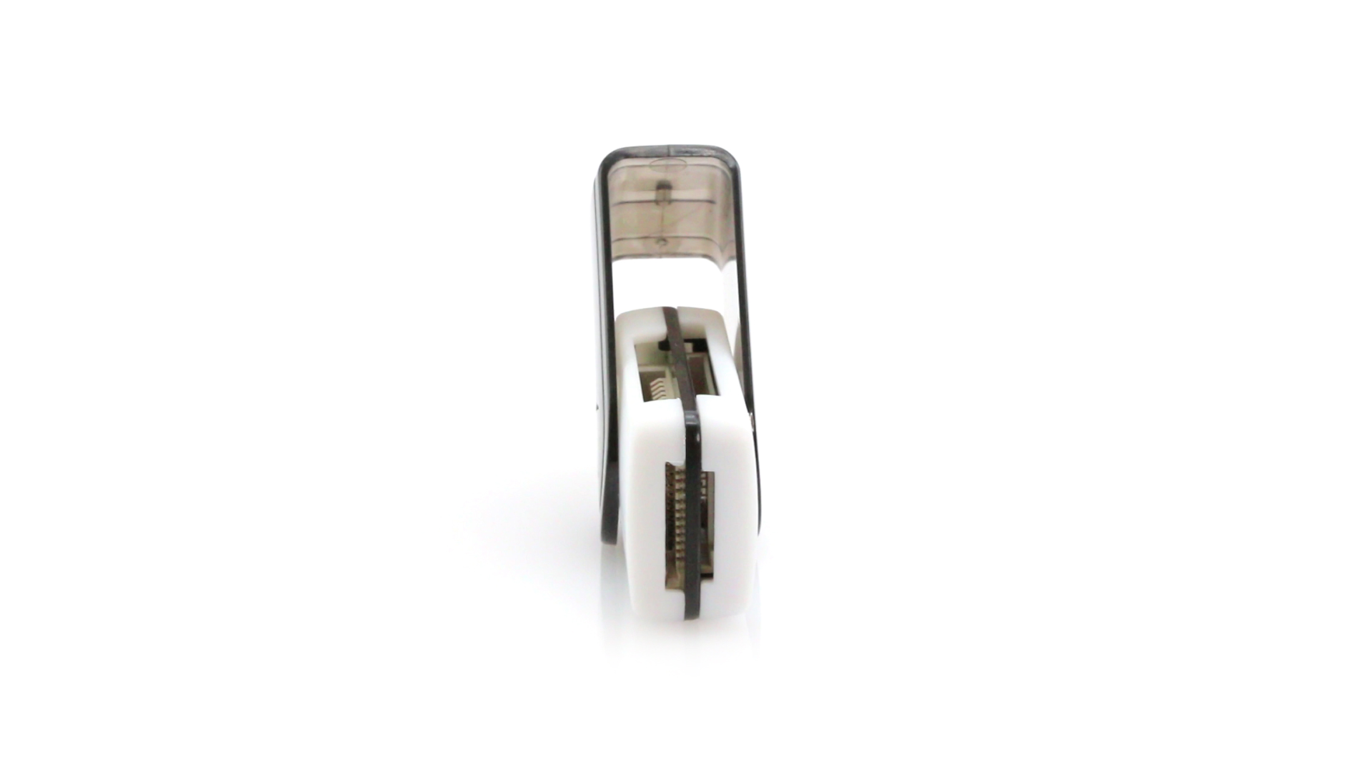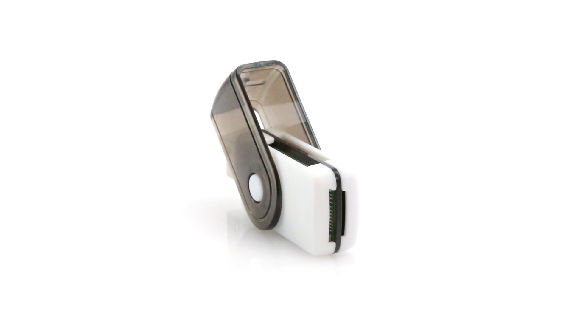Origineller Kartenleser mit Drehöffnung, USB 2.0-Anschluss und fröhlichem zweifarbigem Design. Kompatibel mit M2, MS Duo, Micro SD und SD Karten. Präsentiert in einer individuellen Box.