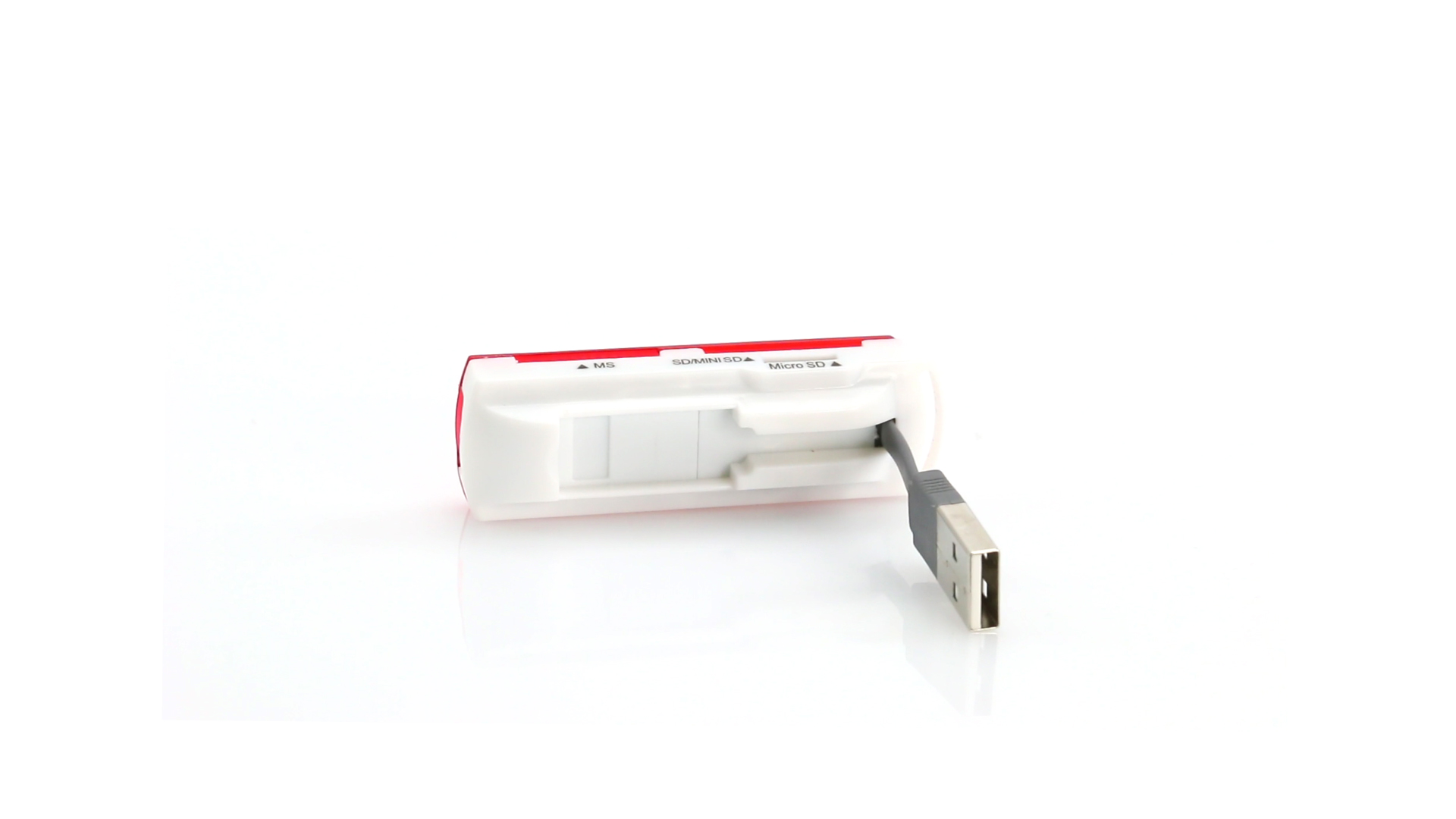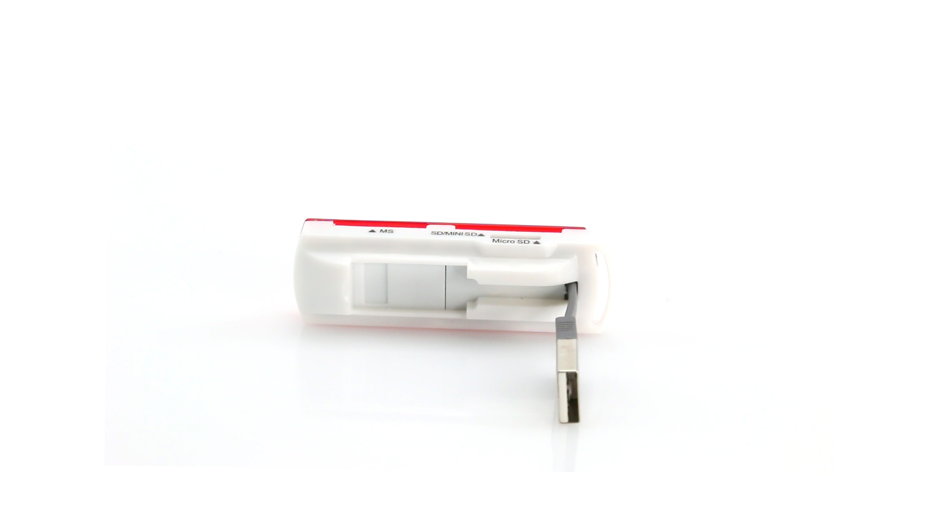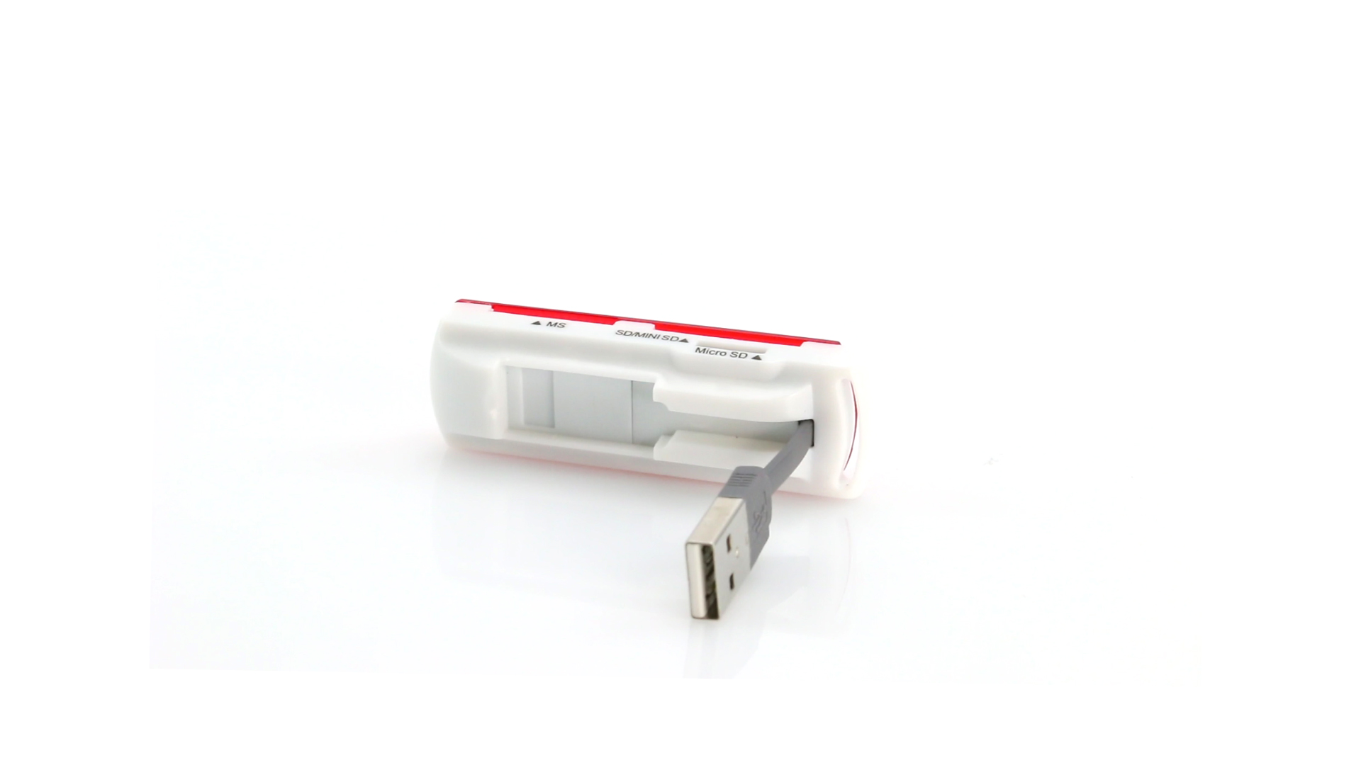Kompakter zweifarbiger Speicherkartenleser mit halbtransparentem Gehäuse. Slots geeignet für eine Vielzahl von Speicherkarten: MS, MS Duo, MS Pro Duo, MicroSD und MiniSD. Präsentiert in einer individuellen Box.