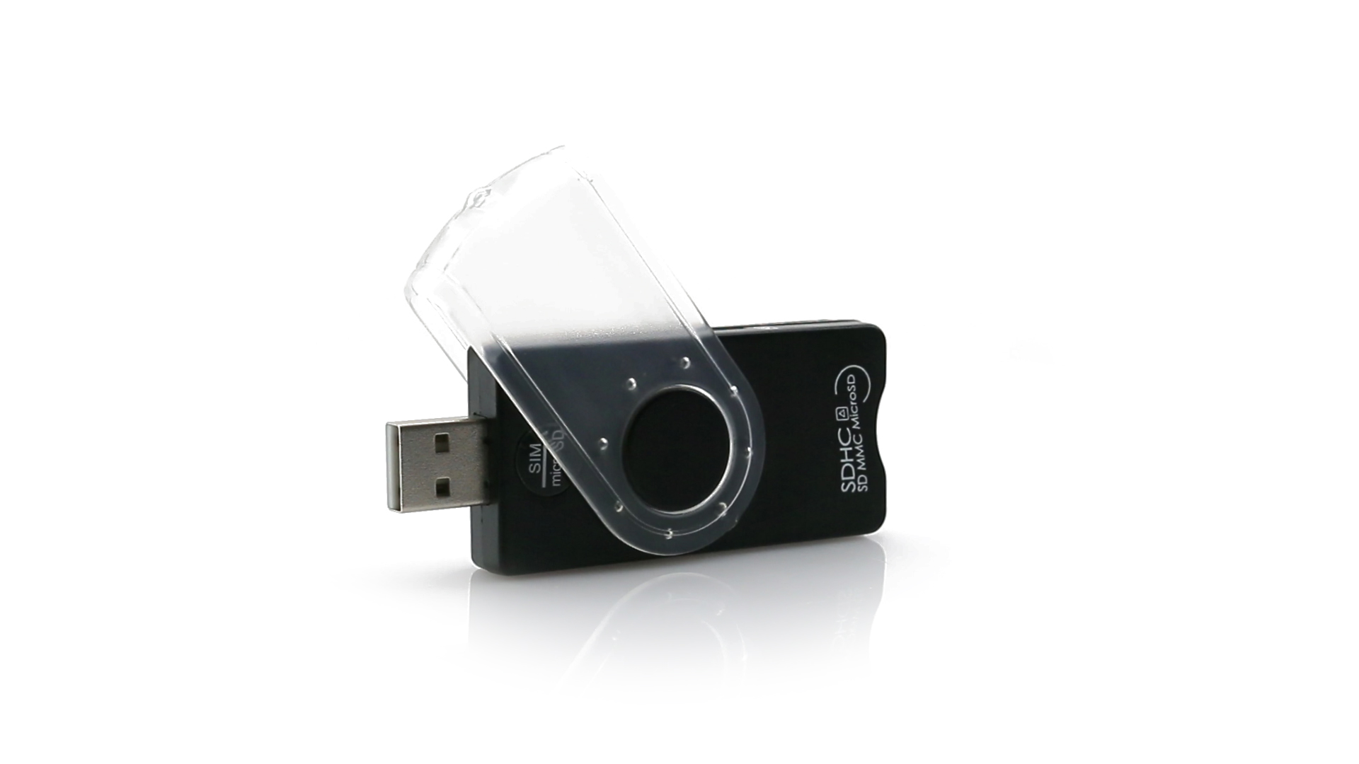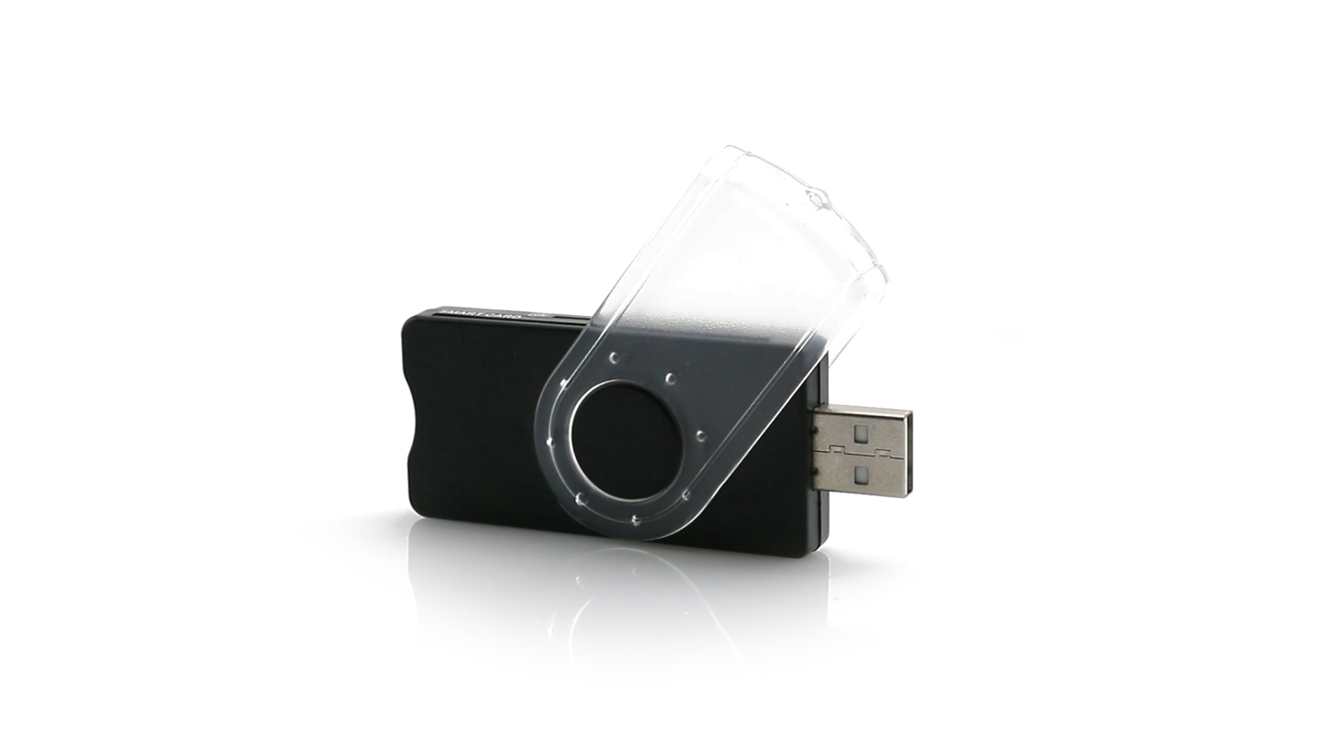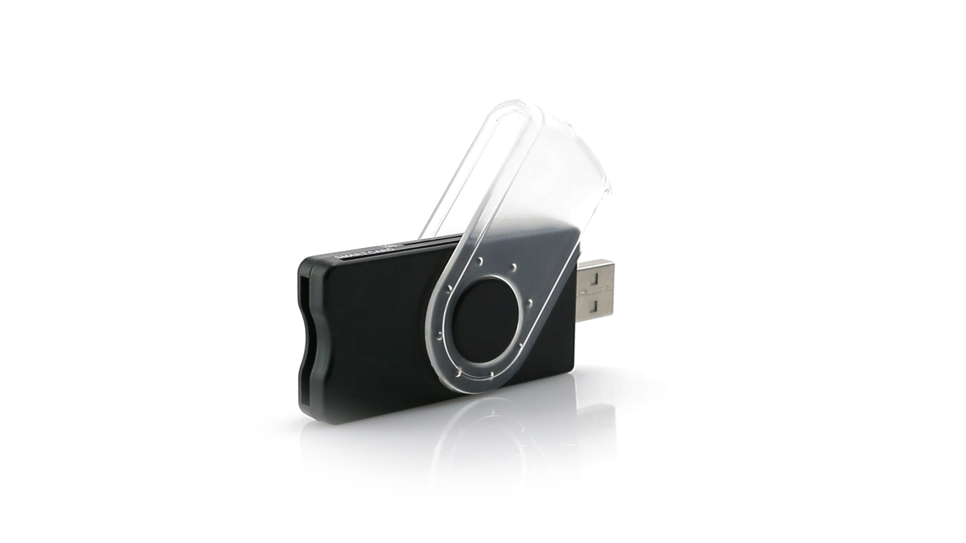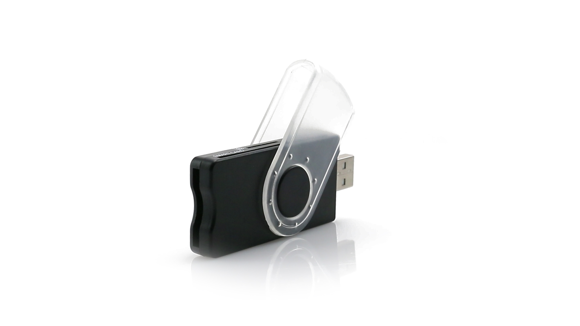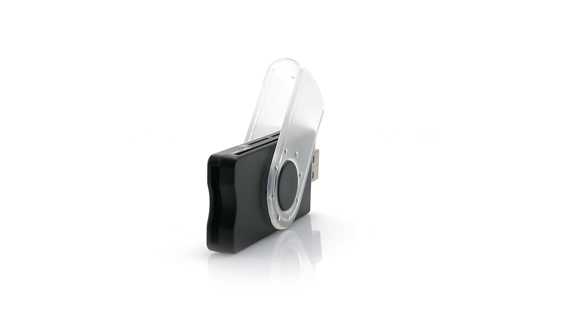Praktischer ID/Chipkartenleser mit USB 2.0 Anschluss. Mit drehbarer Öffnung und minimalistischem Design. Geeignet für MS, M2, SD, MiniSD, SmartCards, SIM und MicroSD Speicherkarten. Kompatibel mit Windows und Mac OS. Präsentiert in einer individuellen Pappschachtel mit satiniertem schwarzem Finish.