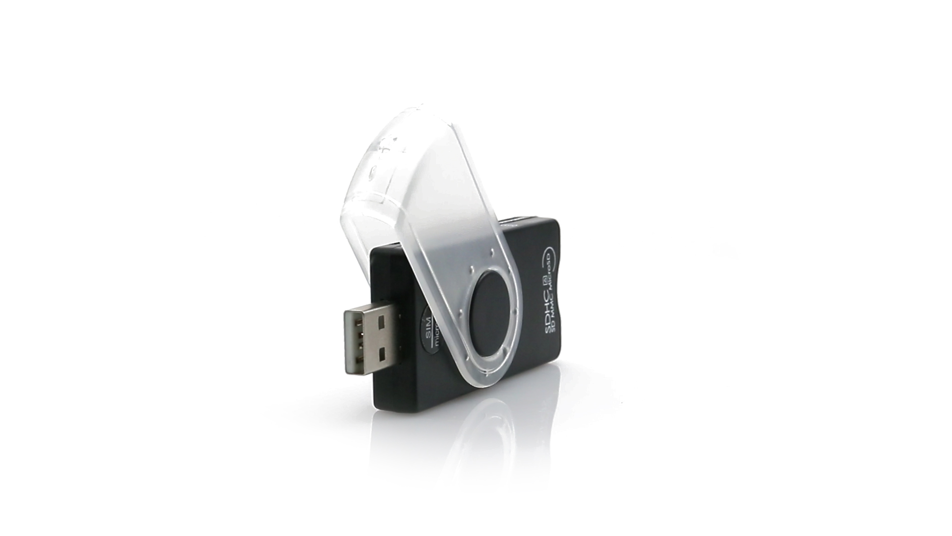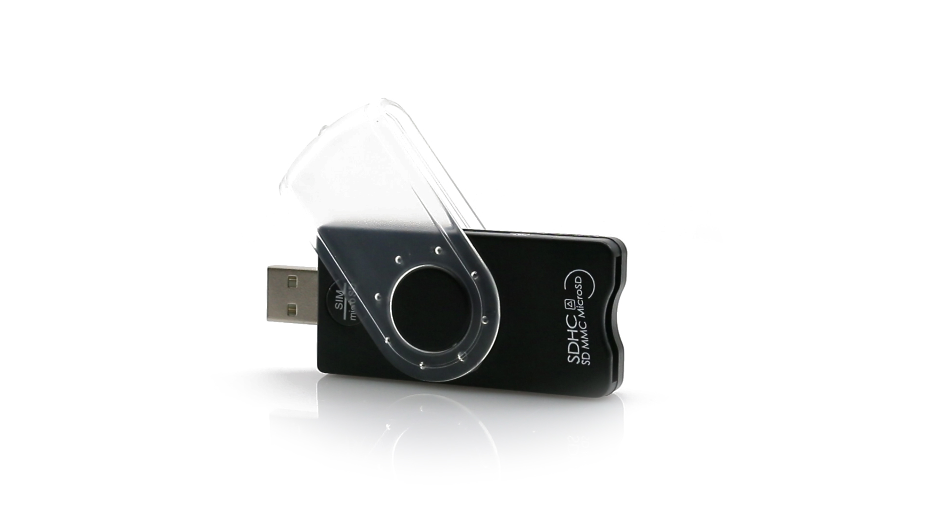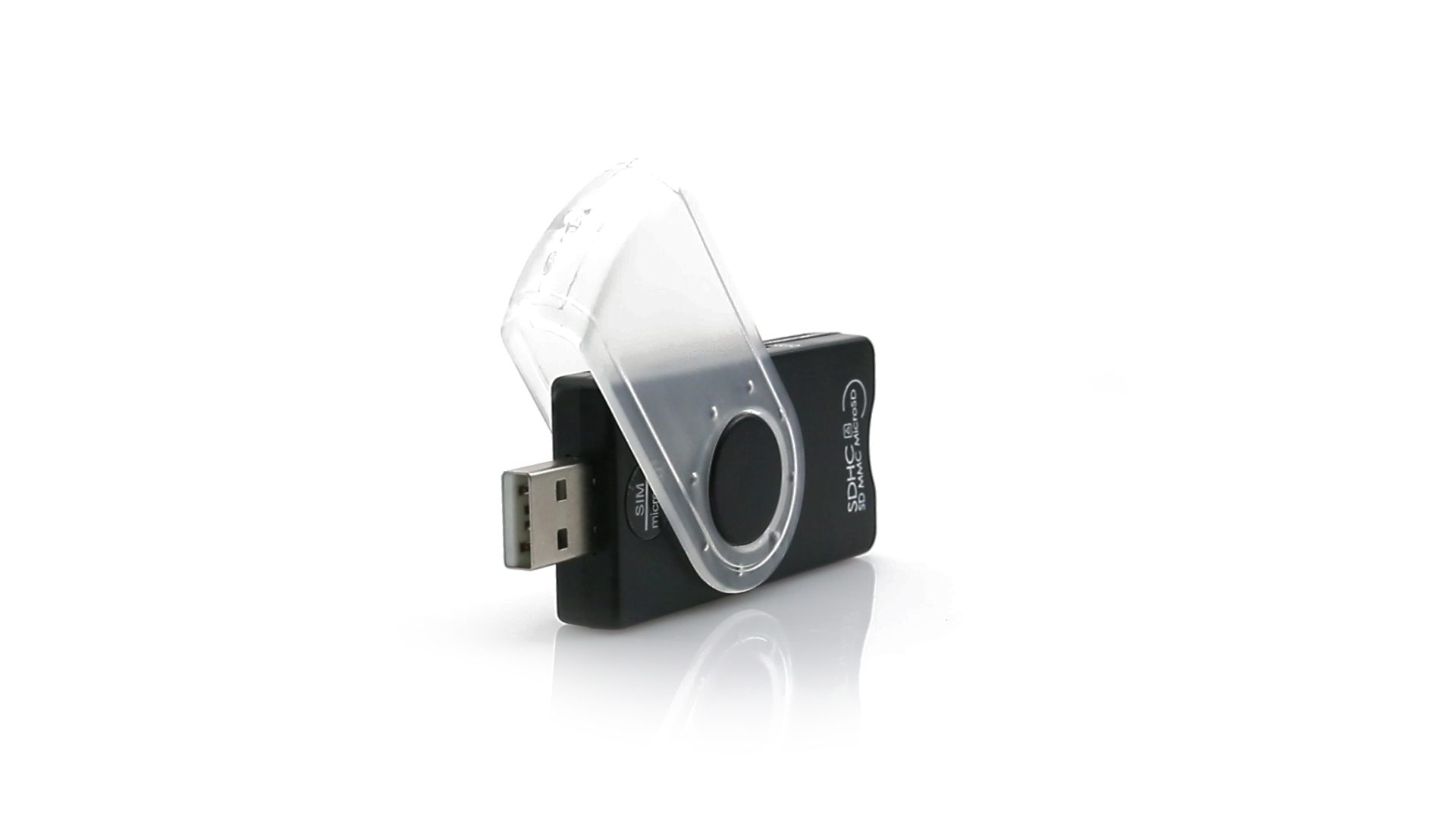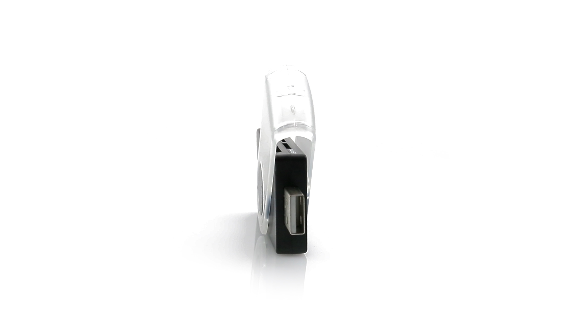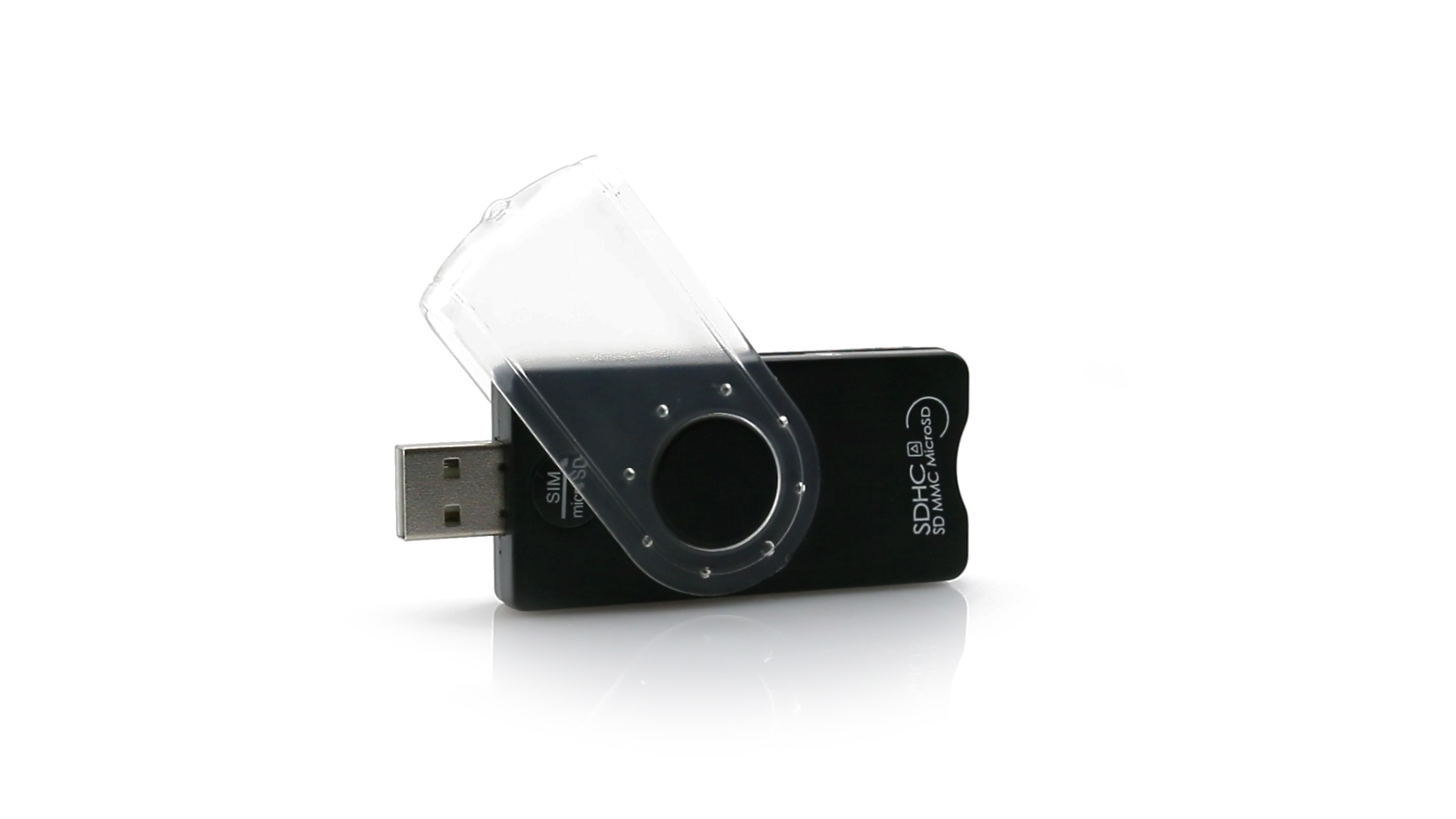 Praktischer ID/Chipkartenleser mit USB 2.0 Anschluss. Mit drehbarer Öffnung und minimalistischem Design. Geeignet für MS, M2, SD, MiniSD, SmartCards, SIM und MicroSD Speicherkarten. Kompatibel mit Windows und Mac OS. Präsentiert in einer individuellen Pappschachtel mit satiniertem schwarzem Finish.