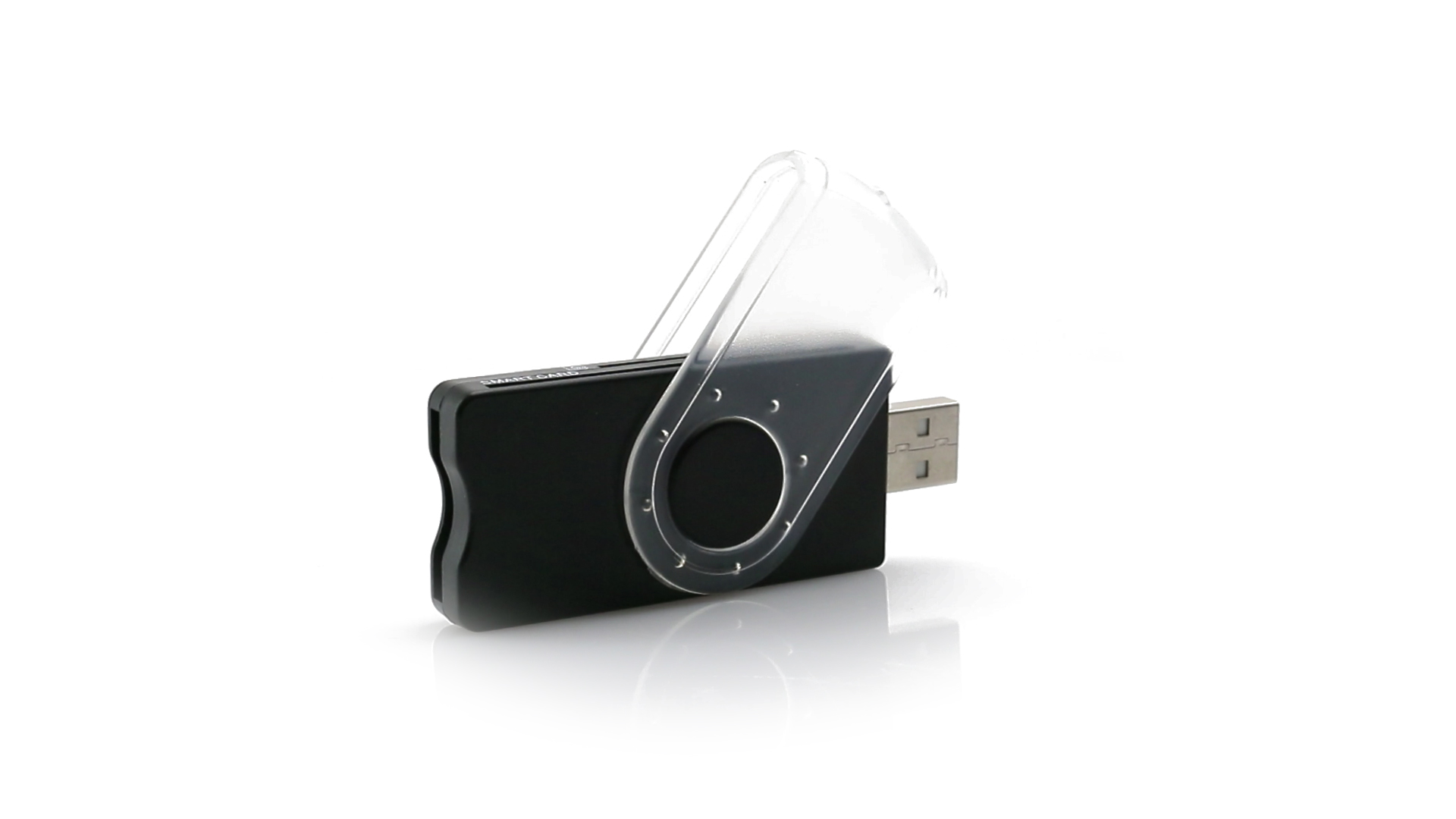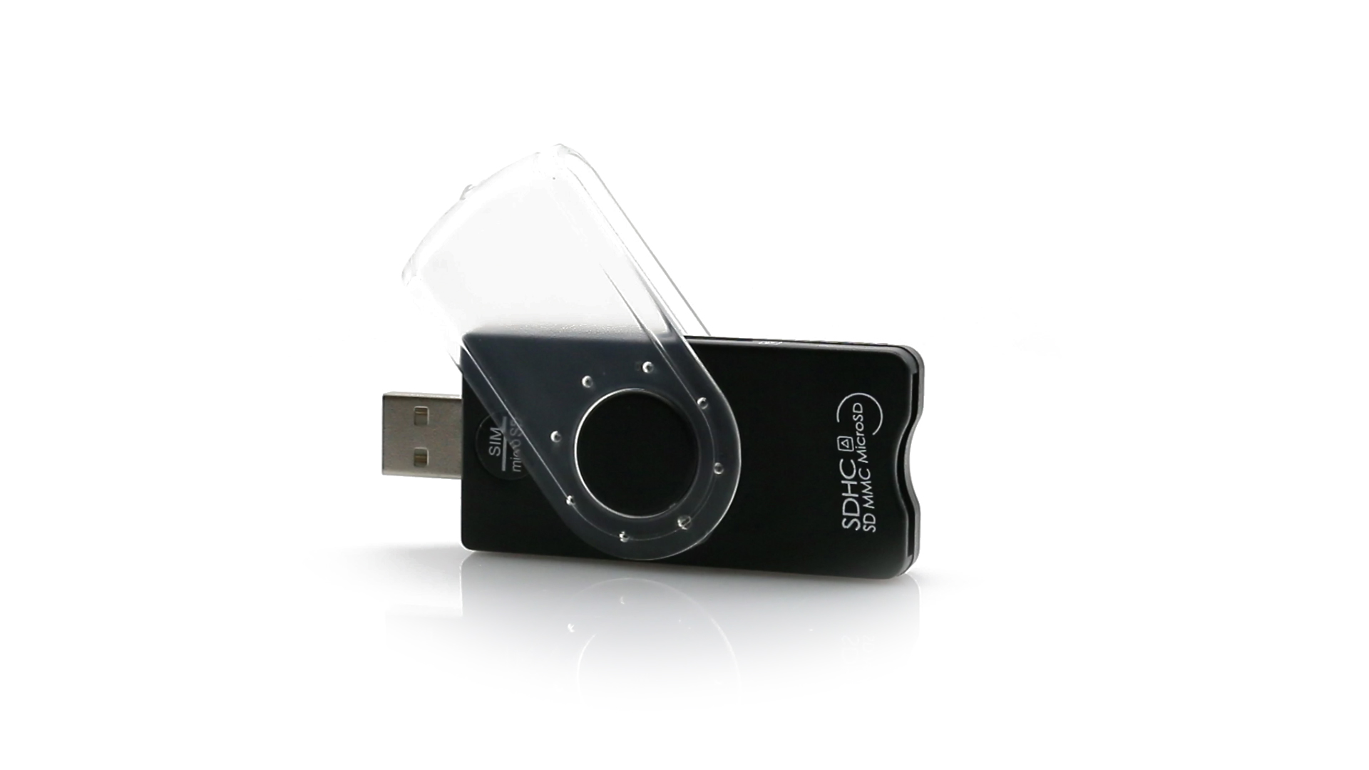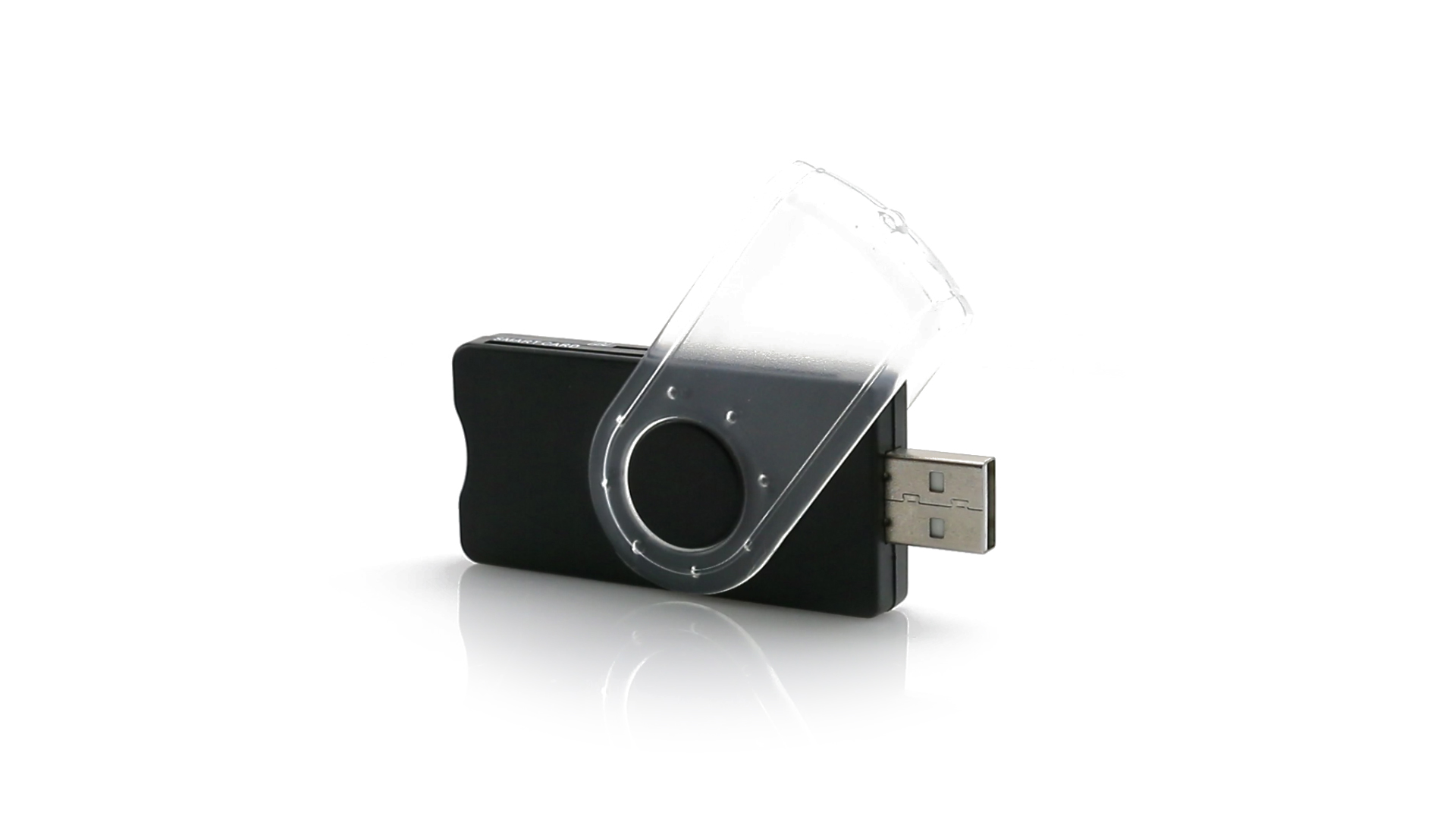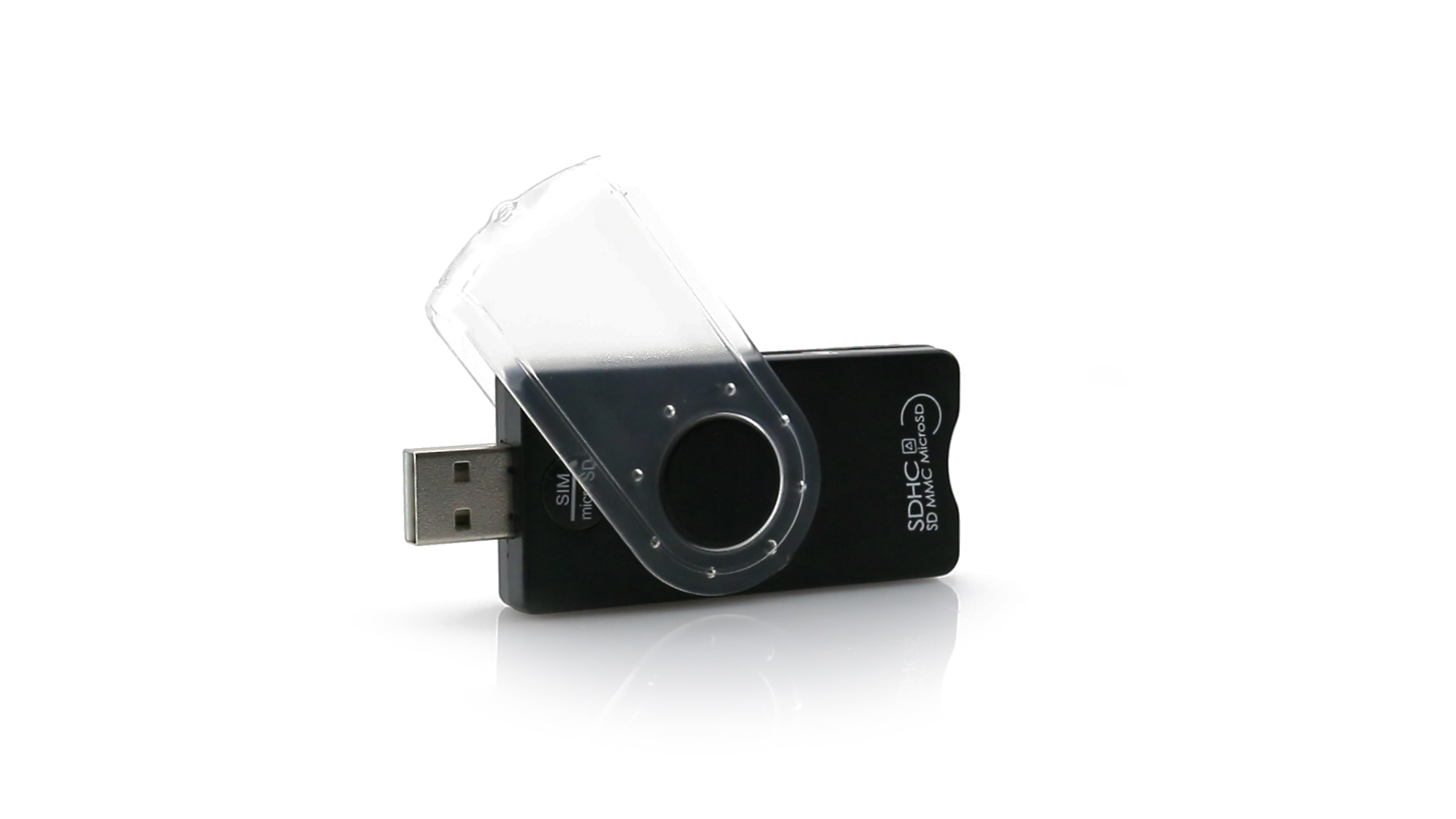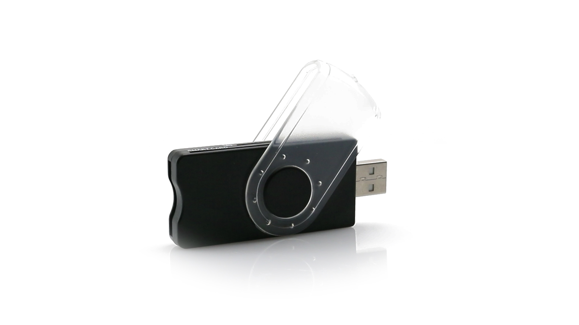 Praktischer ID/Chipkartenleser mit USB 2.0 Anschluss. Mit drehbarer Öffnung und minimalistischem Design. Geeignet für MS, M2, SD, MiniSD, SmartCards, SIM und MicroSD Speicherkarten. Kompatibel mit Windows und Mac OS. Präsentiert in einer individuellen Pappschachtel mit satiniertem schwarzem Finish.